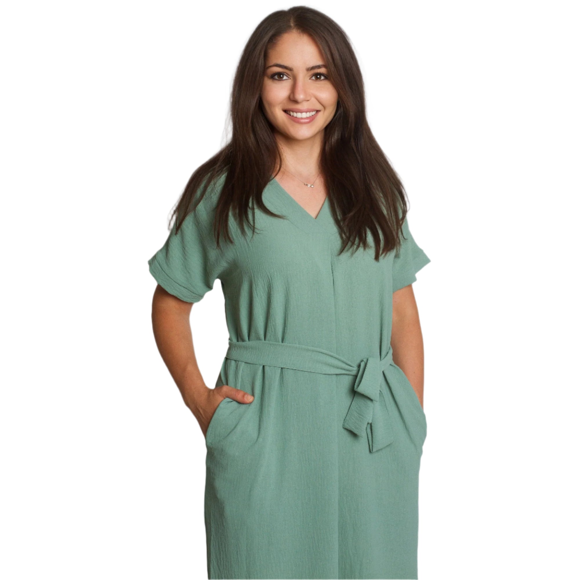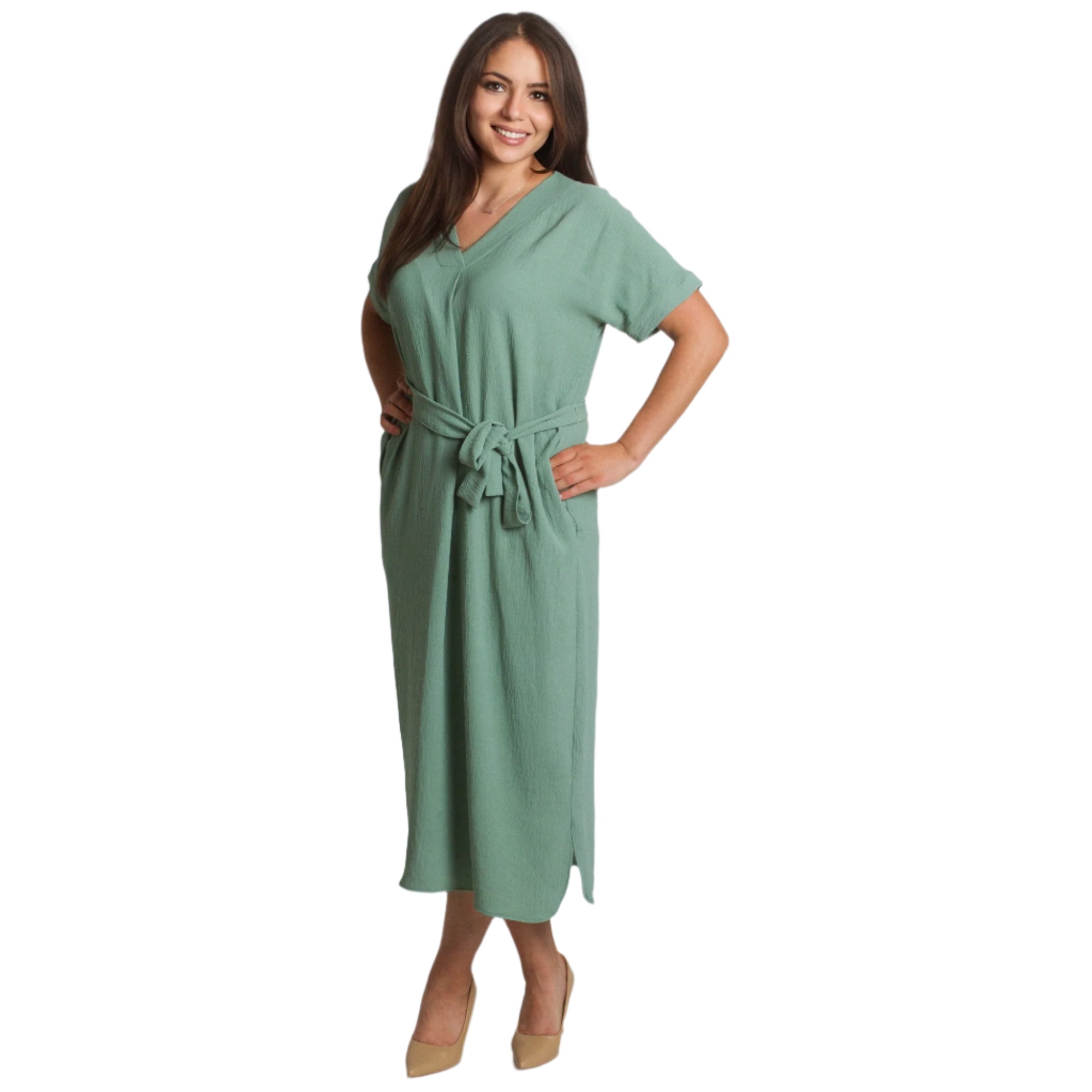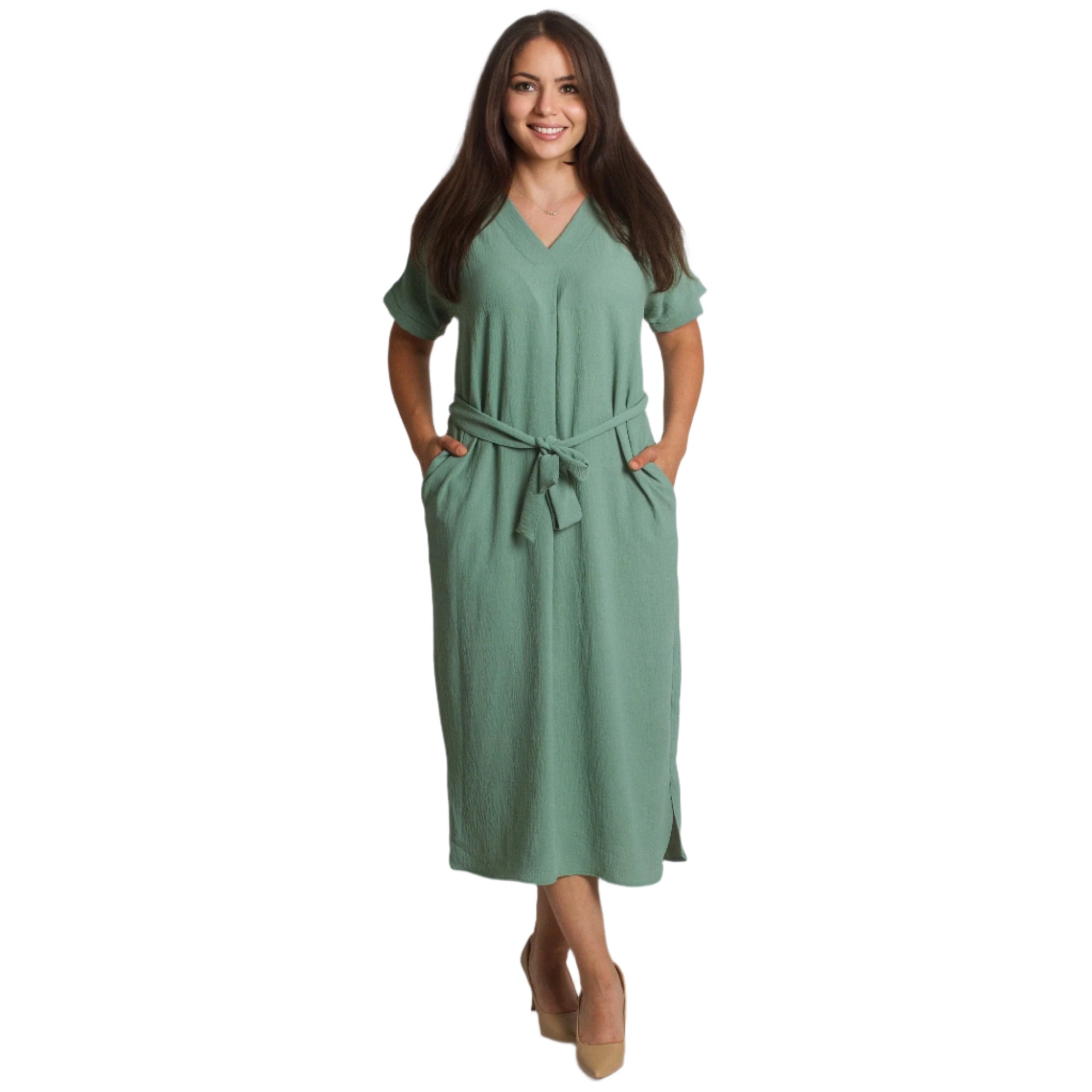 Această rochie elegantă, într-o delicată culoare verde mentă, combină confortul și eleganța. Confecționată din material moale de viscoză cu elastan, oferă confort pe tot parcursul zilei. Decolteul în V și croiul lejer evidențiază silueta, iar cureaua din talie conferă o siluetă feminină. Rochia are lungimea sub genunchi, buzunare laterale și mâneci ușor evazate, potrivită atât pentru viața de zi cu zi, cât și pentru ocazii formale.