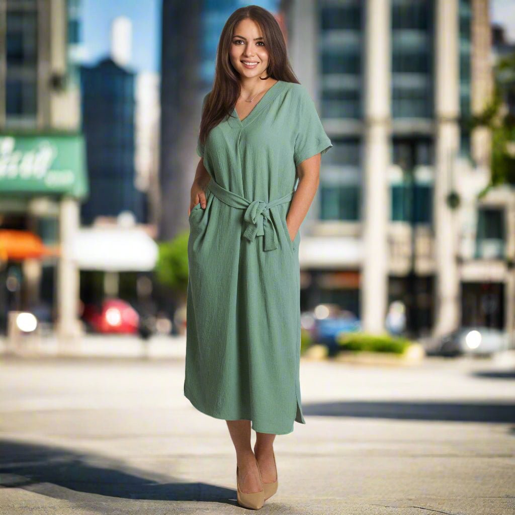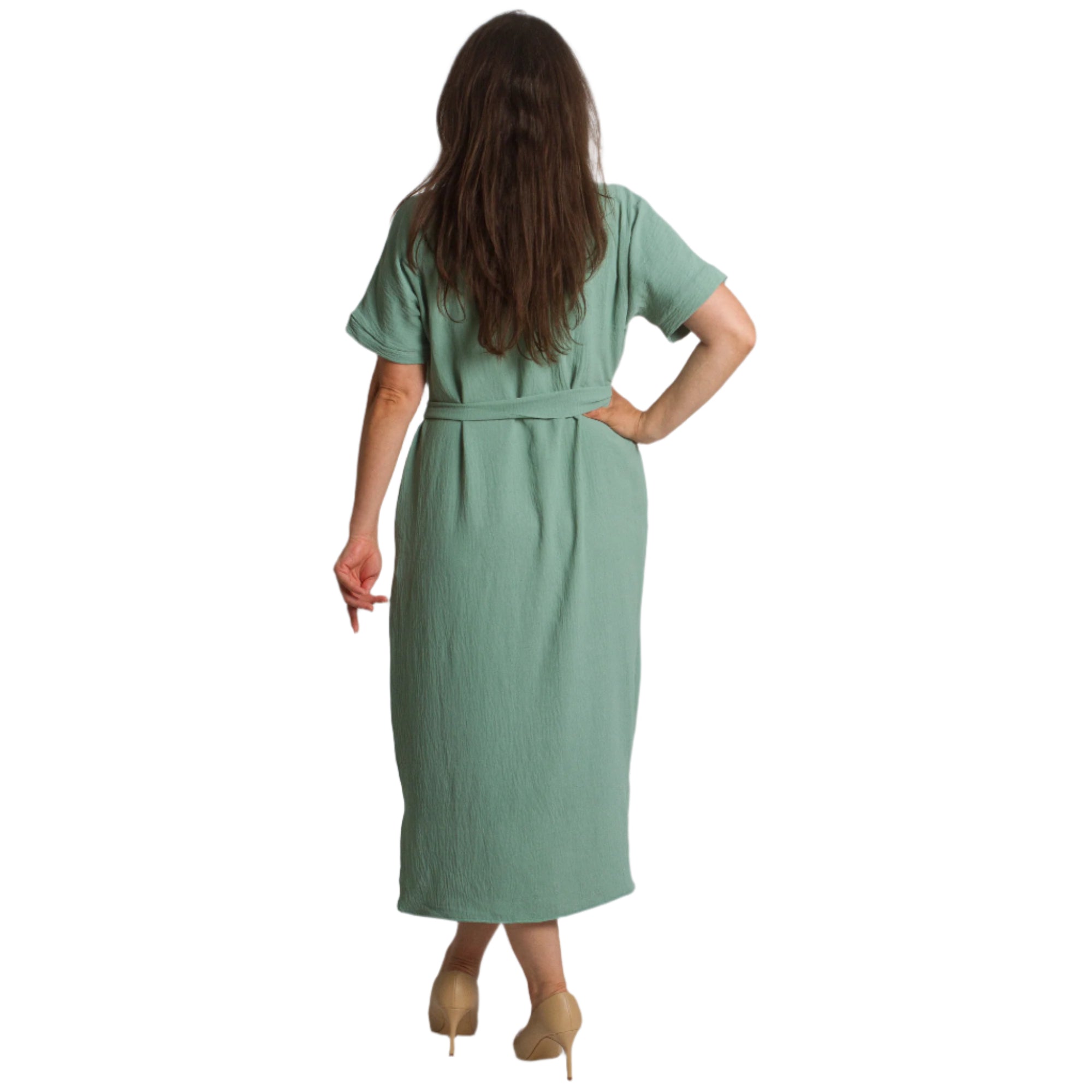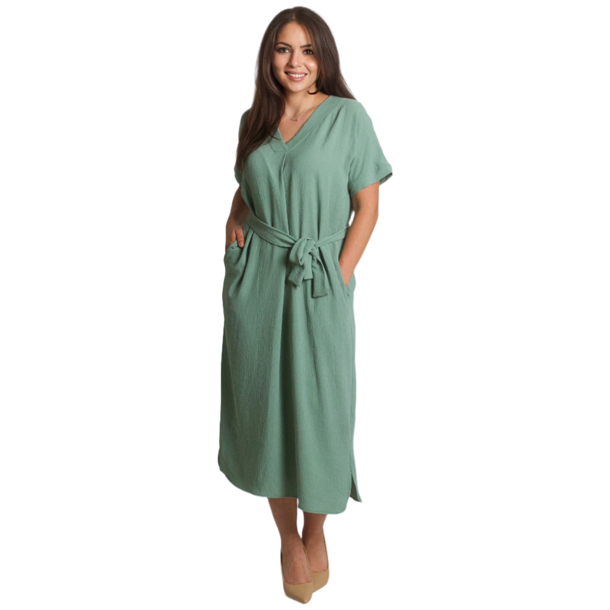 Această rochie elegantă, într-o delicată culoare verde mentă, combină confortul și eleganța. Confecționată din material moale de viscoză cu elastan, oferă confort pe tot parcursul zilei. Decolteul în V și croiul lejer evidențiază silueta, iar cureaua din talie conferă o siluetă feminină. Rochia are lungimea sub genunchi, buzunare laterale și mâneci ușor evazate, potrivită atât pentru viața de zi cu zi, cât și pentru ocazii formale.
