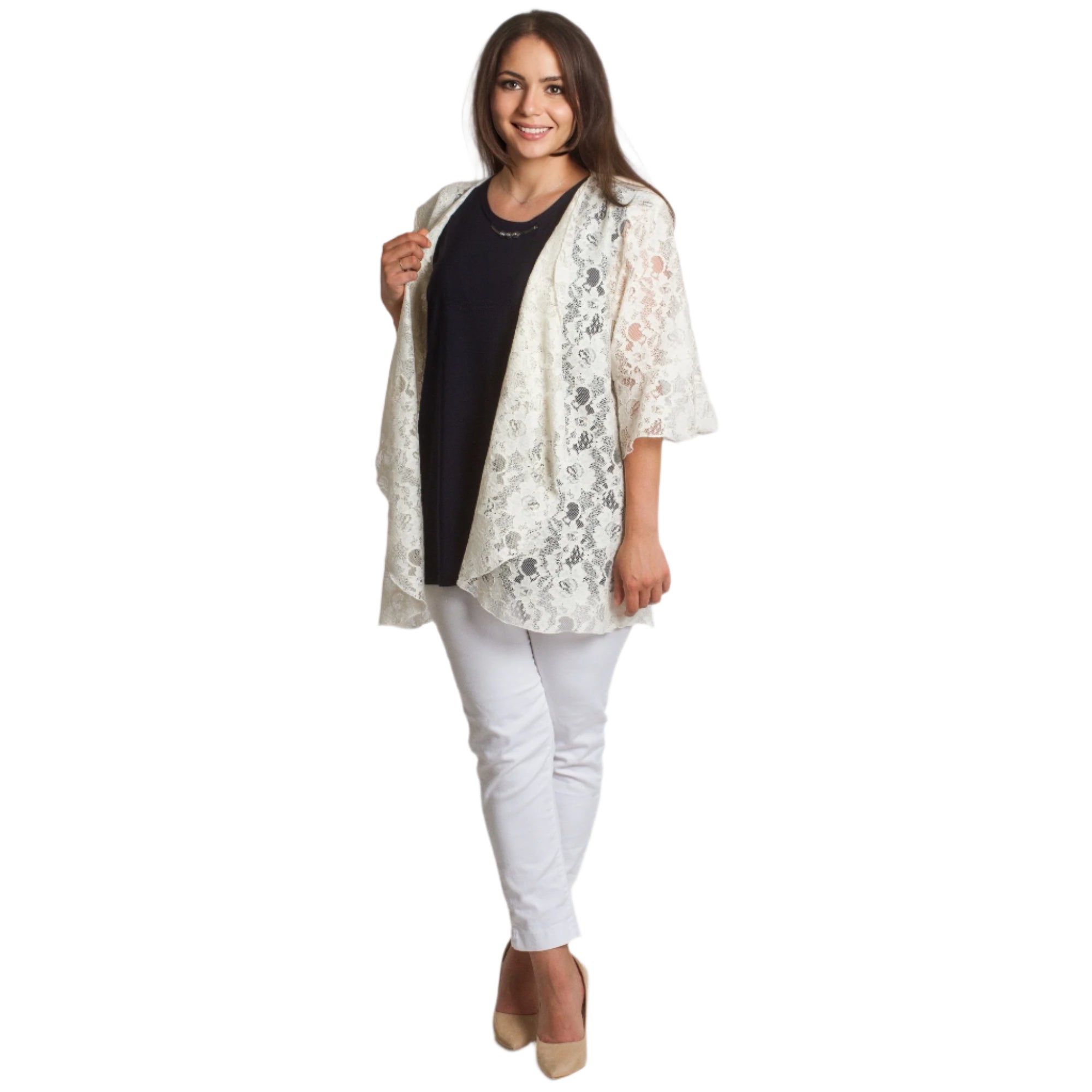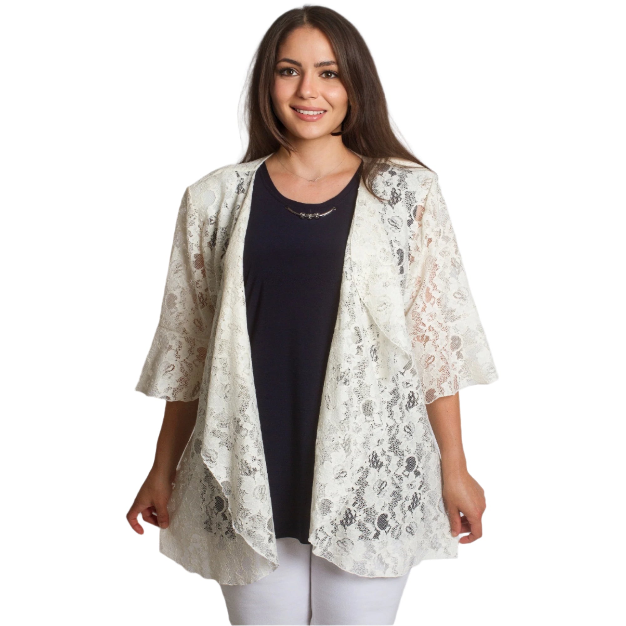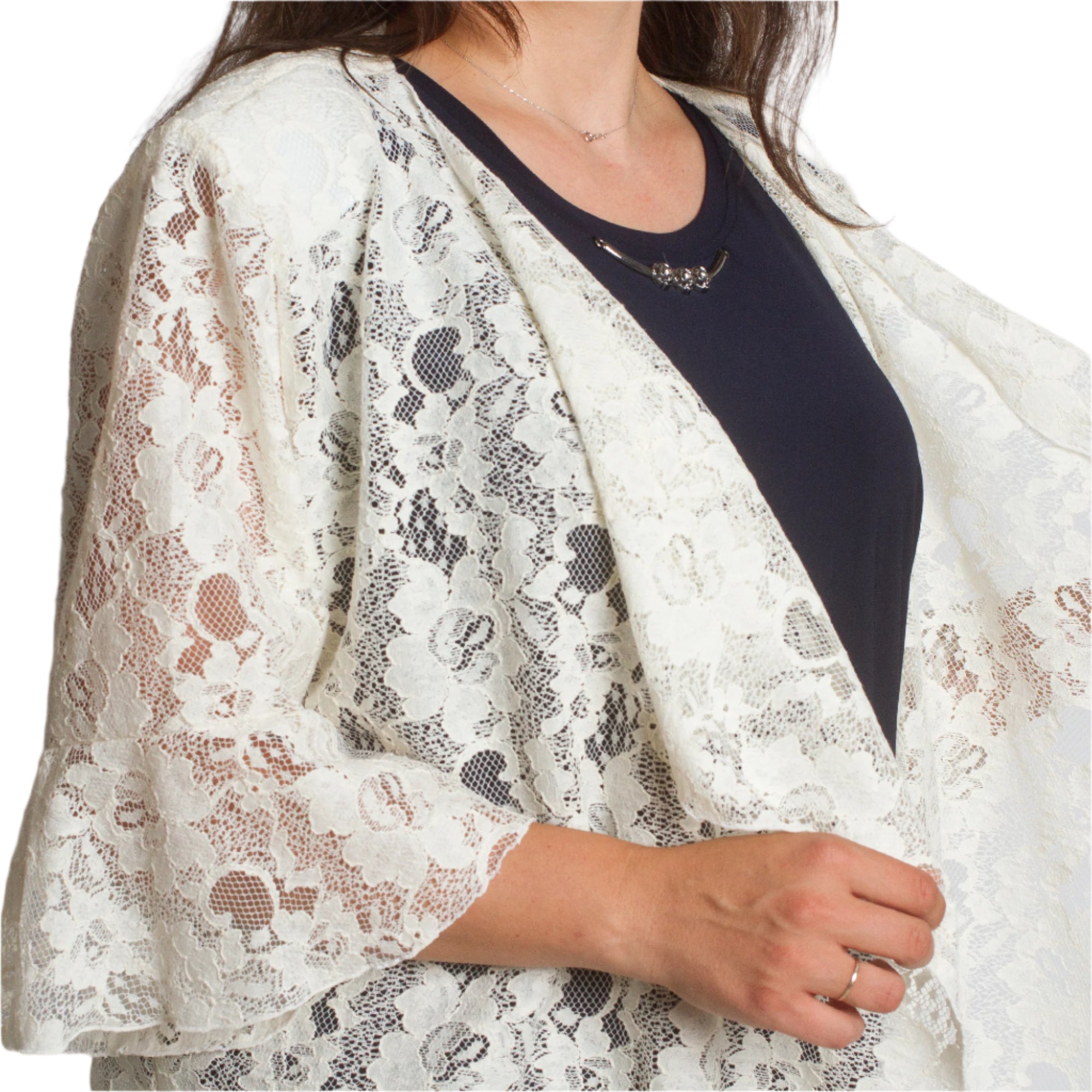 Acest sacou elegant pentru femei, în mărimi mari, este confecționat din dantelă fină. Într-o culoare ecru delicată și cu o croială dreaptă și lejeră, modelul adaugă rafinament oricărui look. Se combină ușor cu rochii, fuste și pantaloni eleganți, fiind completarea perfectă a ținutelor pentru nunți, botezuri și alte ocazii speciale. Mânecile au lungimea de 7/8 și sunt ușor evazate, iar designul deschis fără nasturi adaugă lejeritate și feminitate.