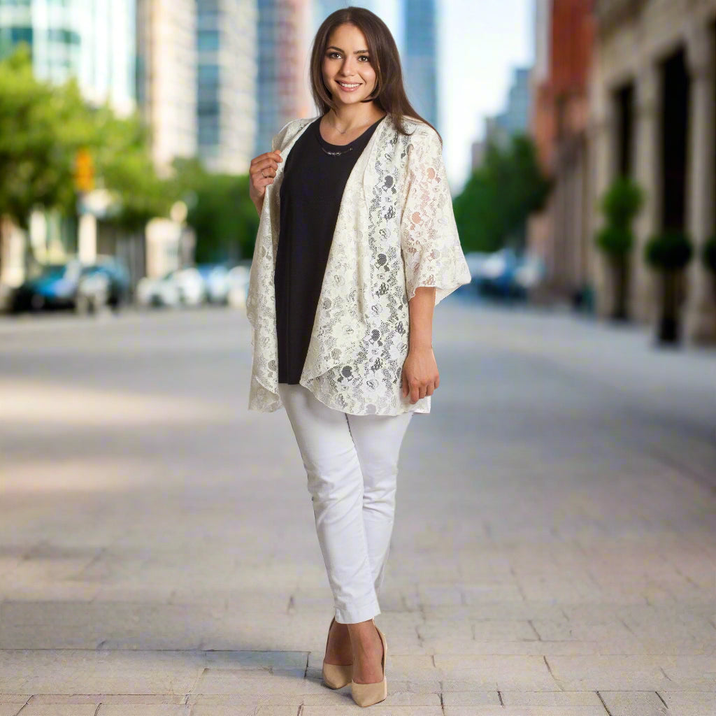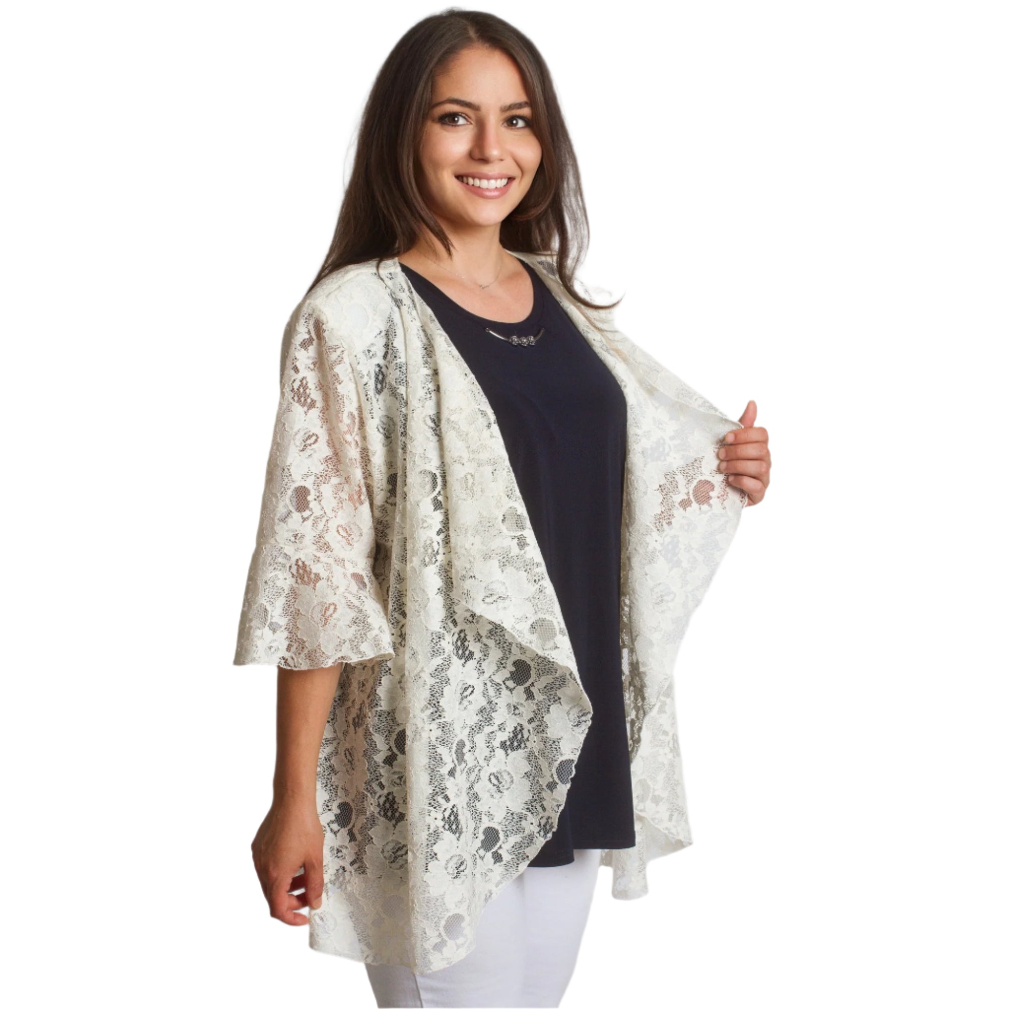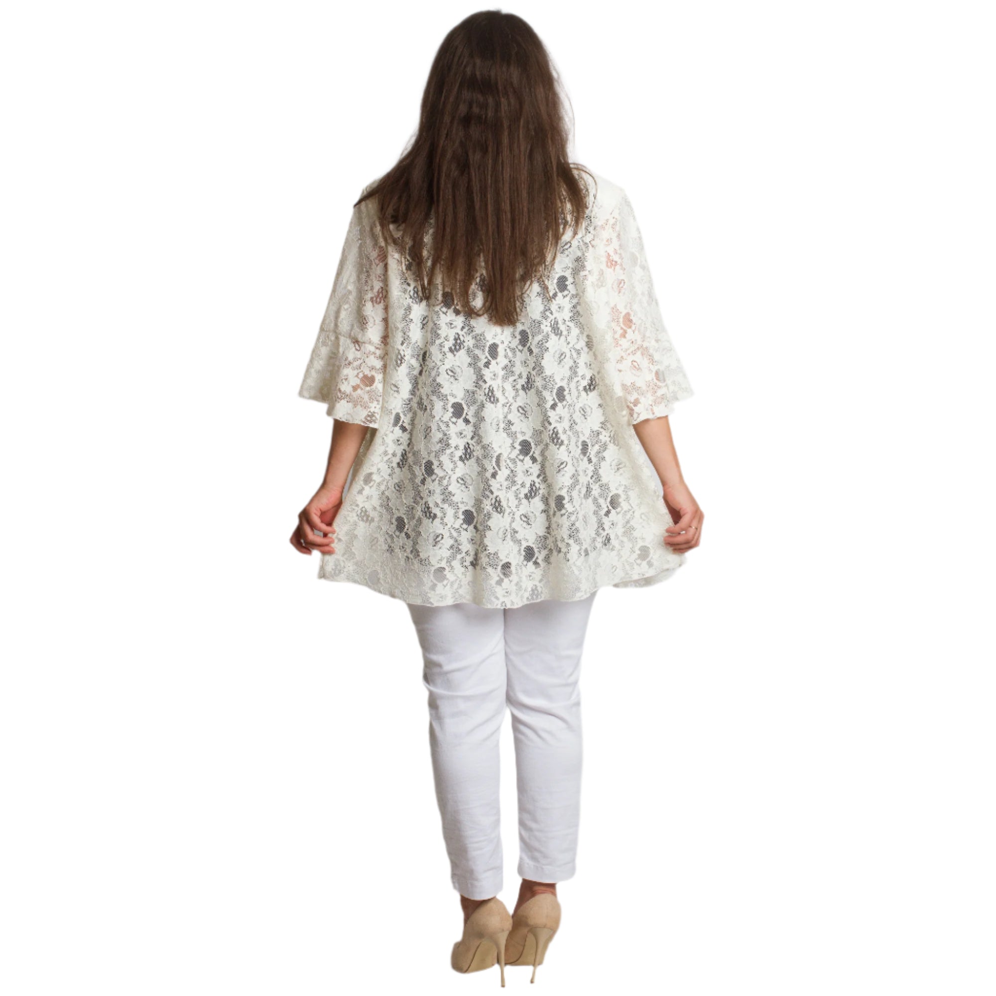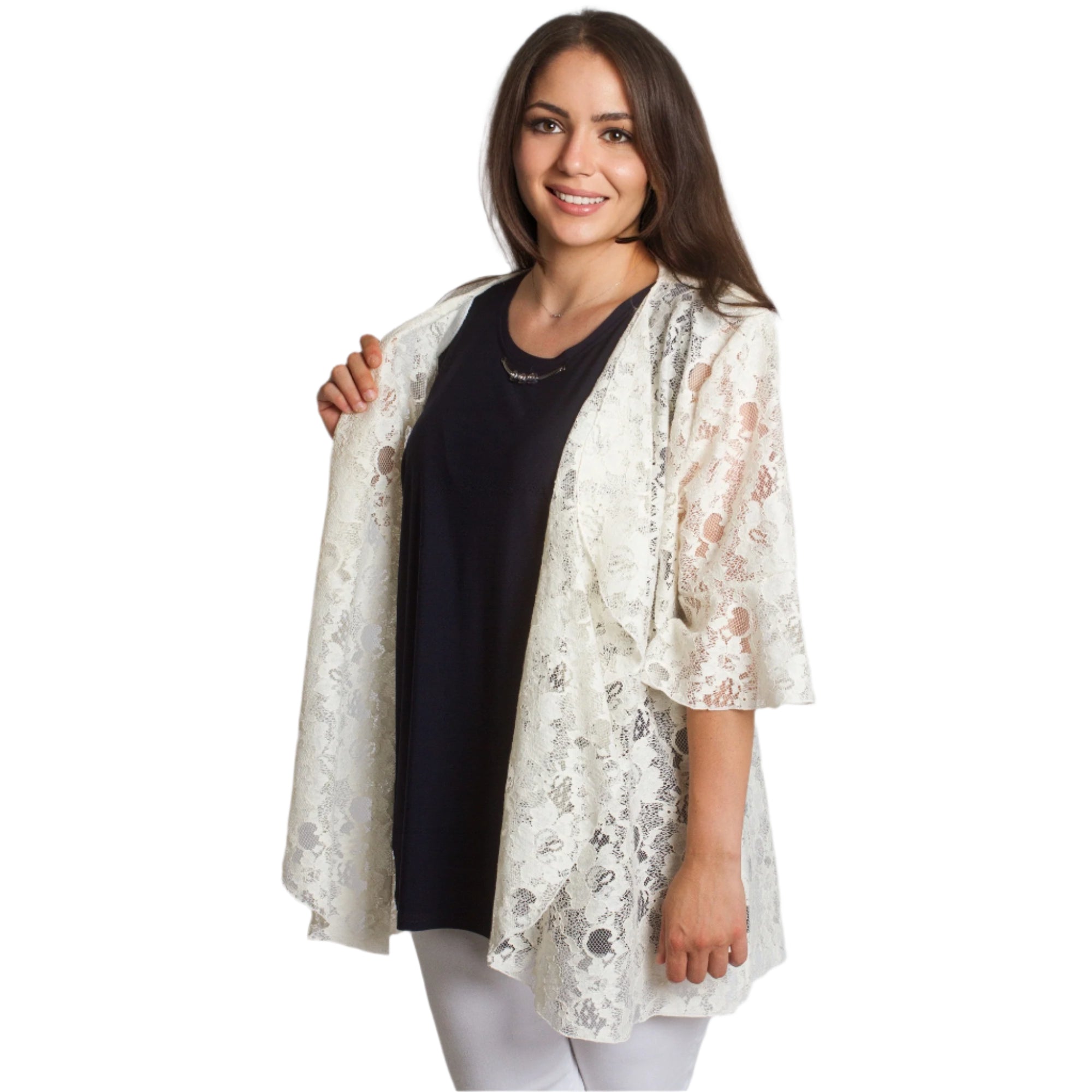 Acest sacou elegant pentru femei, în mărimi mari, este confecționat din dantelă fină. Într-o culoare ecru delicată și cu o croială dreaptă și lejeră, modelul adaugă rafinament oricărui look. Se combină ușor cu rochii, fuste și pantaloni eleganți, fiind completarea perfectă a ținutelor pentru nunți, botezuri și alte ocazii speciale. Mânecile au lungimea de 7/8 și sunt ușor evazate, iar designul deschis fără nasturi adaugă lejeritate și feminitate.
