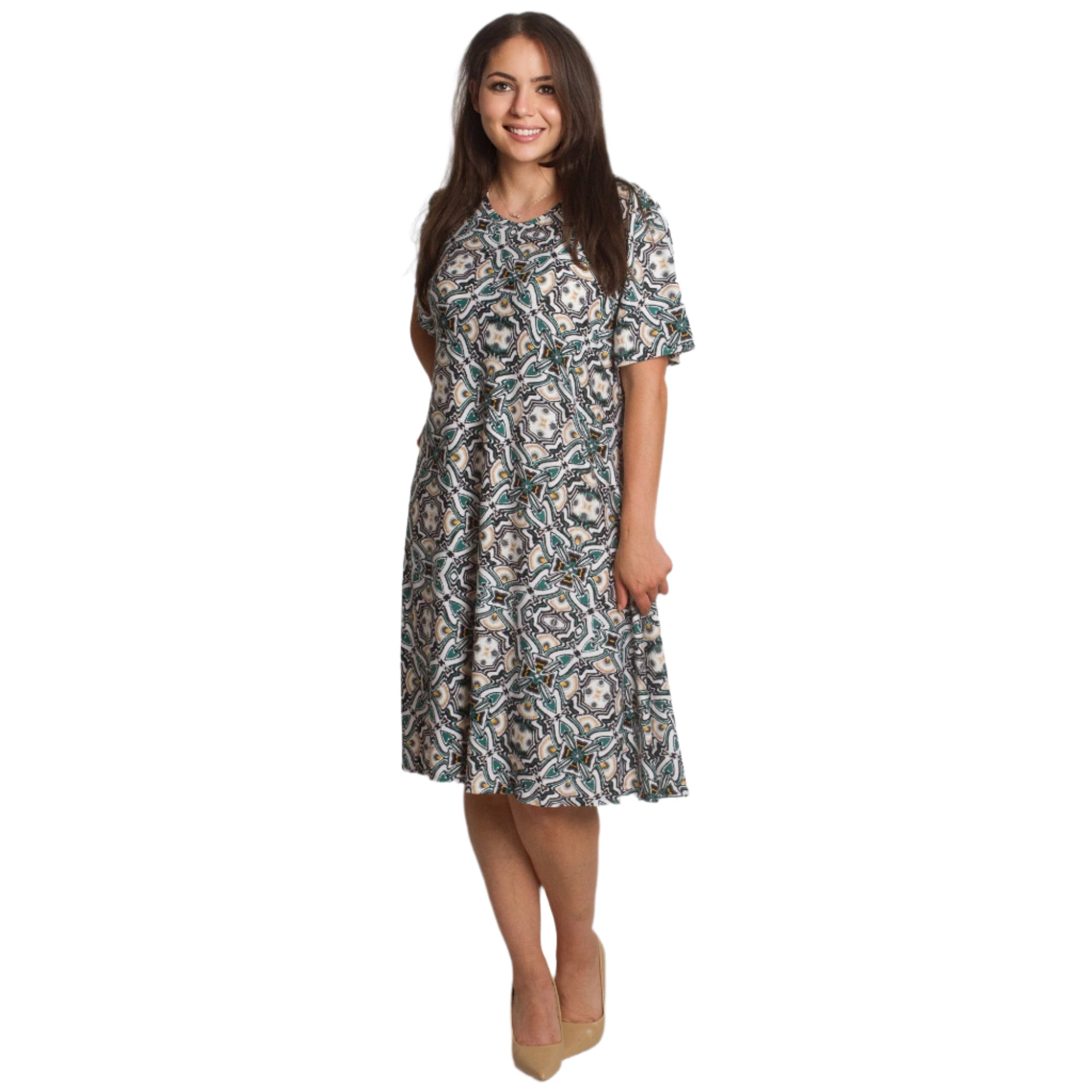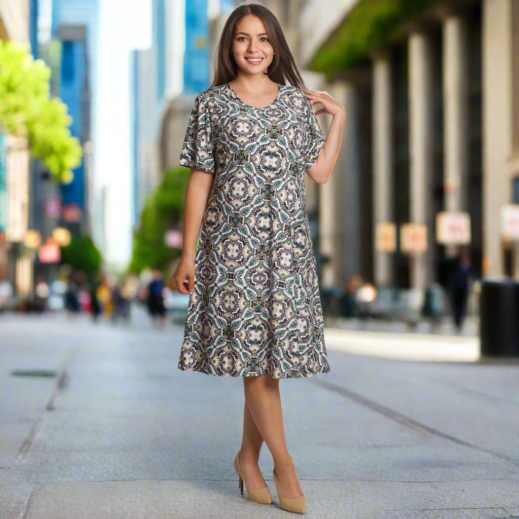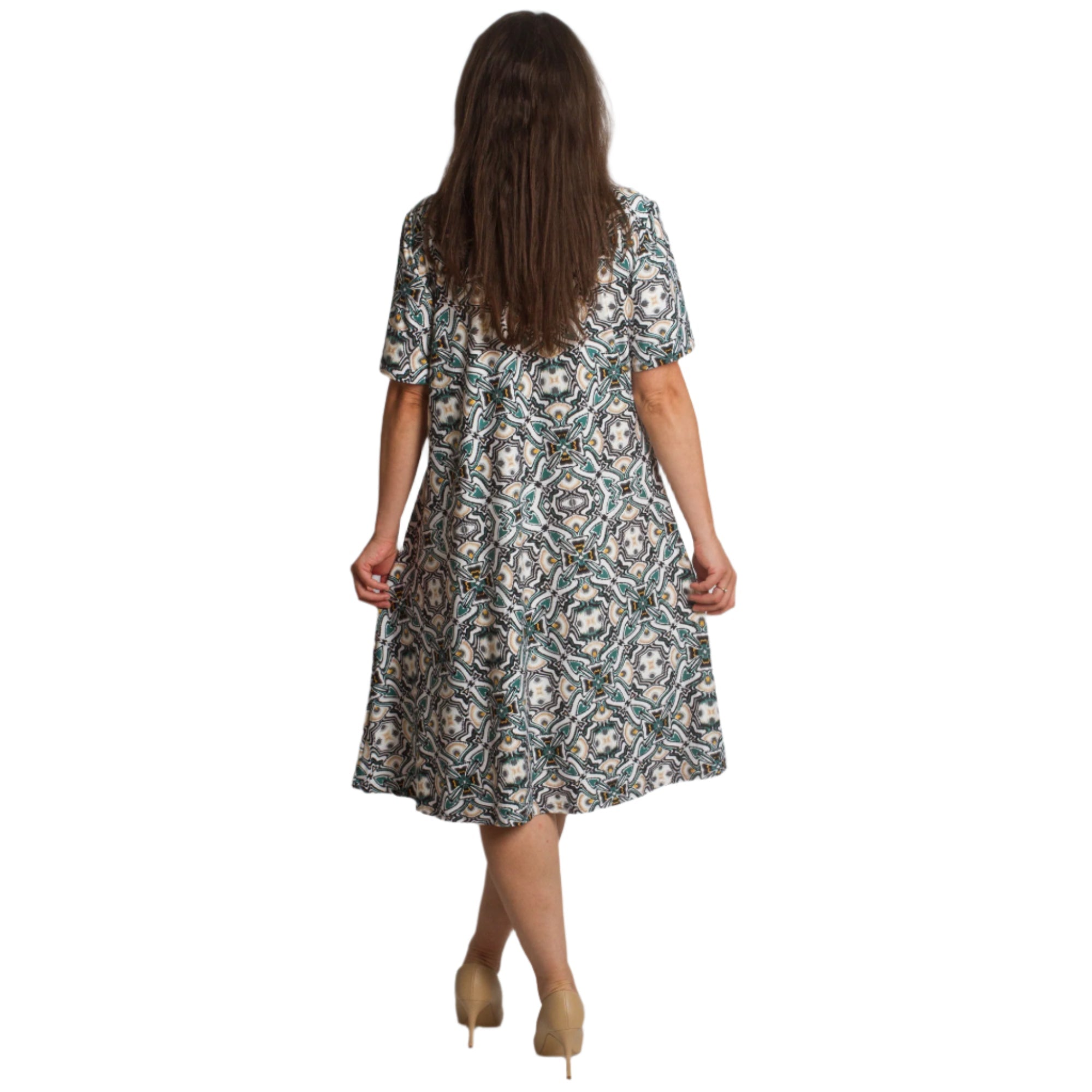 Această rochie spectaculoasă plus-size impresionează printr-un model geometric artistic în verde, maro și ecru. Modelul are decolteu rotund și mâneci scurte, iar croiul lejer asigură lejeritate și confort pe tot parcursul zilei. Potrivită atât pentru viața de zi cu zi, cât și pentru ocazii mai formale, rochia este confecționată din viscoză cu elastan - un material plăcut la atingere și care oferă elasticitatea și libertatea de mișcare necesare. O alegere ideală pentru sezonul primăvară-vară.