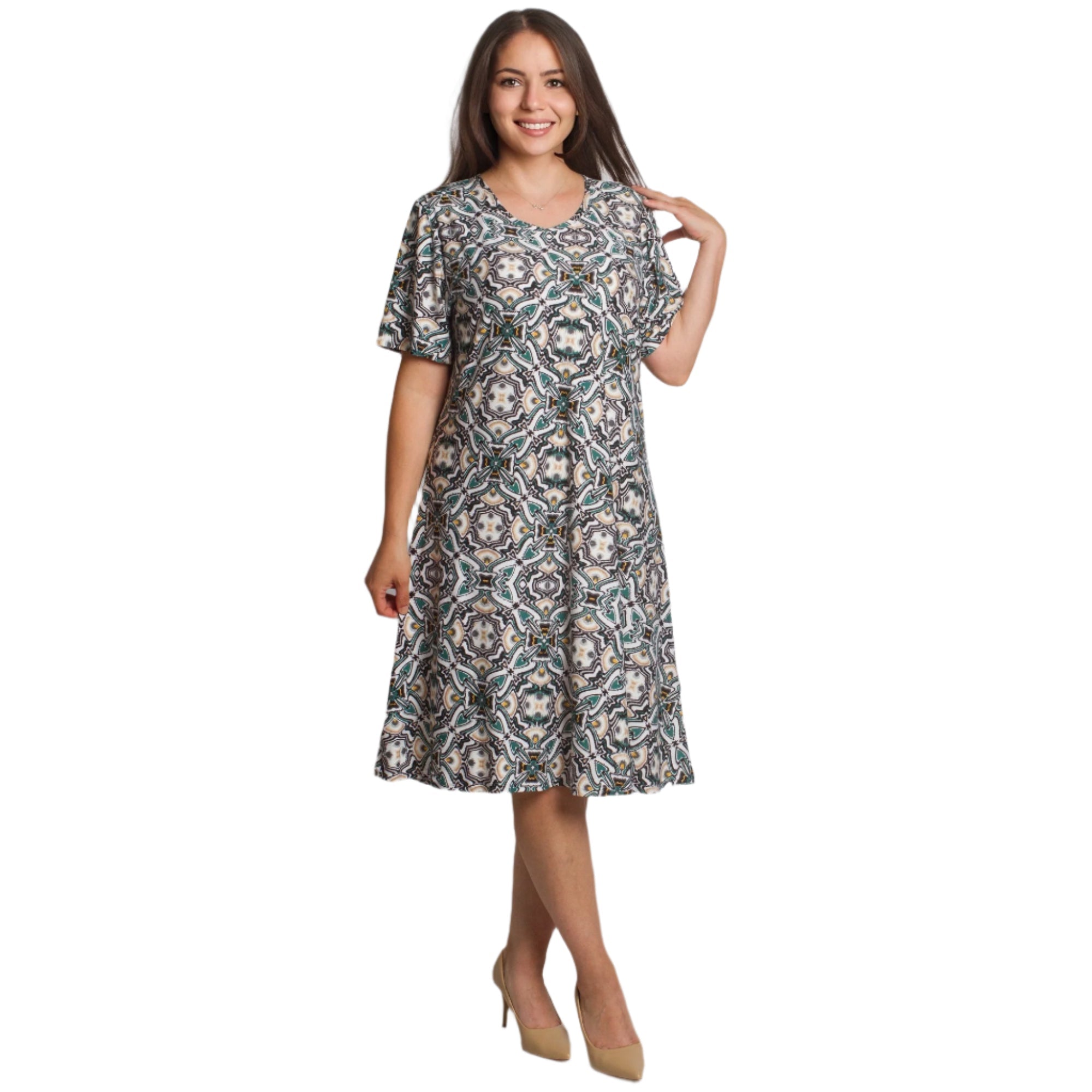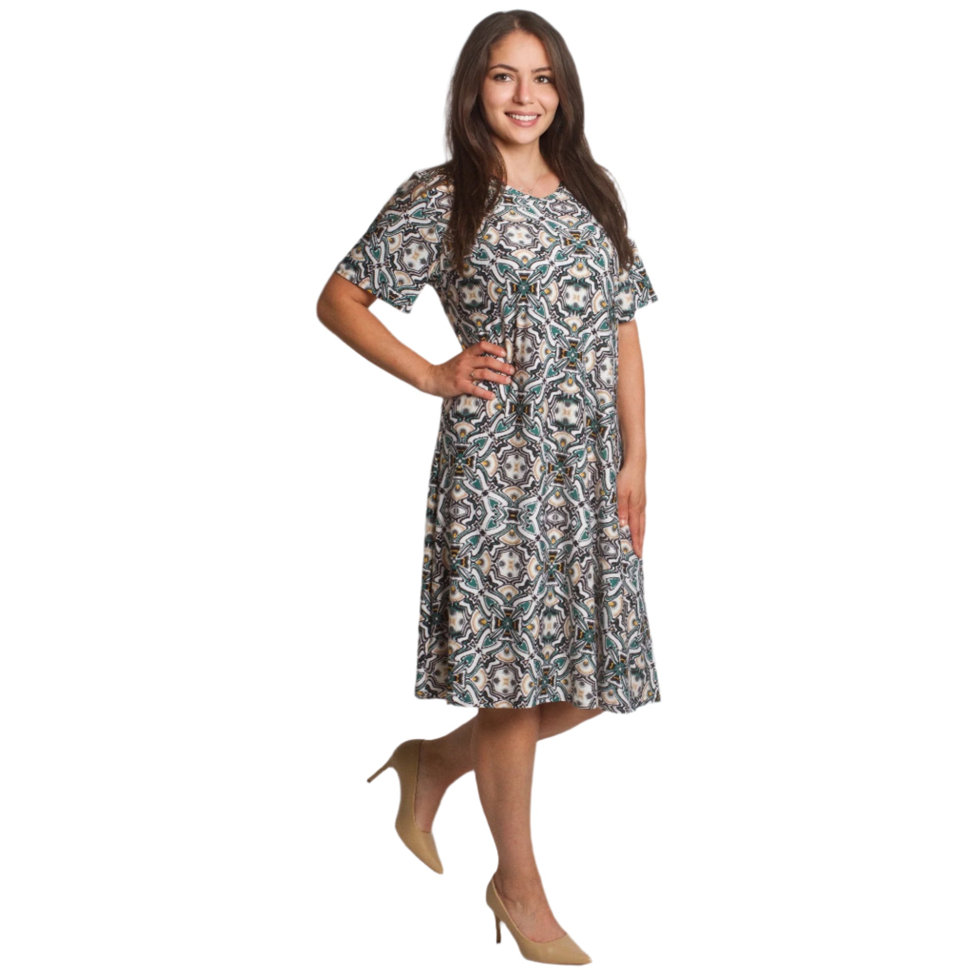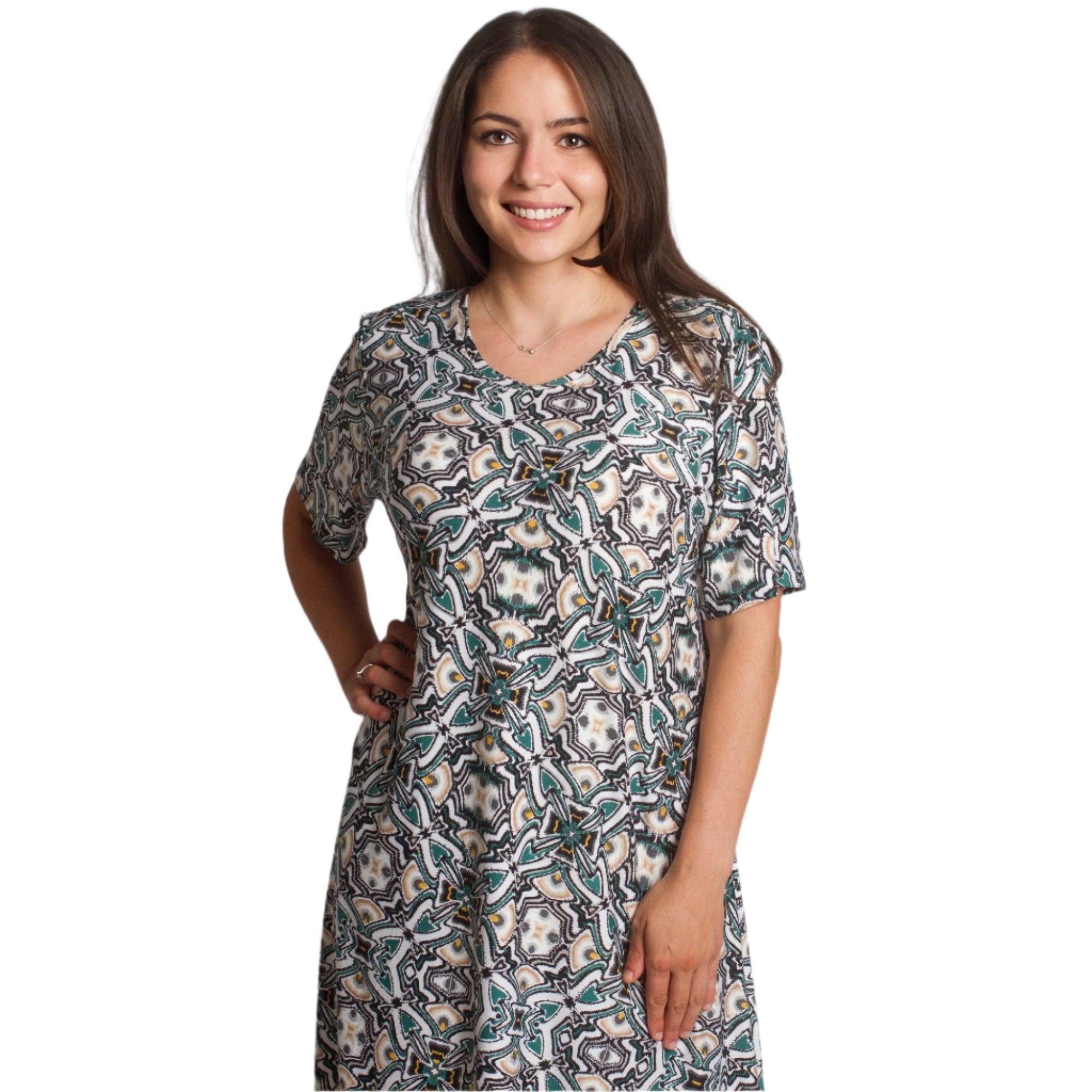 Această rochie spectaculoasă plus-size impresionează printr-un model geometric artistic în verde, maro și ecru. Modelul are decolteu rotund și mâneci scurte, iar croiul lejer asigură lejeritate și confort pe tot parcursul zilei. Potrivită atât pentru viața de zi cu zi, cât și pentru ocazii mai formale, rochia este confecționată din viscoză cu elastan - un material plăcut la atingere și care oferă elasticitatea și libertatea de mișcare necesare. O alegere ideală pentru sezonul primăvară-vară.