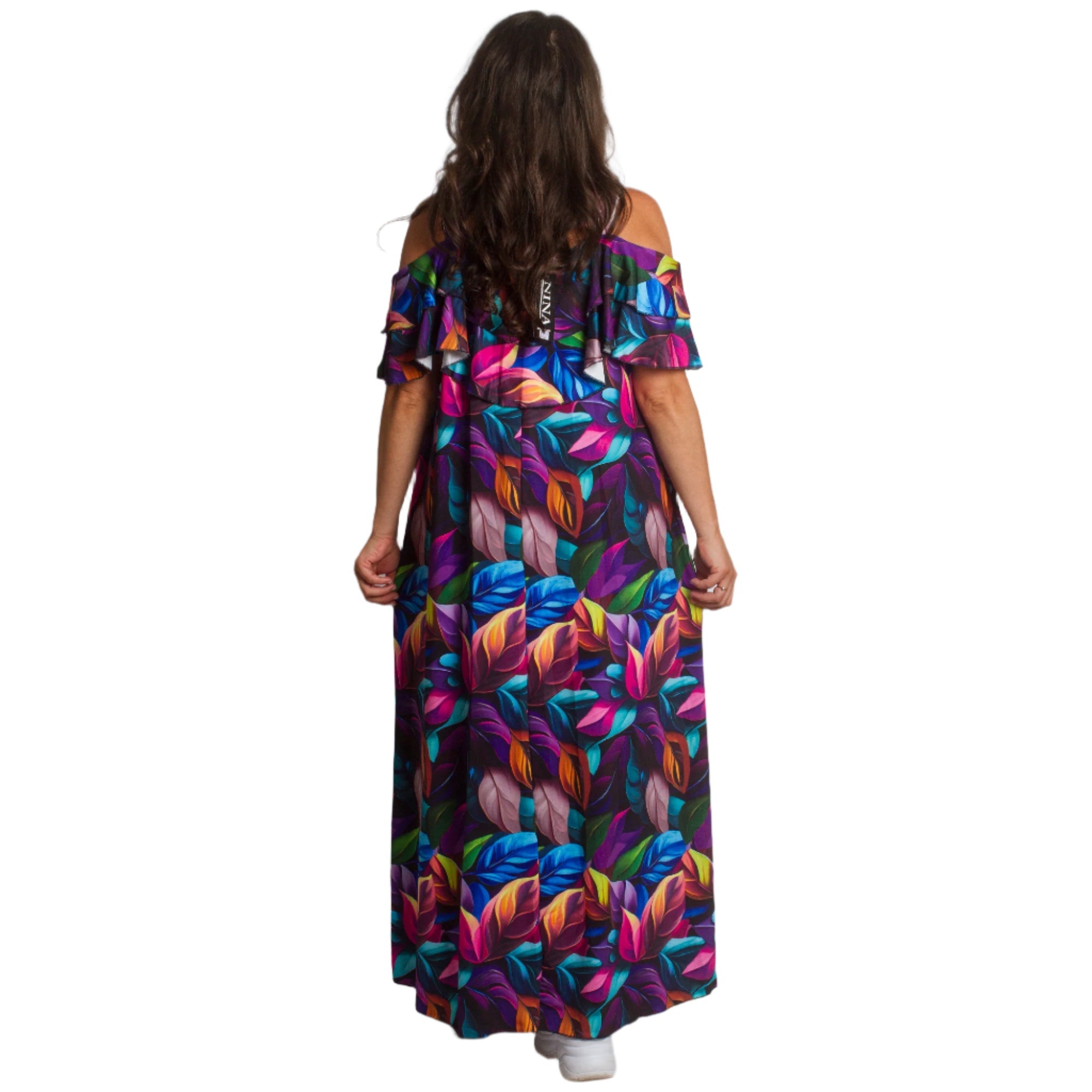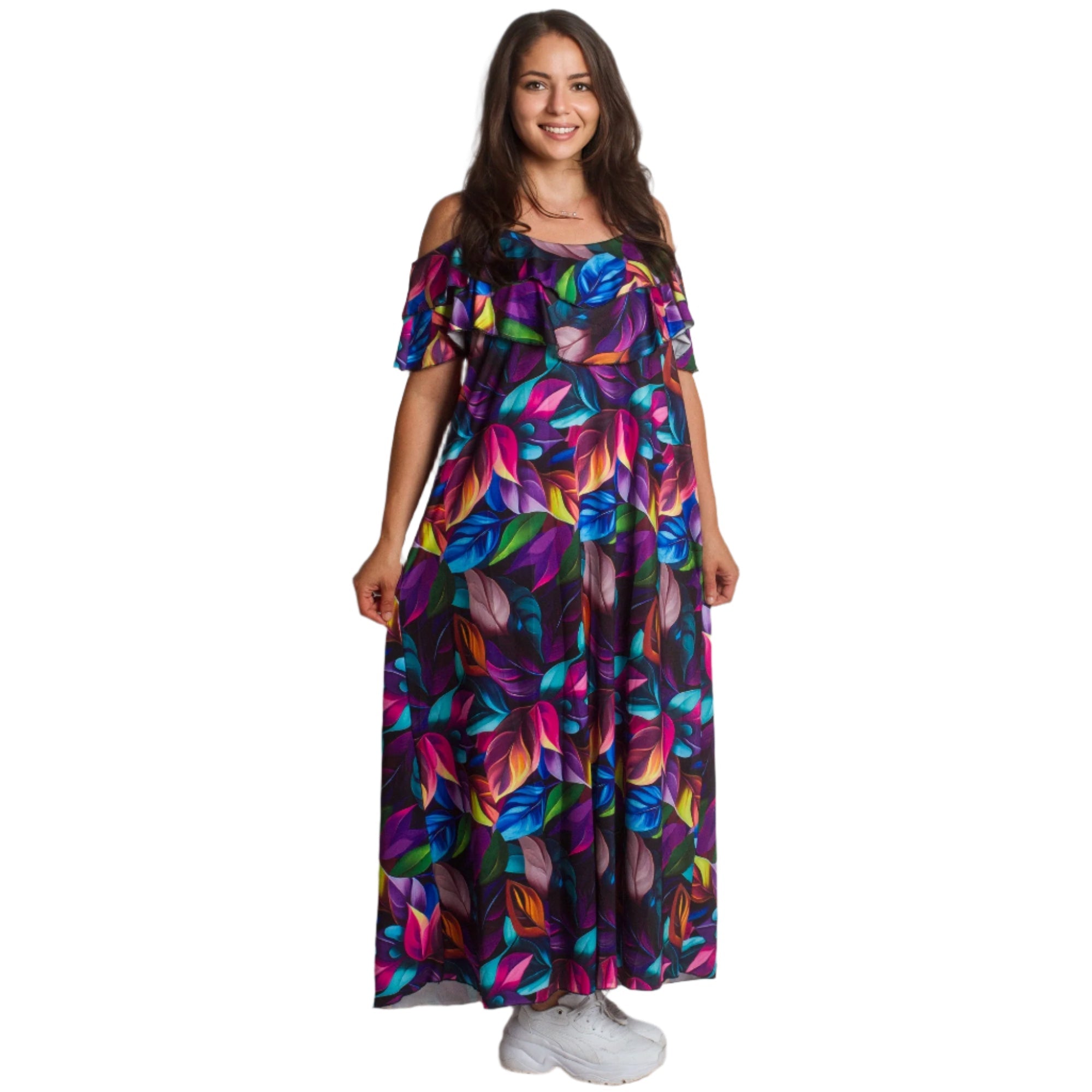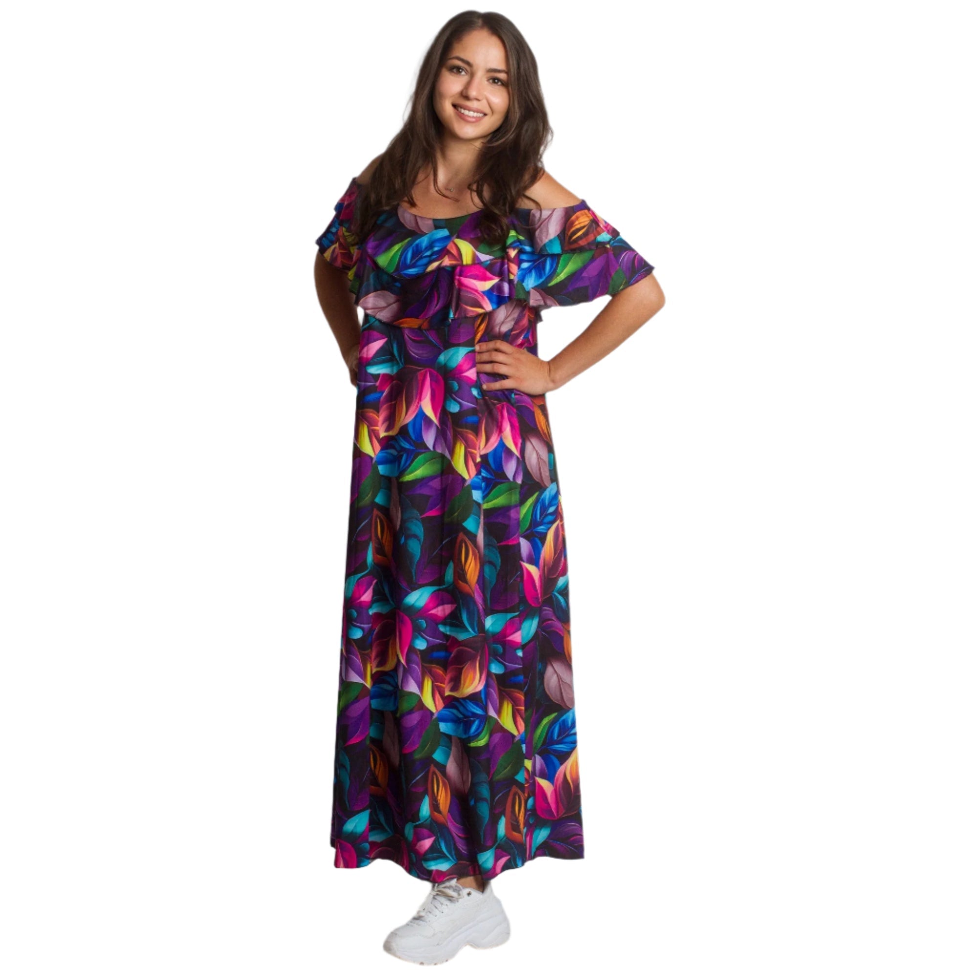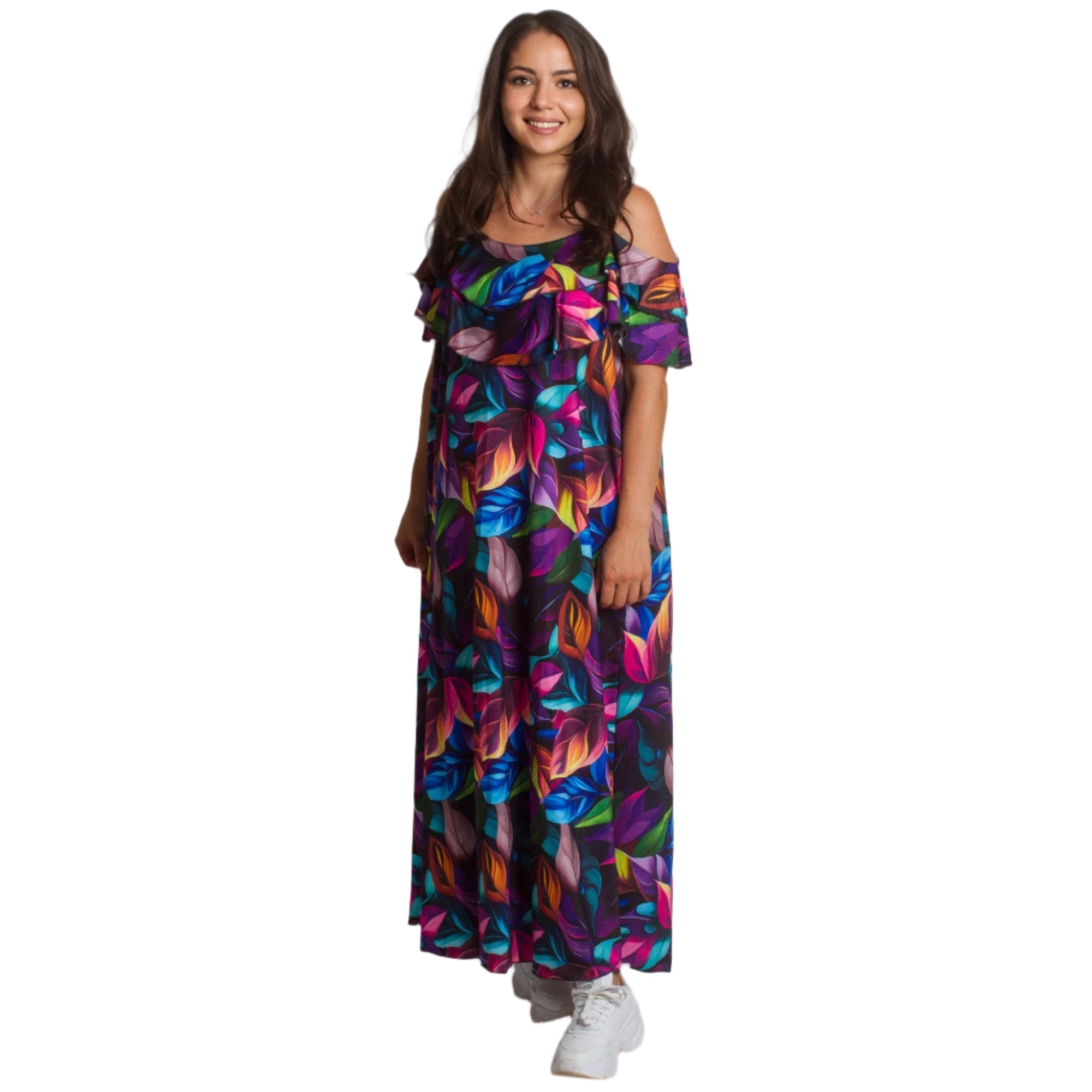 O rochie lungă captivantă, în mărimi mari, cu un model bogat multicolor în violet, albastru, portocaliu și verde. Modelul are bretele drepte și umeri descheiați, decorați cu volane duble spectaculoase, care conferă o notă feminină. Confecționată din 100% viscoză, rochia oferă confort și răcoare în zilele călduroase. Croiul său lejer cade liber pe corp și accentuează silueta fără a o contura. Este potrivită atât pentru ocazii de zi cu zi, cât și pentru ocazii mai formale.