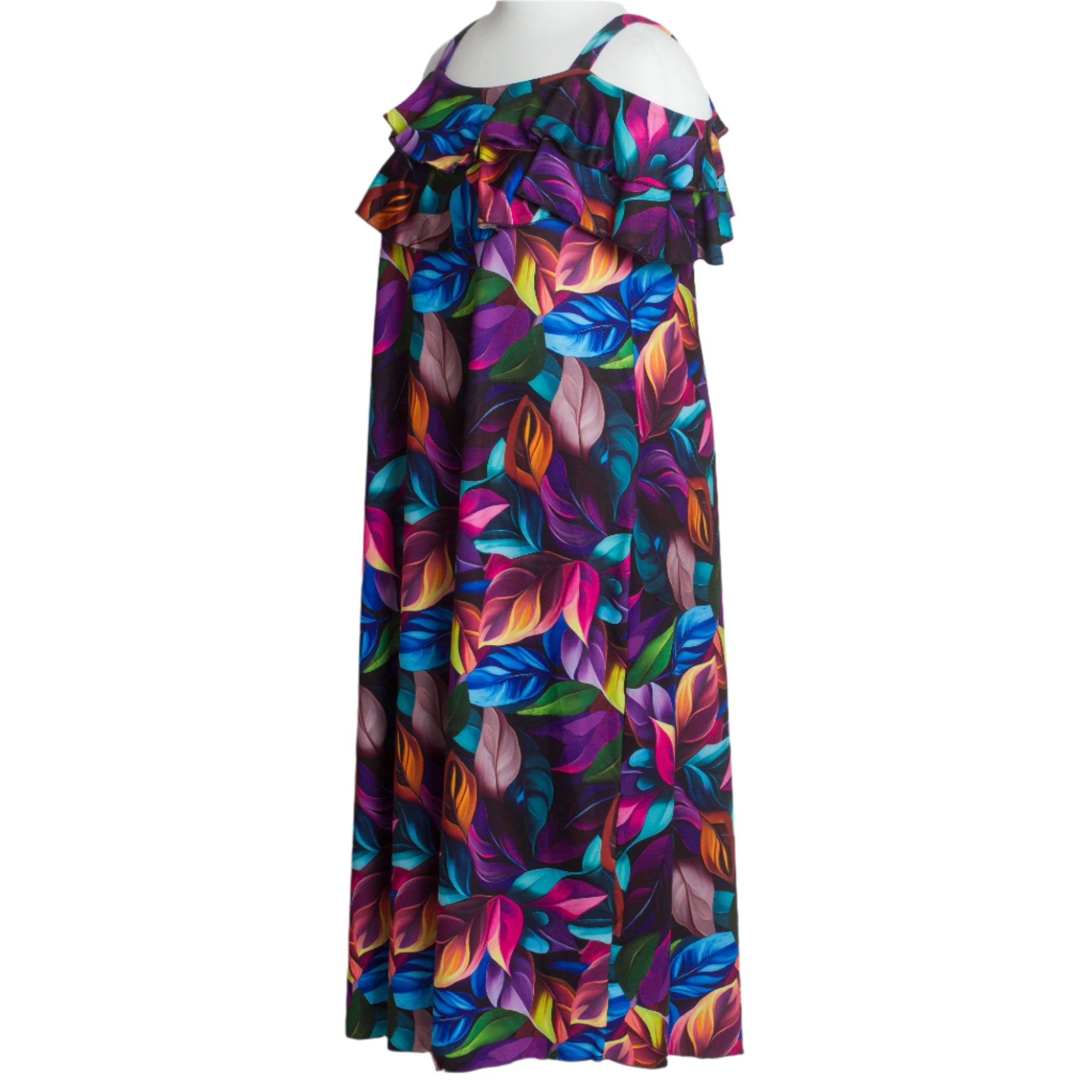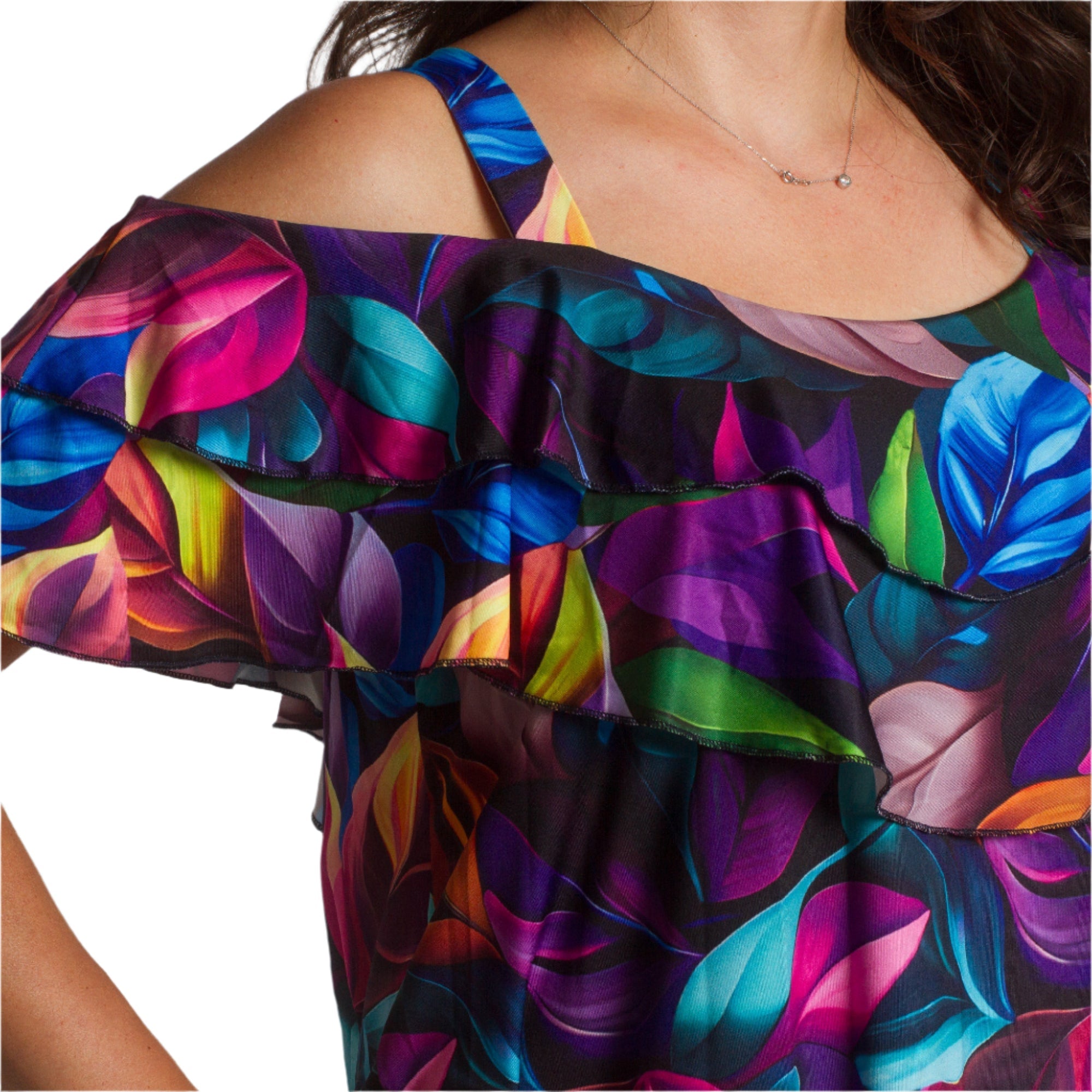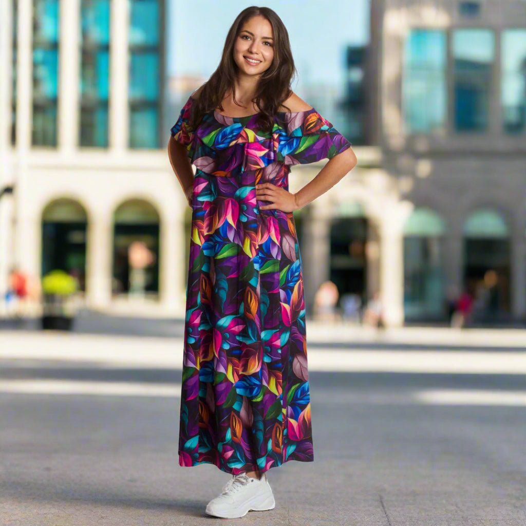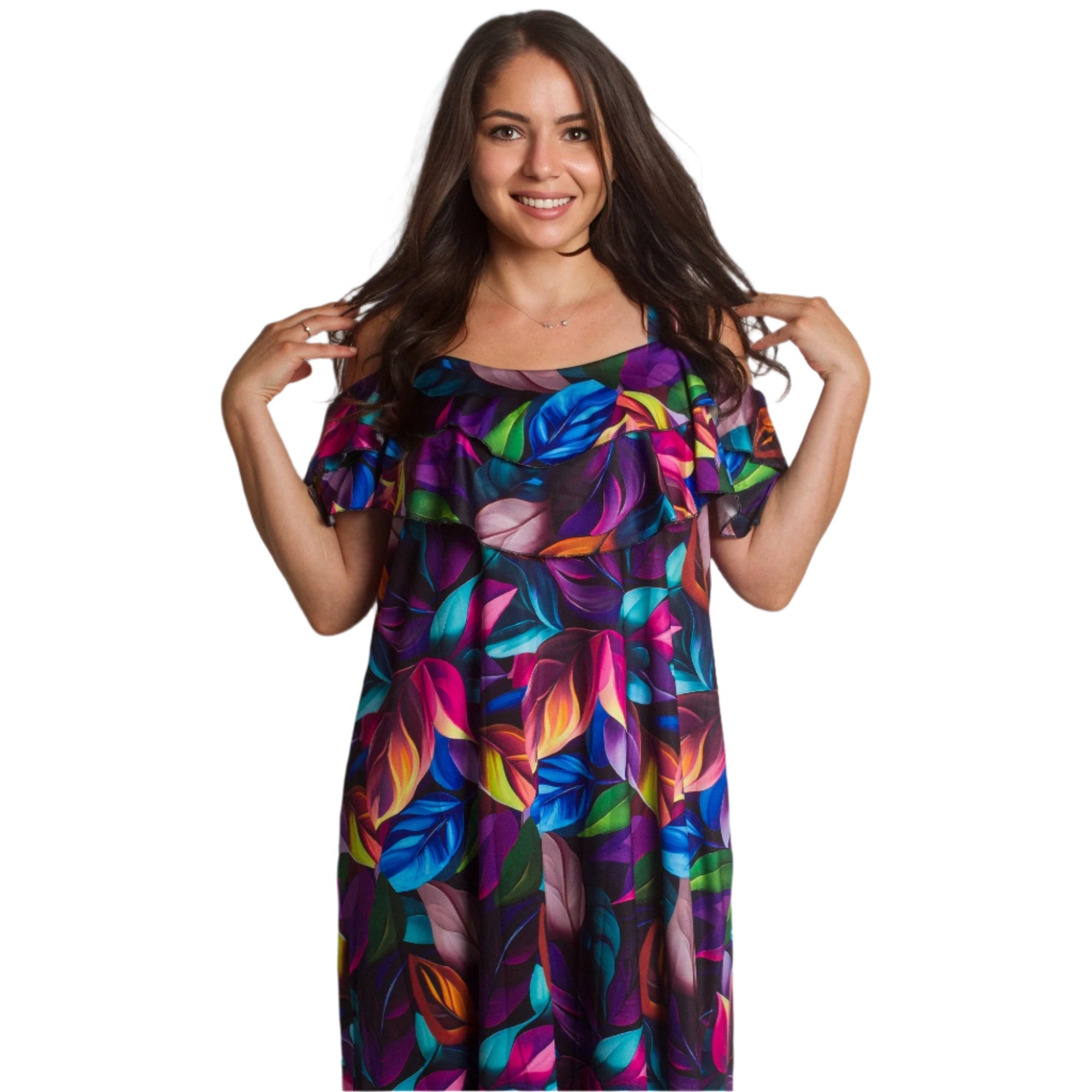 O rochie lungă captivantă, în mărimi mari, cu un model bogat multicolor în violet, albastru, portocaliu și verde. Modelul are bretele drepte și umeri descheiați, decorați cu volane duble spectaculoase, care conferă o notă feminină. Confecționată din 100% viscoză, rochia oferă confort și răcoare în zilele călduroase. Croiul său lejer cade liber pe corp și accentuează silueta fără a o contura. Este potrivită atât pentru ocazii de zi cu zi, cât și pentru ocazii mai formale.
