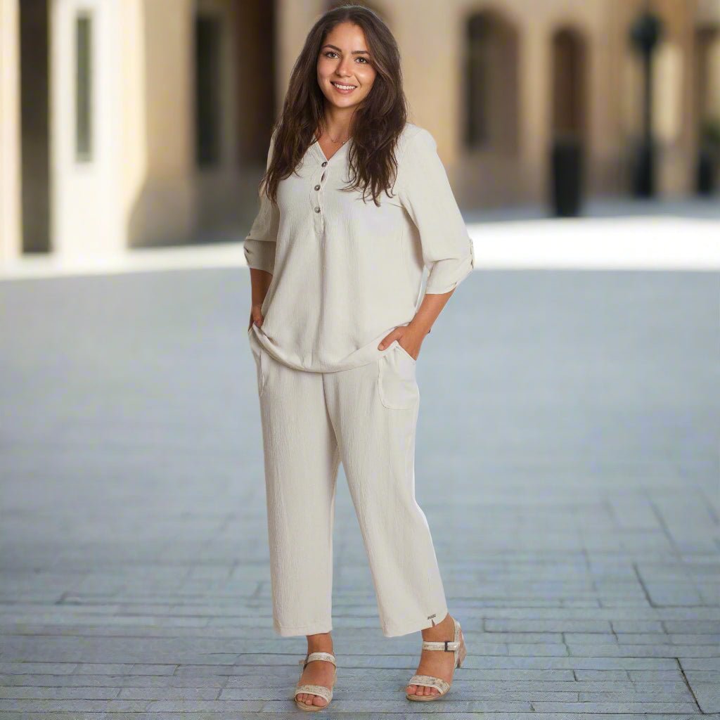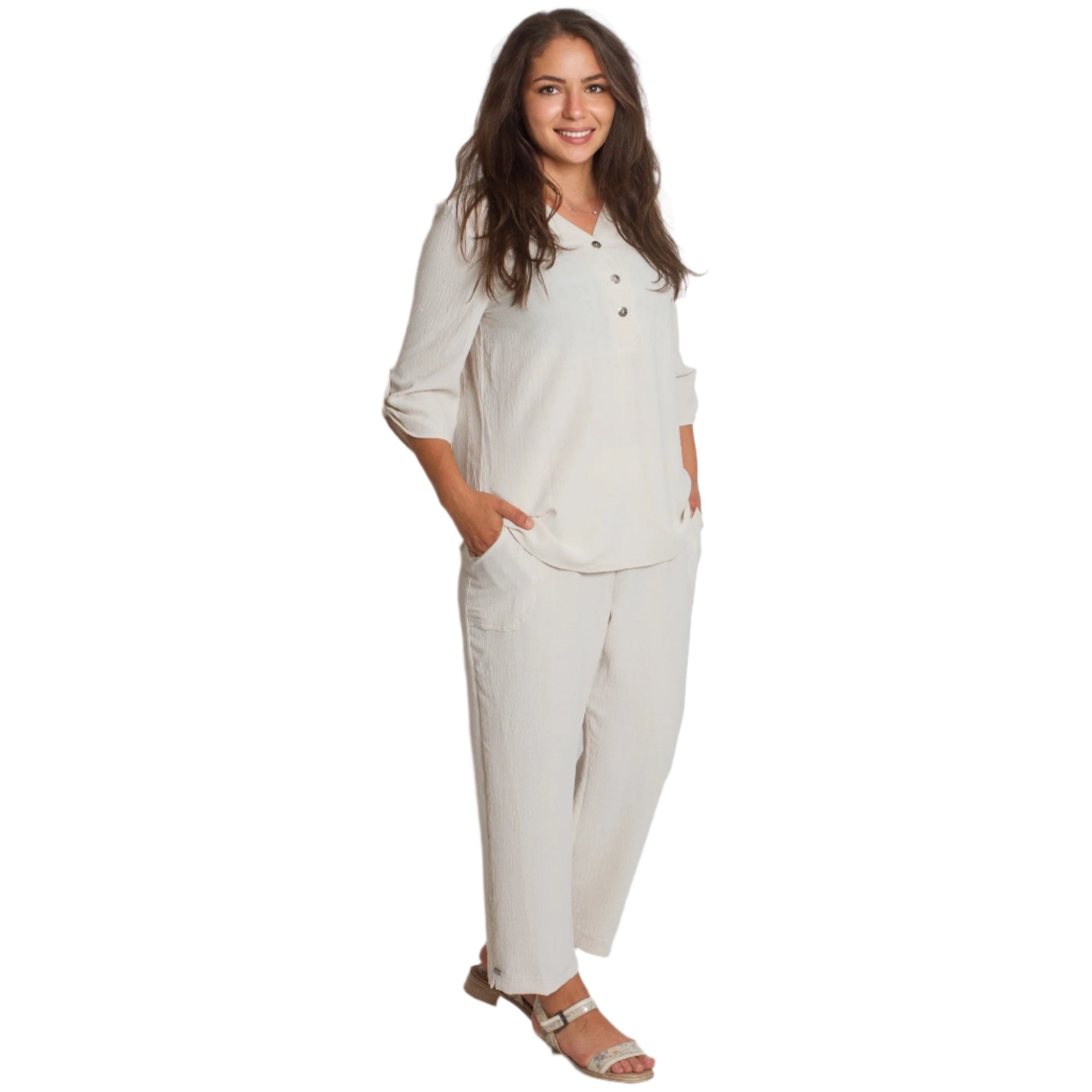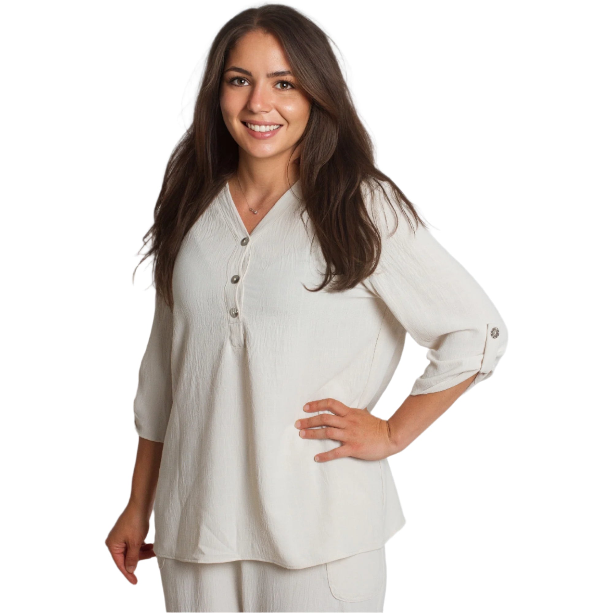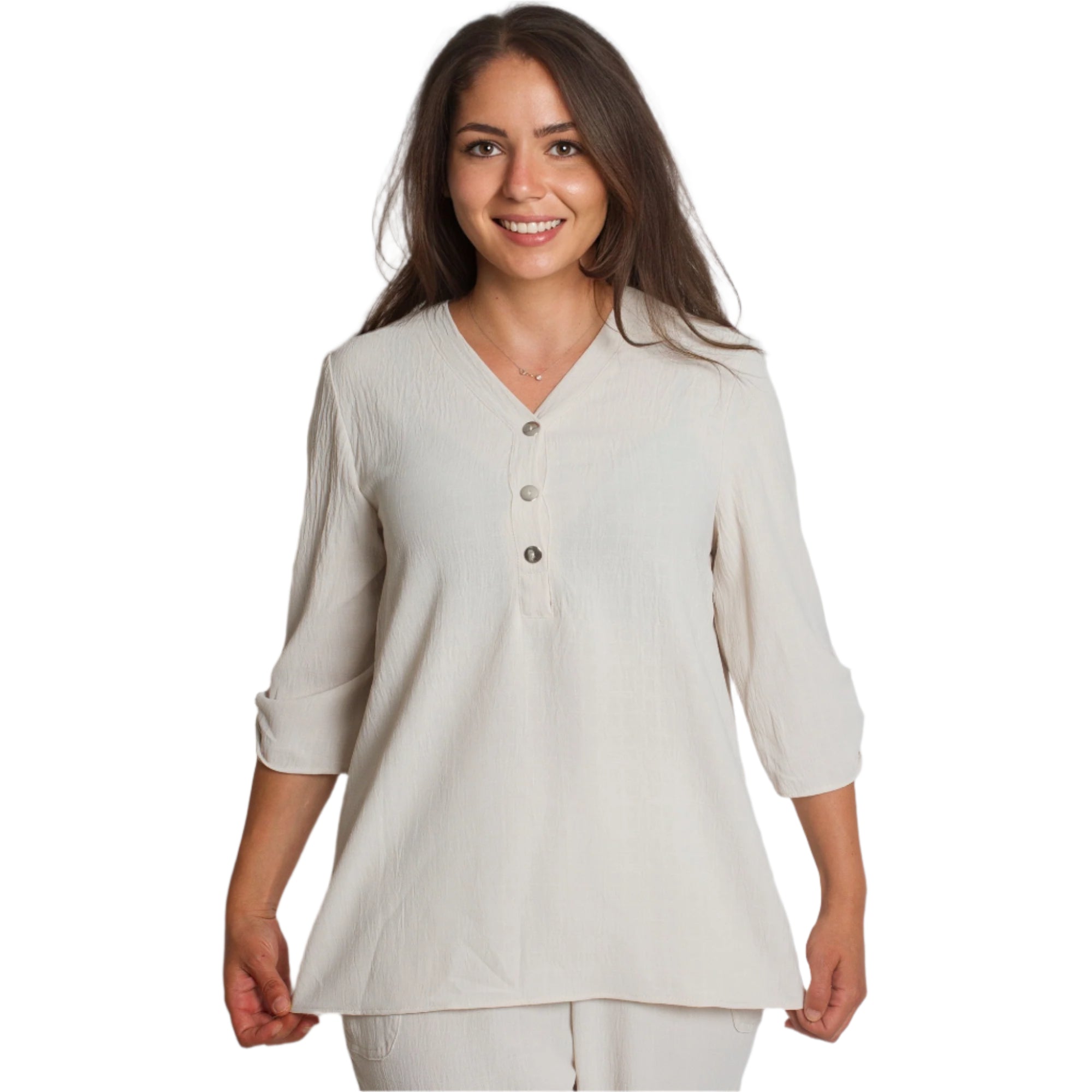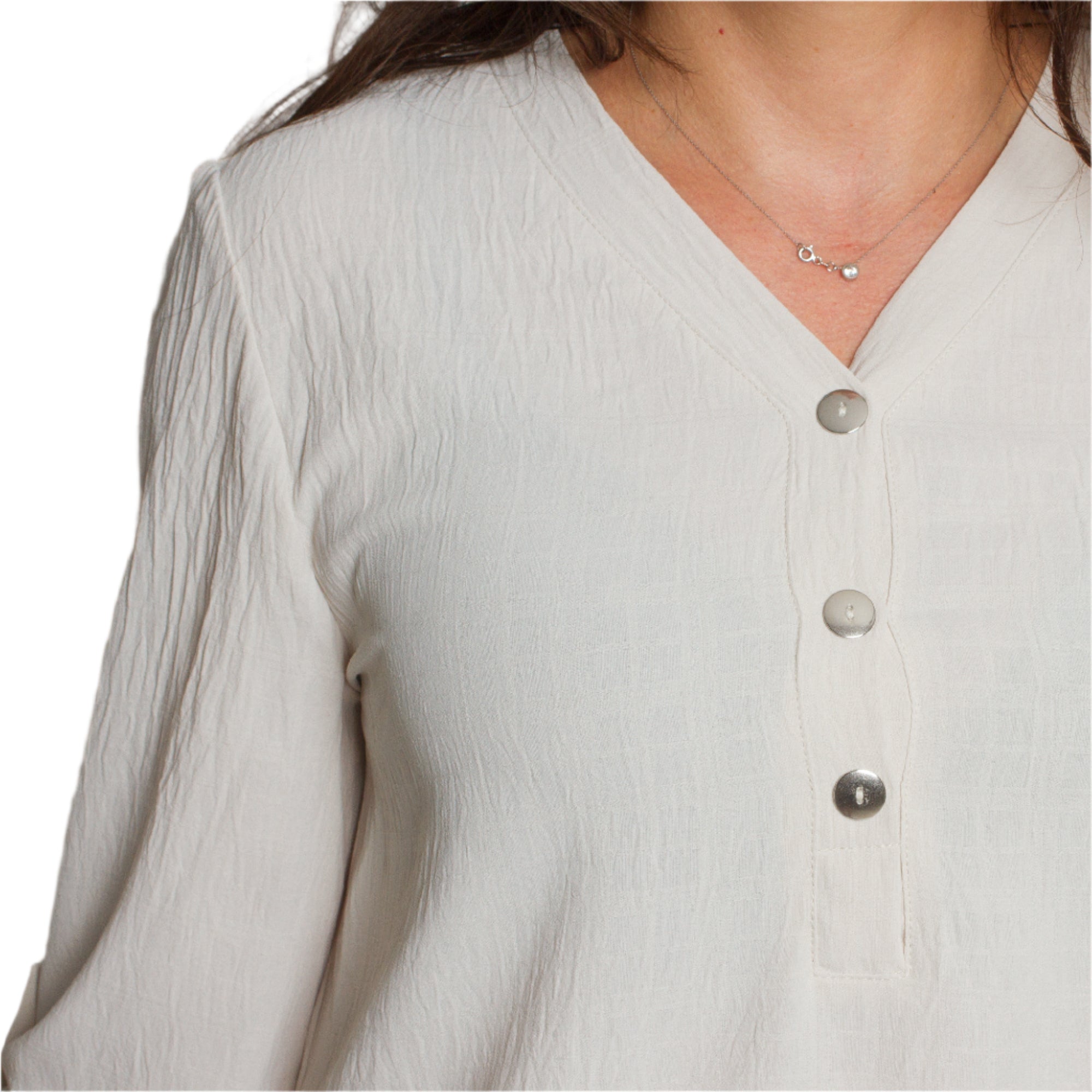 Această cămașă elegantă de culoare bej este concepută pentru stil și confort în sezonul primăvară-vară. Fabricată din material fin cu un conținut ridicat de vâscoză, oferă lejeritate și moliciune la atingere. Decolteul în V cu nasturi decorativi îi conferă un aspect modern, iar croiala dreaptă și mânecile ¾ o fac potrivită atât pentru ocazii de zi cu zi, cât și pentru ocazii mai formale. Elasticitatea moale oferă confort suplimentar în timpul mișcării.