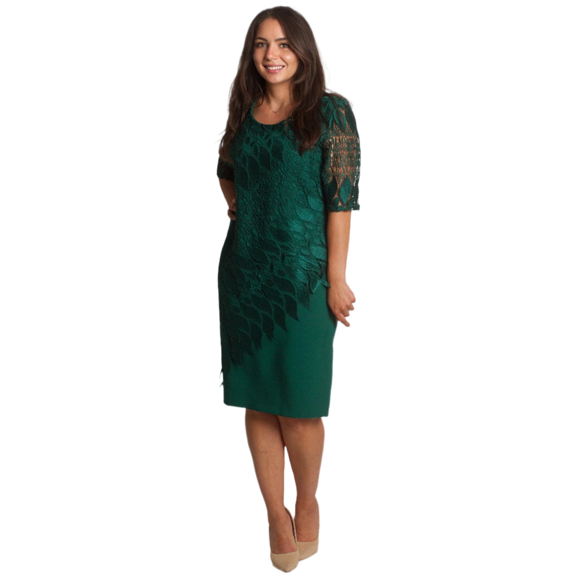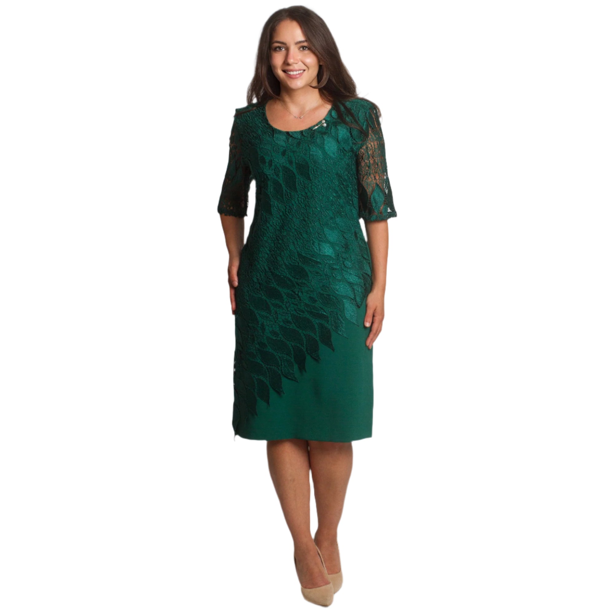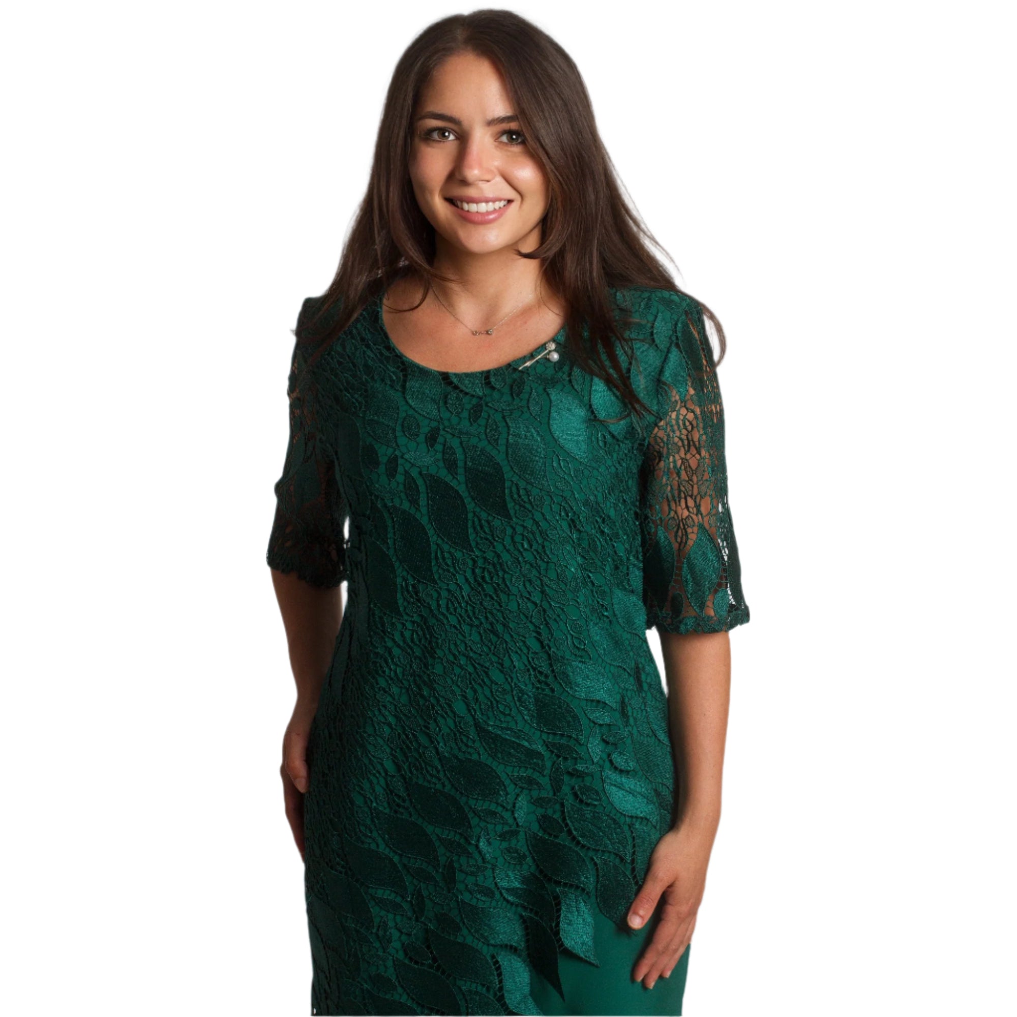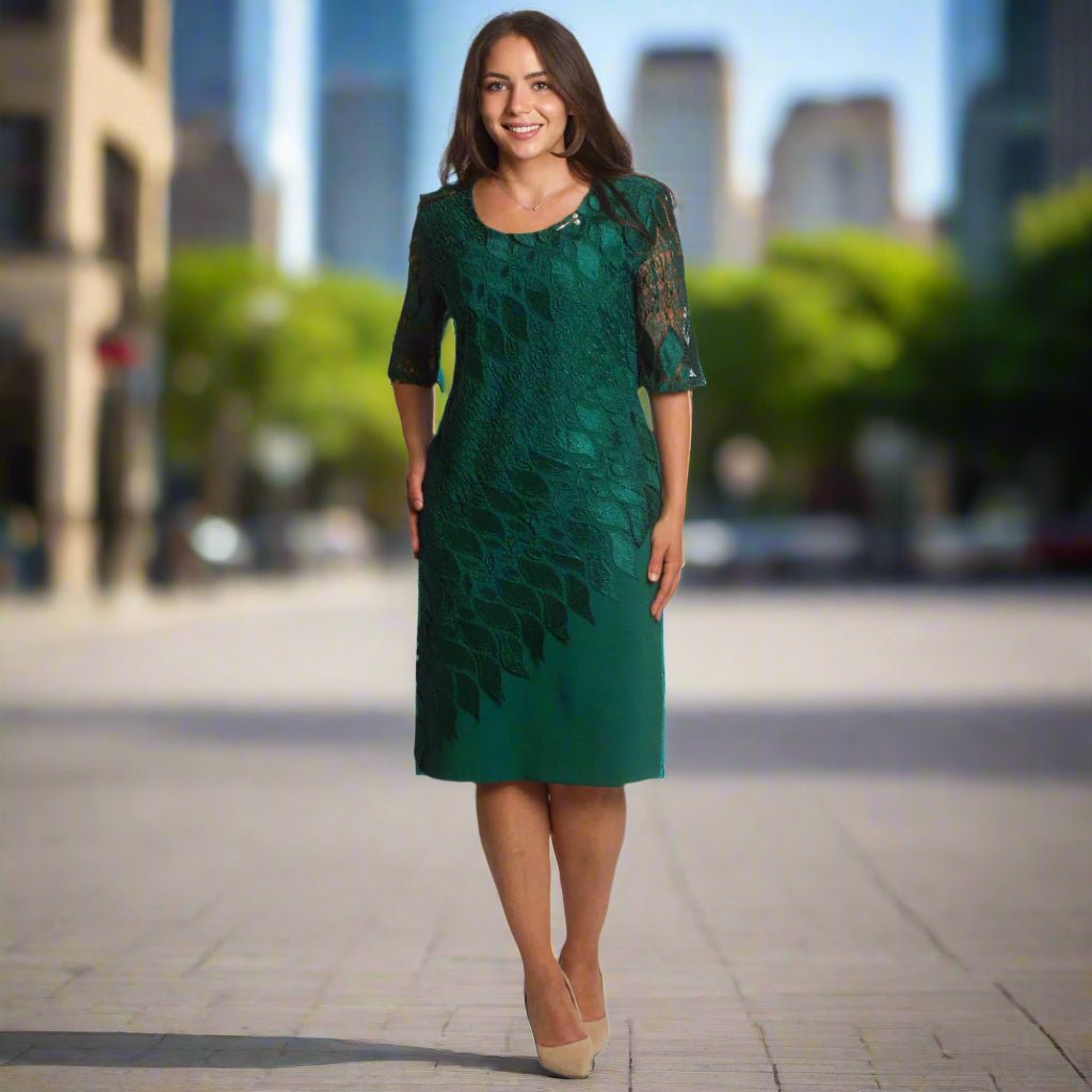 Fii stilată și elegantă cu această rochie formală verde închis. Confecționată din viscoză de înaltă calitate cu elastan, oferă confort și ușurință în mișcare. Designul impresionează printr-o textură florală și mâneci din dantelă ajourée, care conferă un aspect subtil și sofisticat. Decolteul rotund și croiul drept accentuează feminitatea, iar finisajul ușor asimetric adaugă un accent modern. Este potrivită pentru evenimente formale, sărbători în familie și ocazii festive în sezonul primăvară-vară.