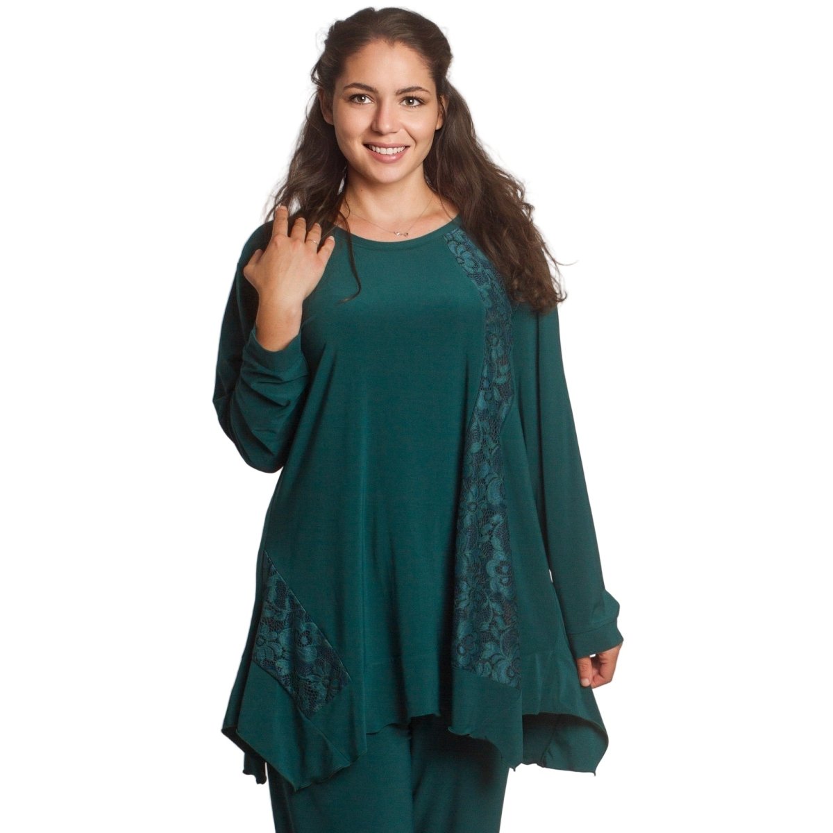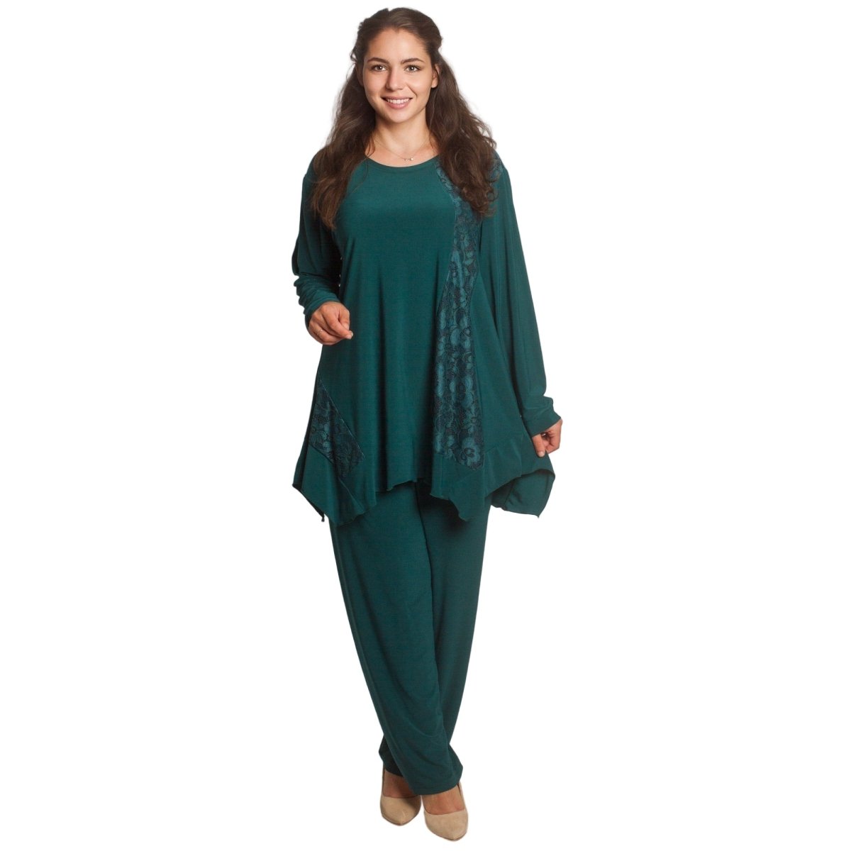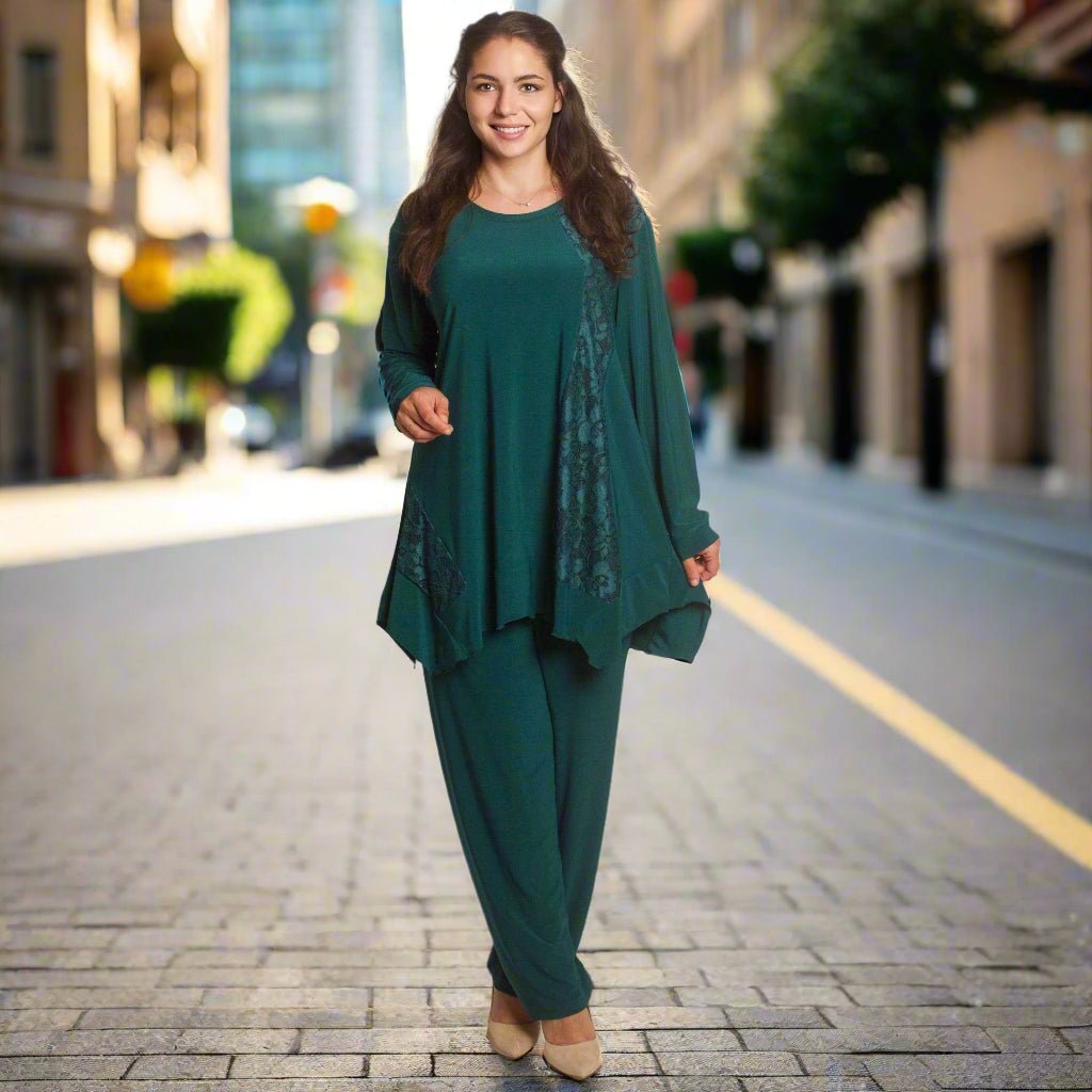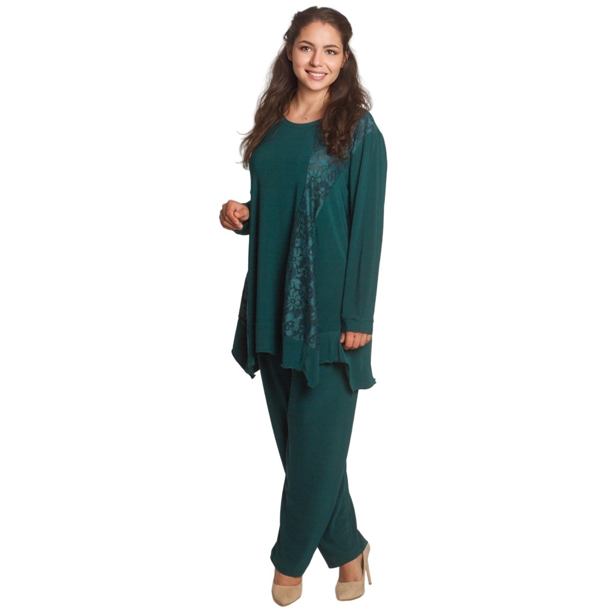 Acest costum elegant pentru femei, mărime plus, combină confortul și eleganța. Este alcătuit din două părți - o bluză evazată cu design asimetric și imprimeu cu motive albastre și albe și pantaloni drepți cu talie elastică pentru un confort sporit. Materialul este ușor, respirabil și elastic, fiind o alegere ideală pentru evenimente formale și ocazii speciale. Potrivit pentru sezonul primăvară-vară, acest model este conceput special pentru femeile care apreciază confortul și un aspect elegant.