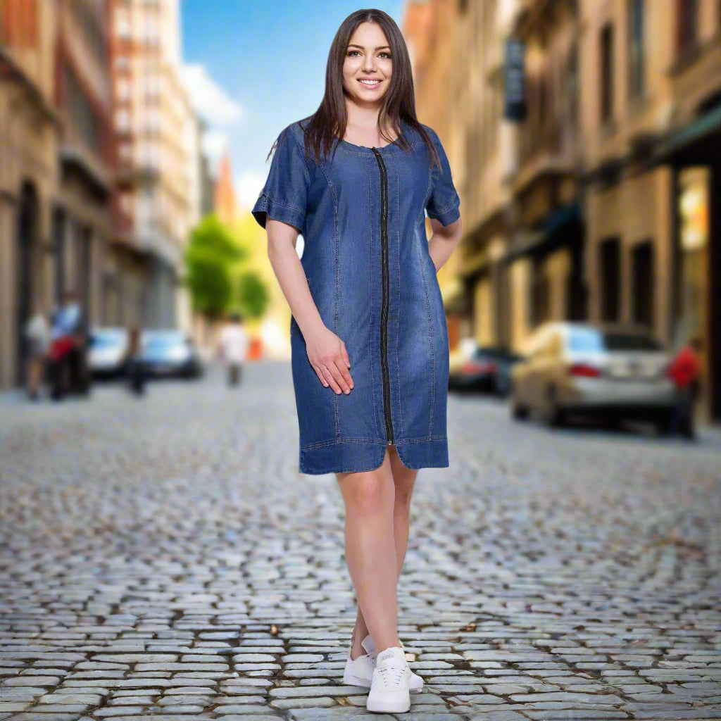 Această rochie bleumarin din denim de la Maxi Market este alegerea perfectă pentru ocaziile formale din sezonul primăvară-vară. Cu un decolteu rotund clasic și lungime până la jumătatea gambei, rochia este confecționată din bumbac de înaltă calitate, cu adaos de 2% elastan, care oferă confort și flexibilitate suplimentare. Modelul are buzunare, ceea ce adaugă practicitate și funcționalitate. Un accent distinctiv îl reprezintă țesăturile groase și aspectul curat, care fac ca această rochie să fie perfectă pentru orice doamnă care dorește să arate elegantă și să se simtă încrezătoare în stilul ei.