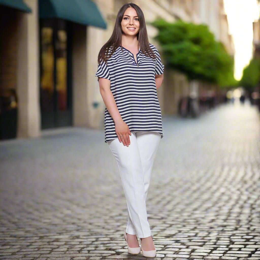 Găsește tunica formală perfectă pentru orice ocazie specială la Maxi Market. Această tunică bleumarin cu dungi și decolteu în V este confecționată din materiale de înaltă calitate - 95% vâscoză și 5% elastan, care oferă confort și flexibilitate la purtare. Croiul lejer garantează o plăcere și o libertate de mișcare de neegalat, făcând această tunică ideală pentru orice doamnă care caută stil și confort. Mizează pe durabilitate și eleganță pentru sezonul primăvară-vară. Potrivită pentru evenimente formale, această tunică te va face cu siguranță să ieși în evidență.