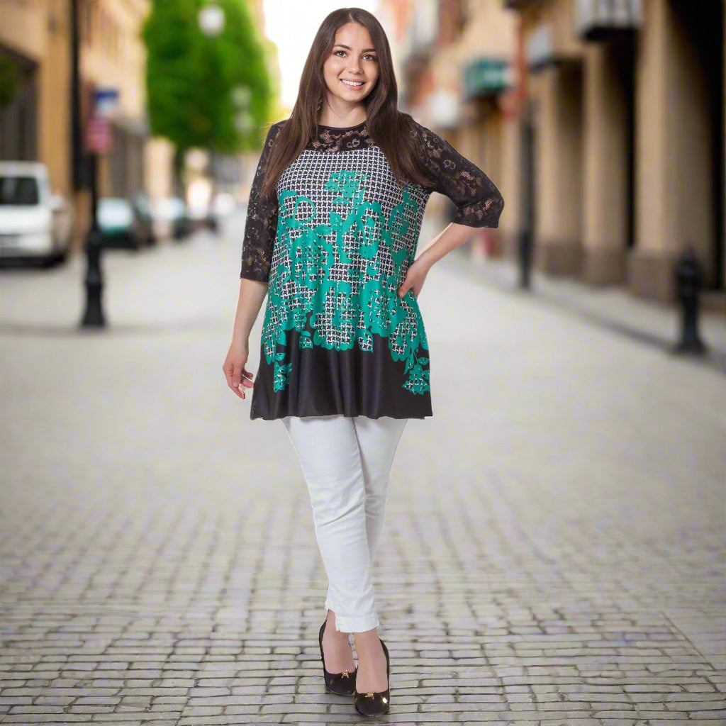 Descoperă frumoasa și colorata noastră tunică formală din dantelă de la Maxi Market, perfectă pentru sezonul primăvară-vară. Această tunică este confecționată din viscoză și elastan, fiind nu doar elegantă, ci și confortabilă. Modelul abstract și colorat adaugă o notă de eleganță și rafinament, fiind alegerea perfectă pentru orice eveniment formal. Asigură-ți un look elegant și confortabil cu tunica noastră pentru femei plus size, concepută special pentru doamnele plus size.