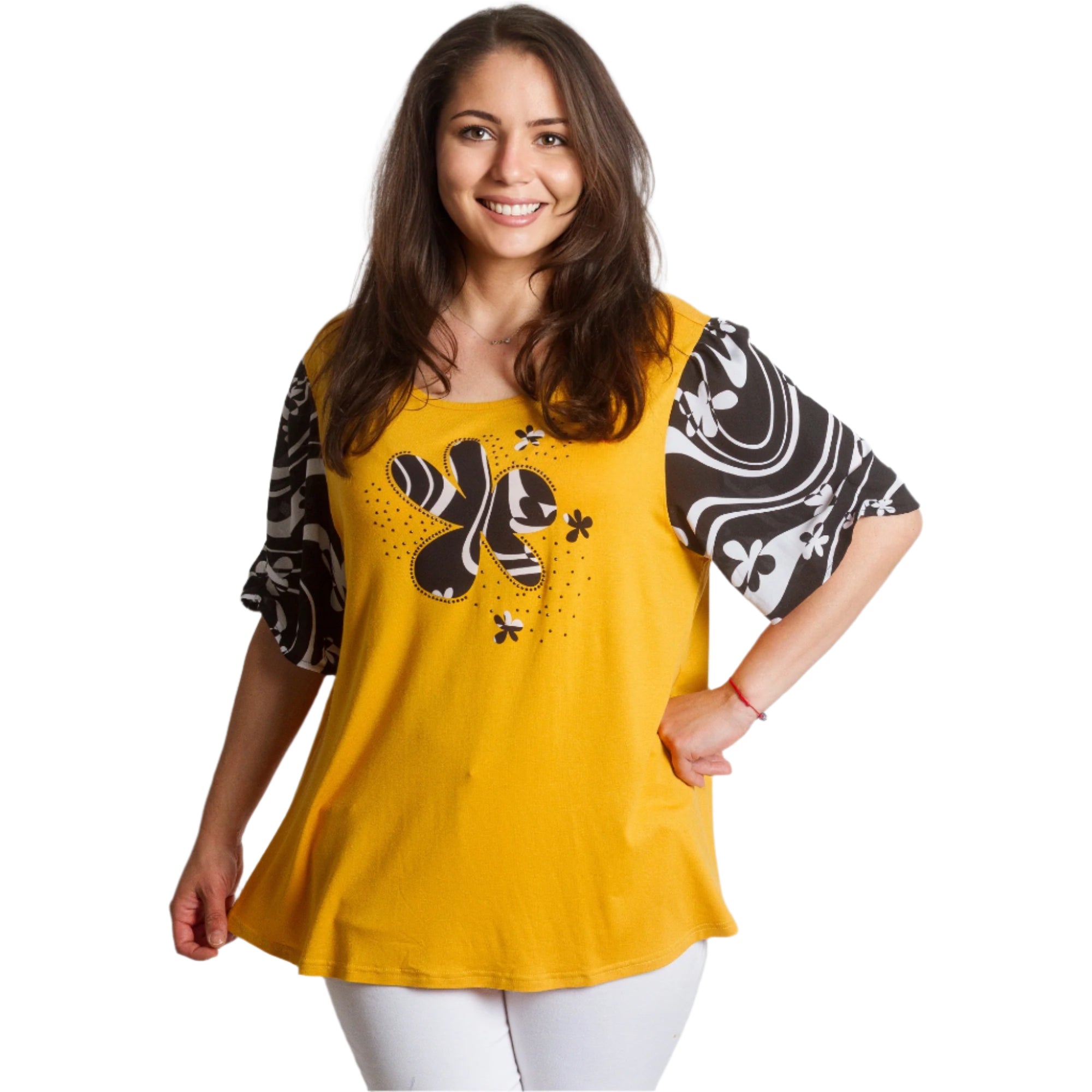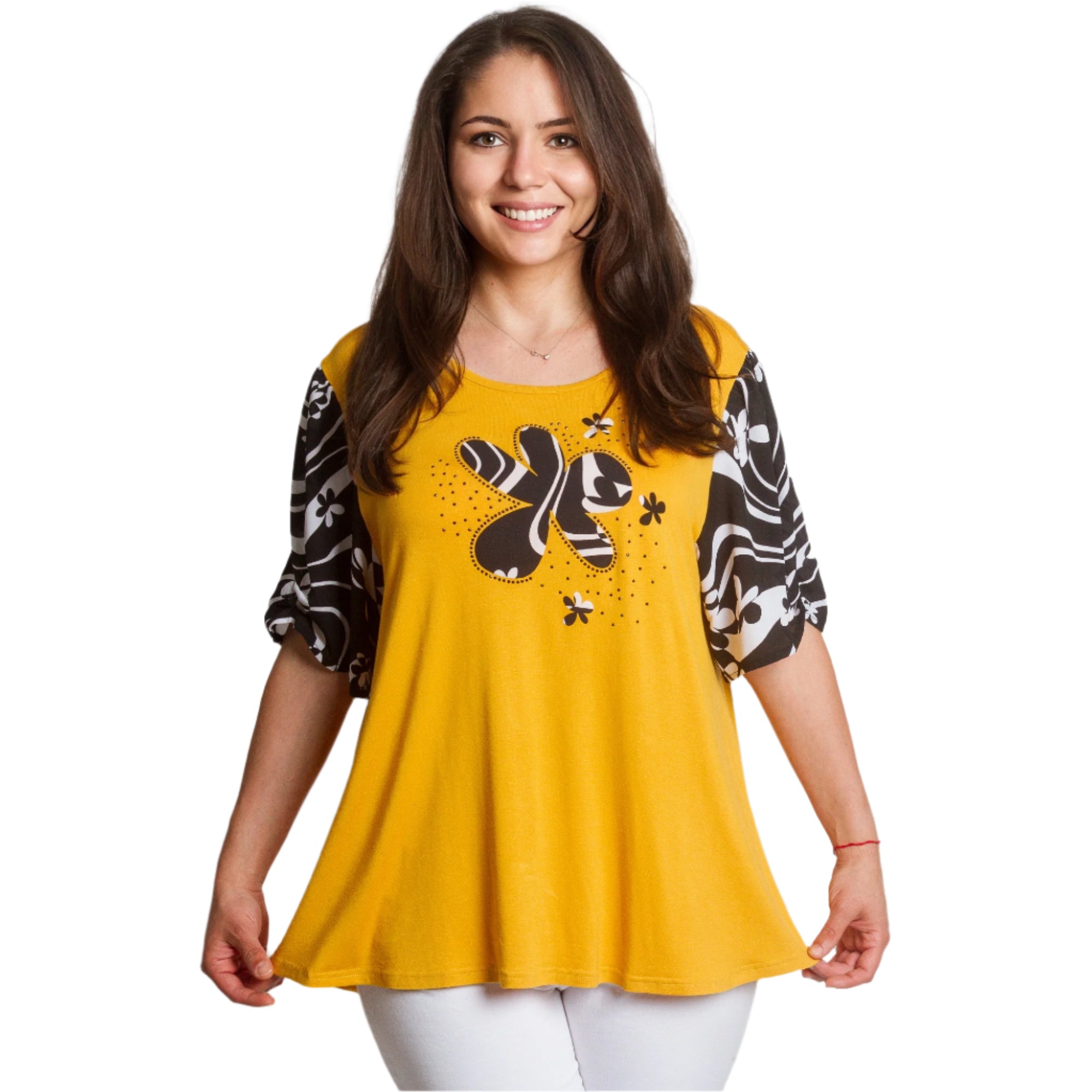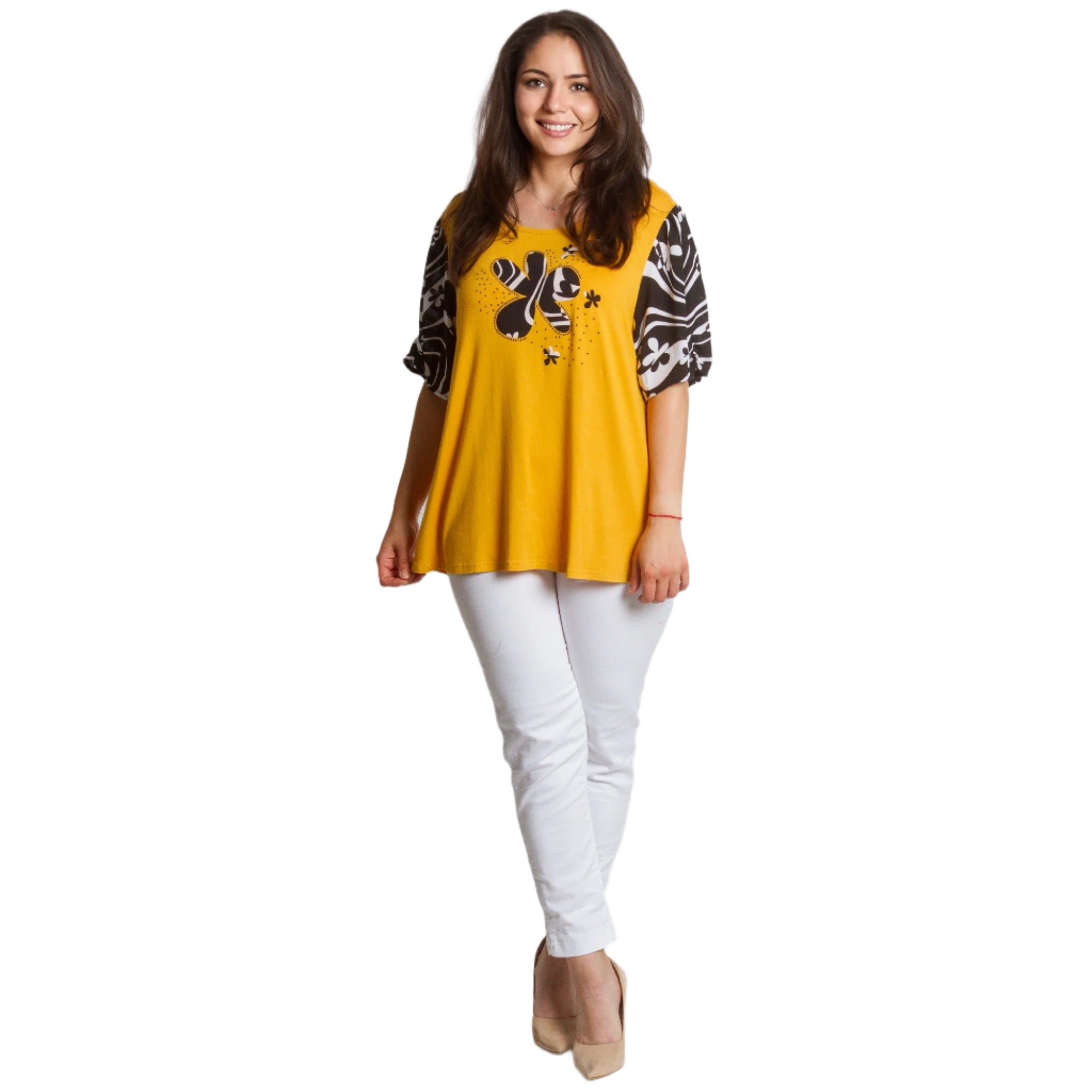 Această tunică evazată de la Maxi Market este o alegere perfectă pentru sezonul primăvară-vară. Într-o frumoasă culoare galbenă și neagră și cu un model abstract, adaugă o notă de stil și confort garderobei tale de zi cu zi. Fabricată din materiale de înaltă calitate, 95% vâscoză și 5% elastan, promite confort și libertate de mișcare. Decolteul rotund completează aspectul versatil, făcând tunica potrivită atât pentru o plimbare în parc, cât și pentru o întâlnire ușoară cu prietenii.