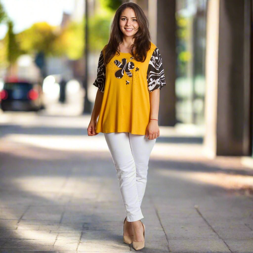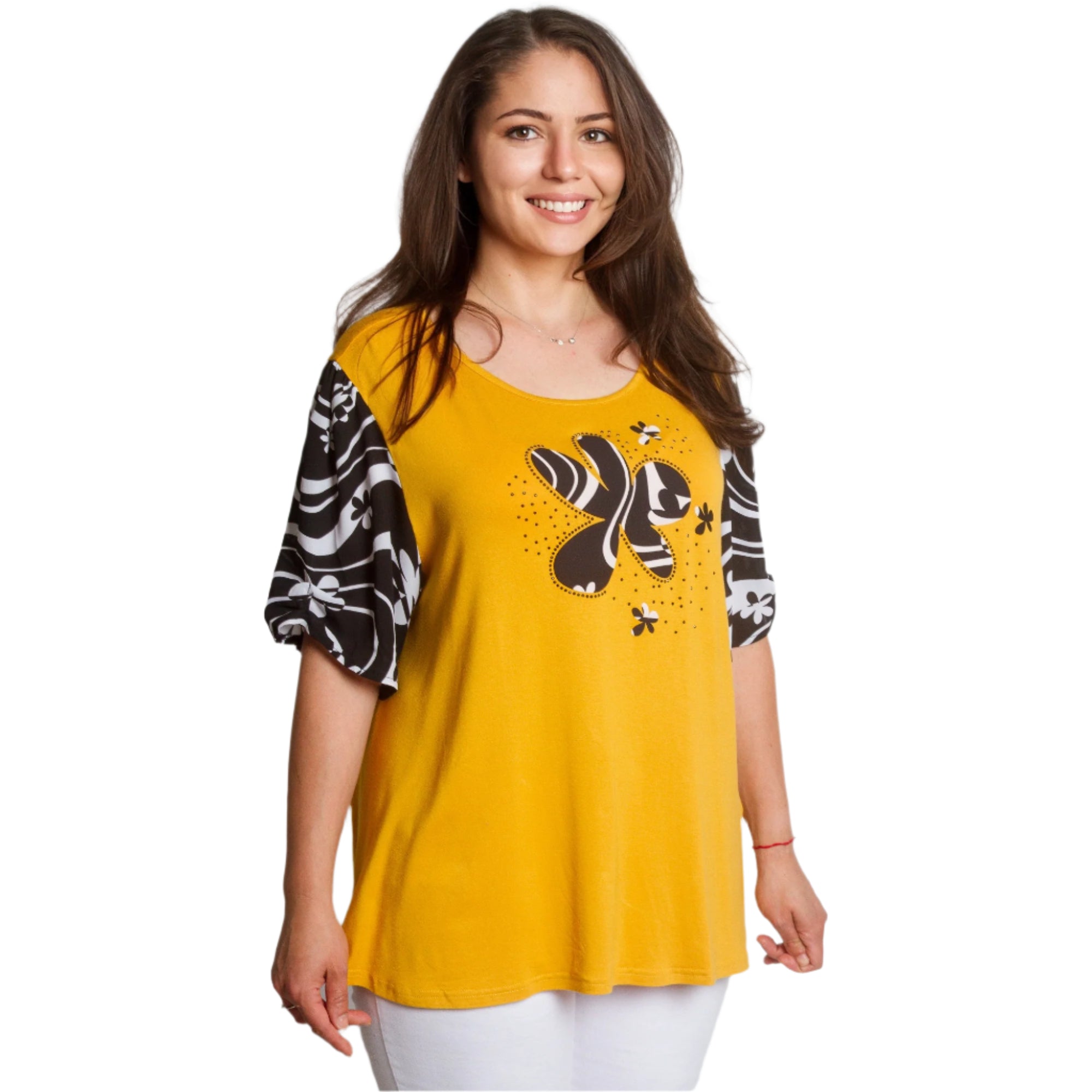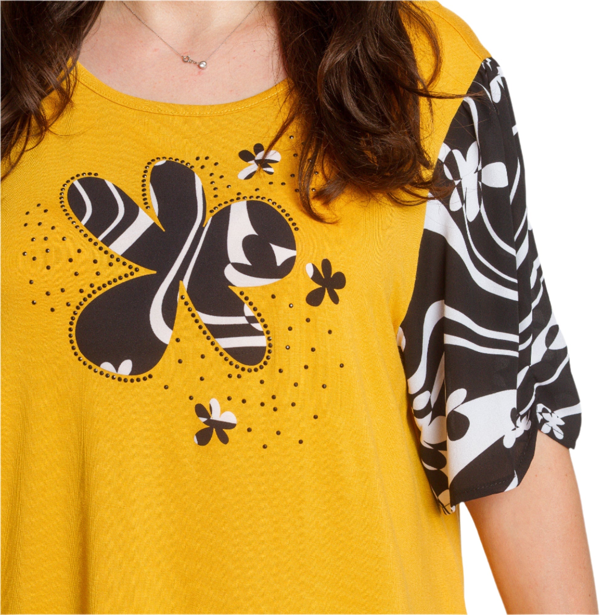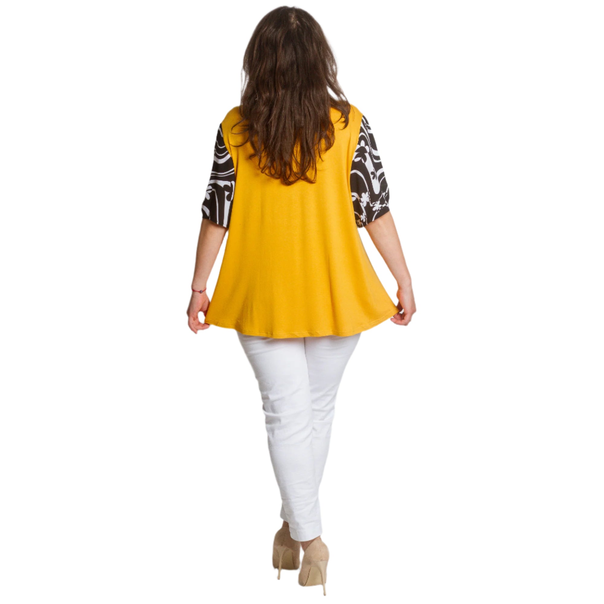 Această tunică evazată de la Maxi Market este o alegere perfectă pentru sezonul primăvară-vară. Într-o frumoasă culoare galbenă și neagră și cu un model abstract, adaugă o notă de stil și confort garderobei tale de zi cu zi. Fabricată din materiale de înaltă calitate, 95% vâscoză și 5% elastan, promite confort și libertate de mișcare. Decolteul rotund completează aspectul versatil, făcând tunica potrivită atât pentru o plimbare în parc, cât și pentru o întâlnire ușoară cu prietenii.