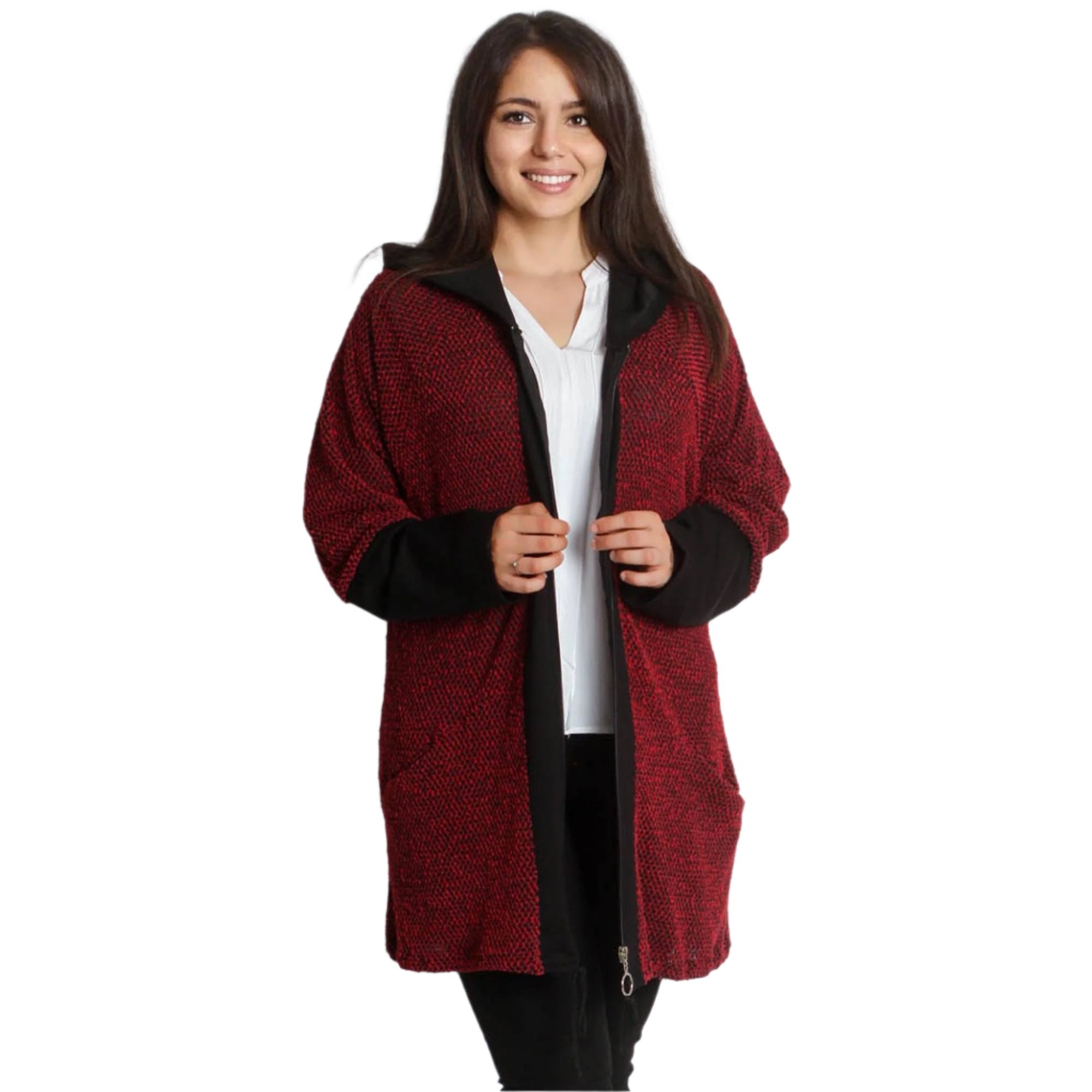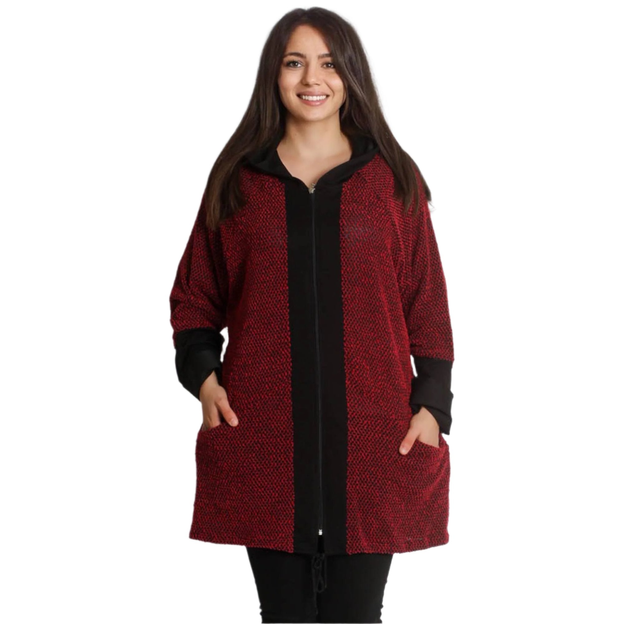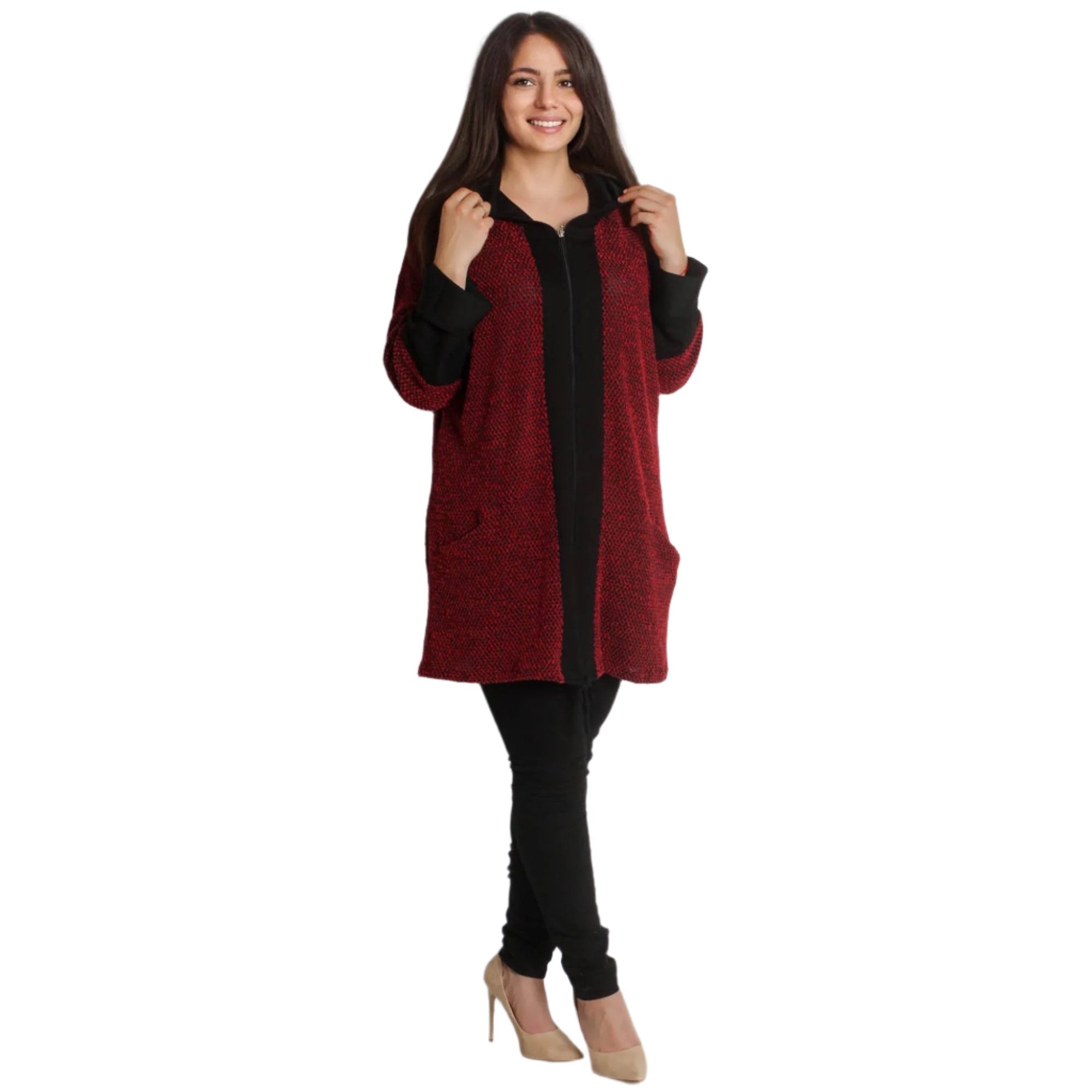 Jachetă de damă din material bouclé, în eleganta culoare bordo, confecționată din 70% poliamidă, 25% poliester și 5% elastan. Modelul are buzunare și glugă, ceea ce o face ideală pentru sezonul toamnă-iarnă. O alegere practică și elegantă atât pentru viața de zi cu zi, cât și pentru ocazii formale.
