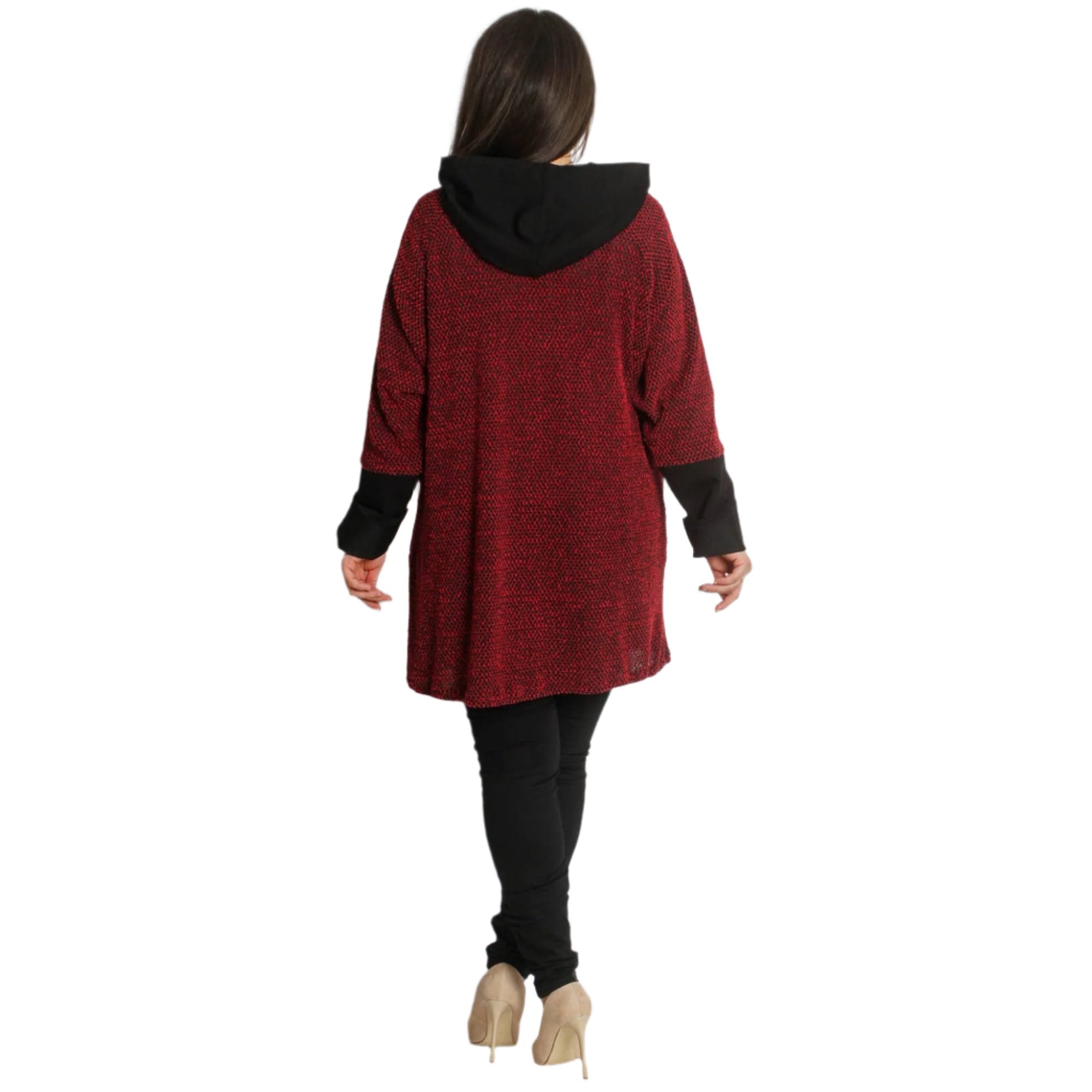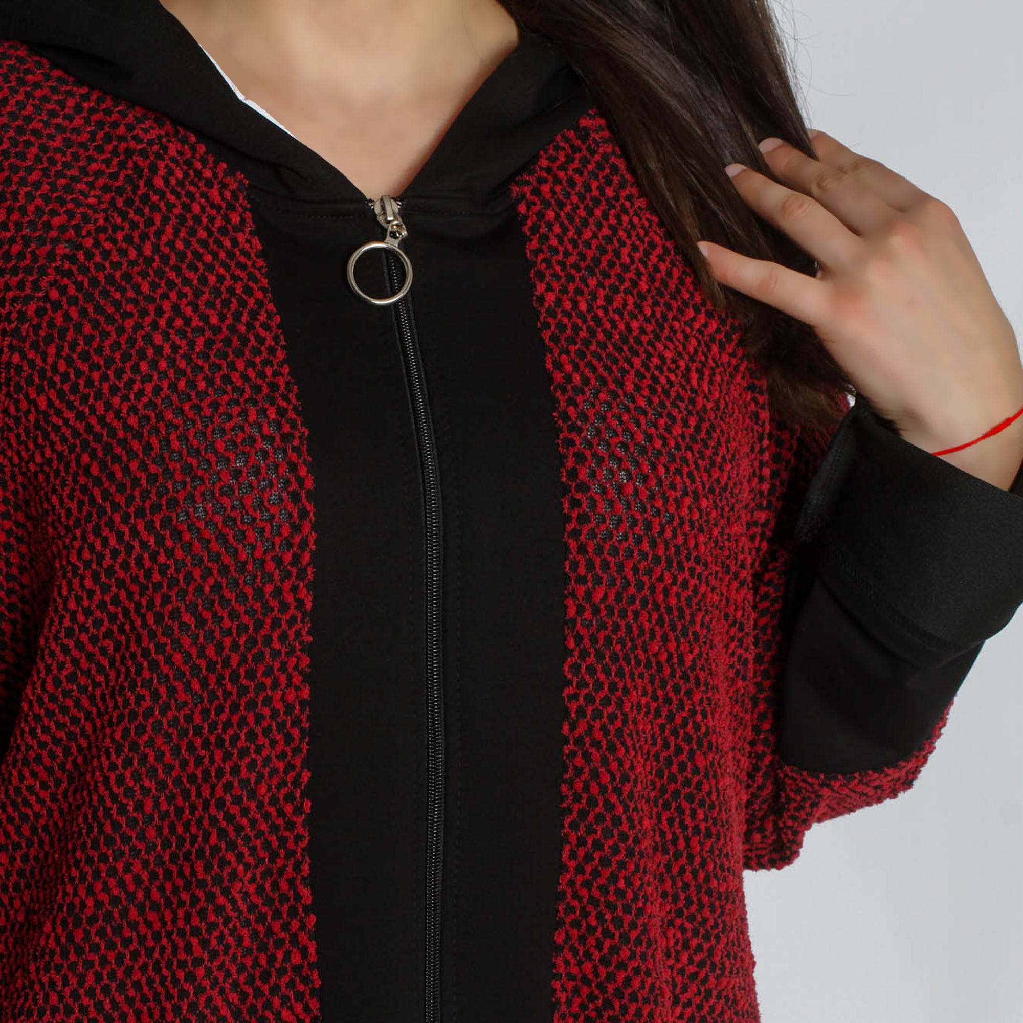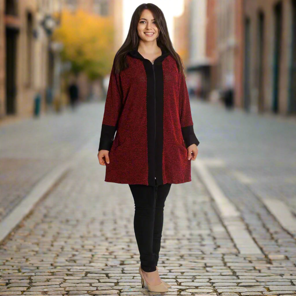Jachetă de damă din material bouclé, în eleganta culoare bordo, confecționată din 70% poliamidă, 25% poliester și 5% elastan. Modelul are buzunare și glugă, ceea ce o face ideală pentru sezonul toamnă-iarnă. O alegere practică și elegantă atât pentru viața de zi cu zi, cât și pentru ocazii formale.