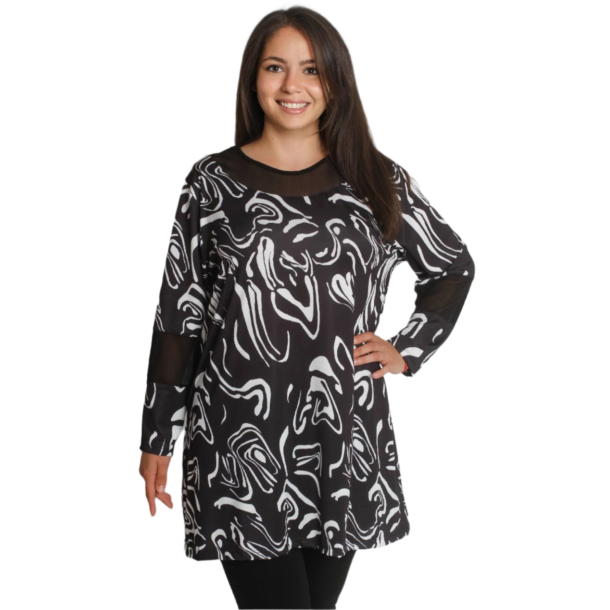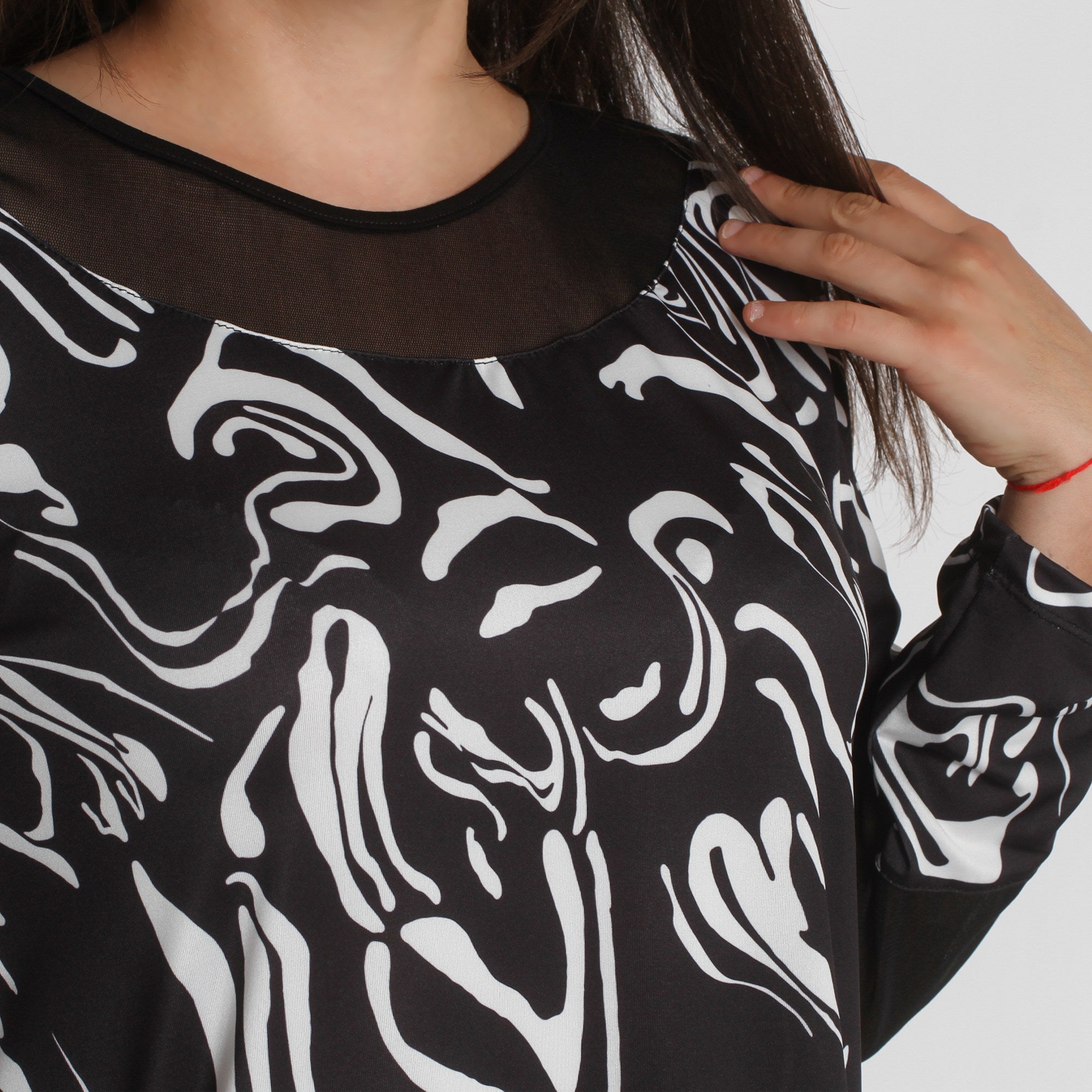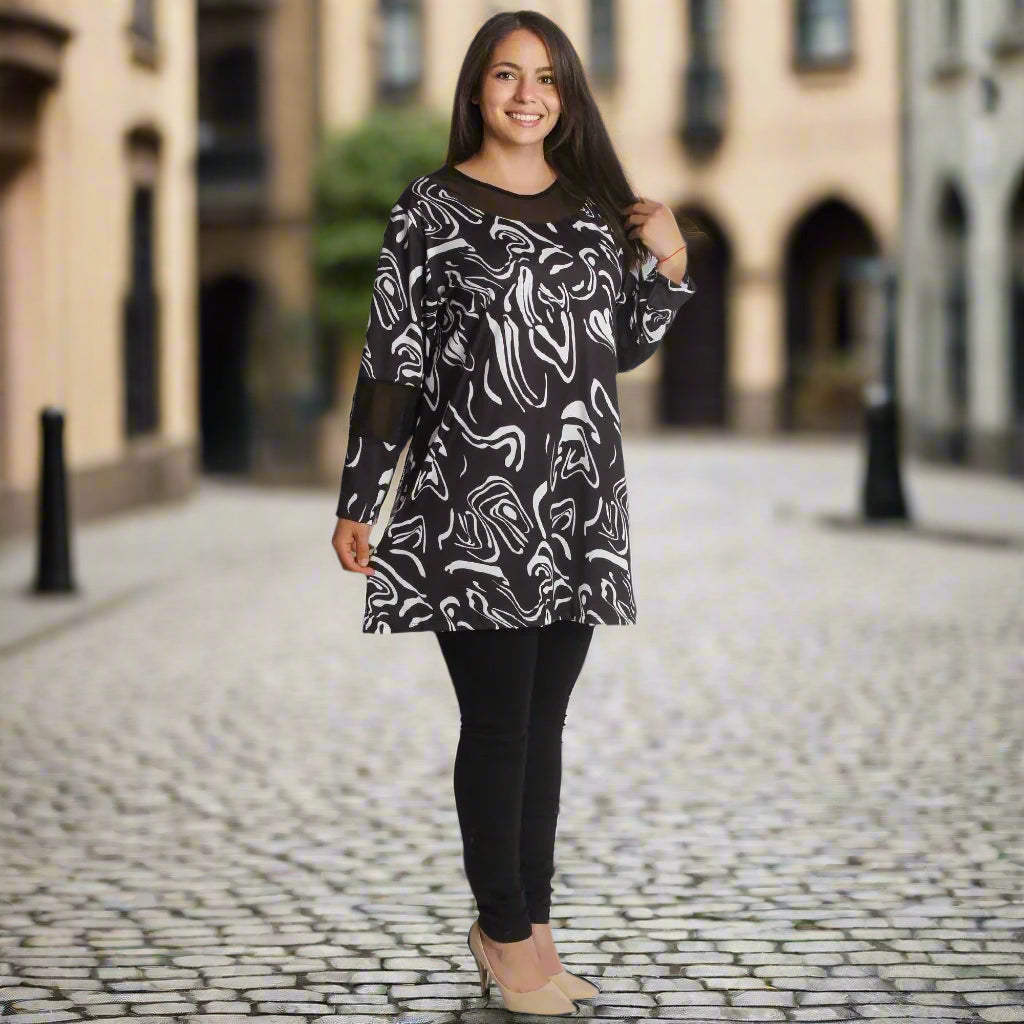 Tunica de damă alb-negru cu tul spectaculos, confecționată din 95% viscoză și 5% elastan. Croiul lejer și materialul delicat, elastic, cu elemente frumoase de tul, fac ca această tunică să fie ideală pentru sezonul toamnă-iarnă. Elegantă și confortabilă, este potrivită atât pentru viața de zi cu zi, cât și pentru ocazii formale.