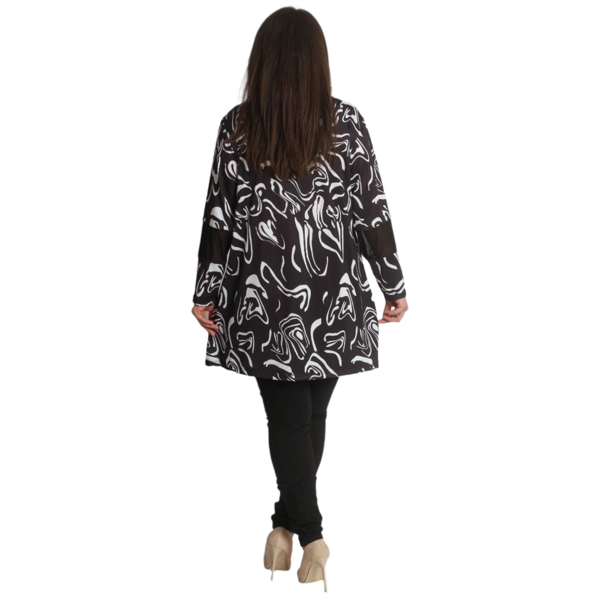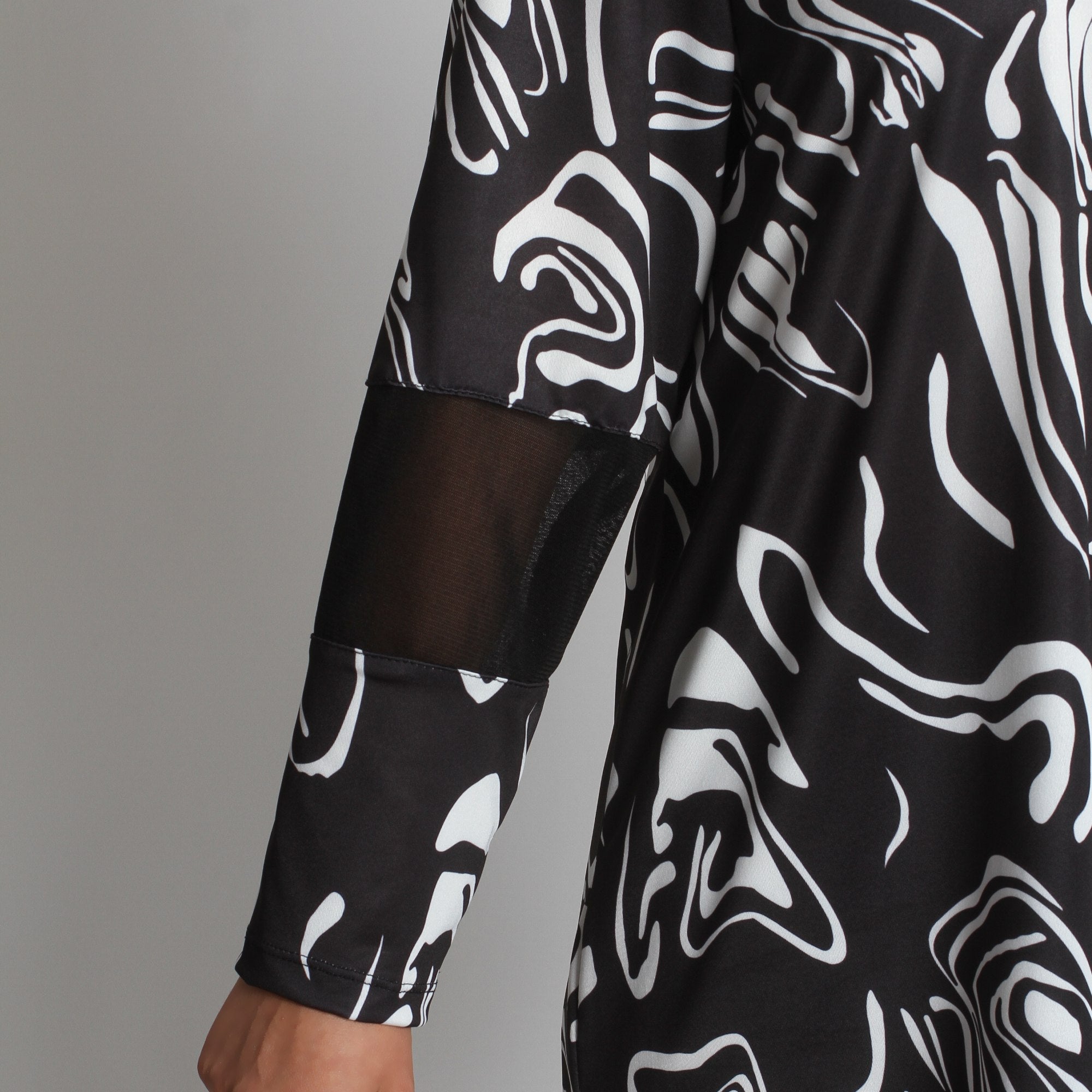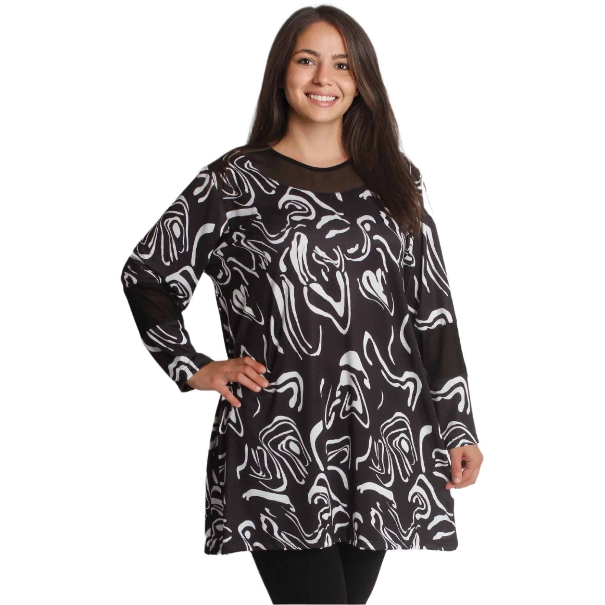 Tunica de damă alb-negru cu tul spectaculos, confecționată din 95% viscoză și 5% elastan. Croiul lejer și materialul delicat, elastic, cu elemente frumoase de tul, fac ca această tunică să fie ideală pentru sezonul toamnă-iarnă. Elegantă și confortabilă, este potrivită atât pentru viața de zi cu zi, cât și pentru ocazii formale.