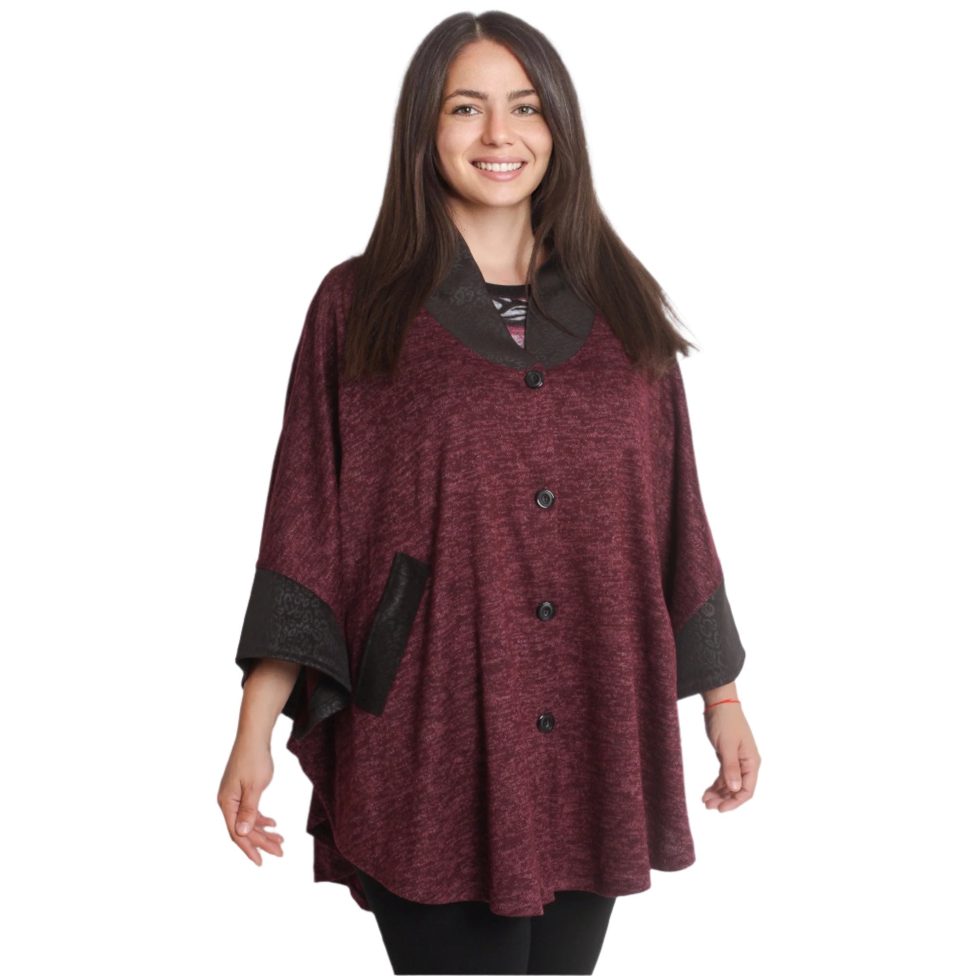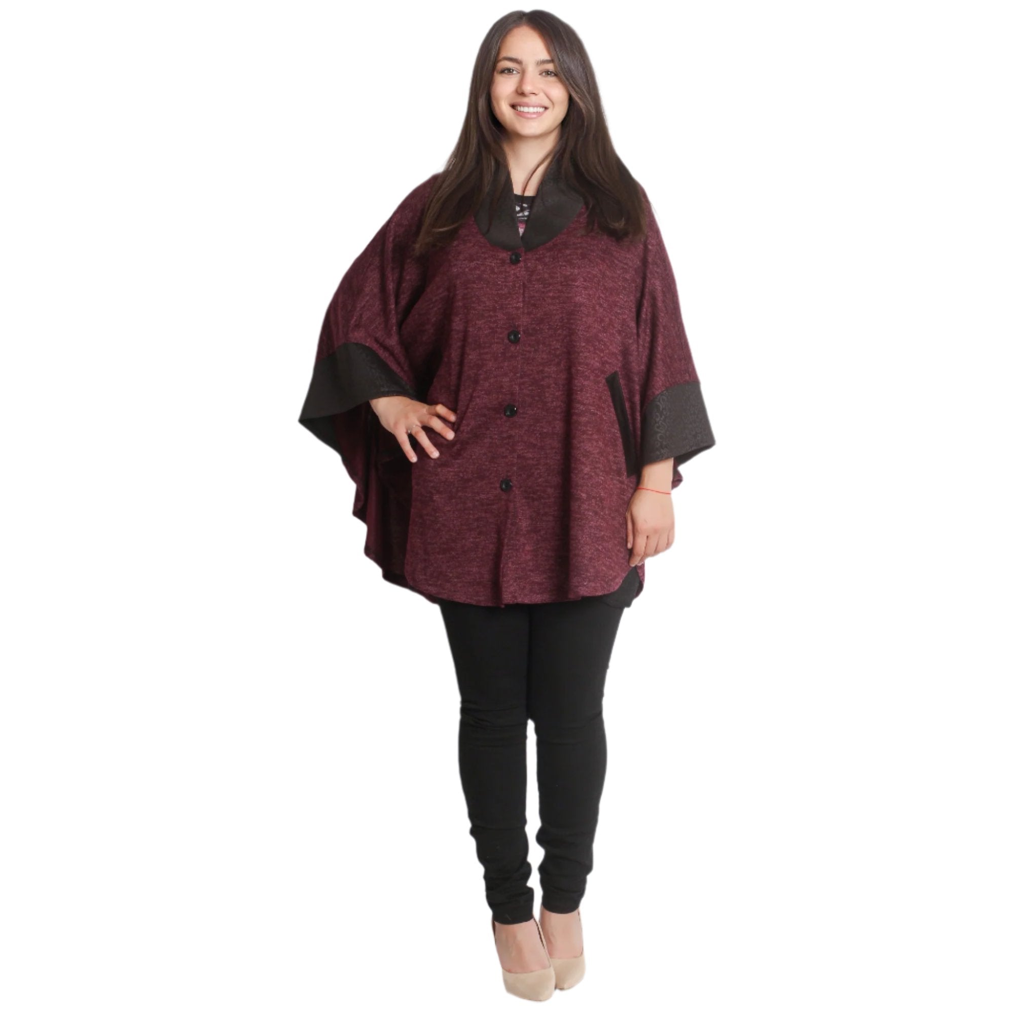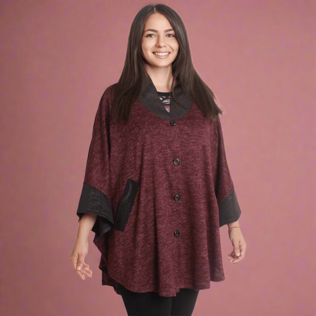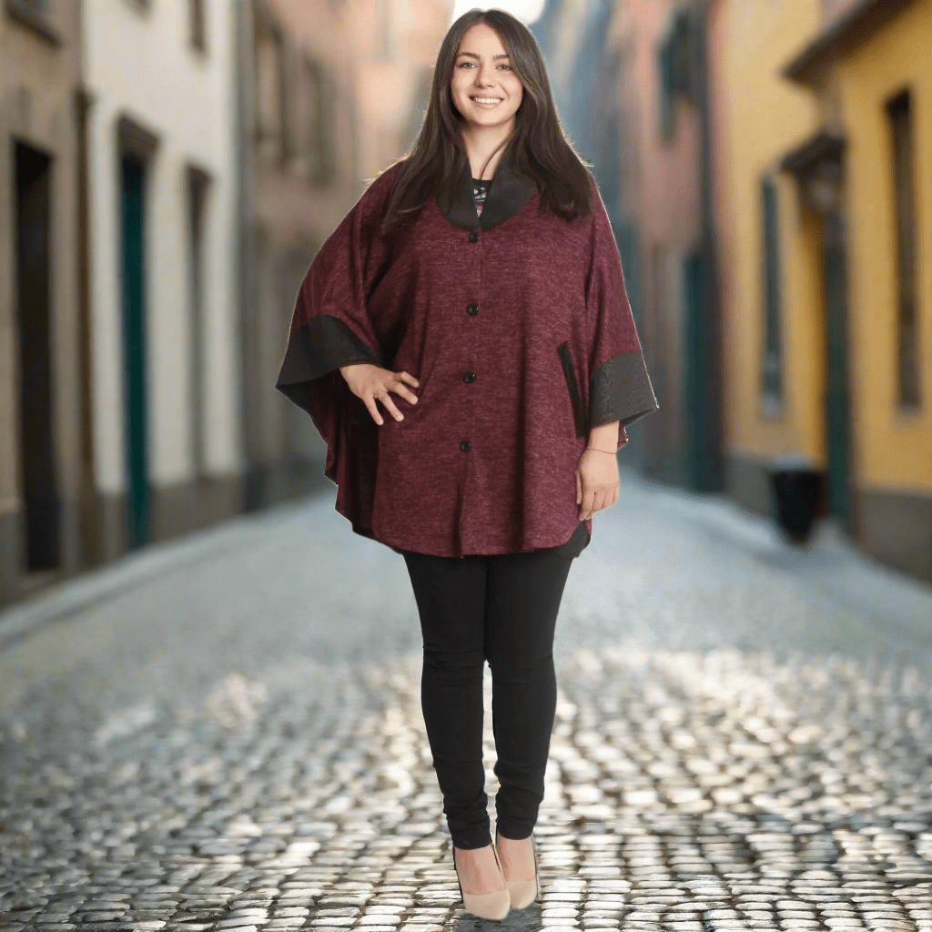 Poncho maxi bordo cu nasturi și buzunare. Fabricat din 95% viscoză și 5% elastan. Model practic, lejer, potrivit pentru sezonul toamnă-iarnă. Alegerea ideală atât pentru ocazii formale, cât și pentru viața de zi cu zi!