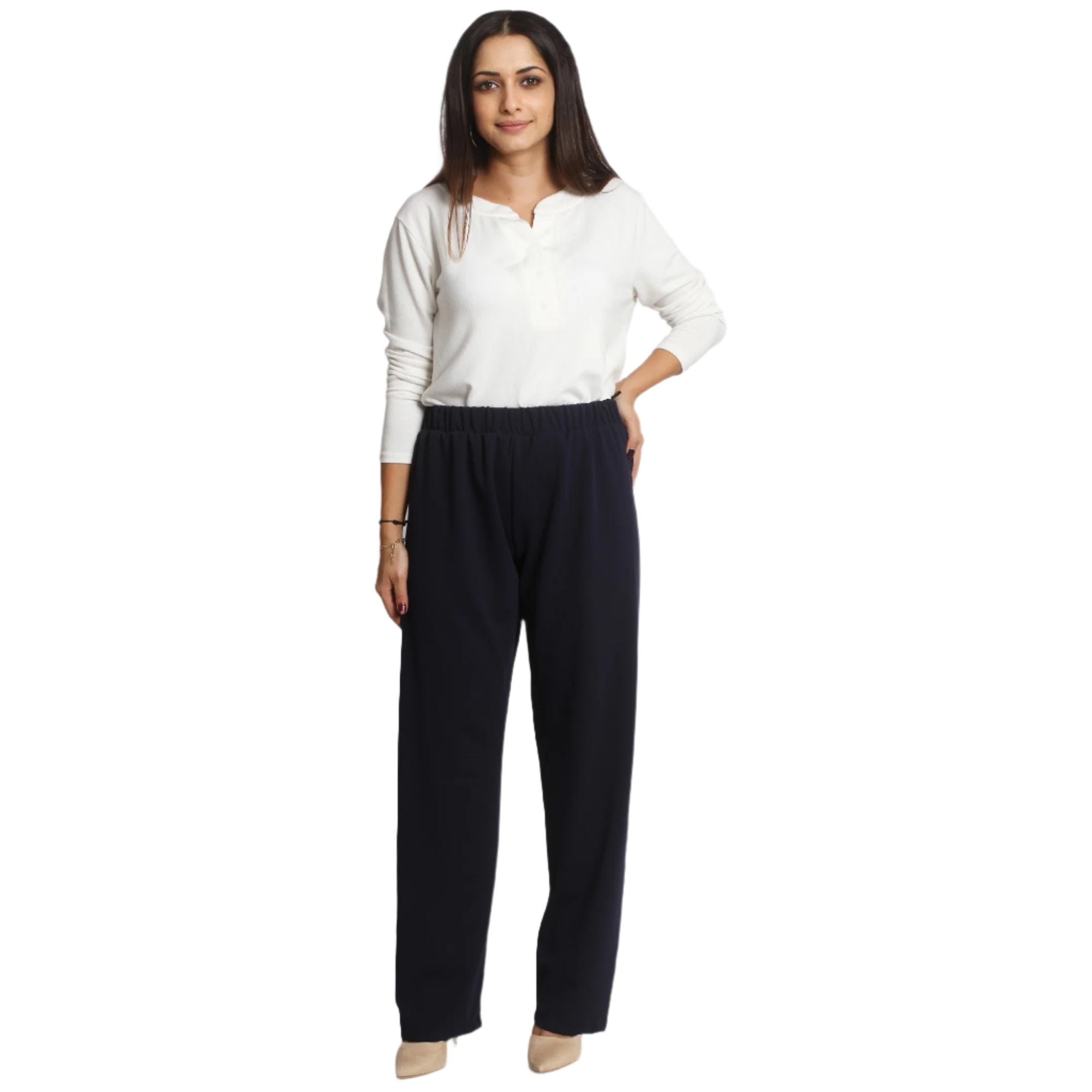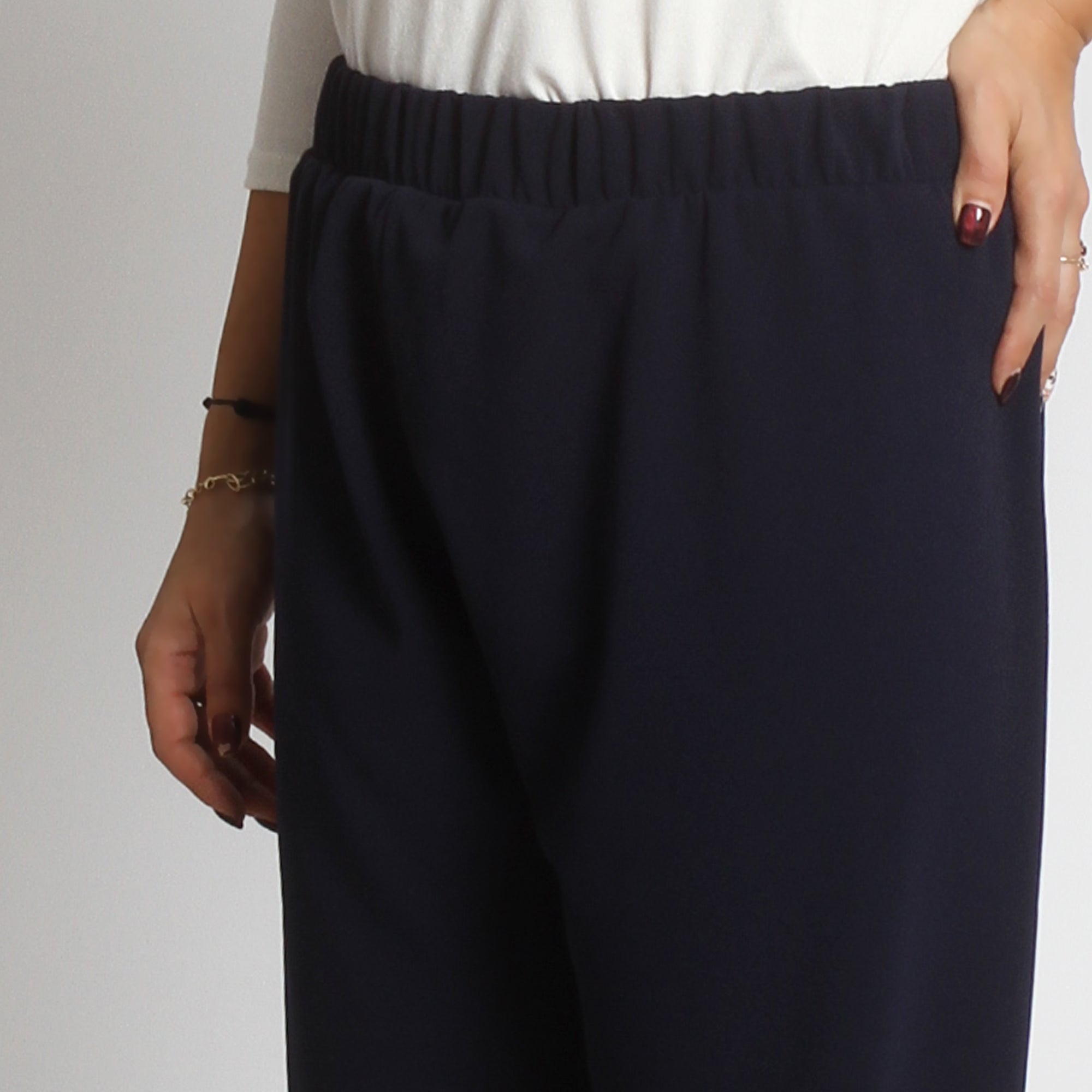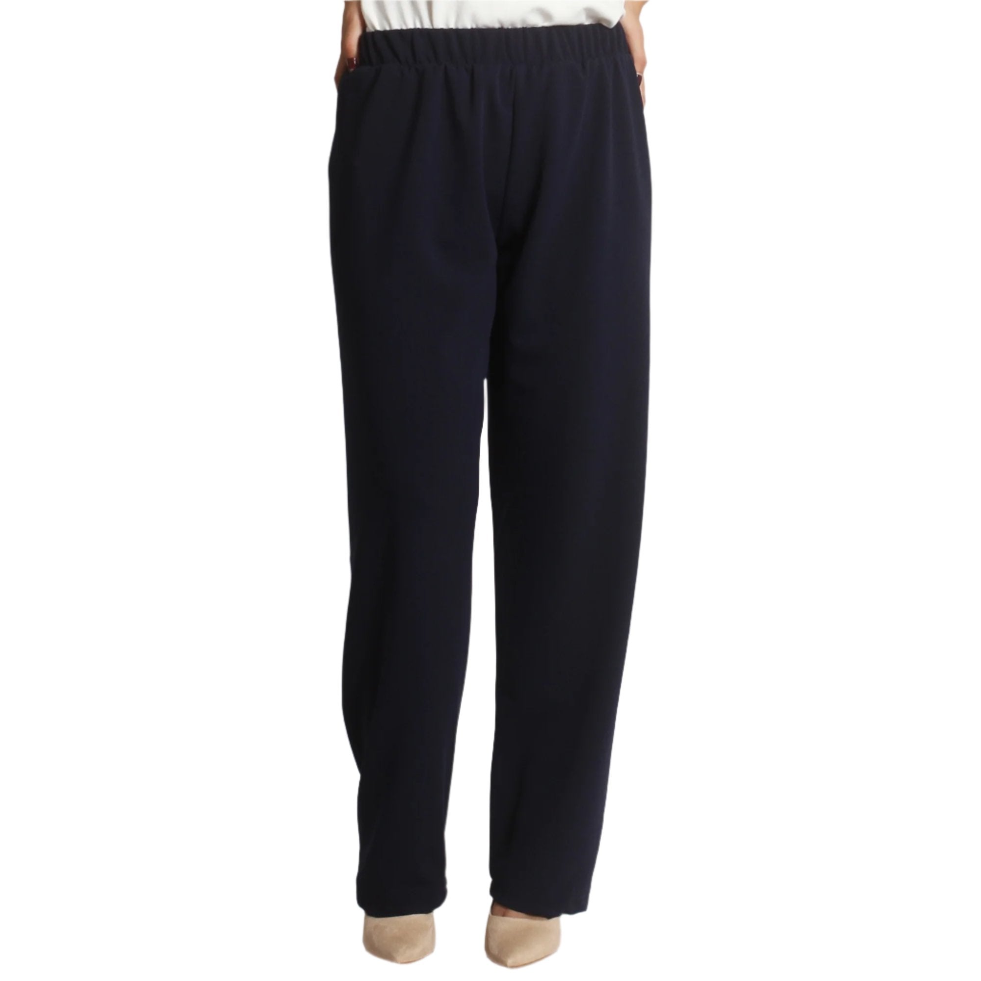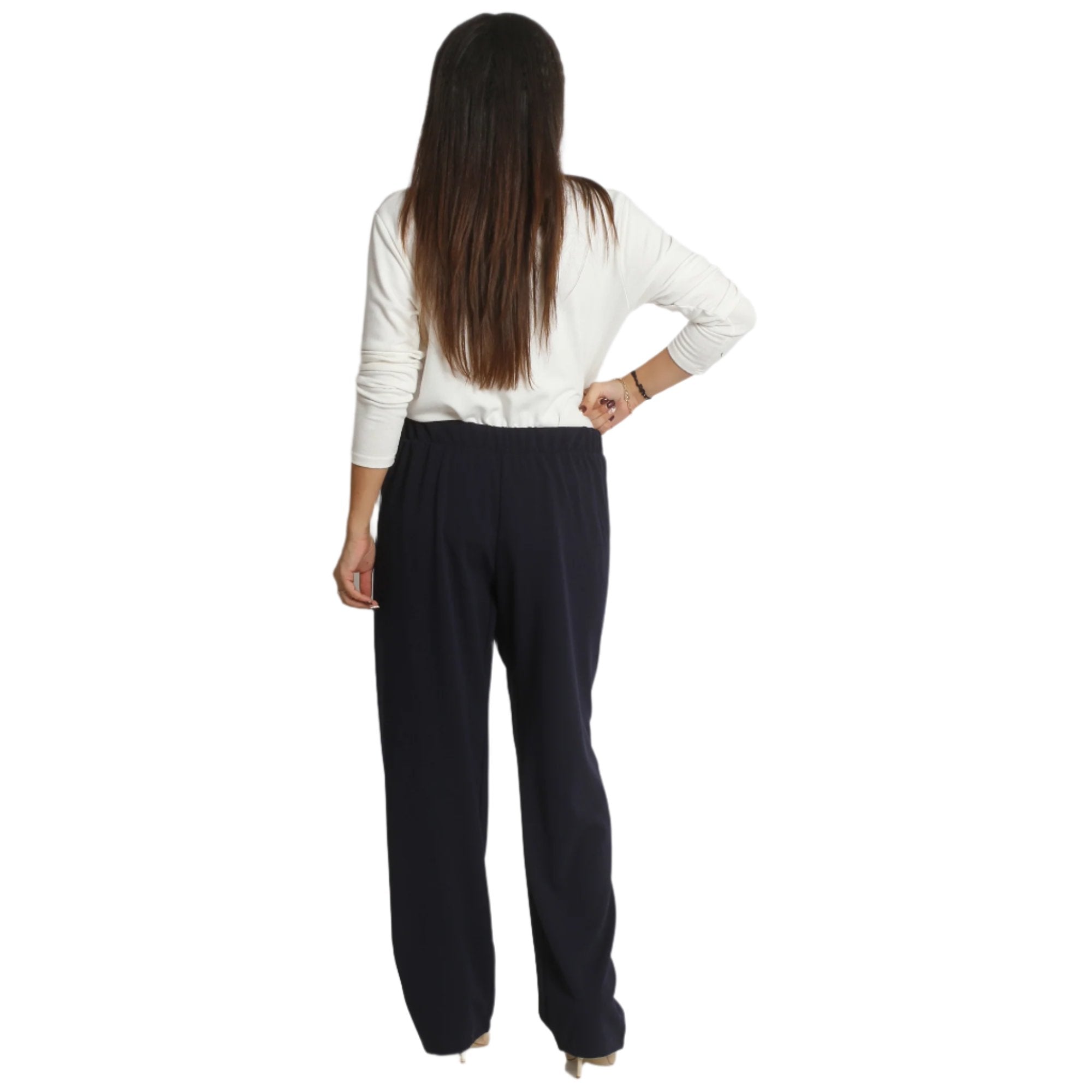 Pantaloni de damă de culoare albastru închis, confecționați din 95% viscoză, 5% elastan. Croială dreaptă cu elastic în talie, material elastic și plăcut, oferind confort și stil. Ideali pentru a fi purtați în sezonul toamnă-iarnă.