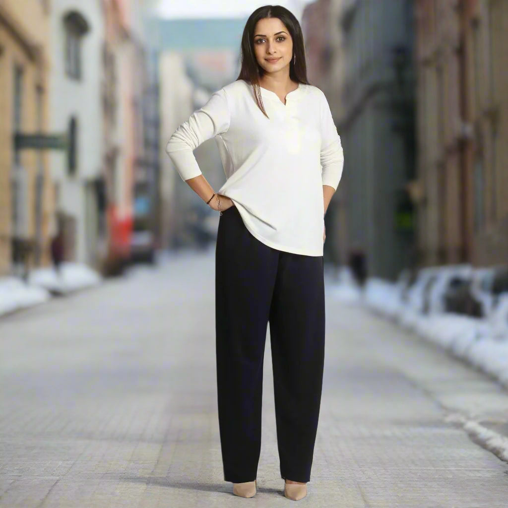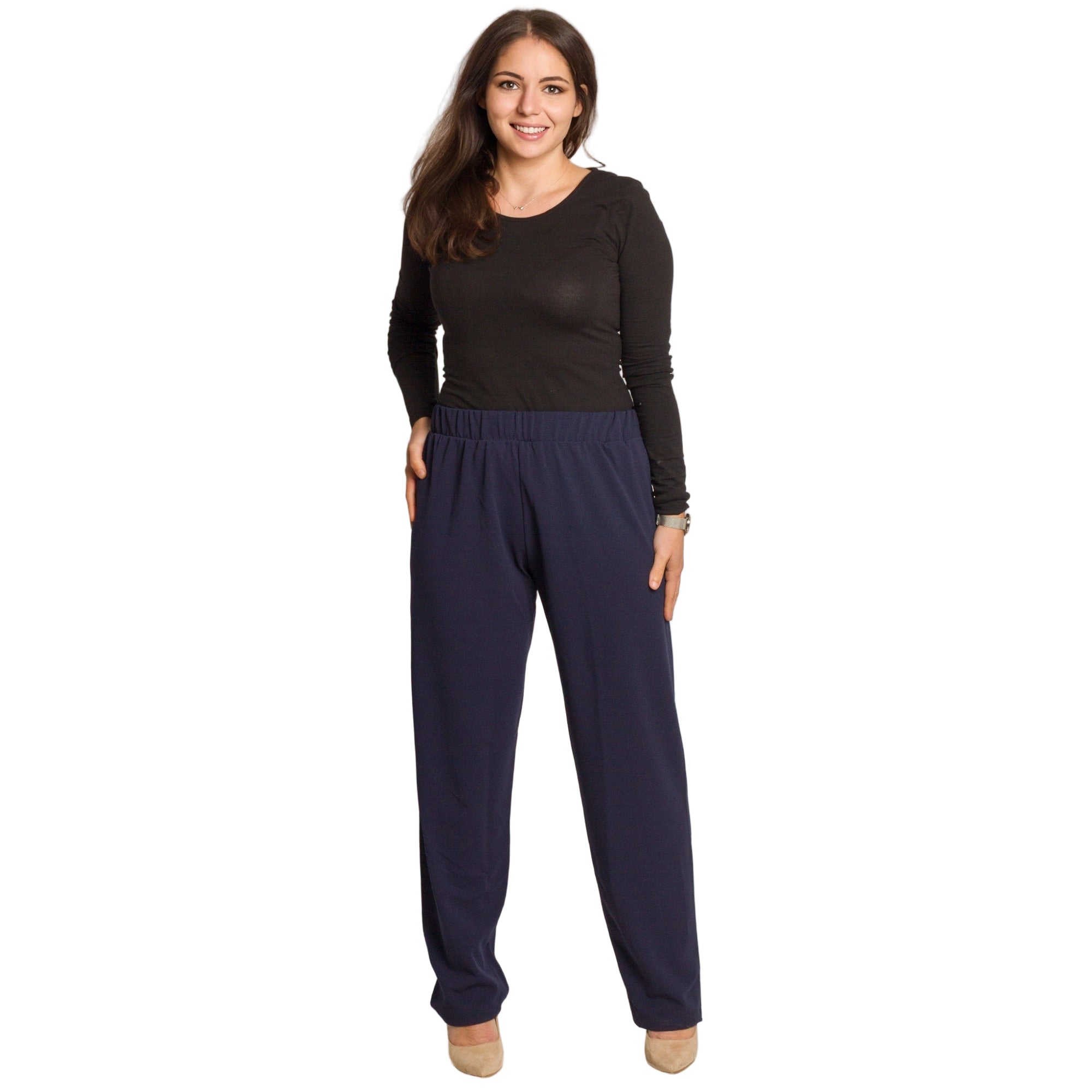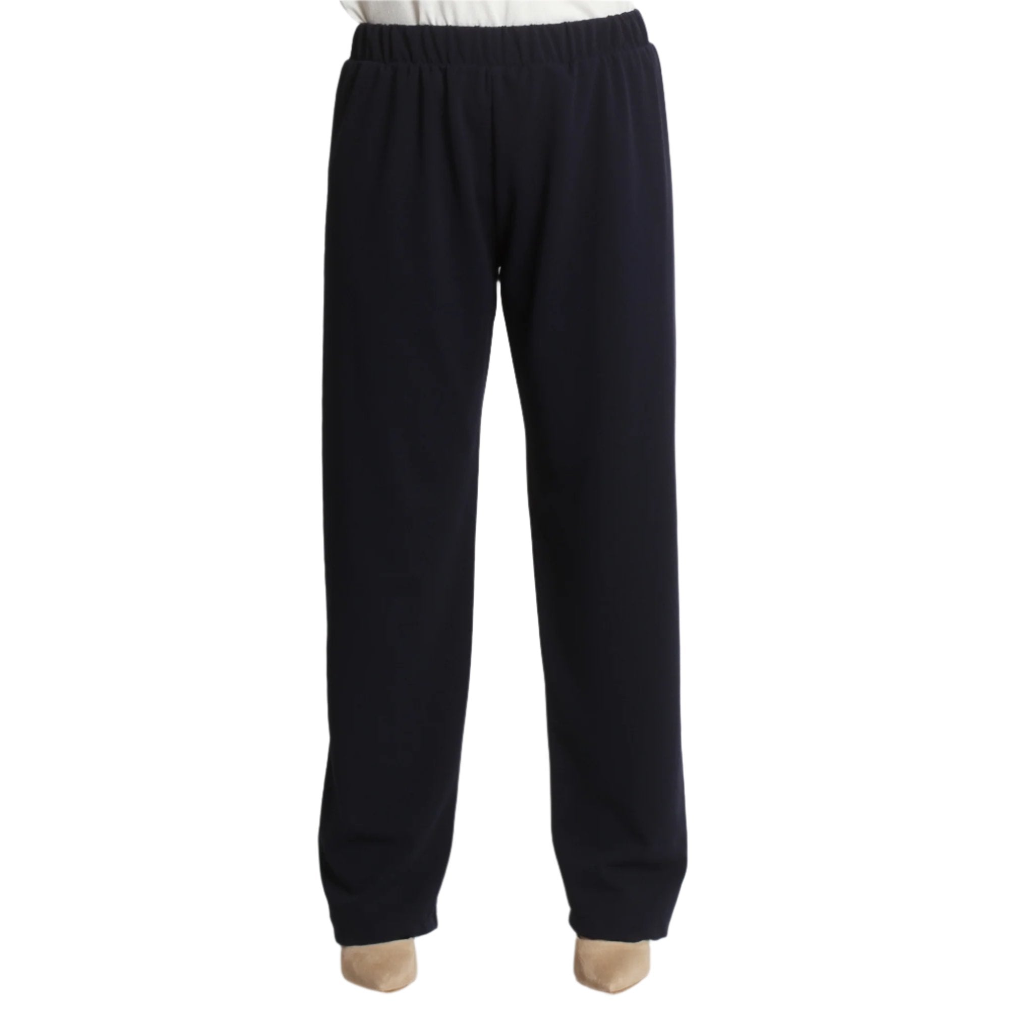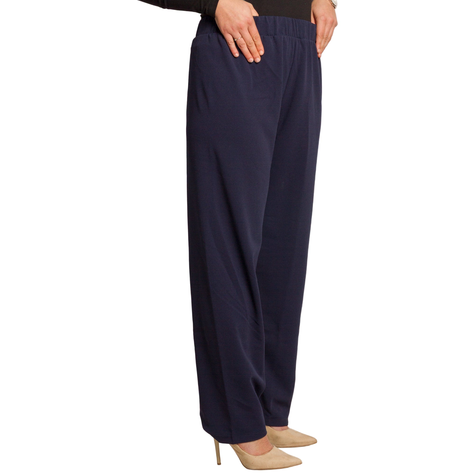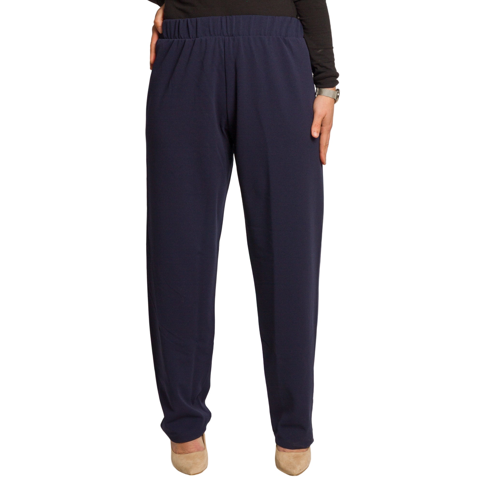 Pantaloni de damă de culoare albastru închis, confecționați din 95% viscoză, 5% elastan. Croială dreaptă cu elastic în talie, material elastic și plăcut, oferind confort și stil. Ideali pentru a fi purtați în sezonul toamnă-iarnă.