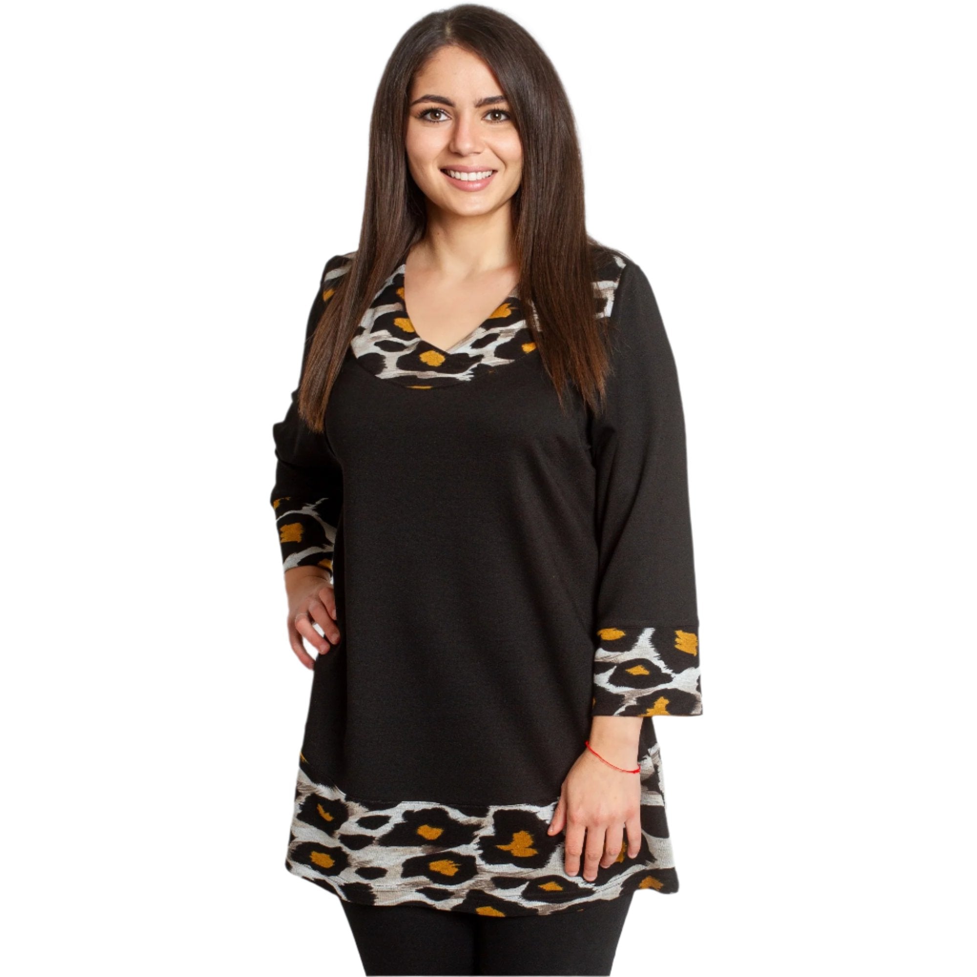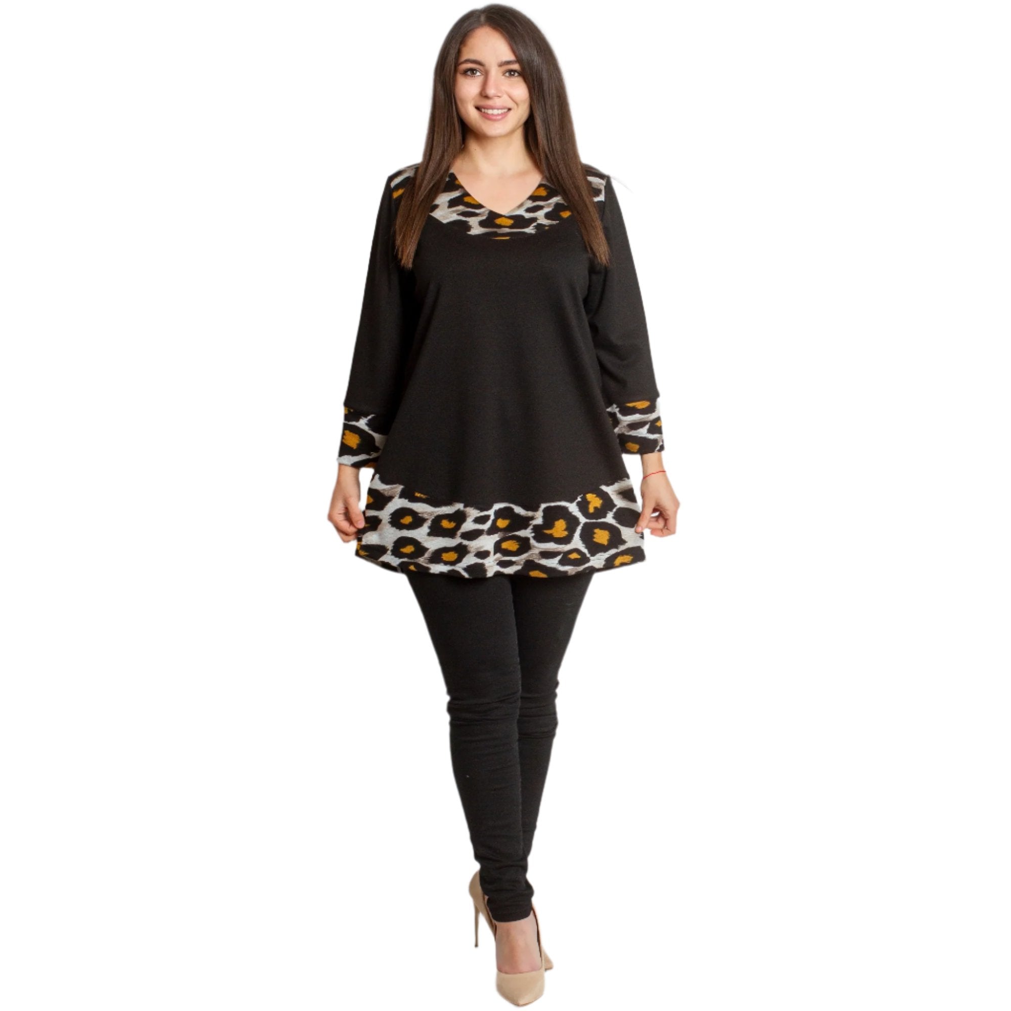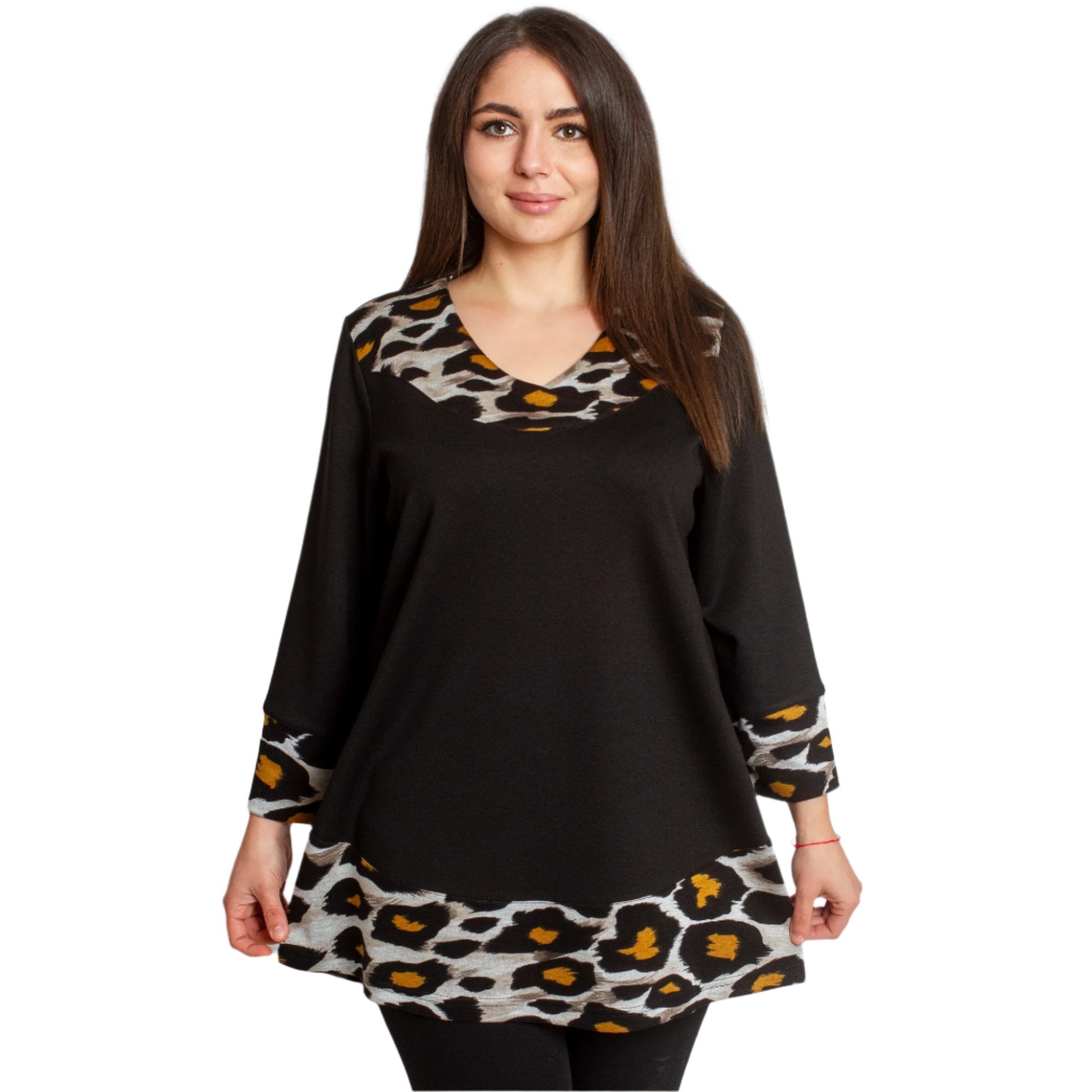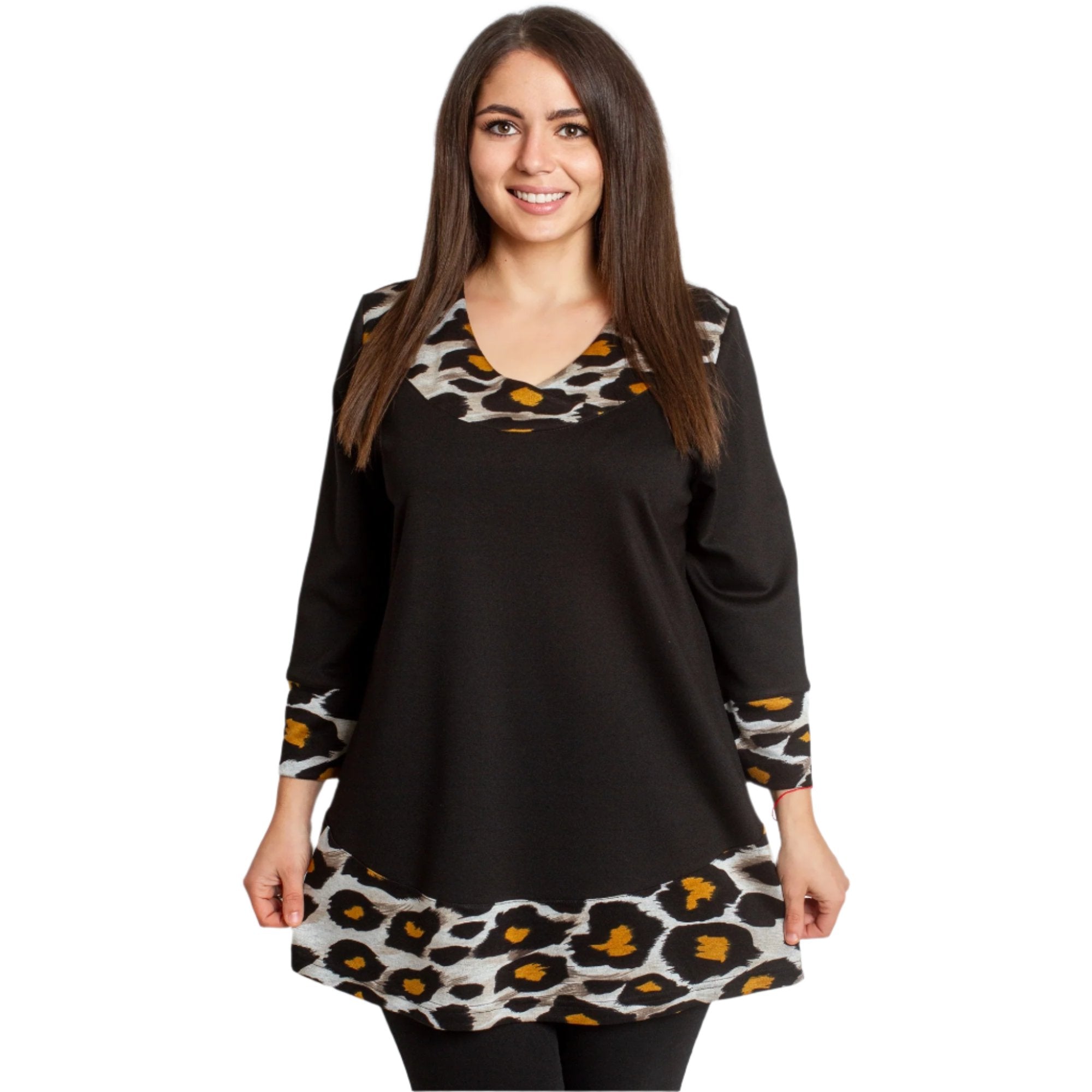 Tunică neagră elegantă, cu o croială lejeră, decorată cu un imprimeu animal și un decolteu în V stilat. Fabricată din 92% poliester și 8% elastan, oferă confort și stil, ideală pentru sezonul toamnă-iarnă.