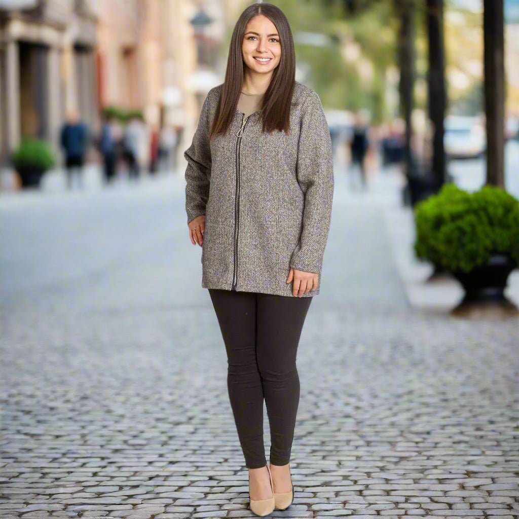 Jachetă maxi formală, cu o croială dreaptă elegantă și buzunare funcționale. Fabricată din 92% poliester și 8% elastan, cu fermoar practic pentru închidere. O alegere ideală pentru ocazii speciale în sezonul toamnă-iarnă.