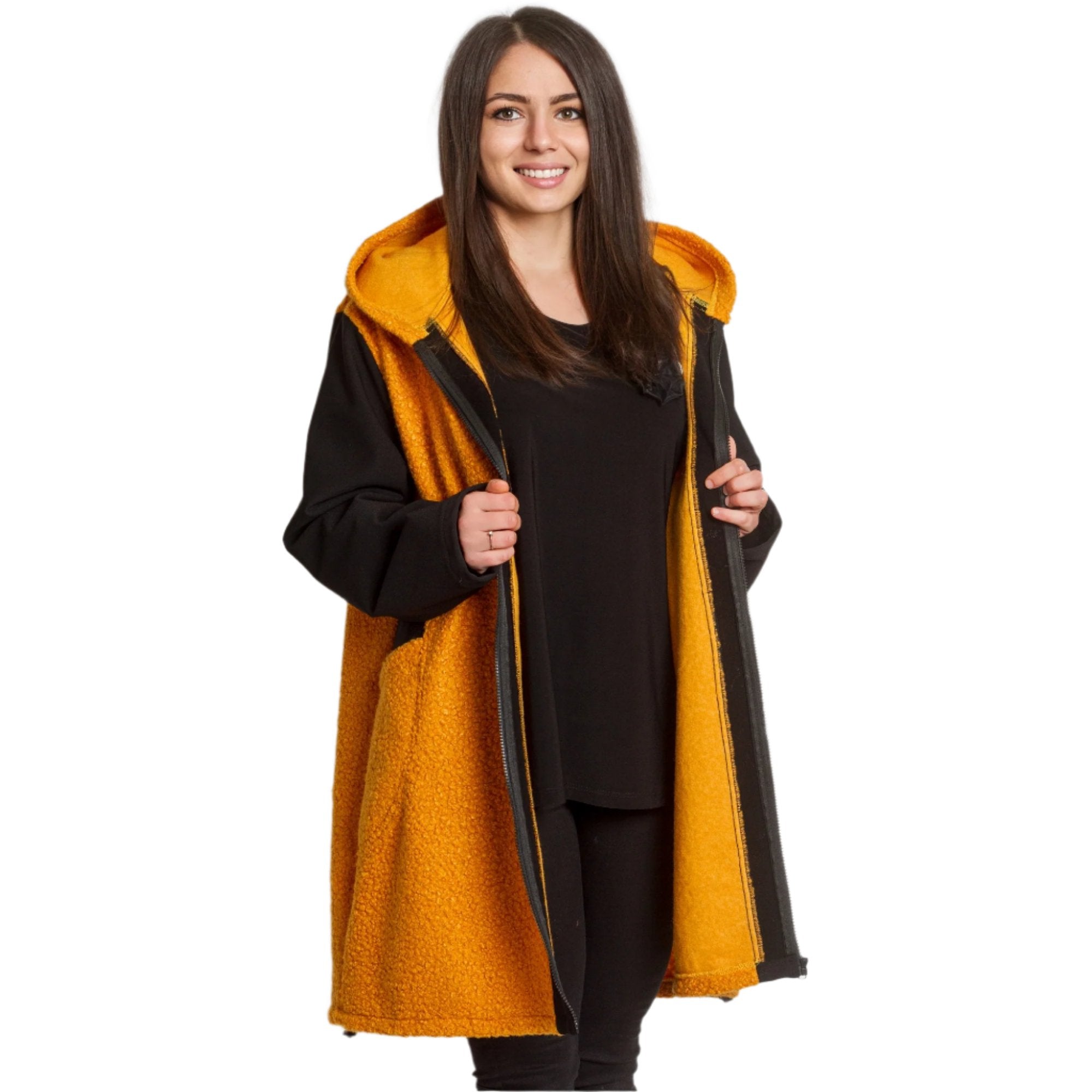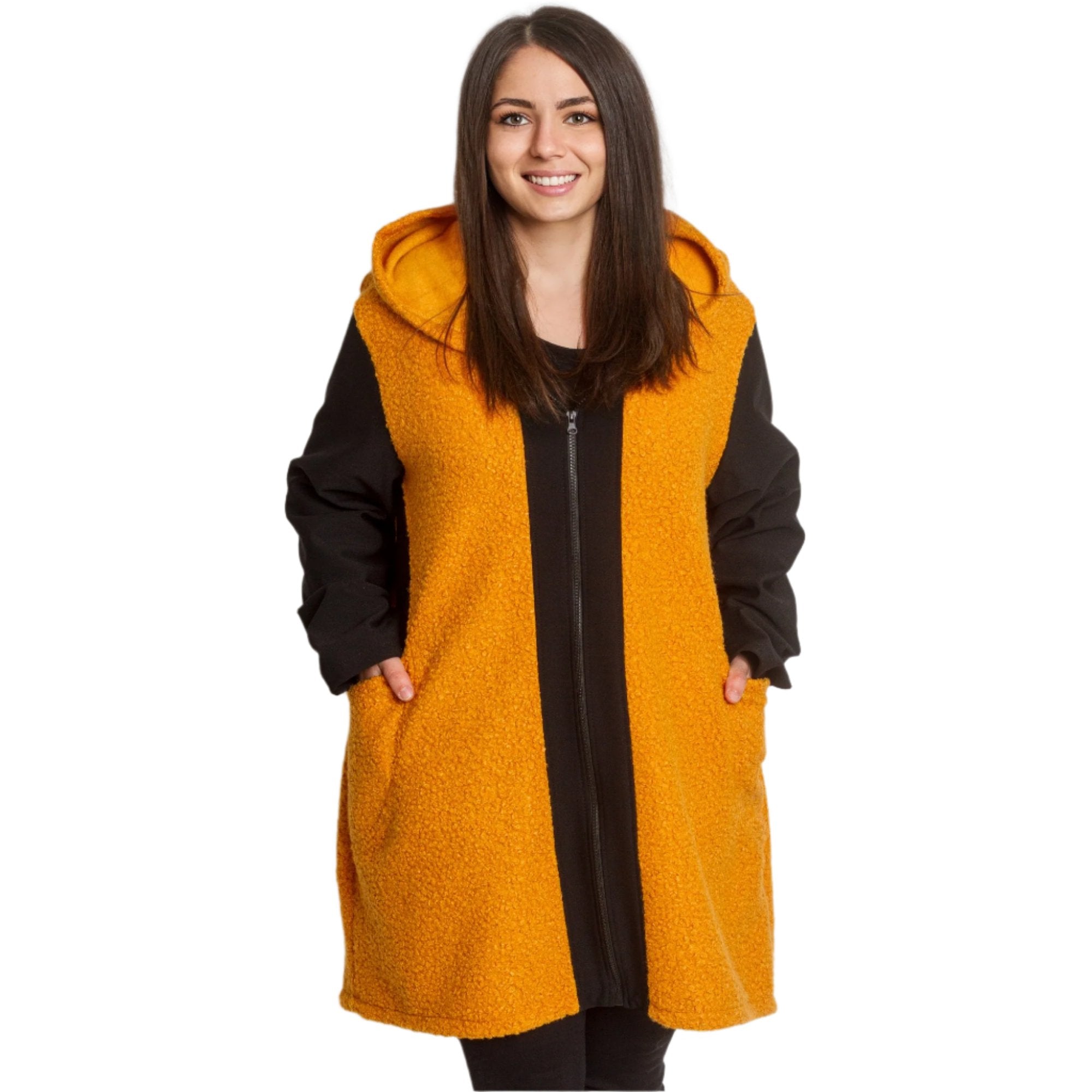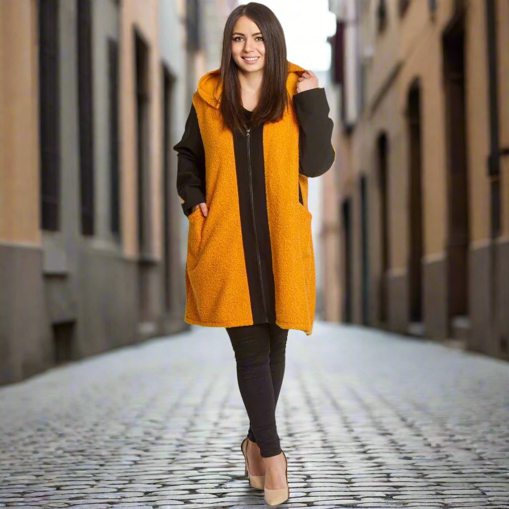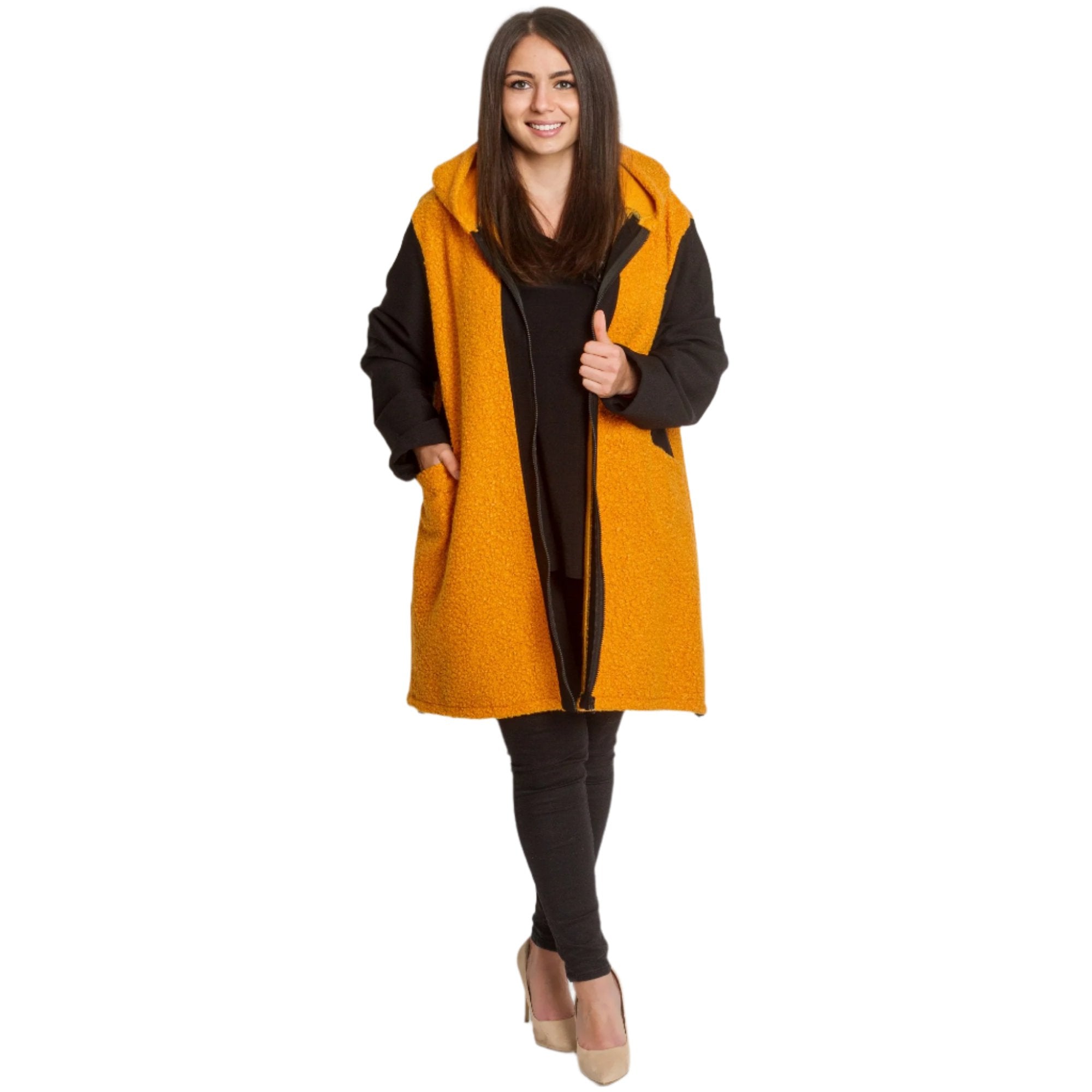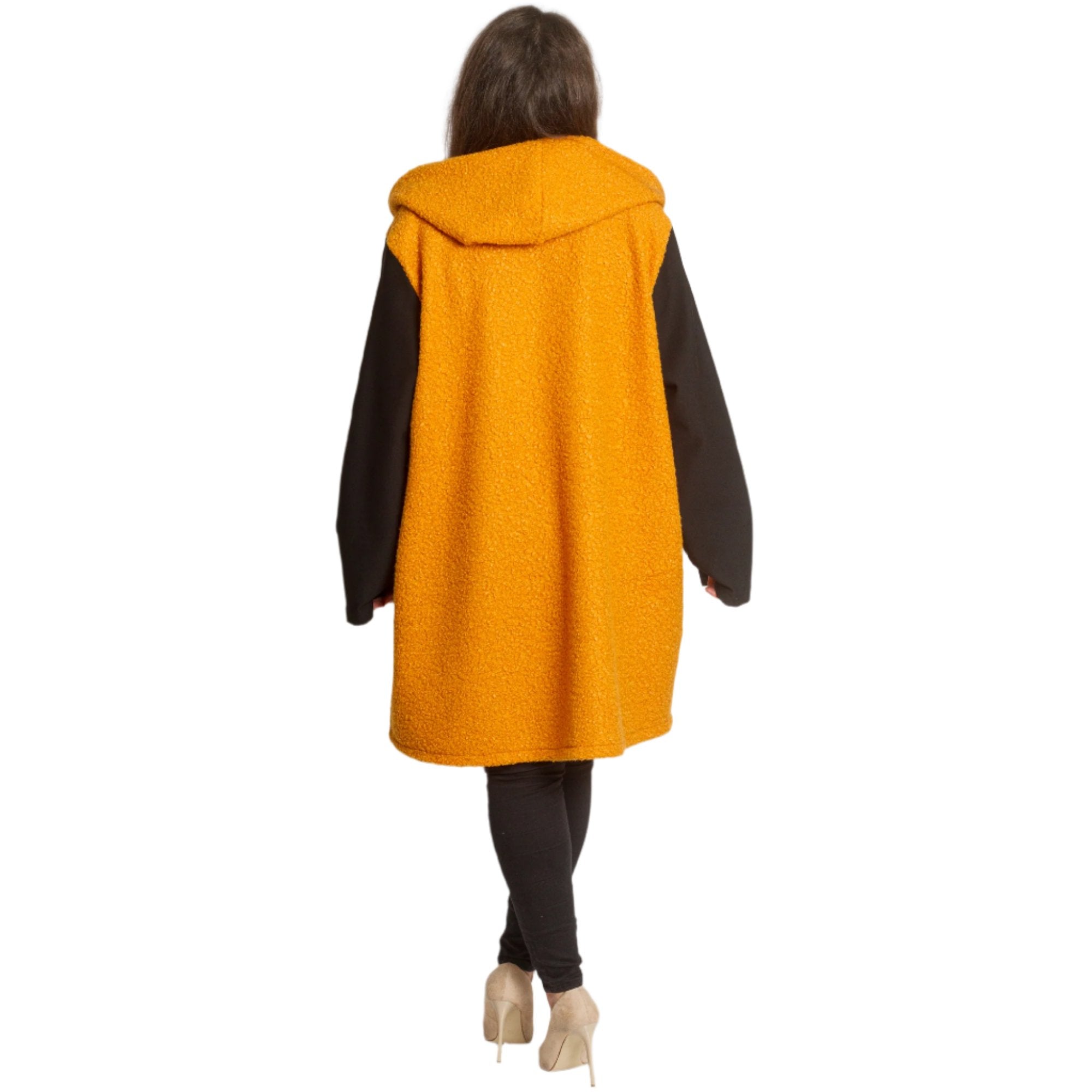Palton bicolor cu glugă, îmbinând stilul și căldura. Model cu croială decupată și fermoar pentru o închidere convenabilă, confecționat din 50% lână și 50% acril. Alegerea ideală pentru zilele reci de iarnă.