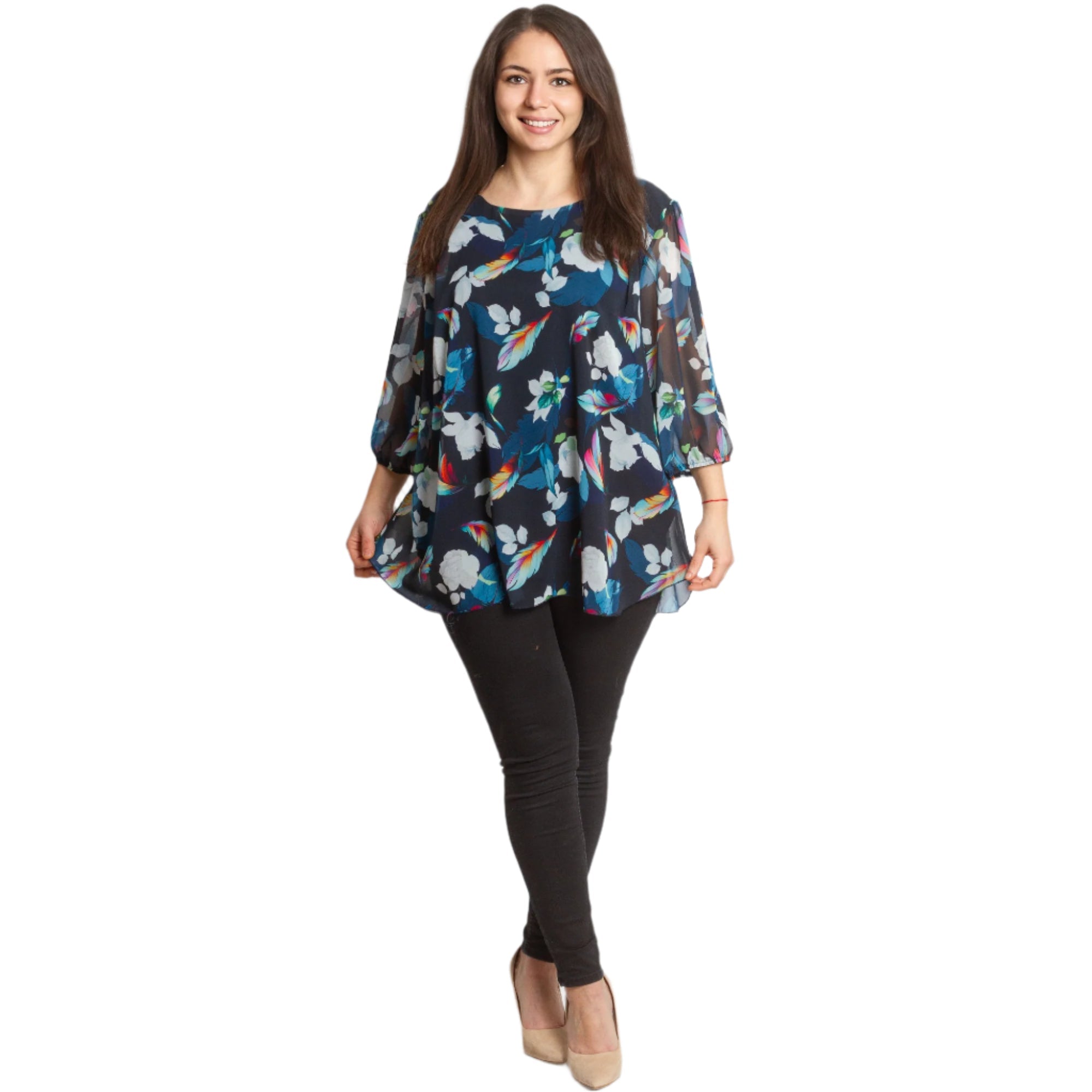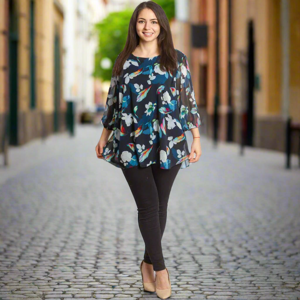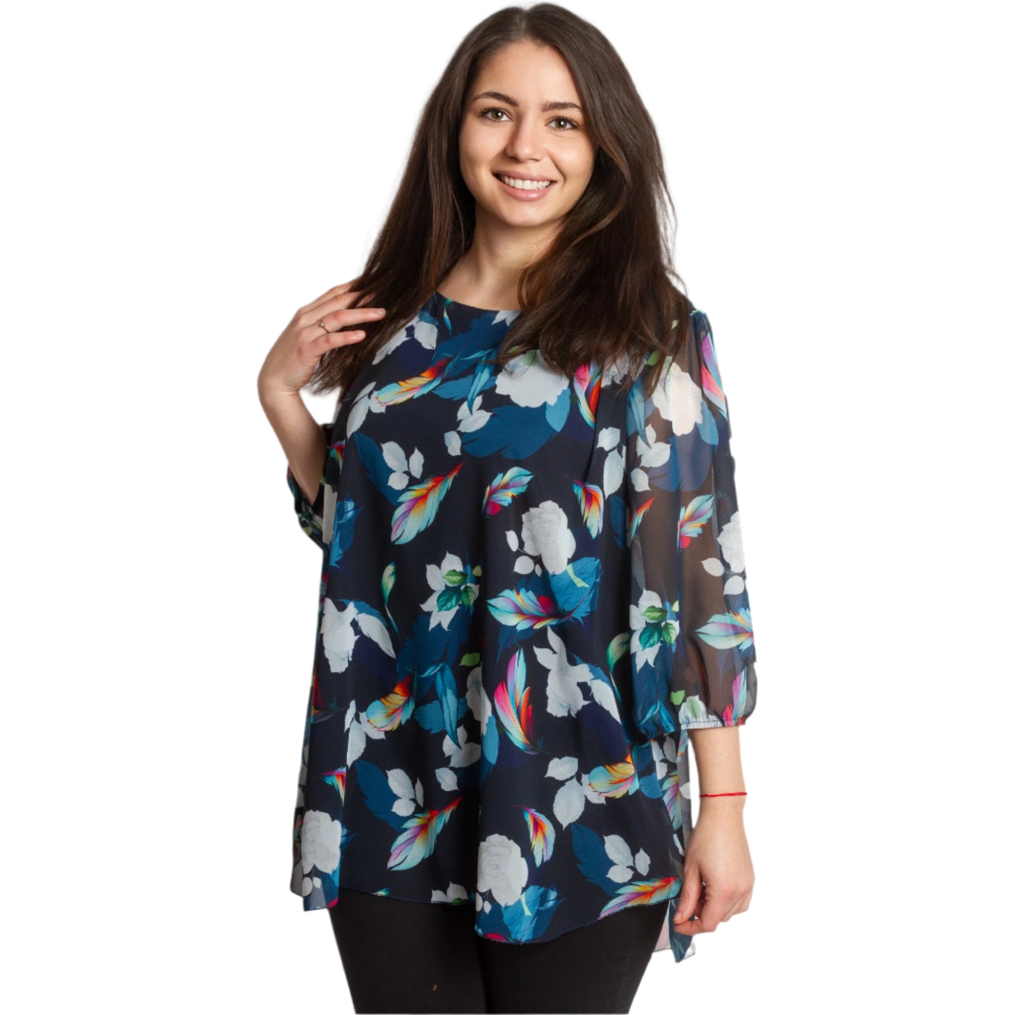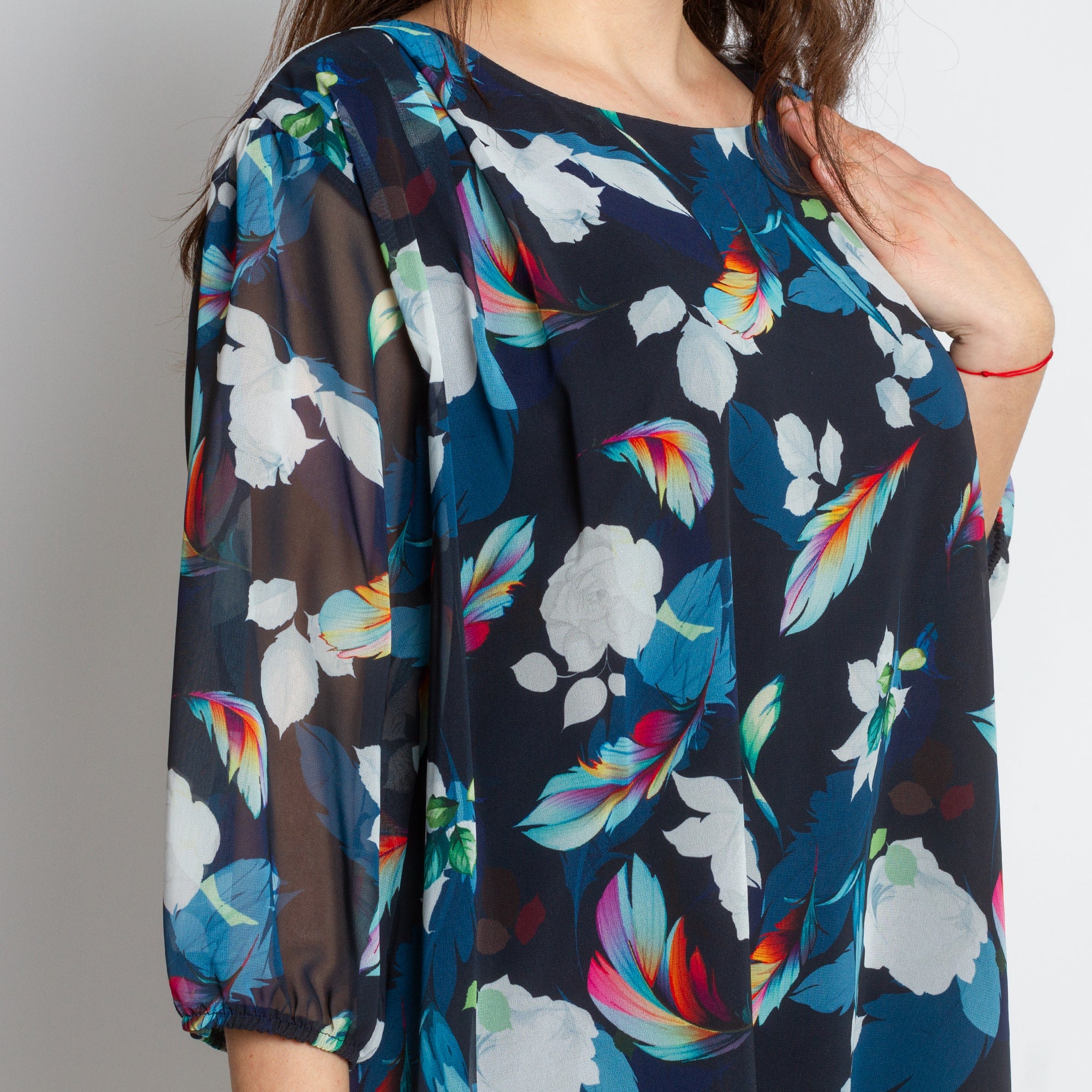 Tunica elegantă pentru femei, cu imprimeu floral elegant. Confecționată din 100% poliester, cu o croială evazată, mâneci 3/4 și decolteu rotund. Tunica este prevăzută cu un frumos șifon floral și căptușeală elastică care oferă confort și stil. O alegere ideală pentru sezonul toamnă-iarnă.