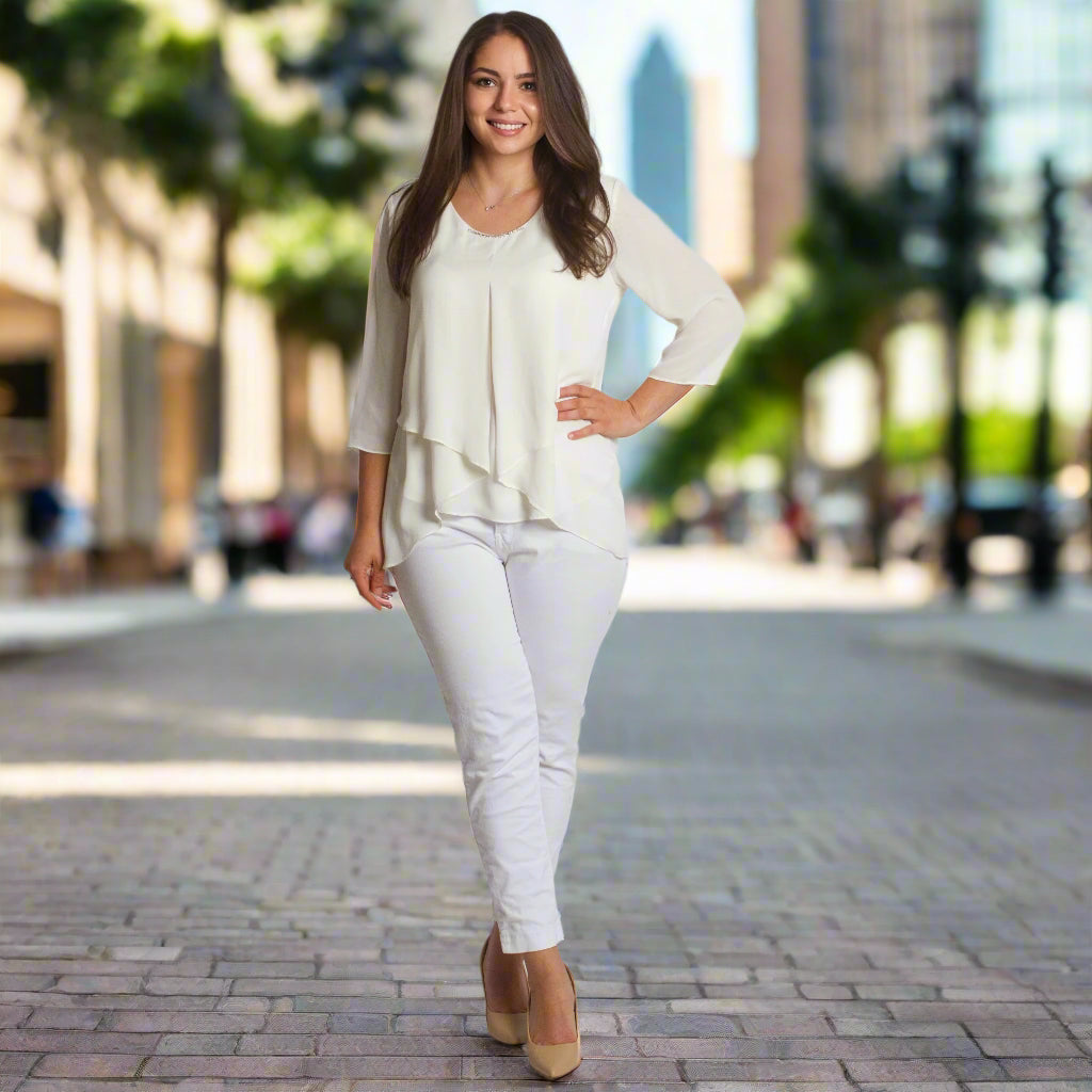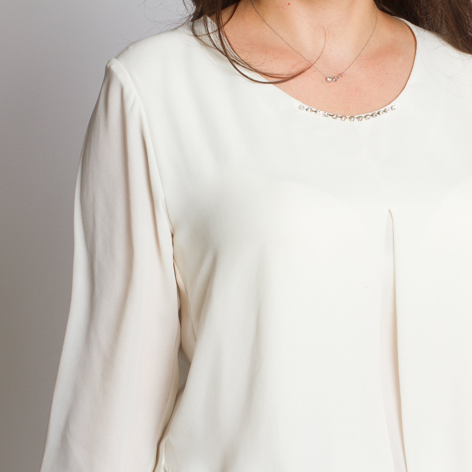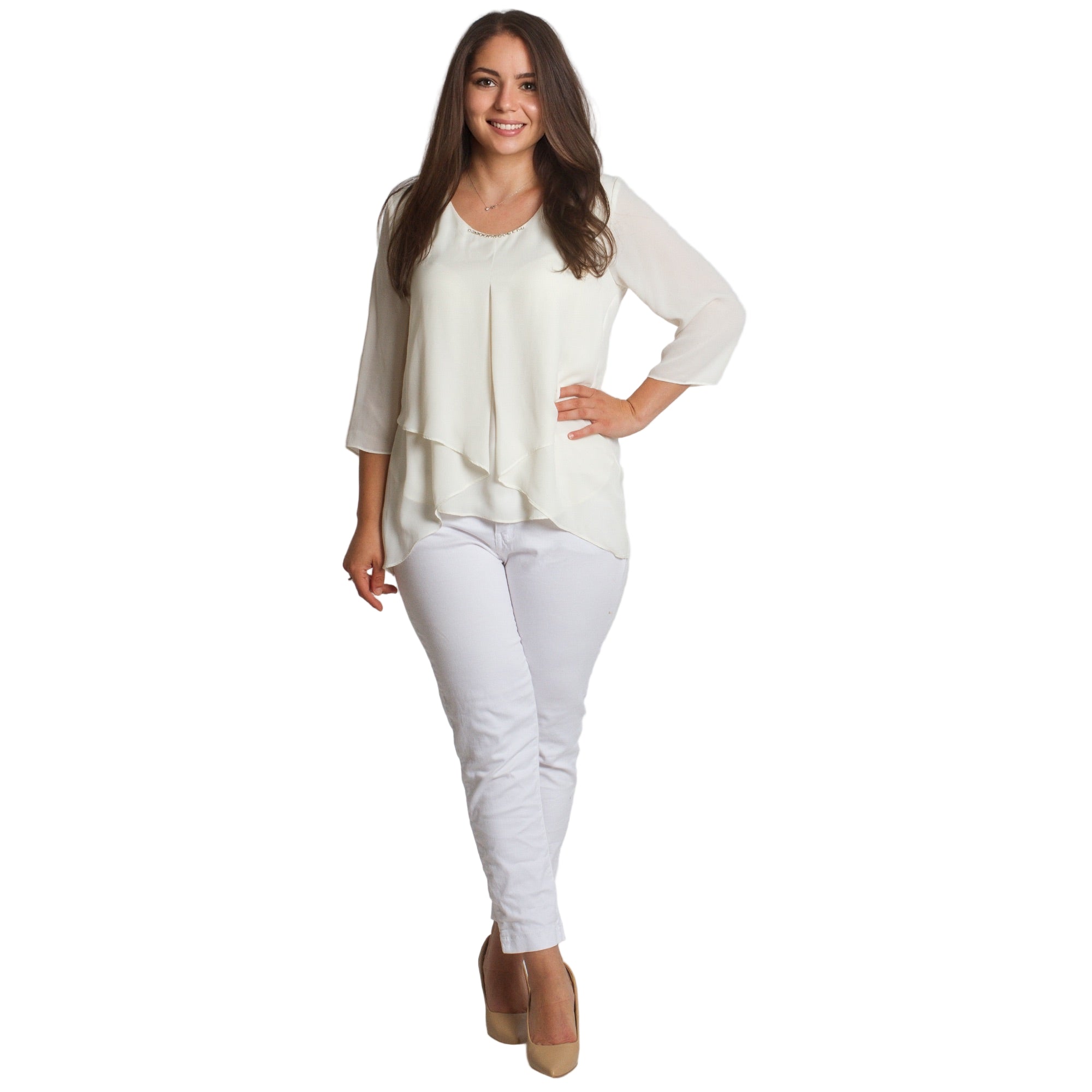 Bluză albă elegantă, cu mâneci 3/4 și broșă, în mărimi mari, confecționată din materiale de înaltă calitate - 50% viscoză și 50% poliester. Această bluză stilată are un decolteu rotund și o croială lejeră, oferind confort și un aspect sofisticat. Alegerea ideală pentru ocaziile formale din sezonul toamnă-iarnă. Culoarea albă și detaliile fine fac modelul potrivit pentru orice siluetă și garderobă.