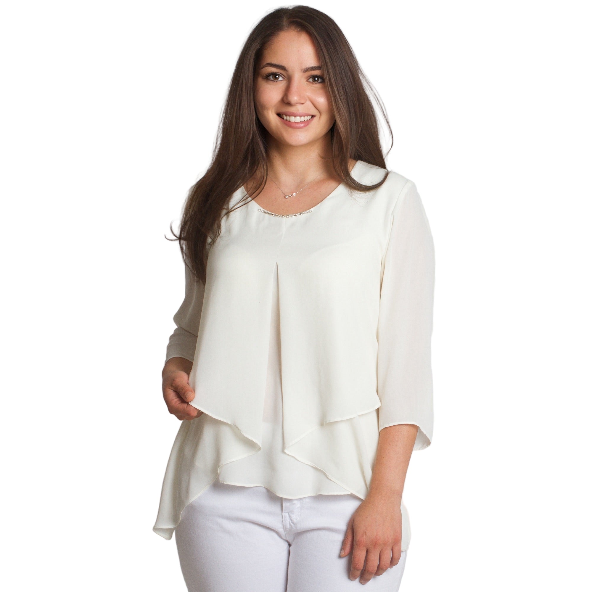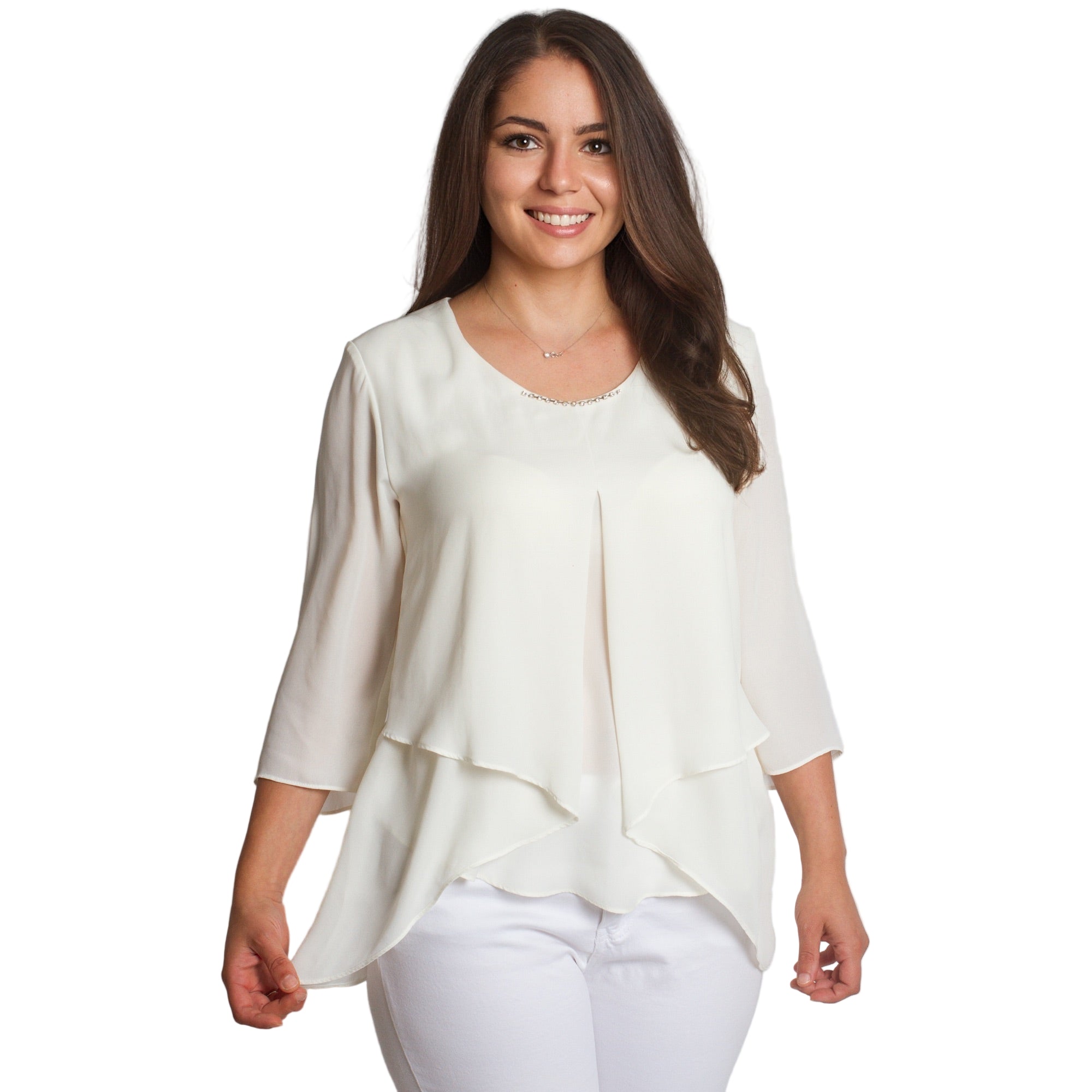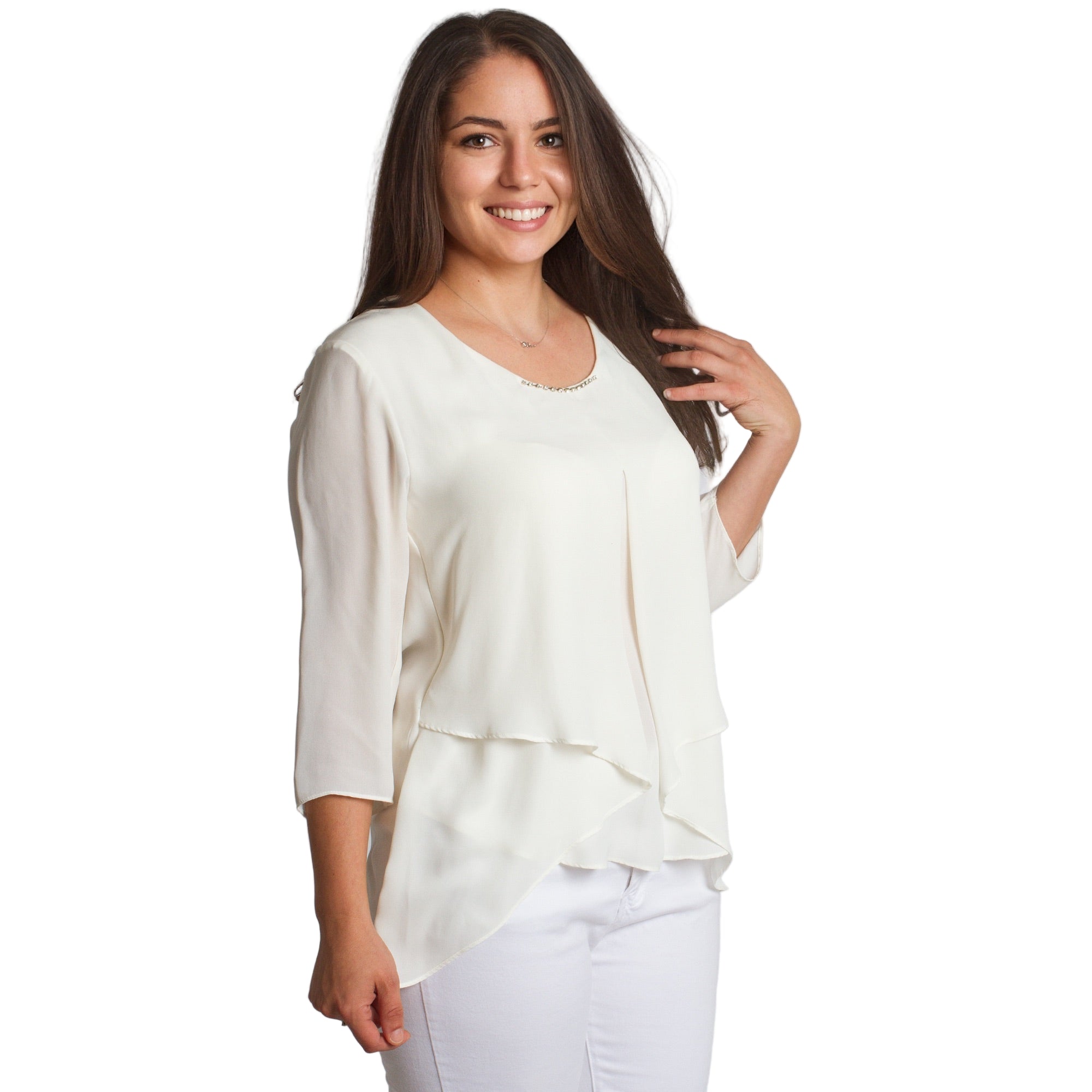 Bluză albă elegantă, cu mâneci 3/4 și broșă, în mărimi mari, confecționată din materiale de înaltă calitate - 50% viscoză și 50% poliester. Această bluză stilată are un decolteu rotund și o croială lejeră, oferind confort și un aspect sofisticat. Alegerea ideală pentru ocaziile formale din sezonul toamnă-iarnă. Culoarea albă și detaliile fine fac modelul potrivit pentru orice siluetă și garderobă.