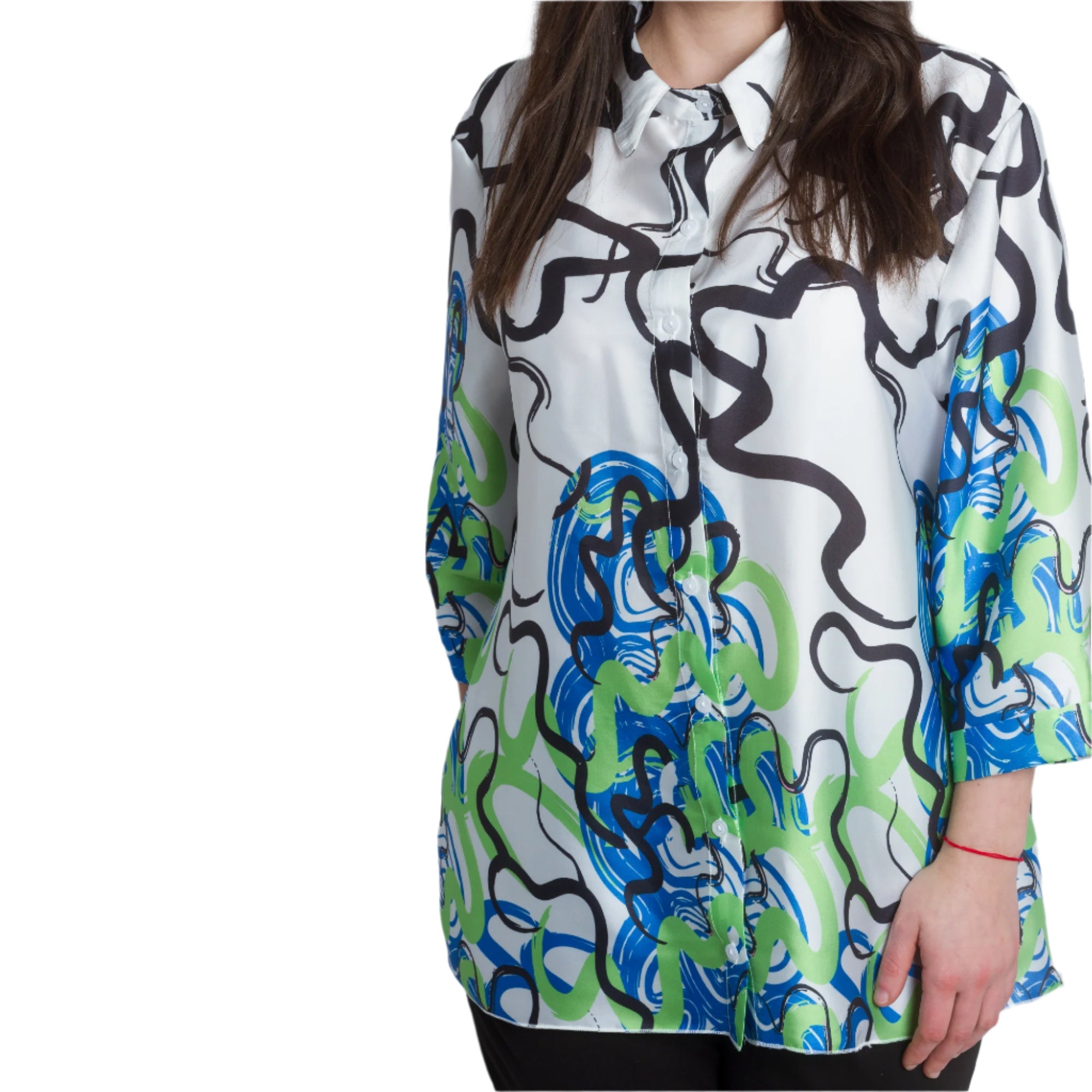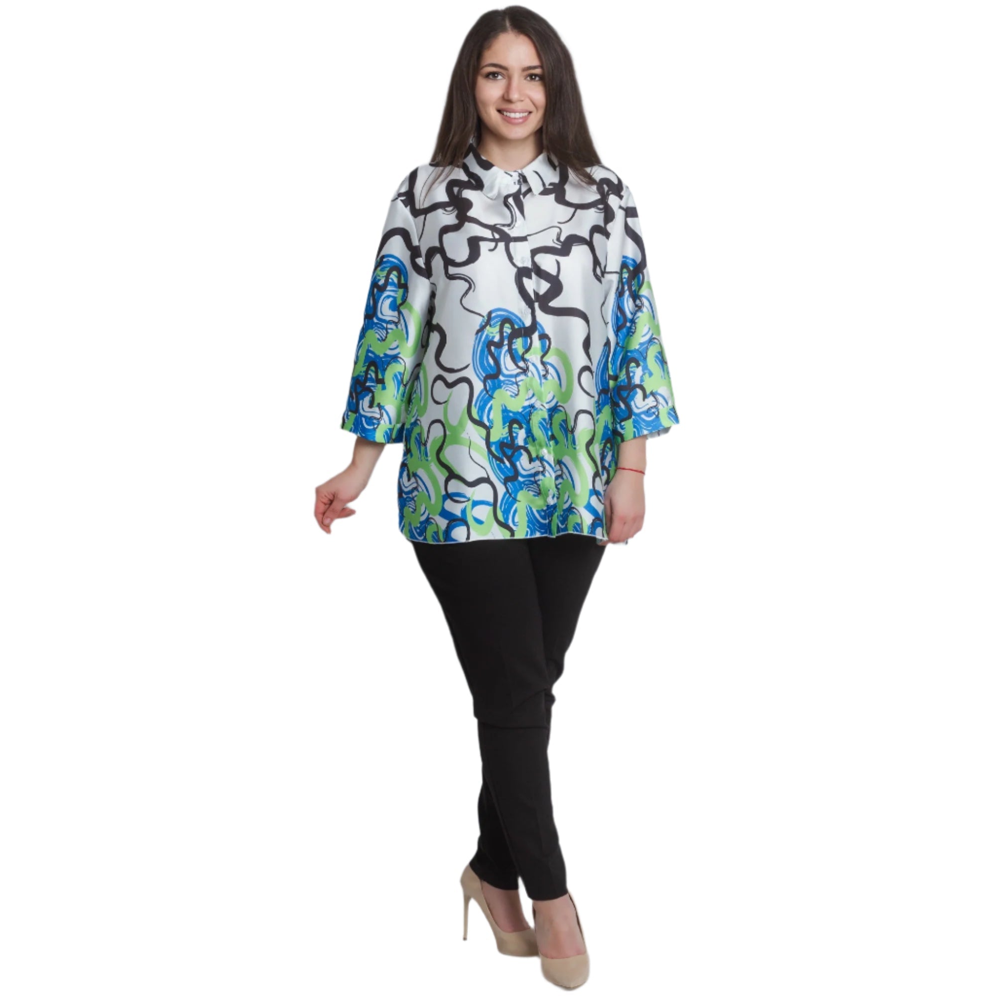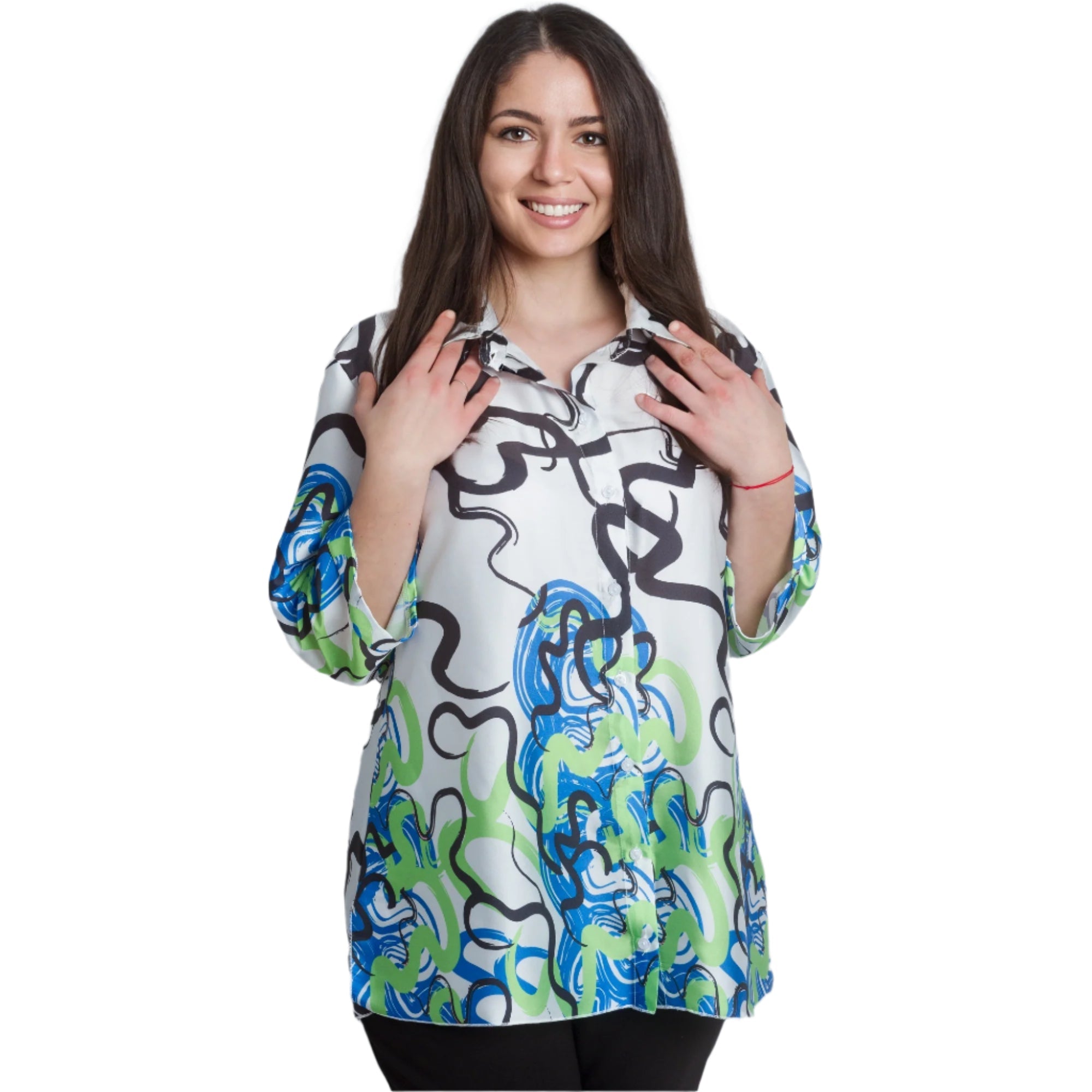 Cămașă maxi lejeră, cu mâneci și guler 3/4. Fabricată din 95% viscoză și 5% elastan, această cămașă este extrem de confortabilă și potrivită pentru purtarea zilnică. Imprimeul abstract colorat în verde și albastru adaugă prospețime și stil ținutei.