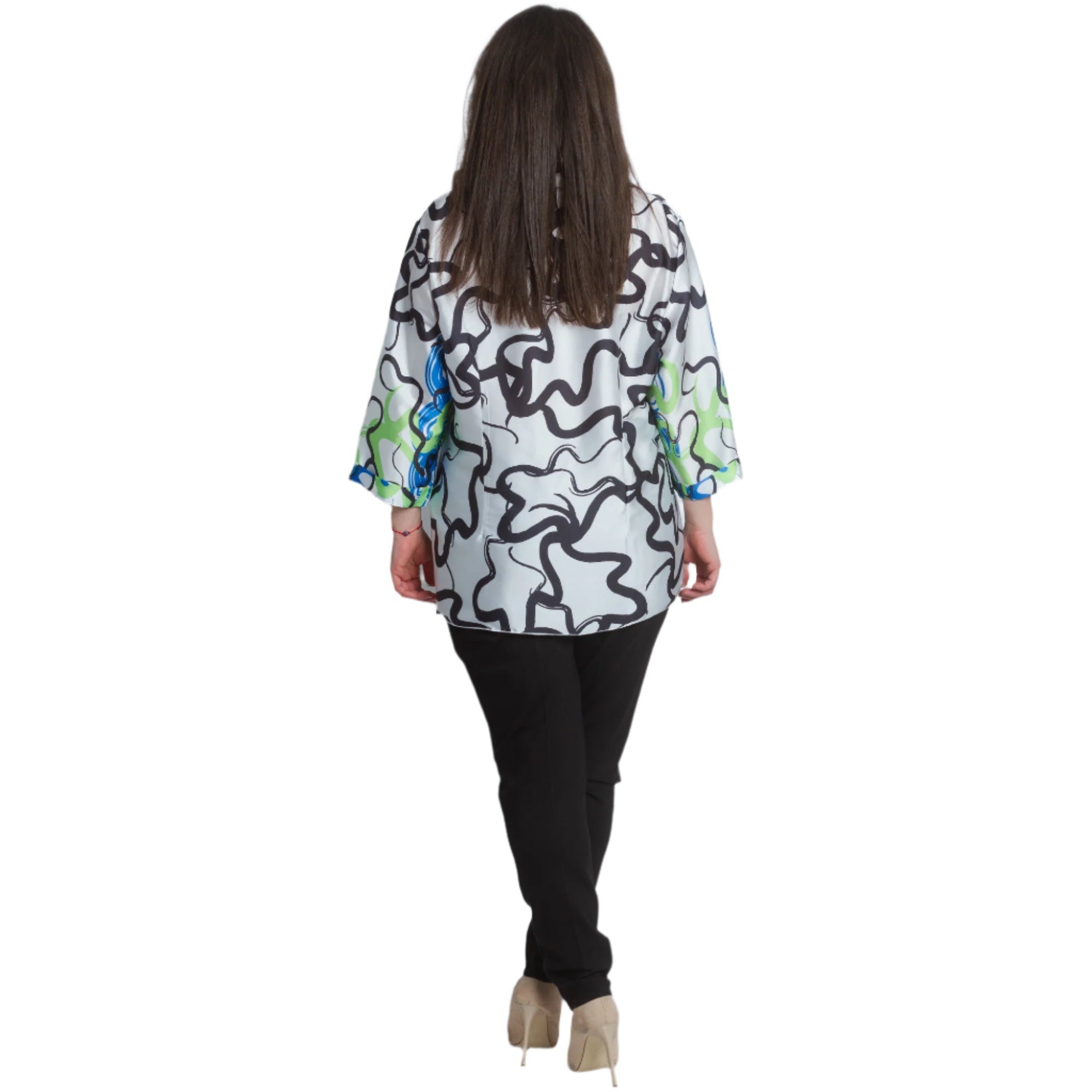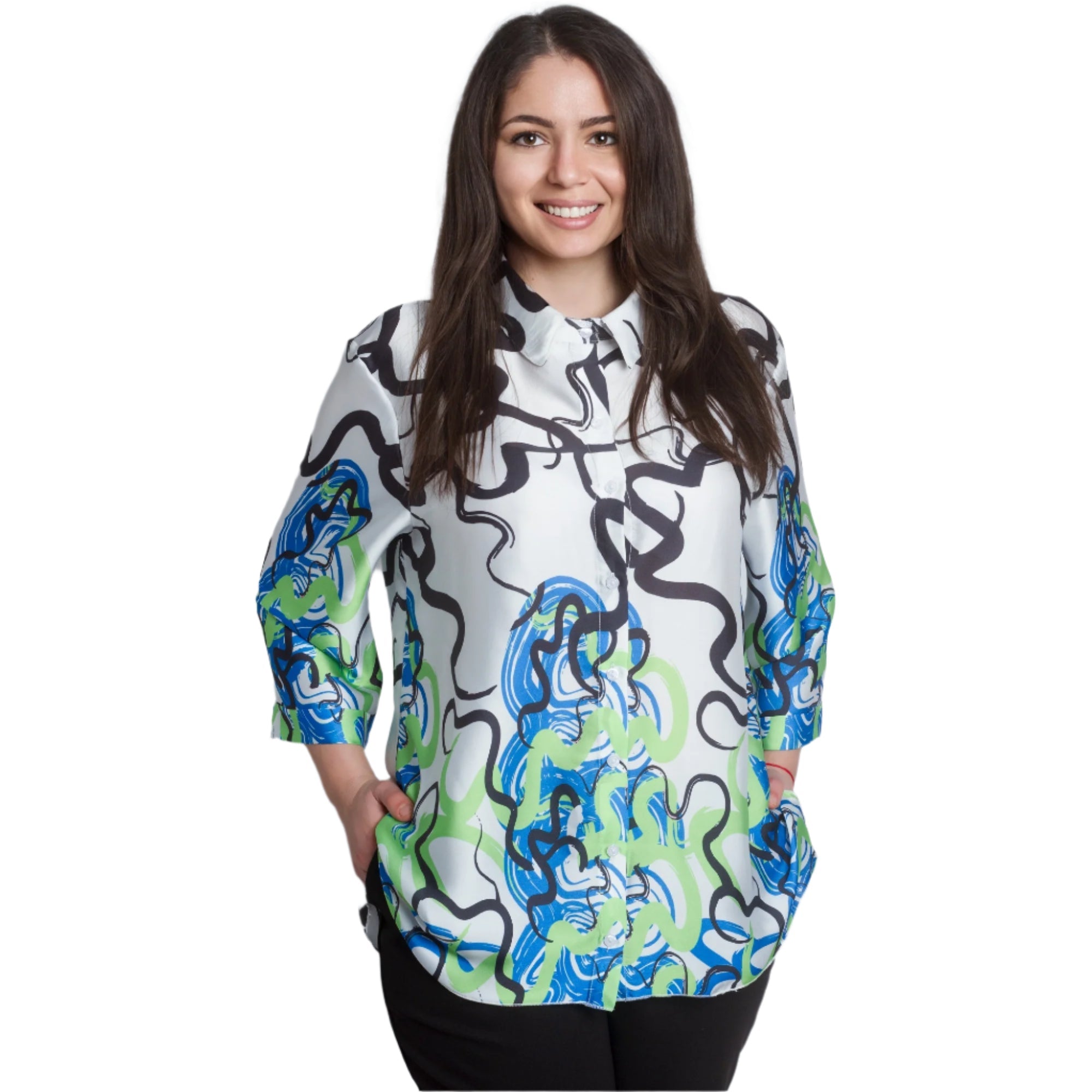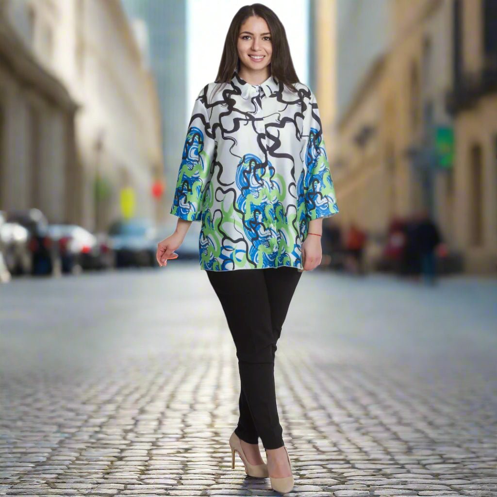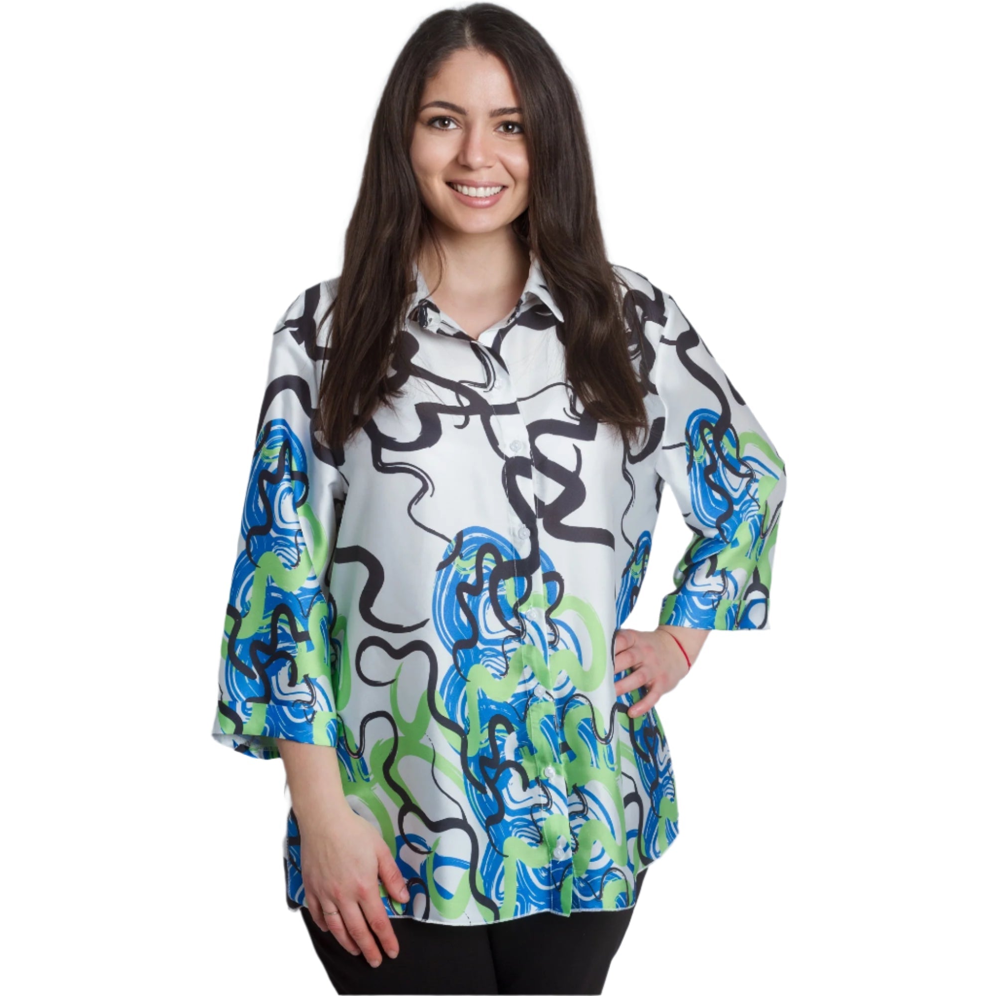 Cămașă maxi lejeră, cu mâneci și guler 3/4. Fabricată din 95% viscoză și 5% elastan, această cămașă este extrem de confortabilă și potrivită pentru purtarea zilnică. Imprimeul abstract colorat în verde și albastru adaugă prospețime și stil ținutei.