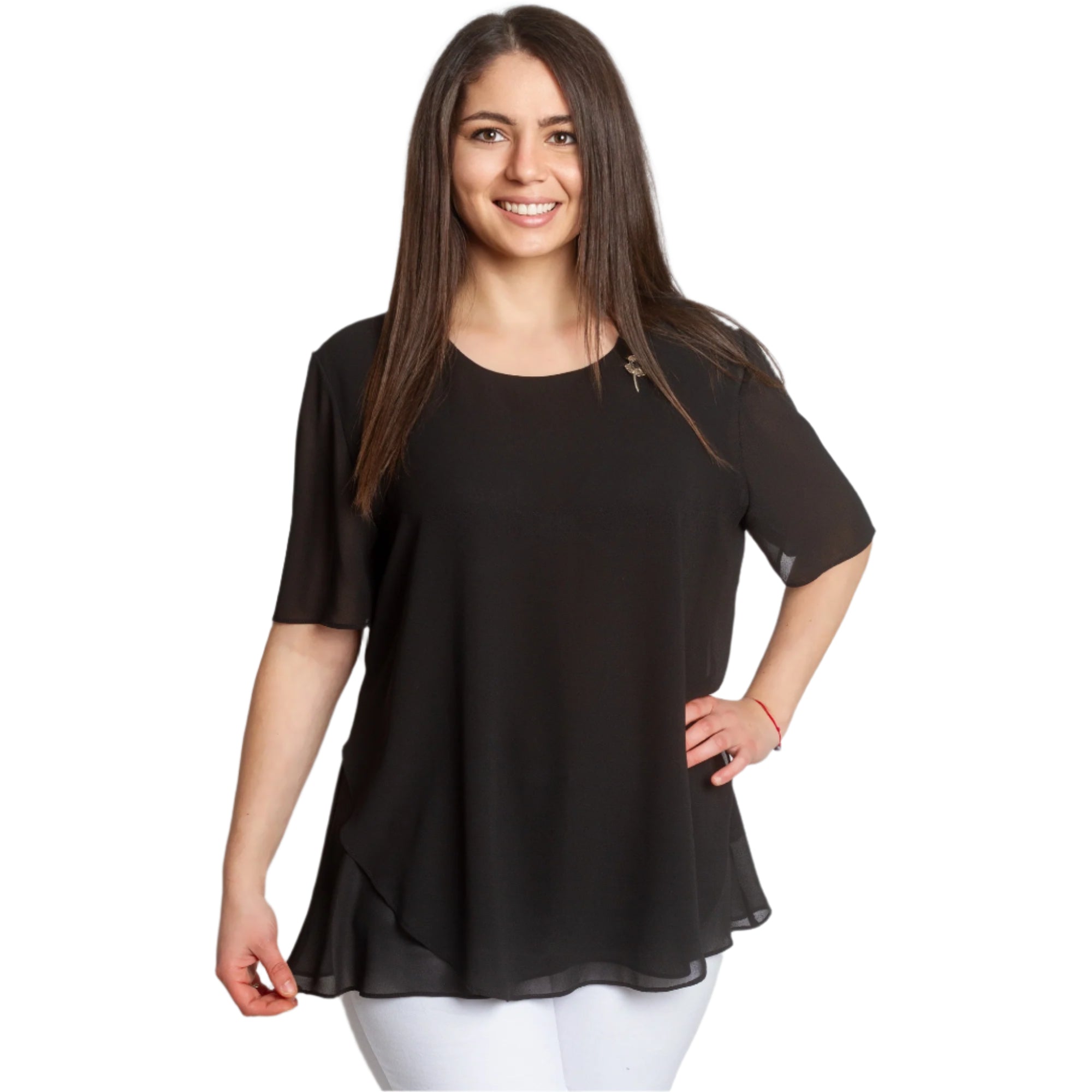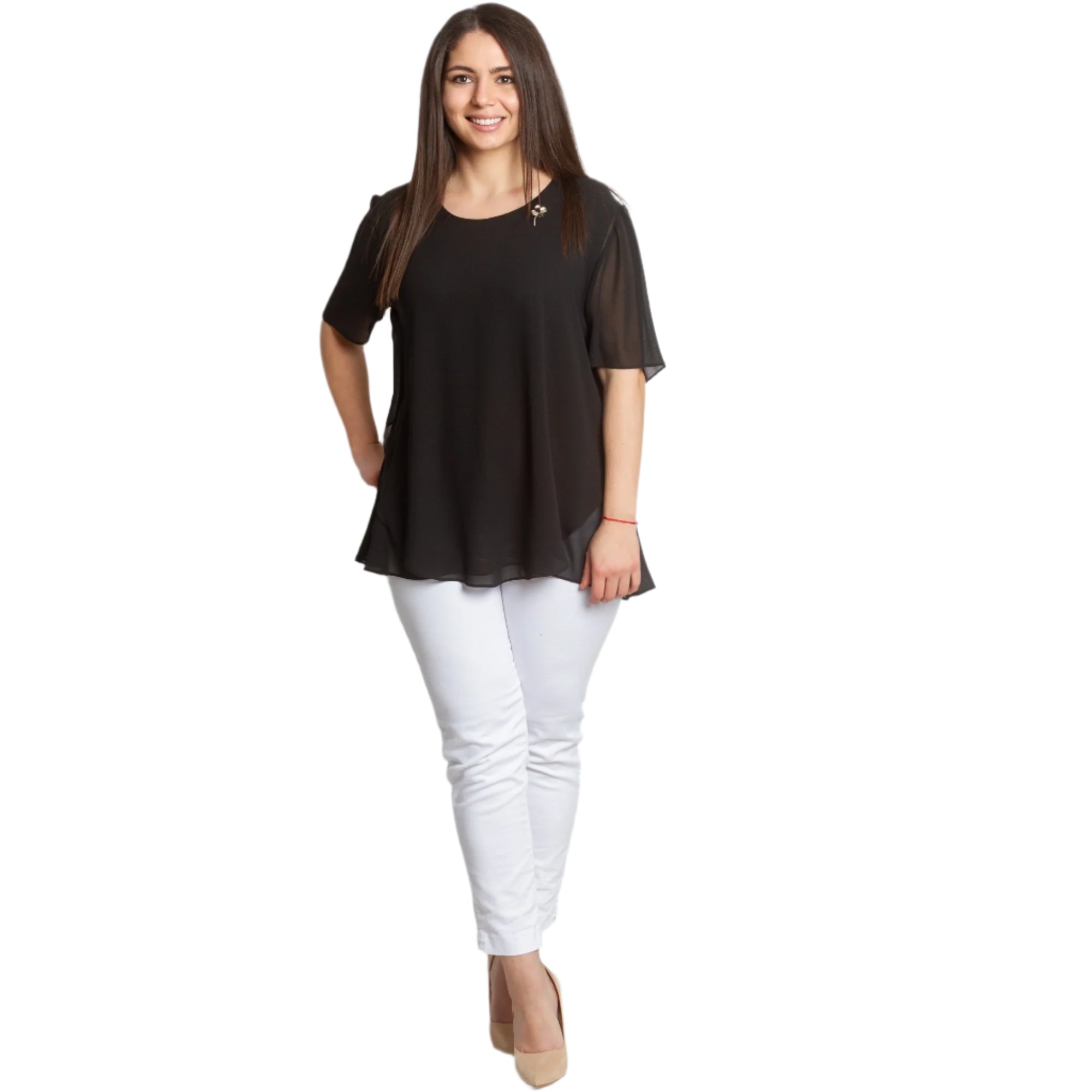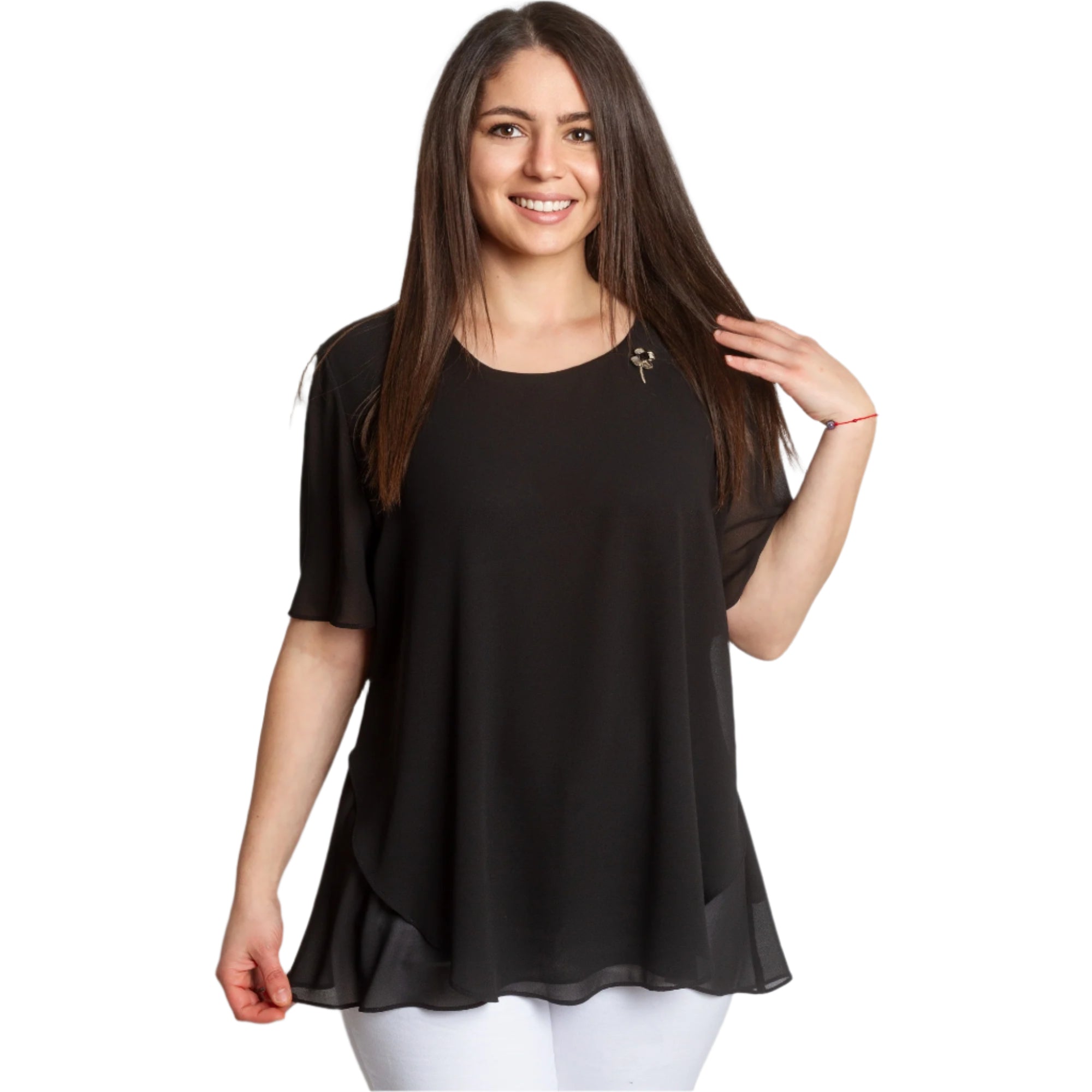 Tunică elegantă din șifon negru cu broșă, potrivită pentru ocazii speciale. Croiul lejer și materialul fin oferă confort și stil. Decolteul este rotund, iar modelul este în mărimi mari, ideală pentru doamnele maxi.