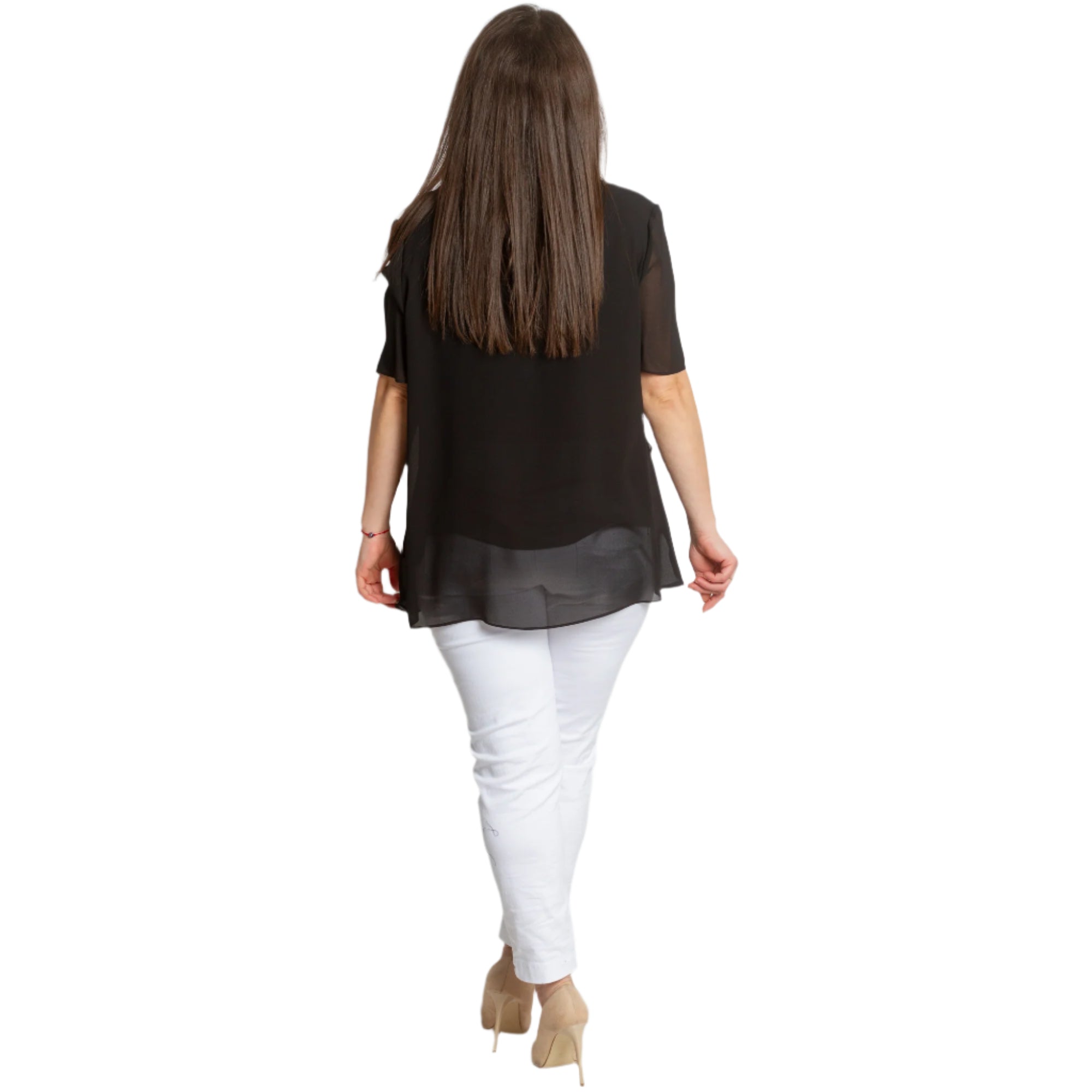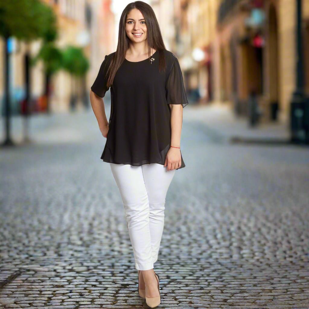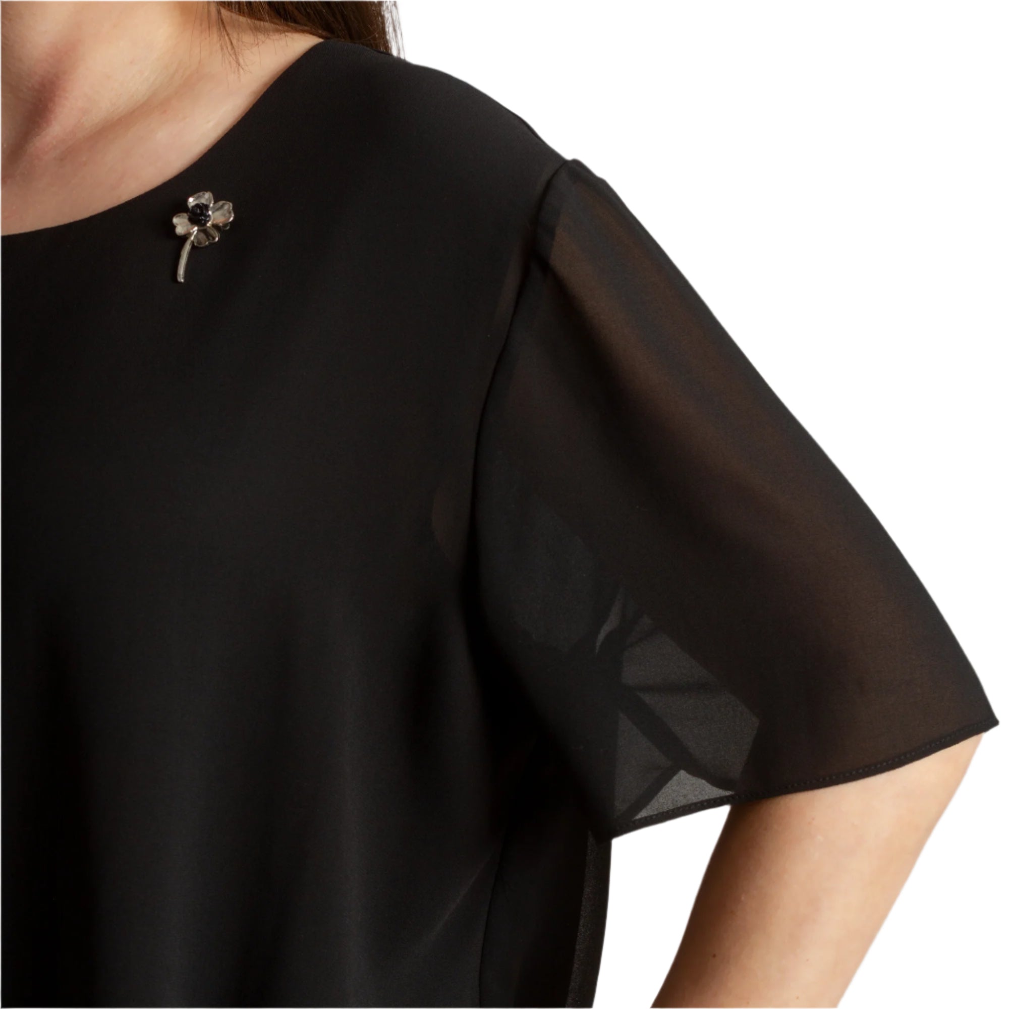 Tunică elegantă din șifon negru cu broșă, potrivită pentru ocazii speciale. Croiul lejer și materialul fin oferă confort și stil. Decolteul este rotund, iar modelul este în mărimi mari, ideală pentru doamnele maxi.