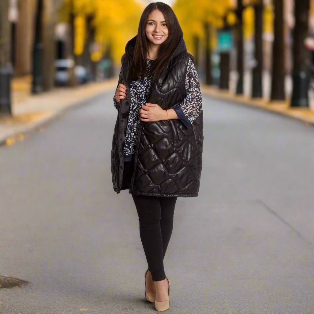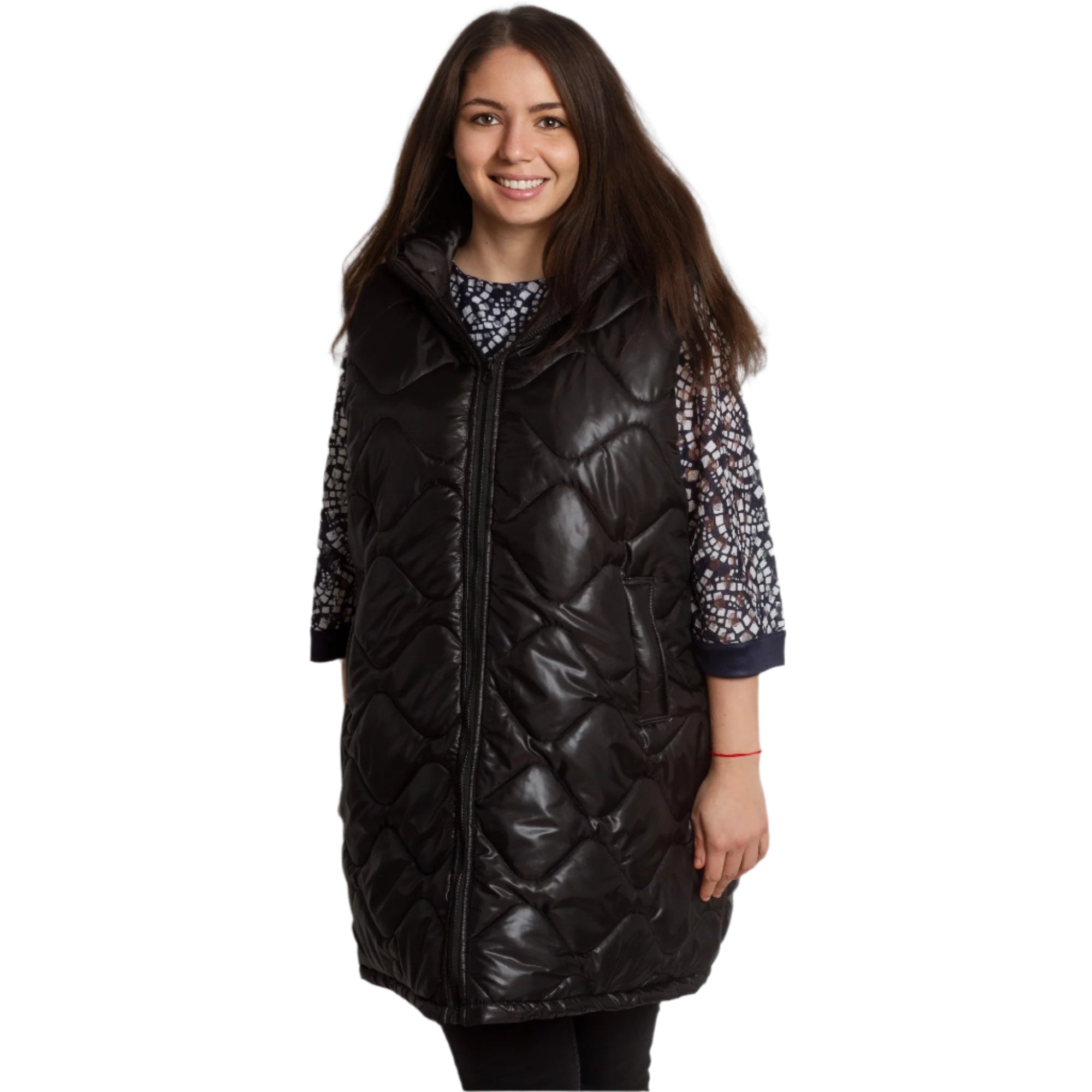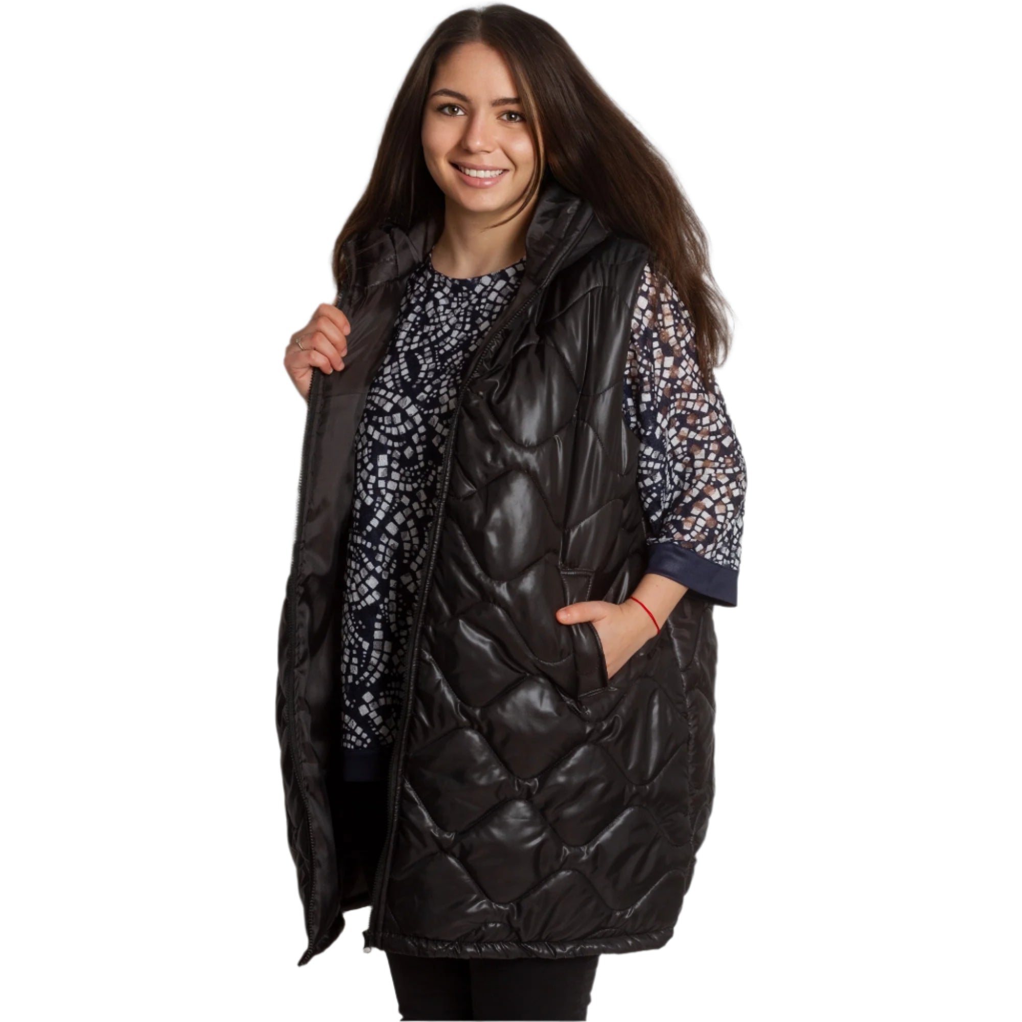 Descoperă o vestă perfectă pentru zi cu zi de la Maxi Market, care combină cu succes confortul și stilul. Acest model este ideal pentru sezoanele toamnă-iarnă și este fabricat în întregime din poliester. Vesta neagră atrage atenția prin modelul geometric și închiderea cu fermoar. Buzunarele practice completează funcționalitatea modelului, făcându-l nu doar elegant, ci și confortabil de purtat. Potrivit pentru fiecare femeie care prețuiește confortul fără a compromite aspectul, produsul nostru reflectă cele mai recente tendințe în moda plus size.