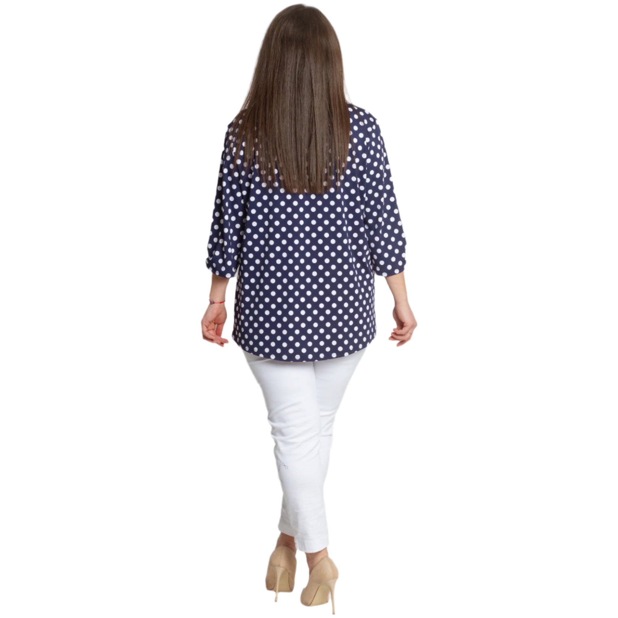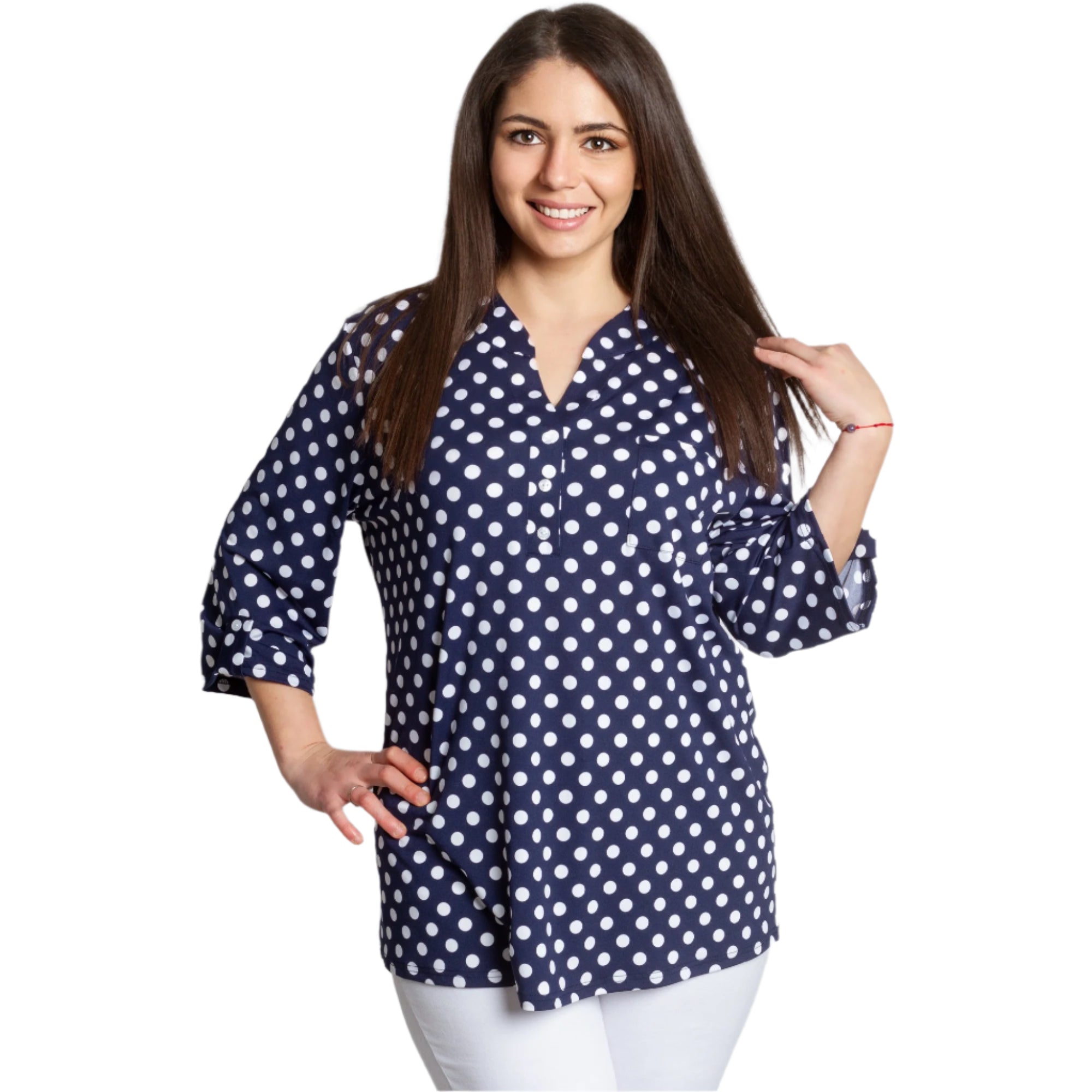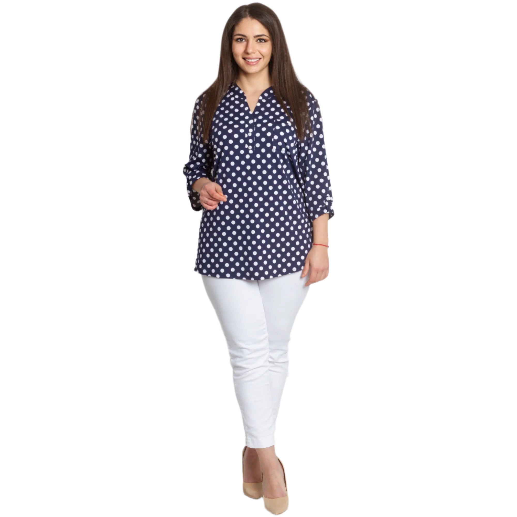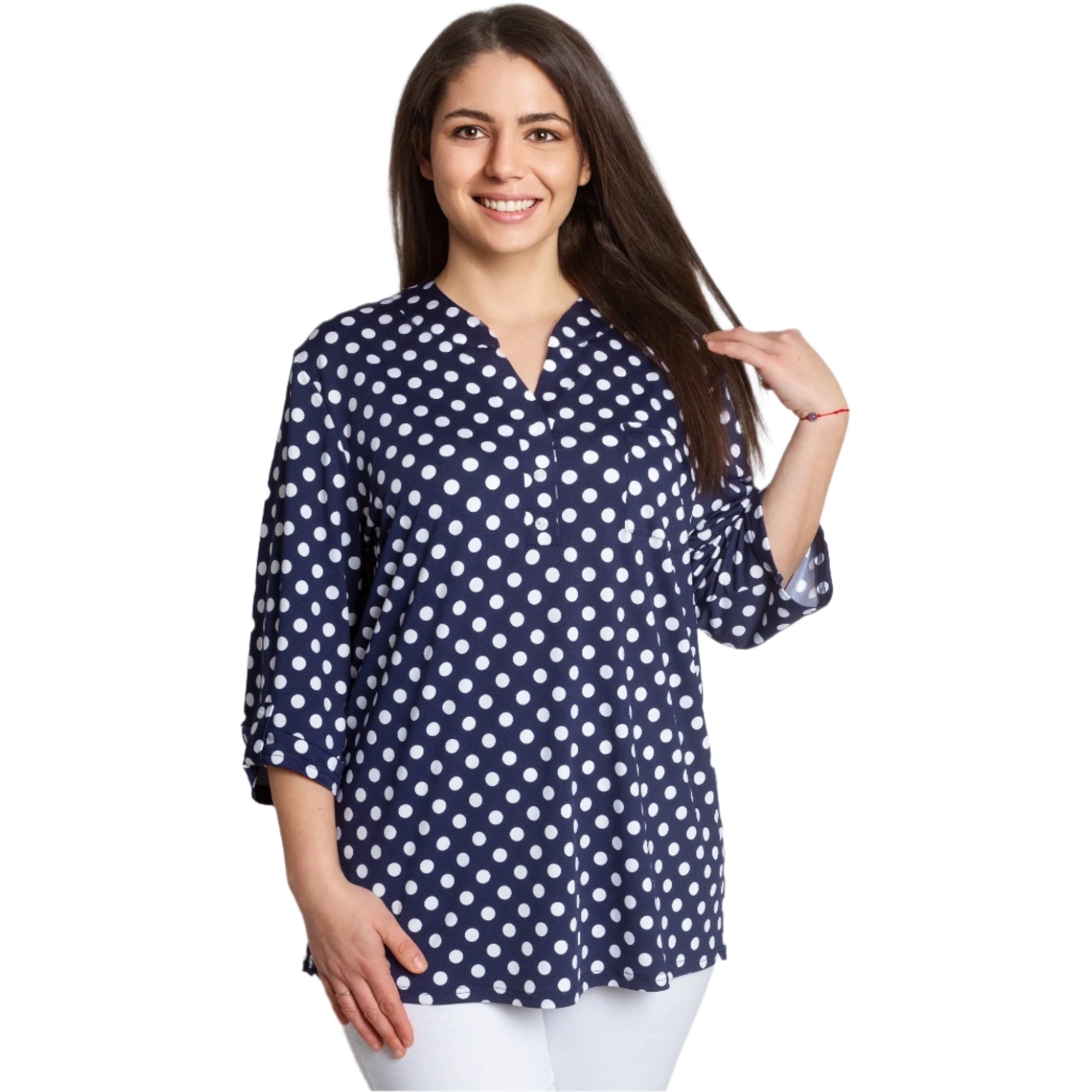 Cămașă maxi elegantă și confortabilă, de culoare bleumarin, cu un imprimeu elegant cu buline albe. Fabricată din 95% viscoză și 5% lycra, această cămașă oferă o ușoară elasticitate pentru confort maxim pe tot parcursul zilei. Designul include un decolteu în V cu nasturi, un buzunar frontal funcțional și mâneci 3/4 care pot fi ajustate cu manșete. Potrivită atât pentru viața de zi cu zi, cât și pentru ținutele de birou, această cămașă se combină de minune atât cu blugi, cât și cu pantaloni eleganți.