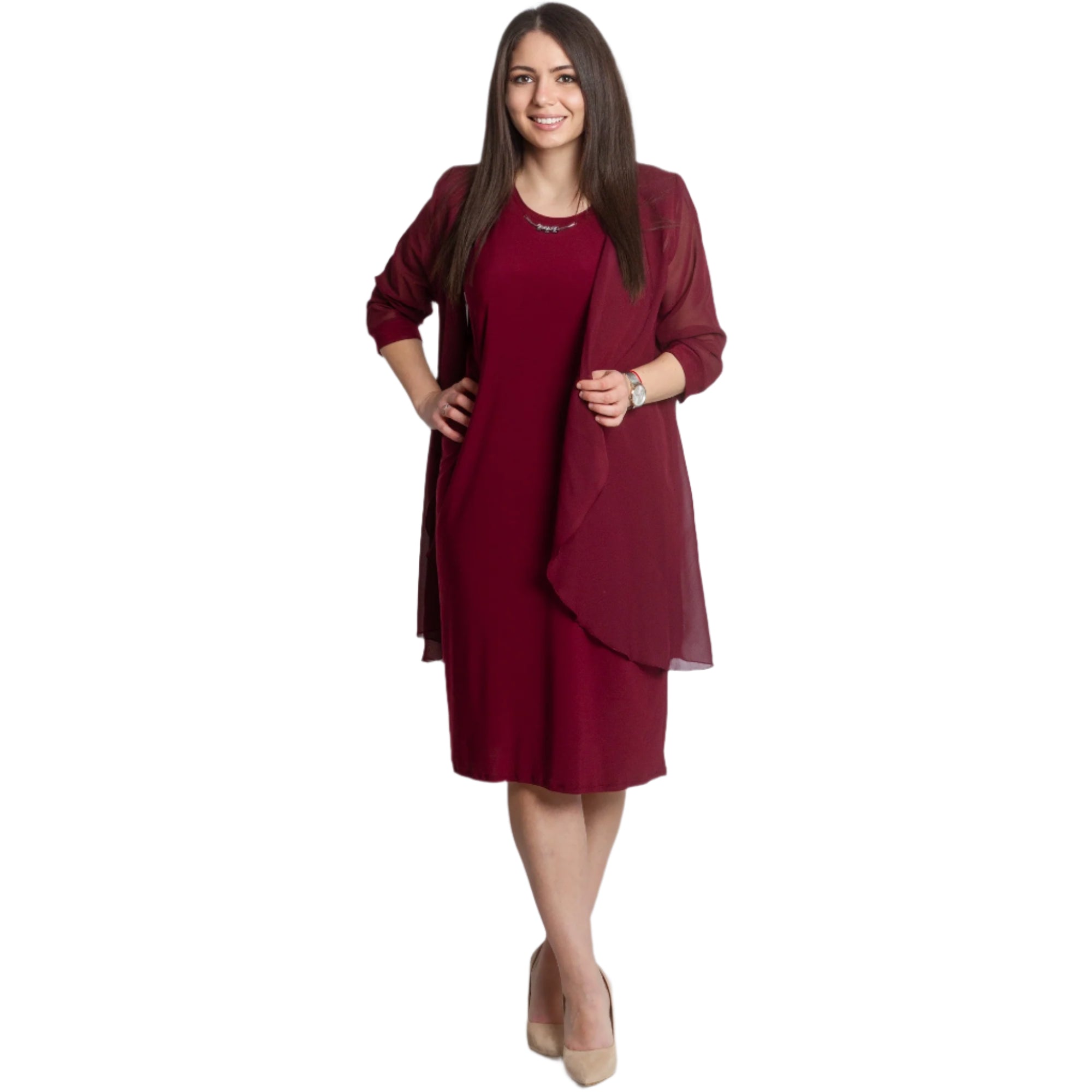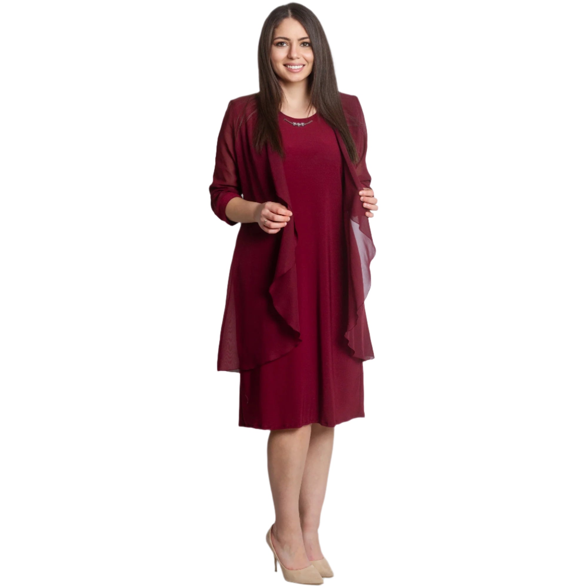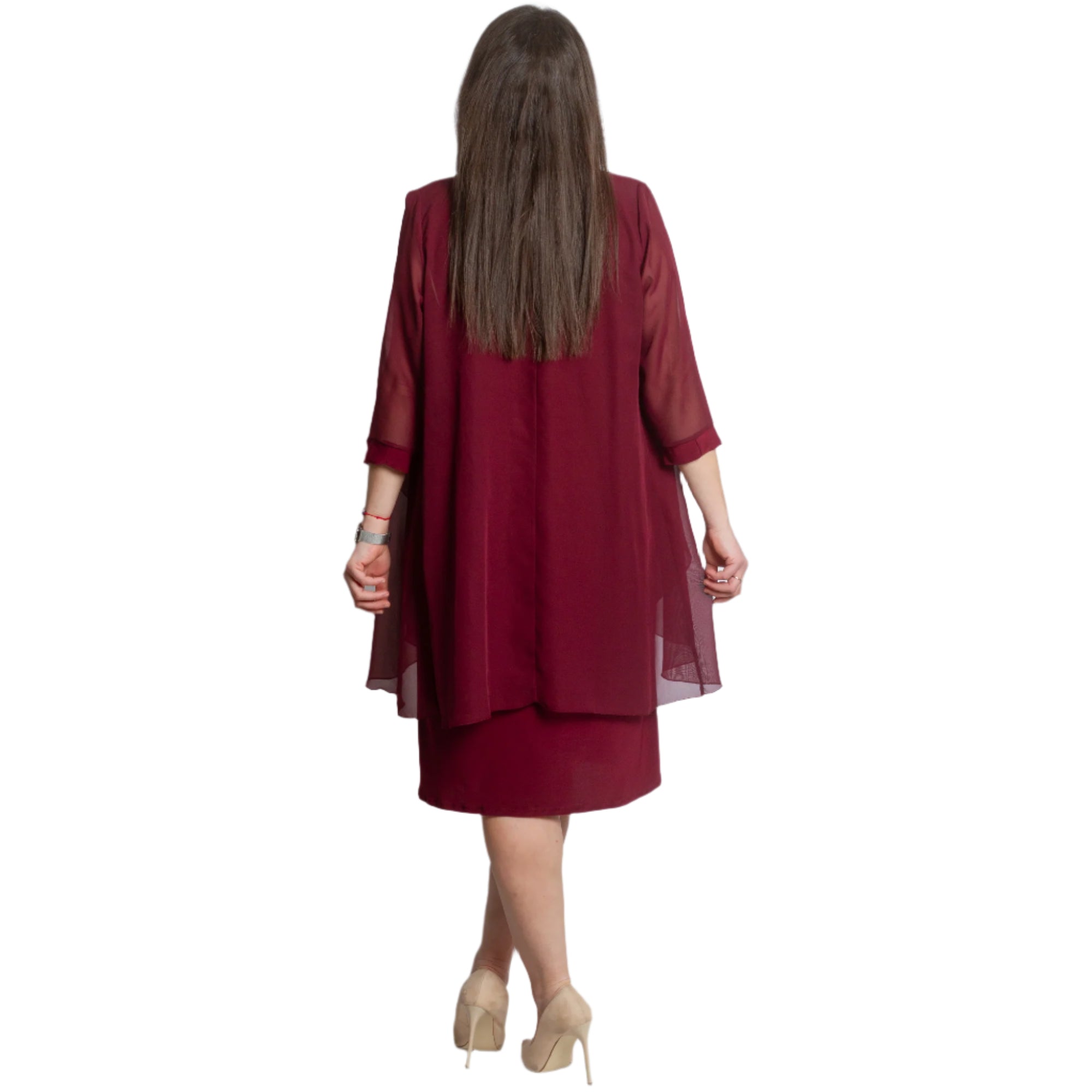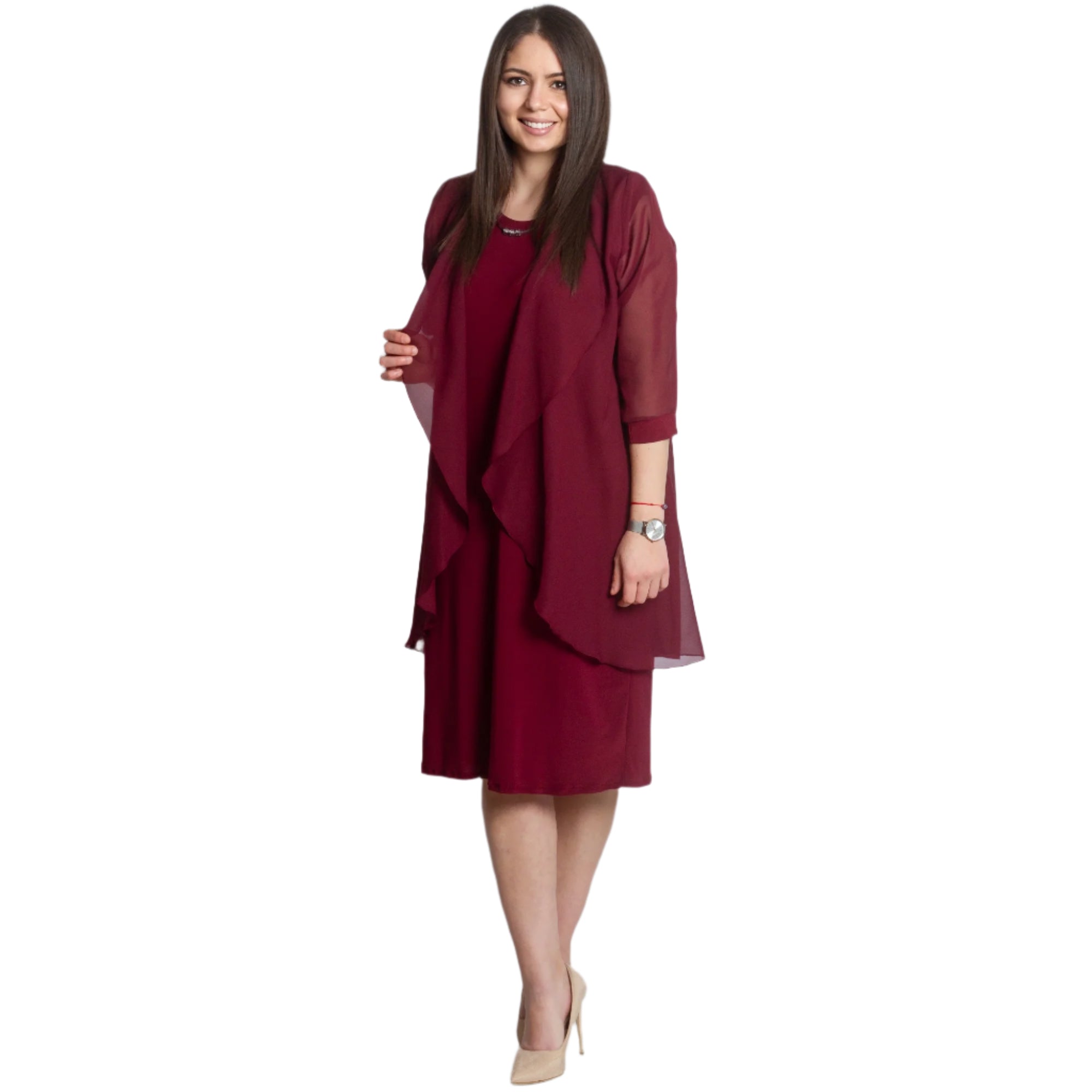 Rochie elegantă din două piese pentru femei, cu pelerină din șifon, de culoare bordo. Confecționată din 95% viscoză, 5% elastan. Dreaptă, cu lungime sub genunchi, decolteu rotund, bretele groase și partea superioară din șifon. Material elastic care oferă confort. Aspect elegant pentru fiecare doamnă!