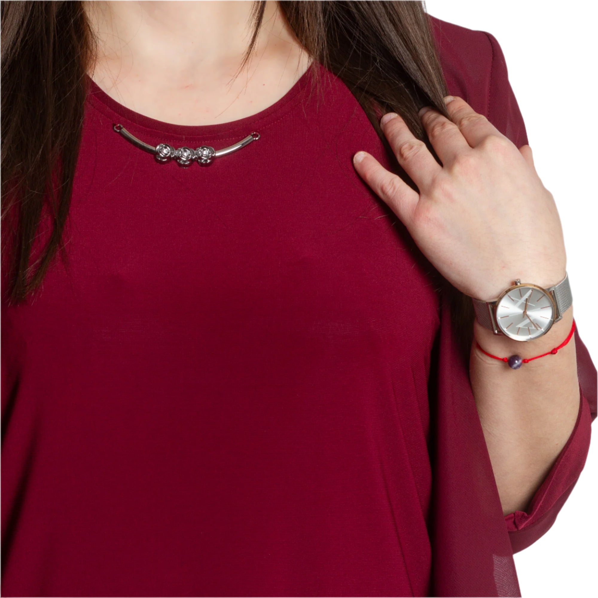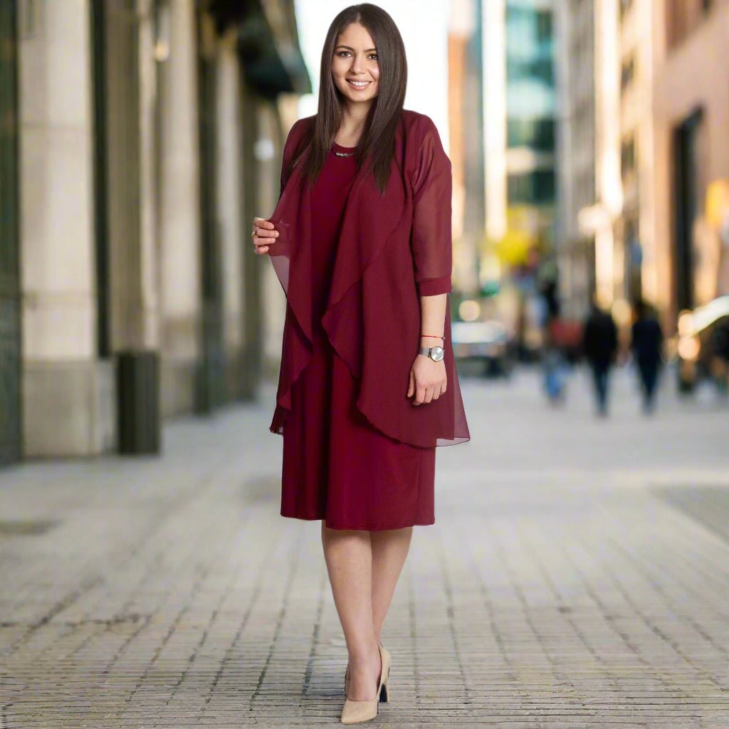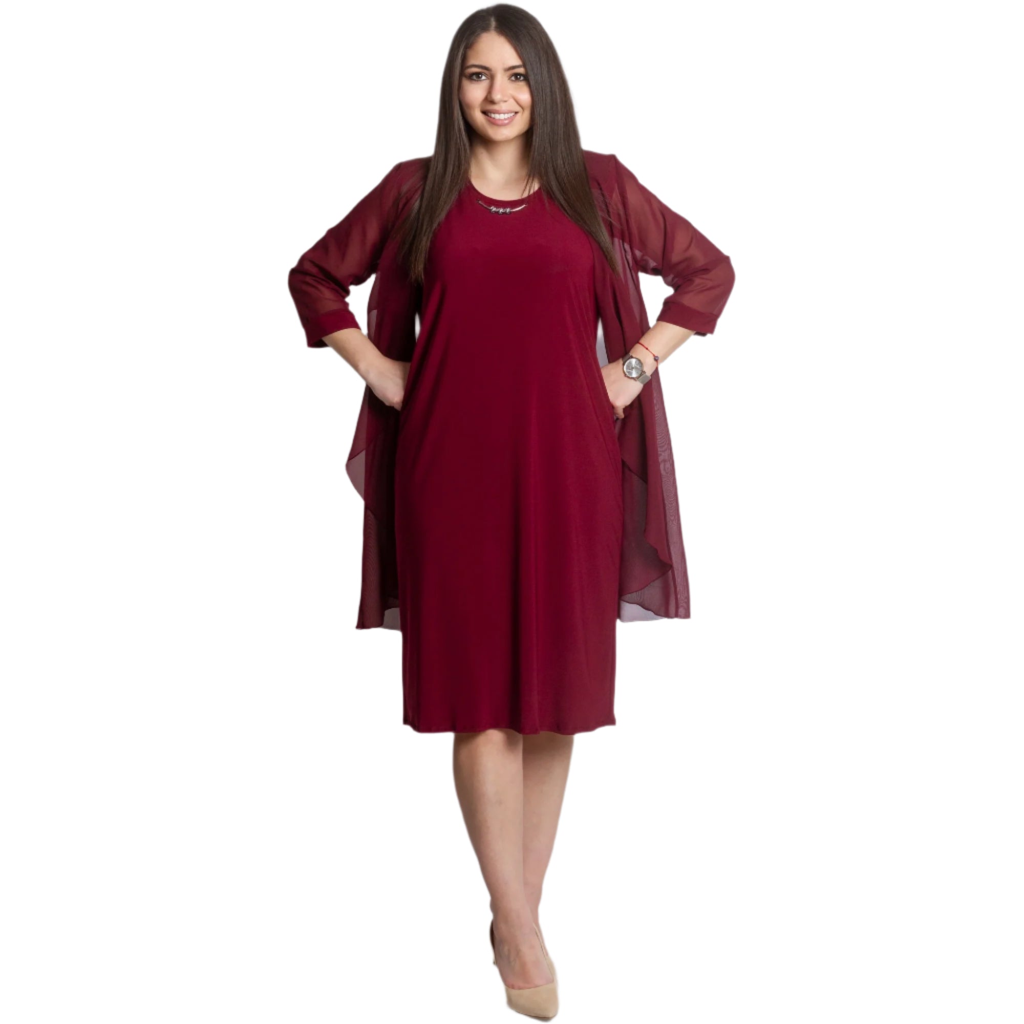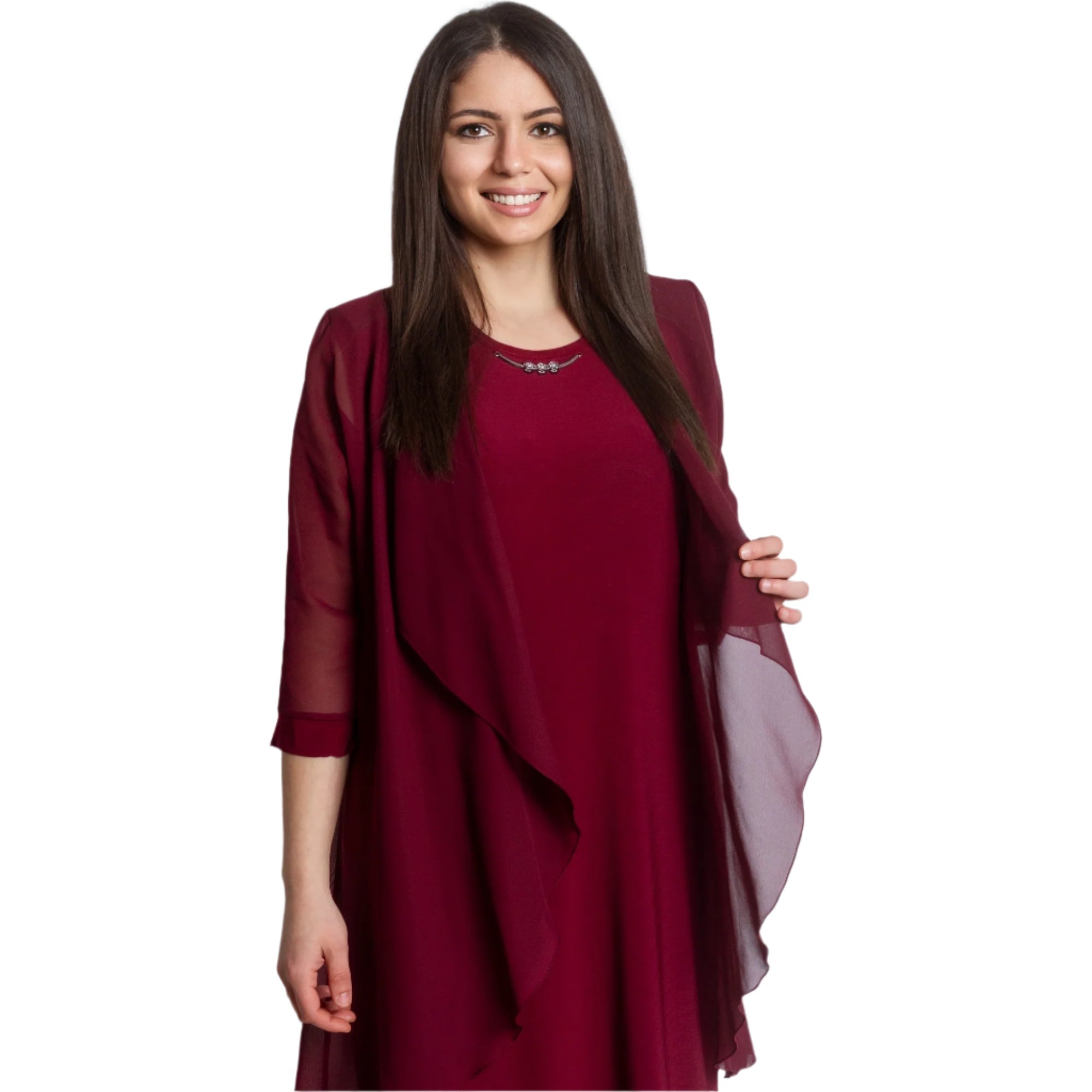 Rochie elegantă din două piese pentru femei, cu pelerină din șifon, de culoare bordo. Confecționată din 95% viscoză, 5% elastan. Dreaptă, cu lungime sub genunchi, decolteu rotund, bretele groase și partea superioară din șifon. Material elastic care oferă confort. Aspect elegant pentru fiecare doamnă!