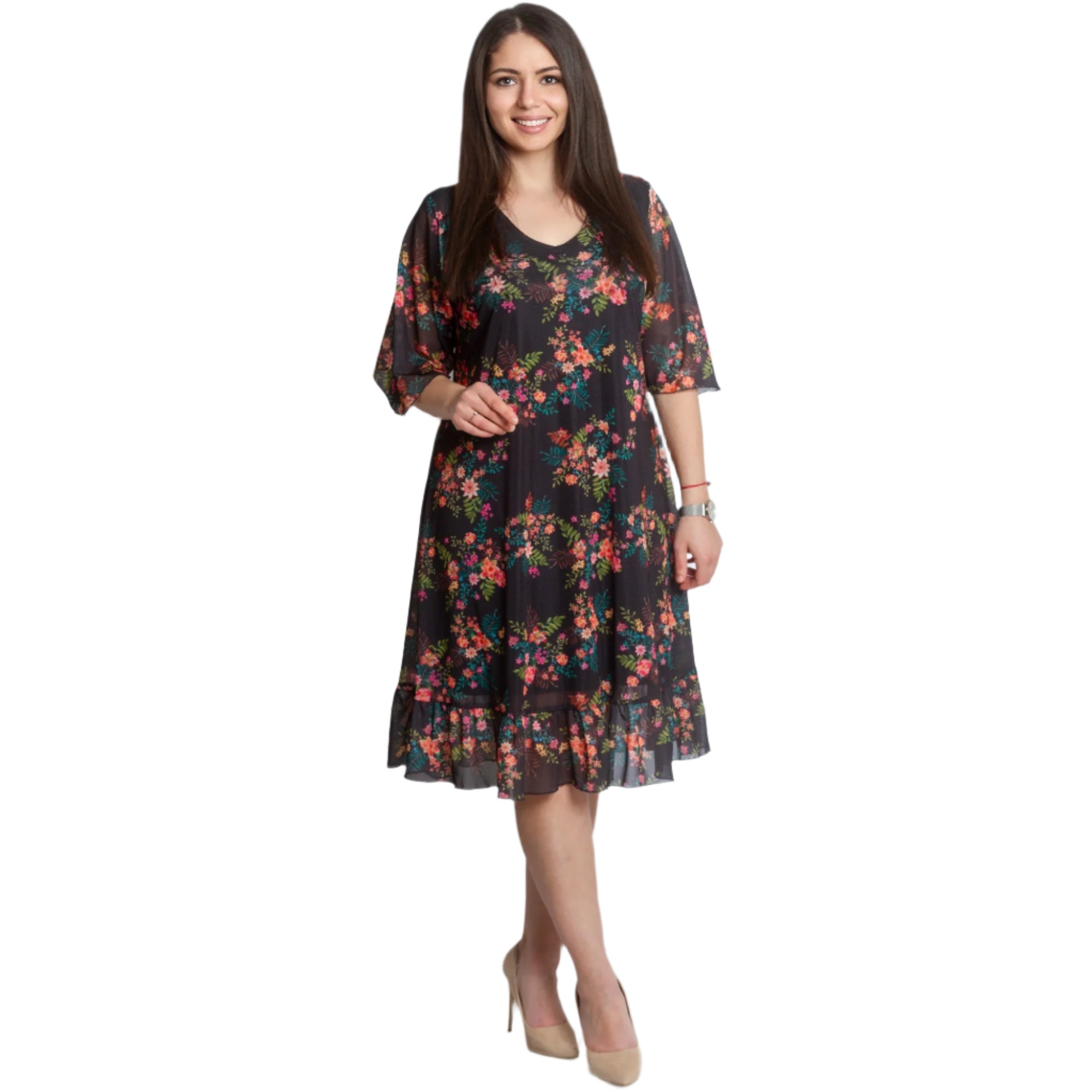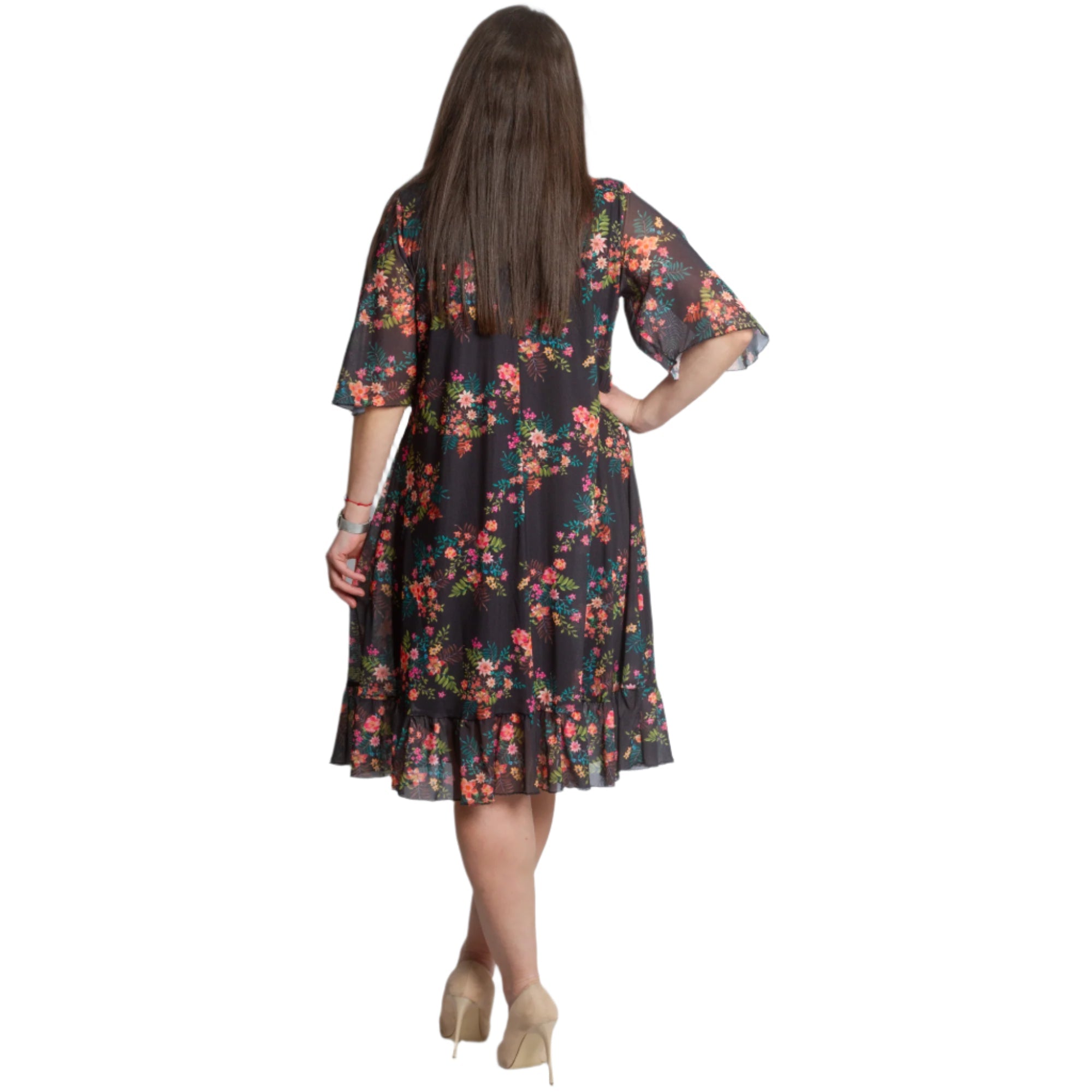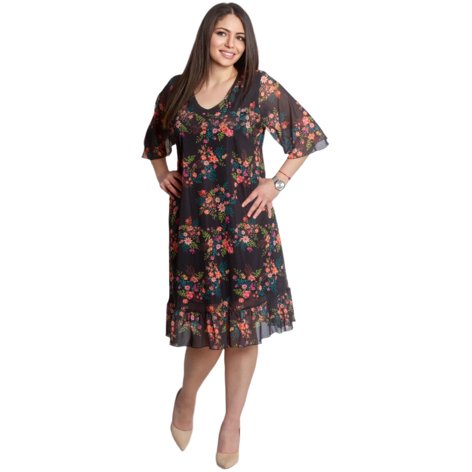 Rochie elegantă de damă, de culoare neagră, cu imprimeu floral din șifon. Confecționată din 95% viscoză, 5% elastan. Croi evazat și decolteu în V, lungime sub genunchi și partea superioară din șifon. Material elastic pentru confort. Alegerea ideală pentru ocazii formale, plimbări de seară sau evenimente speciale.