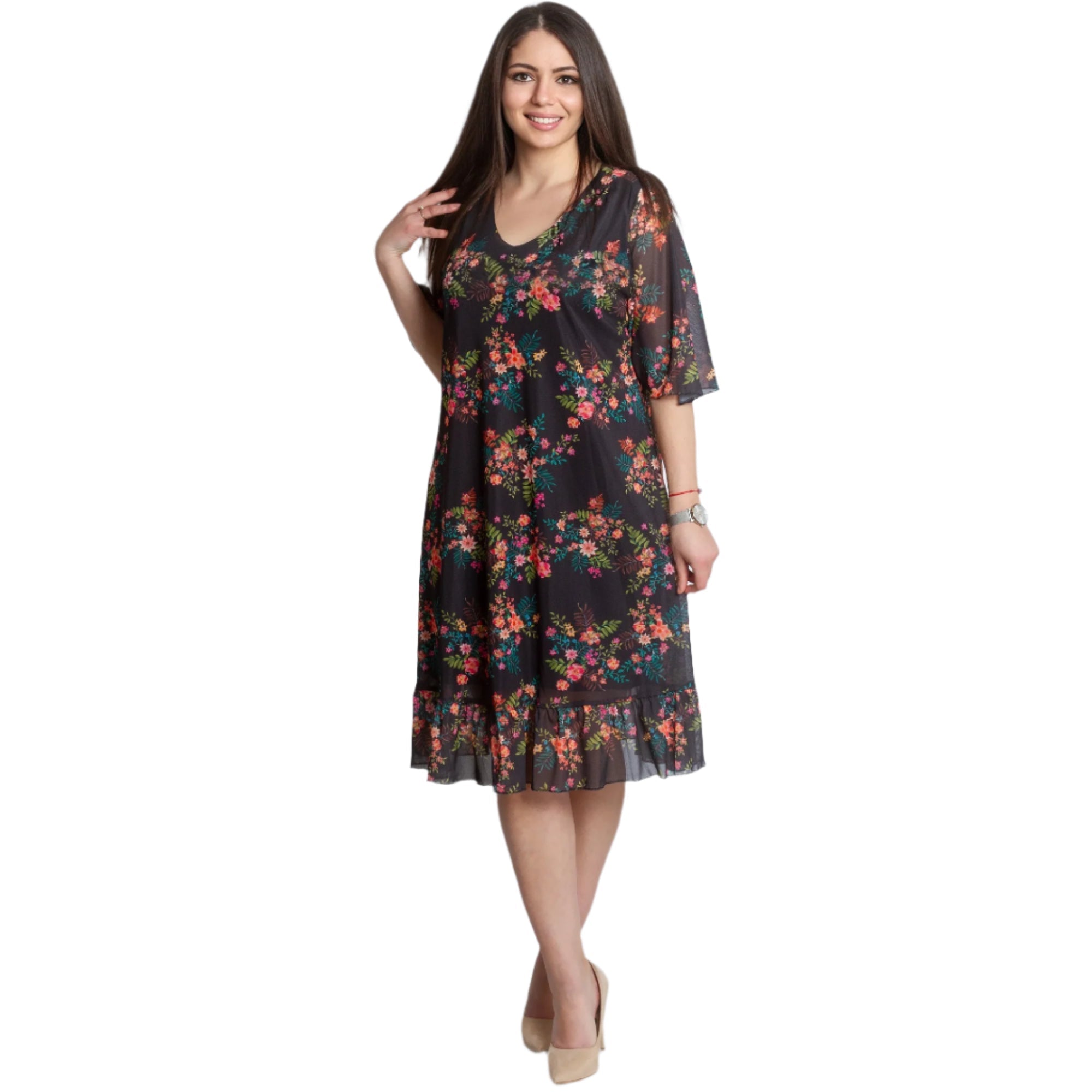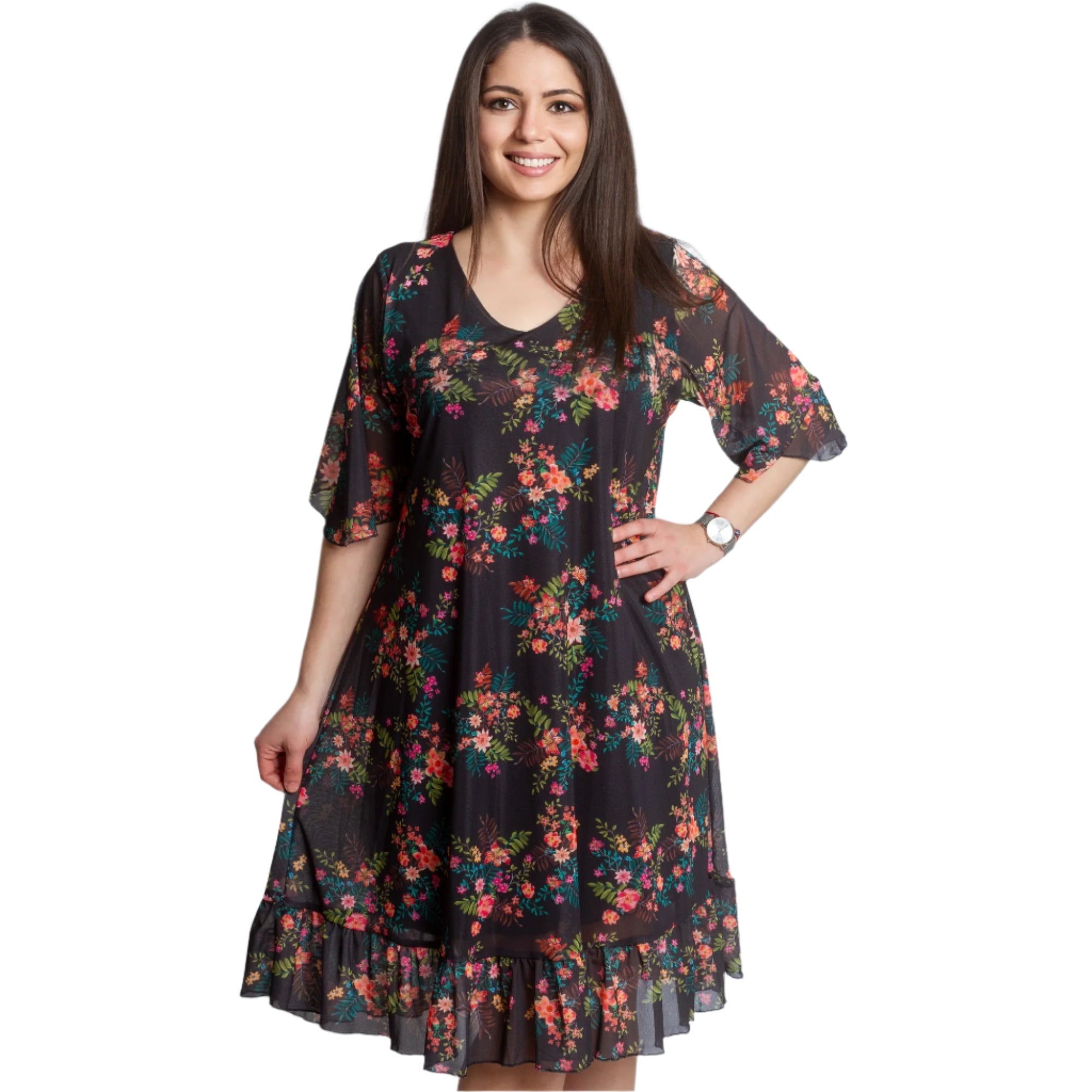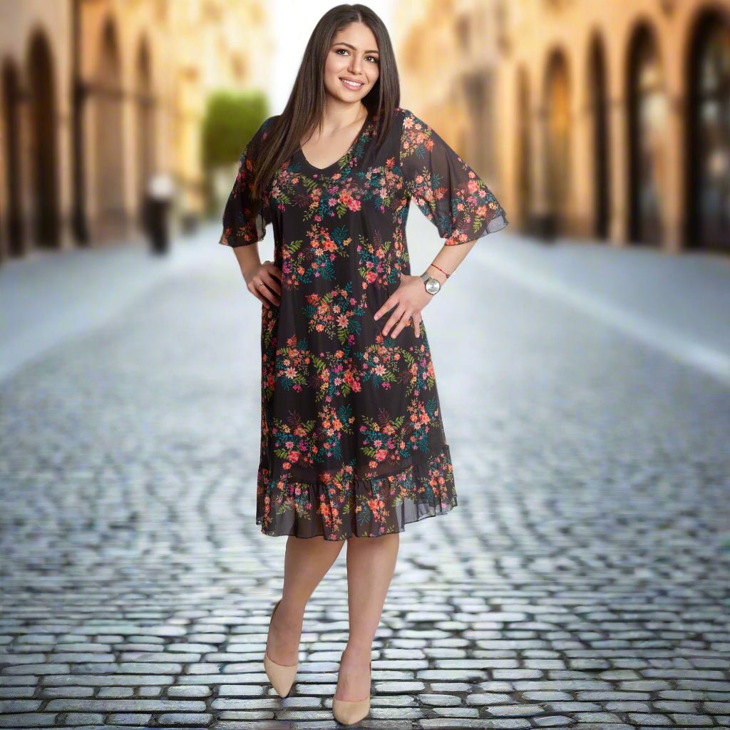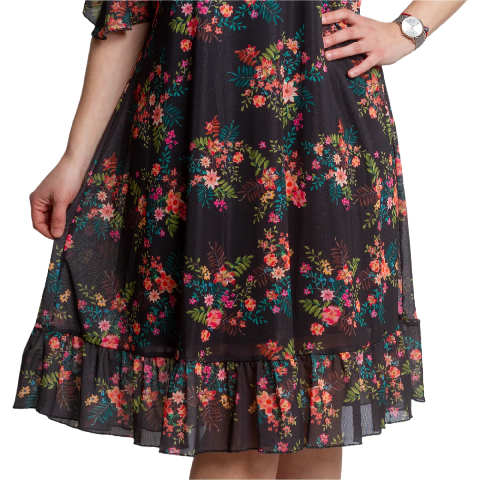 Rochie elegantă de damă, de culoare neagră, cu imprimeu floral din șifon. Confecționată din 95% viscoză, 5% elastan. Croi evazat și decolteu în V, lungime sub genunchi și partea superioară din șifon. Material elastic pentru confort. Alegerea ideală pentru ocazii formale, plimbări de seară sau evenimente speciale.
