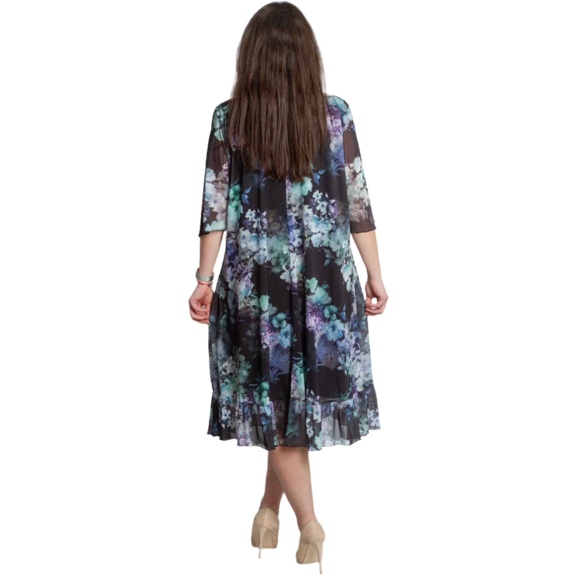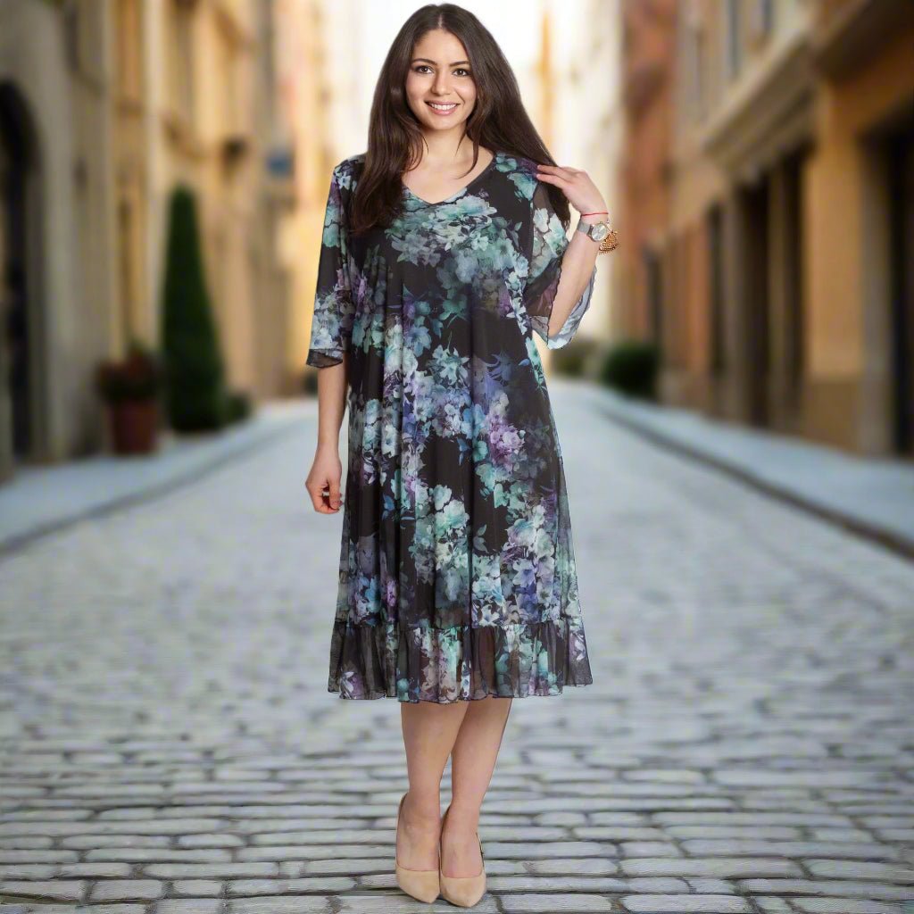 Această rochie elegantă, evazată, este concepută pentru a accentua feminitatea și a oferi confort pe tot parcursul zilei. Fabricată din 95% viscoză și 5% elastan, este realizată dintr-un material moale și plăcut la atingere, care oferă libertate de mișcare. Topul din șifon, ușor și vaporos, adaugă un plus de eleganță, iar decolteul în V adaugă o notă de sofisticare. Imprimeul floral în nuanțe delicate conferă rochiei un aspect elegant și feminin.