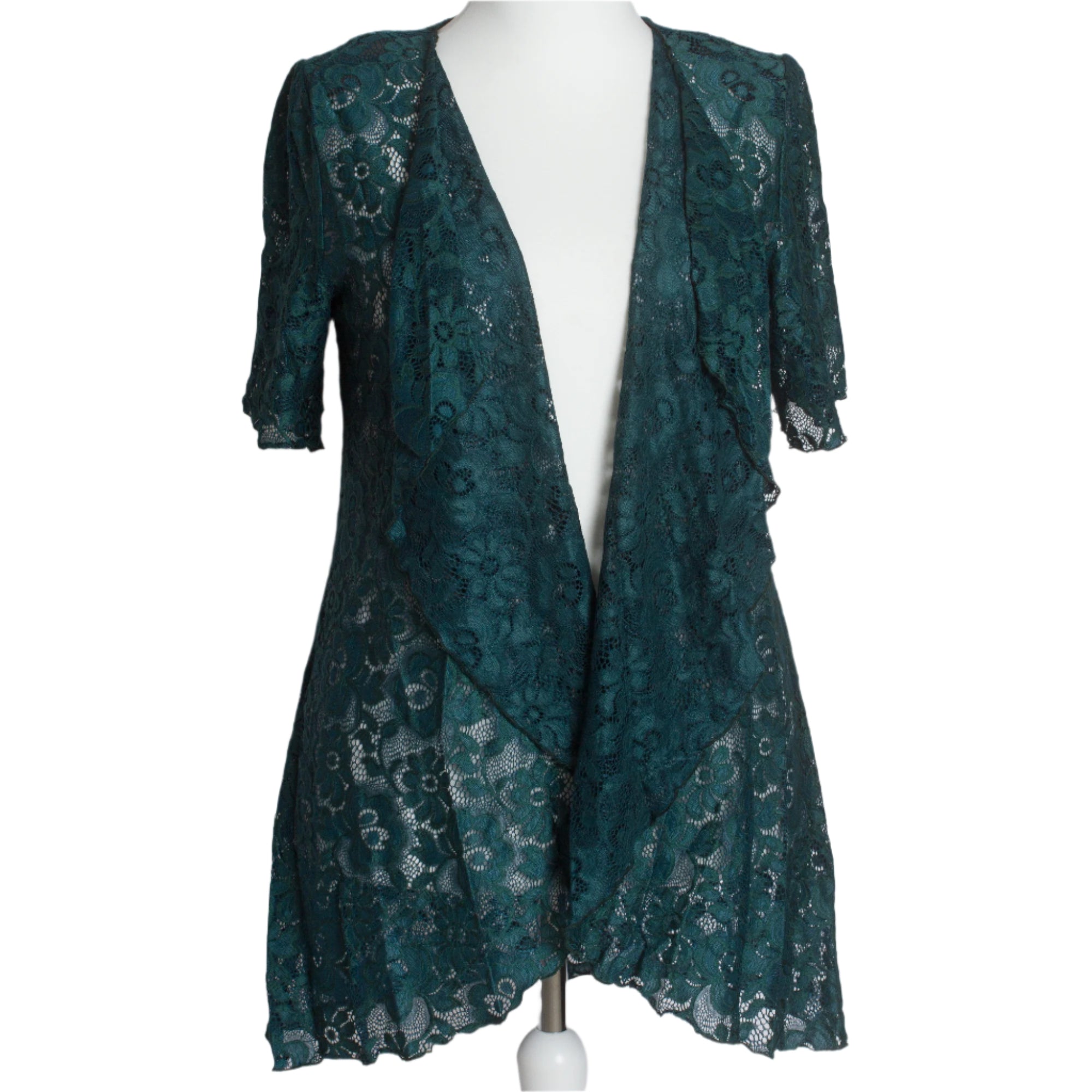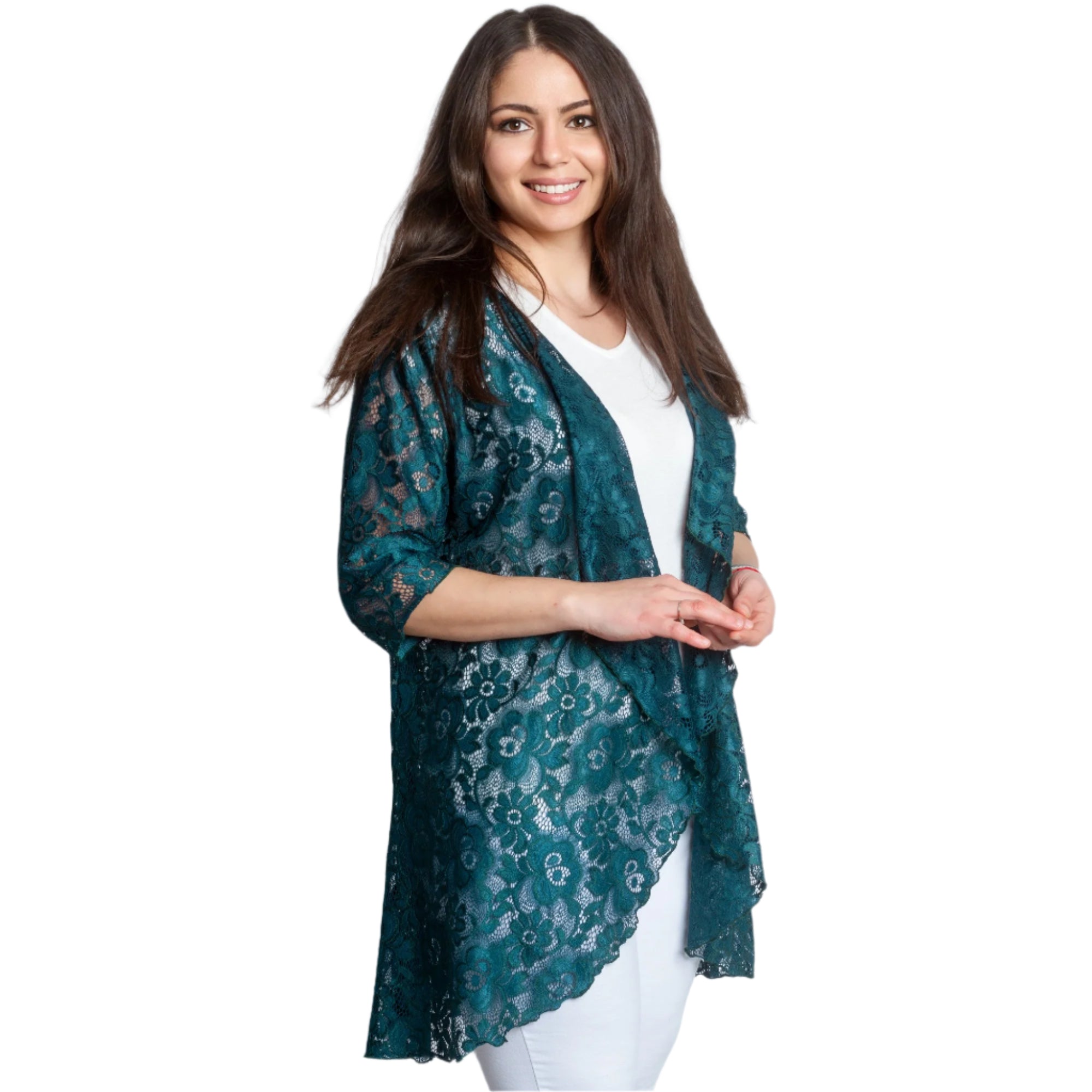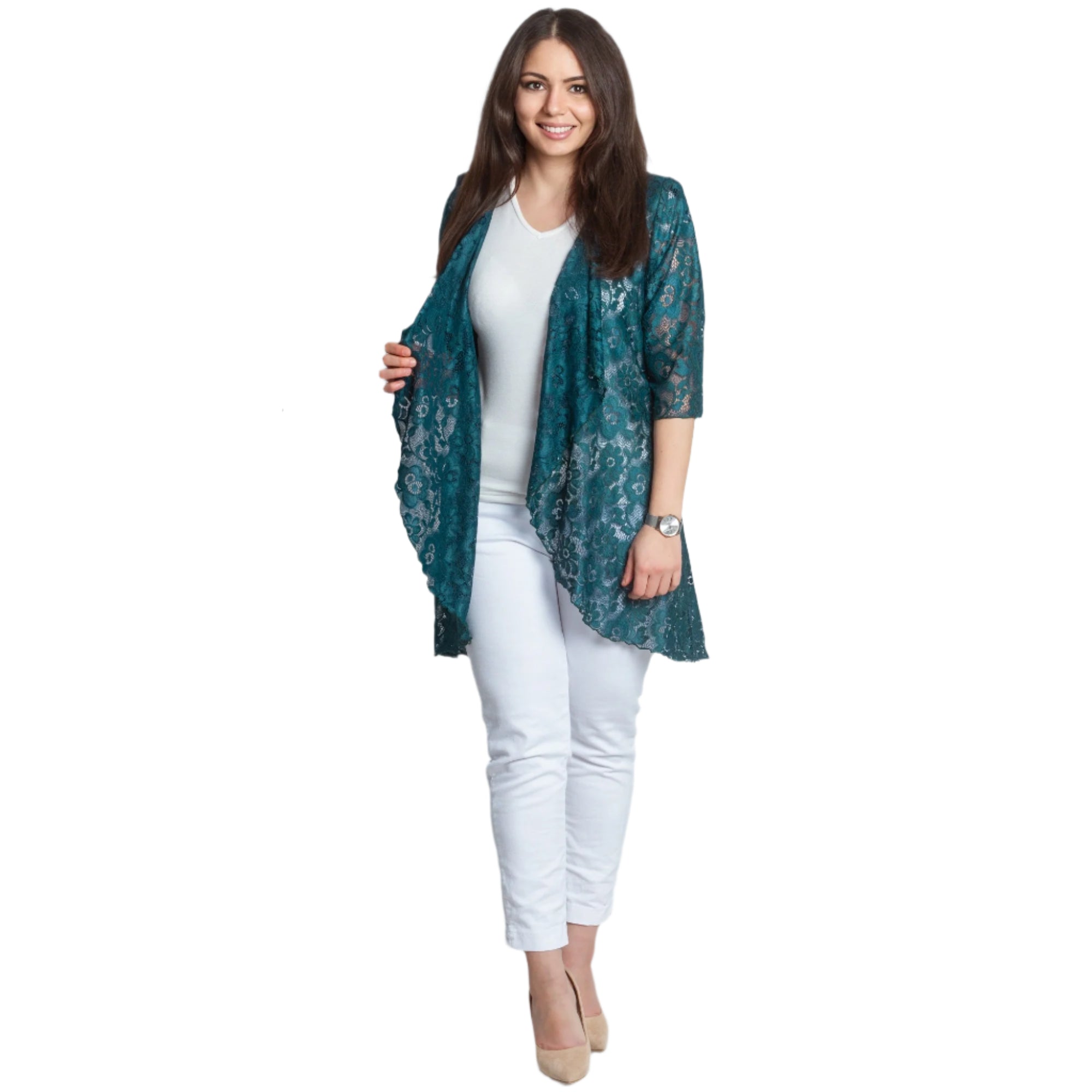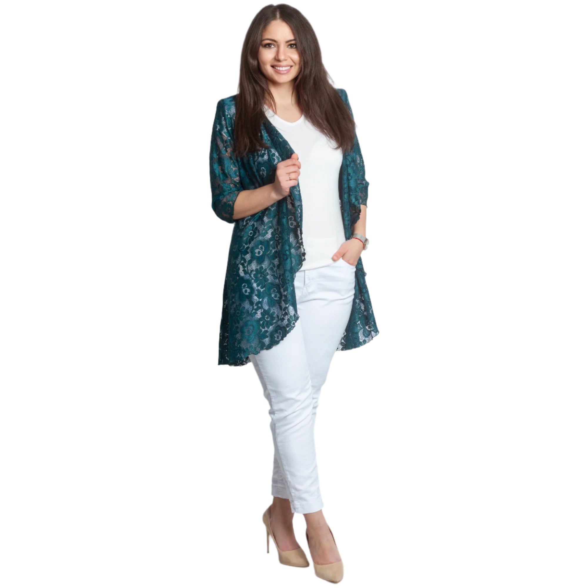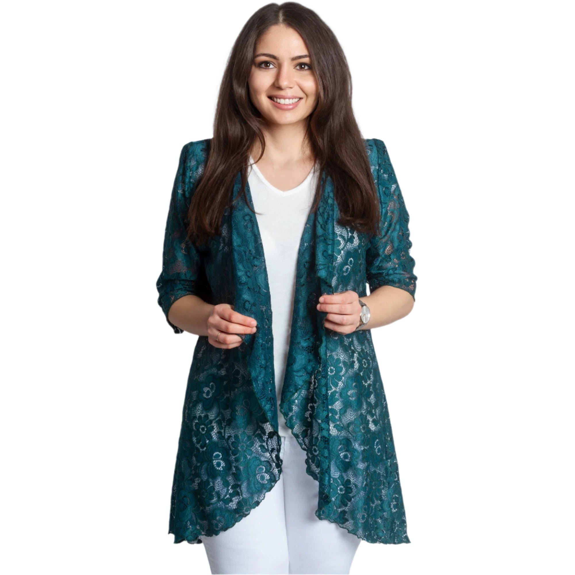 Adaugă o notă de rafinament ținutei tale cu acest sacou elegant de damă, confecționat din dantelă fină de culoare verde măsliniu. Fabricat din 95% vâscoză și 5% elastan, acest model combină lejeritatea, moliciunea și o ușoară elasticitate, ceea ce asigură confort pe tot parcursul zilei. Croiul lejer, cu rever crestat și mâneci 3/4, adaugă feminitate și stil, în timp ce textura dantelei adaugă un finisaj sofisticat. O alegere perfectă atât pentru ocazii formale, cât și casual.