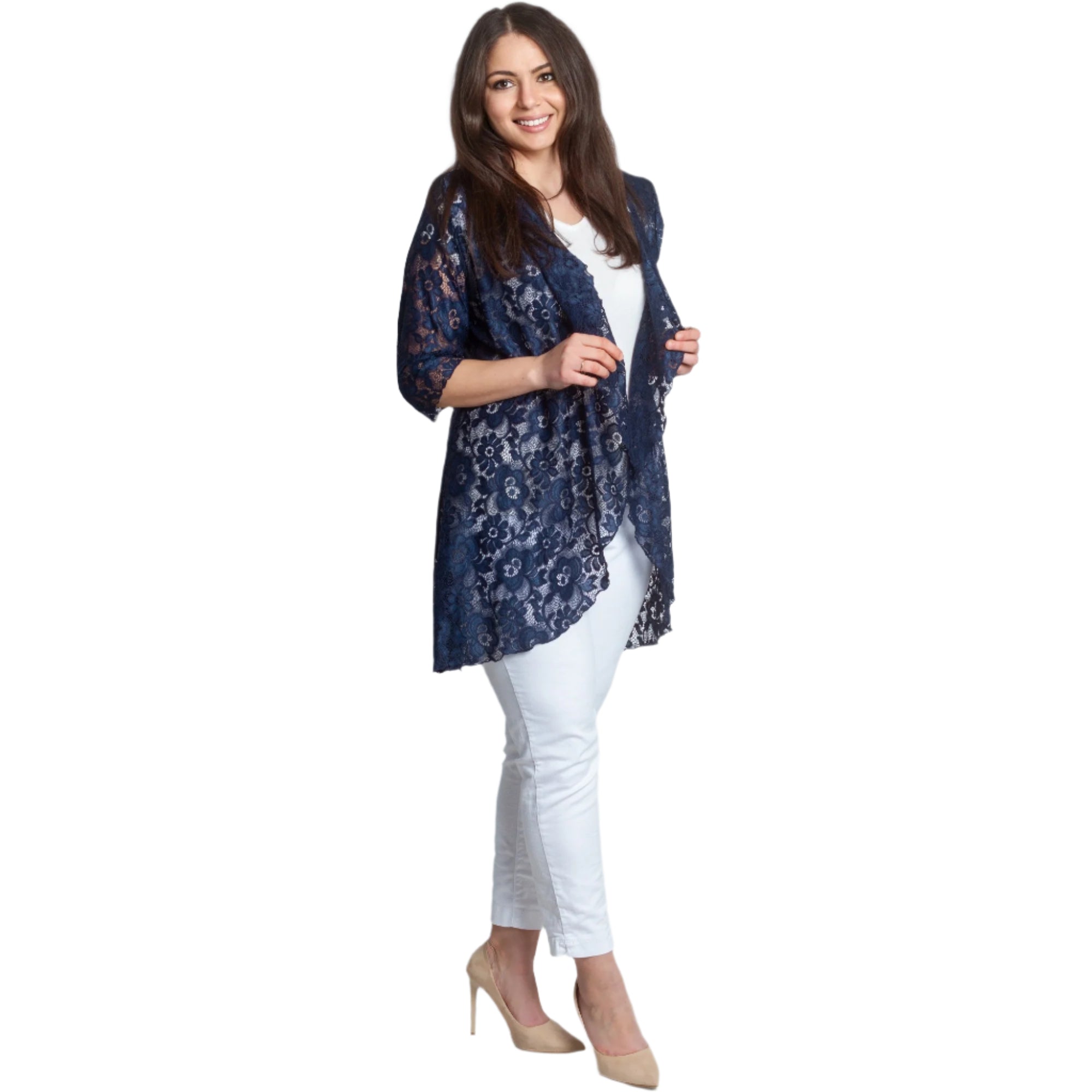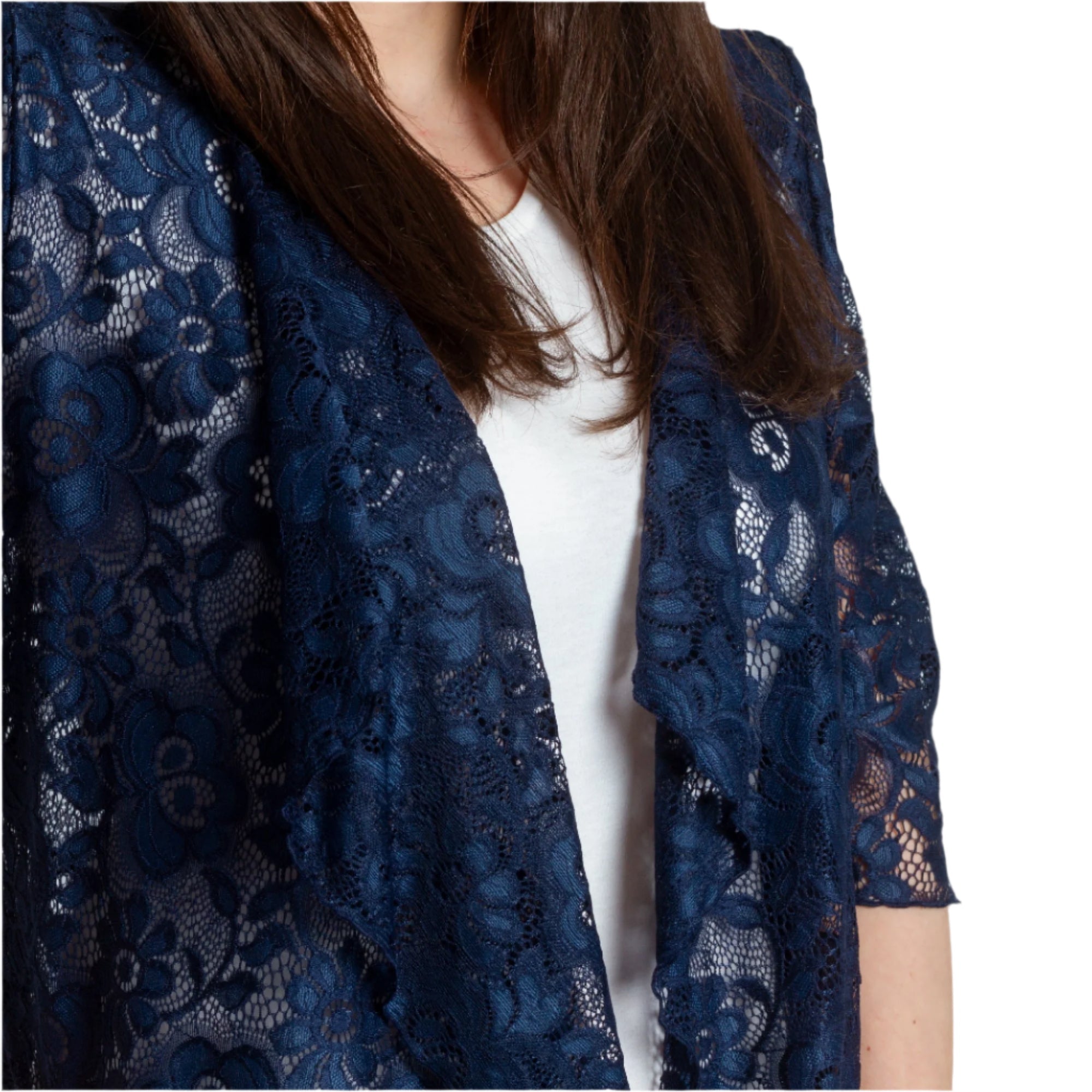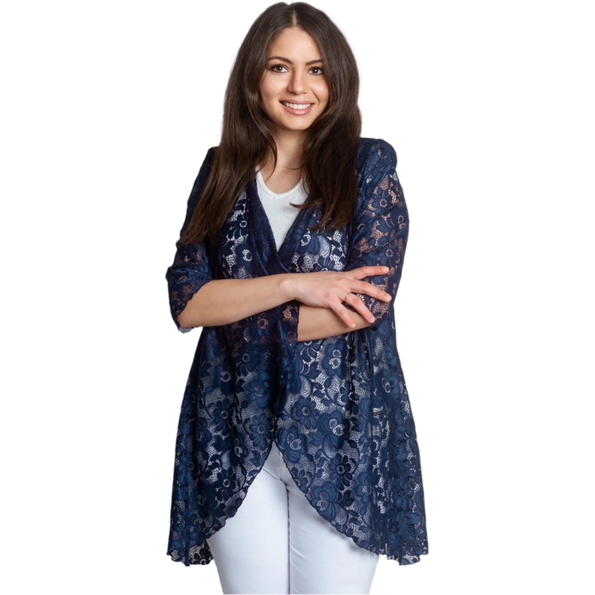 Adaugă o notă de rafinament ținutei tale cu acest sacou elegant de damă, confecționat din dantelă fină bleumarin. Fabricat din 95% viscoză și 5% elastan, acest model combină lejeritatea, moliciunea și o ușoară elasticitate, oferind confort pe tot parcursul zilei. Croiul lejer, cu rever răsturnat și mâneci 3/4, adaugă feminitate și stil, iar textura dantelei adaugă un finisaj sofisticat. O alegere perfectă atât pentru ocazii formale, cât și pentru un look elegant de zi cu zi. Se potrivește de minune cu rochii, bluze sau topuri și poate fi purtat primăvara și vara.