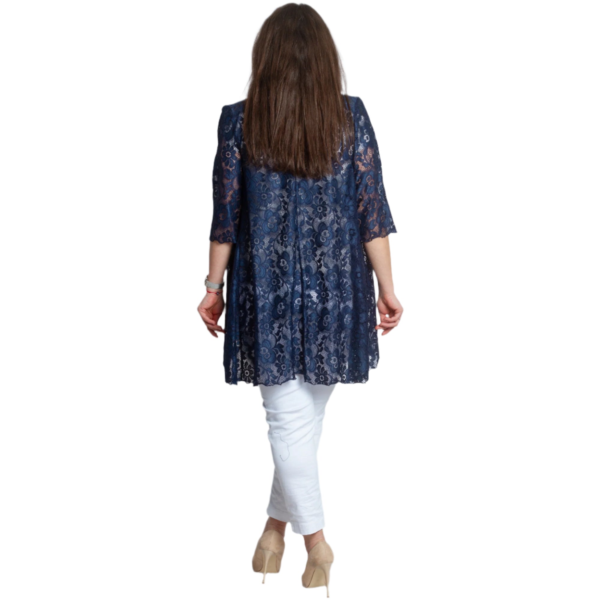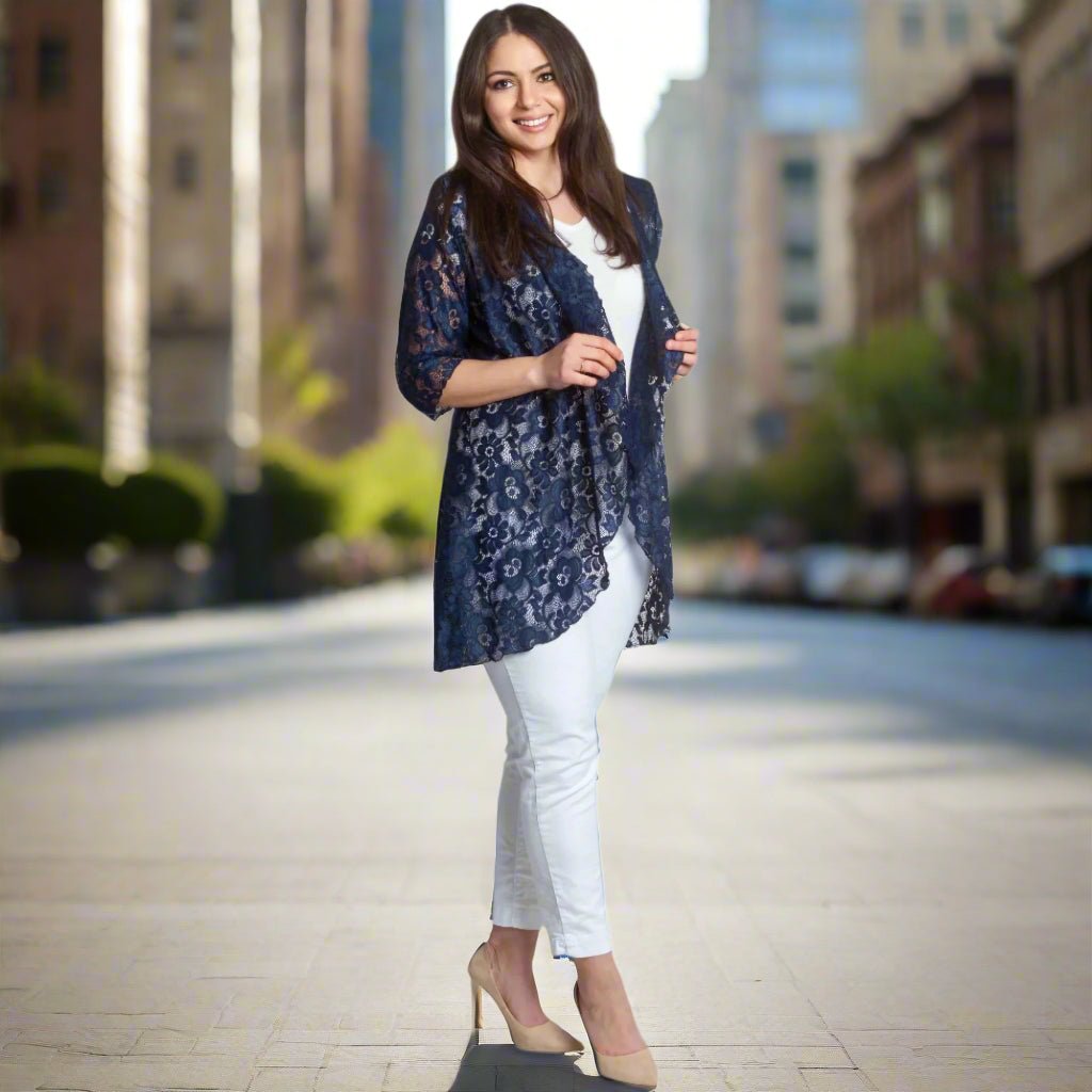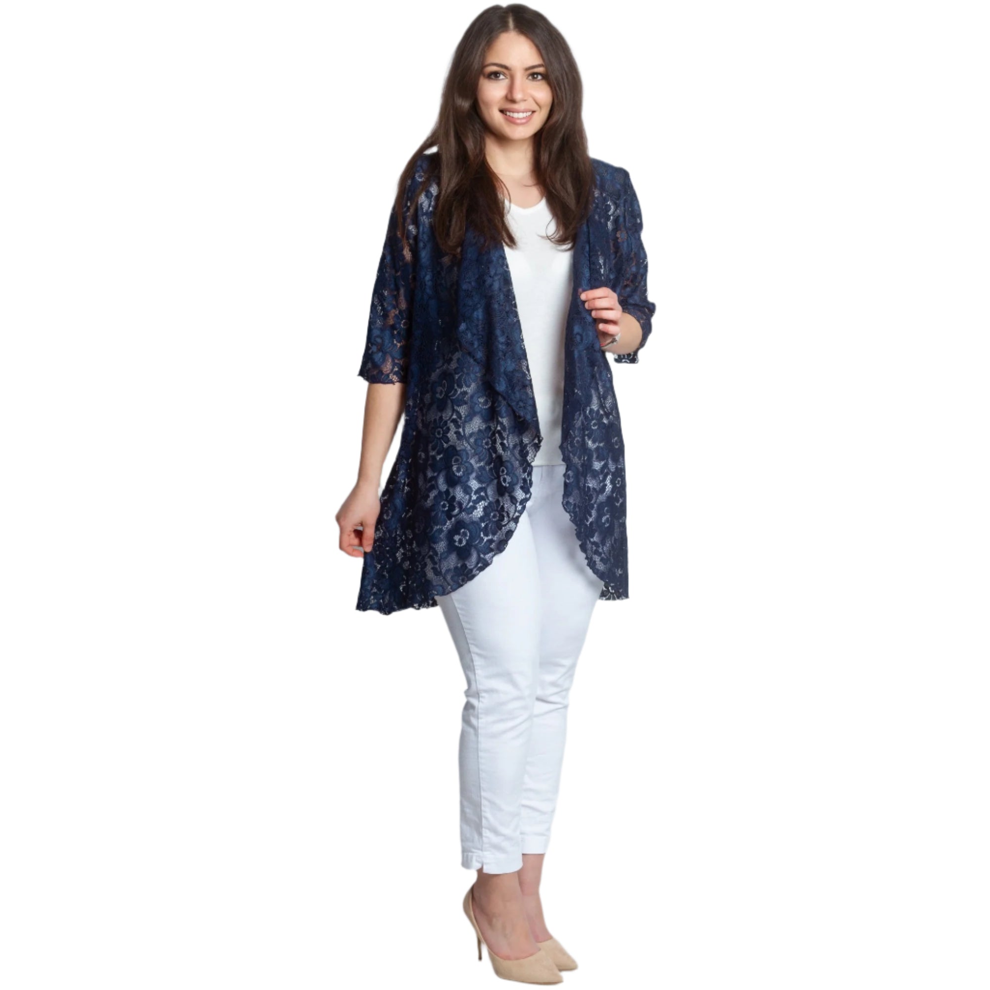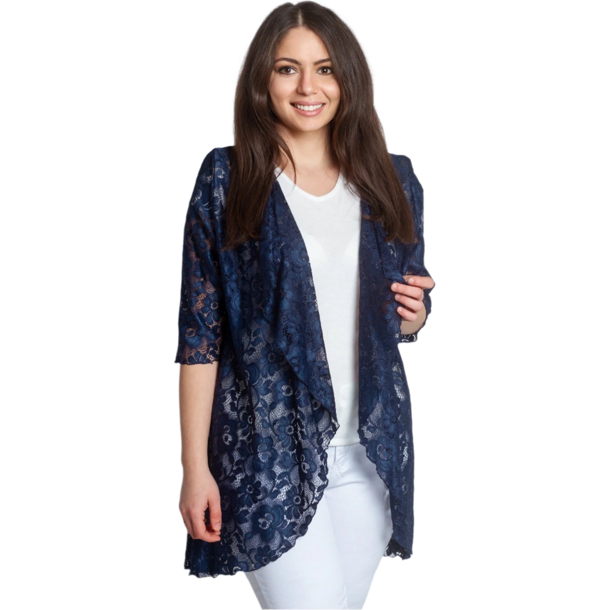 Adaugă o notă de rafinament ținutei tale cu acest sacou elegant de damă, confecționat din dantelă fină bleumarin. Fabricat din 95% viscoză și 5% elastan, acest model combină lejeritatea, moliciunea și o ușoară elasticitate, oferind confort pe tot parcursul zilei. Croiul lejer, cu rever răsturnat și mâneci 3/4, adaugă feminitate și stil, iar textura dantelei adaugă un finisaj sofisticat. O alegere perfectă atât pentru ocazii formale, cât și pentru un look elegant de zi cu zi. Se potrivește de minune cu rochii, bluze sau topuri și poate fi purtat primăvara și vara.