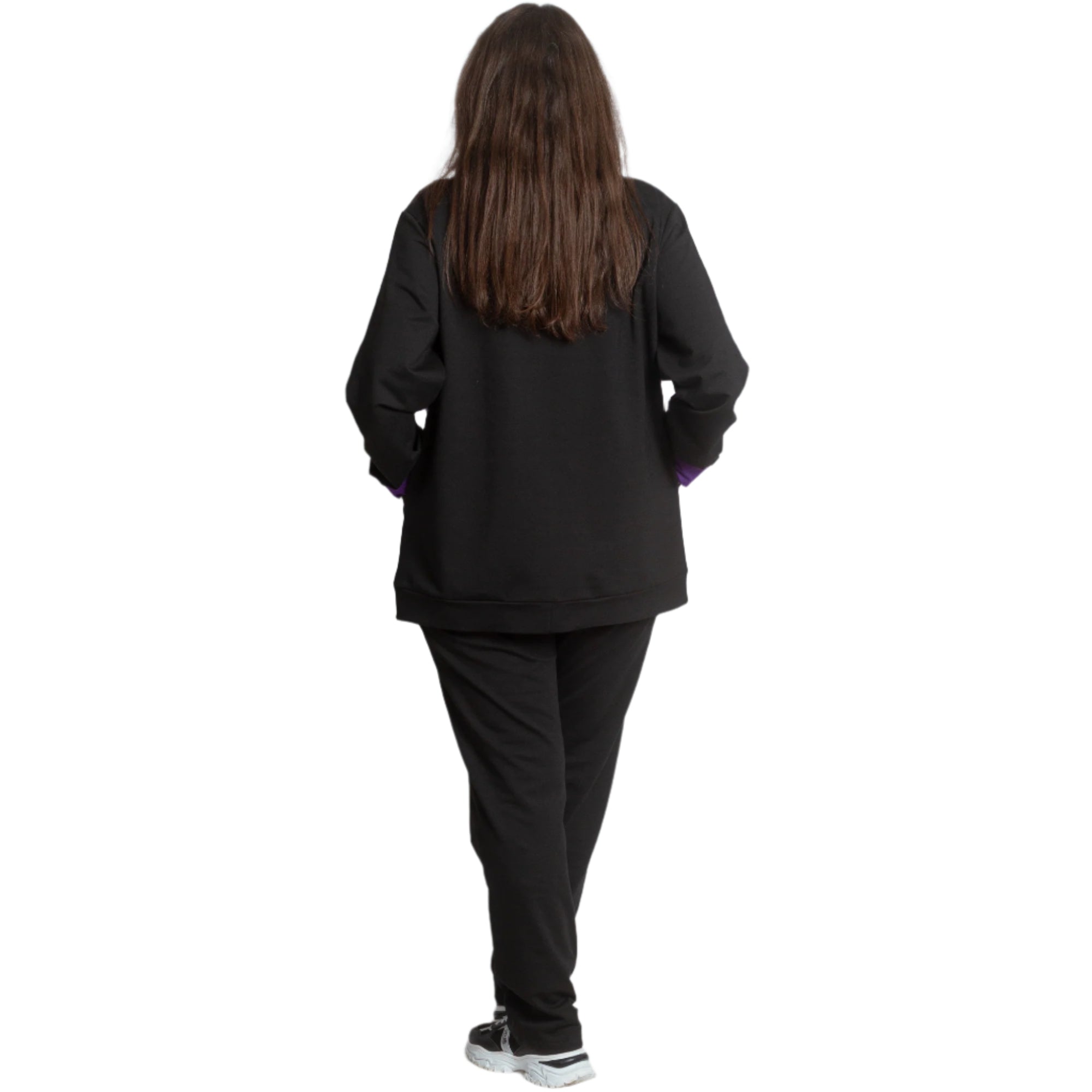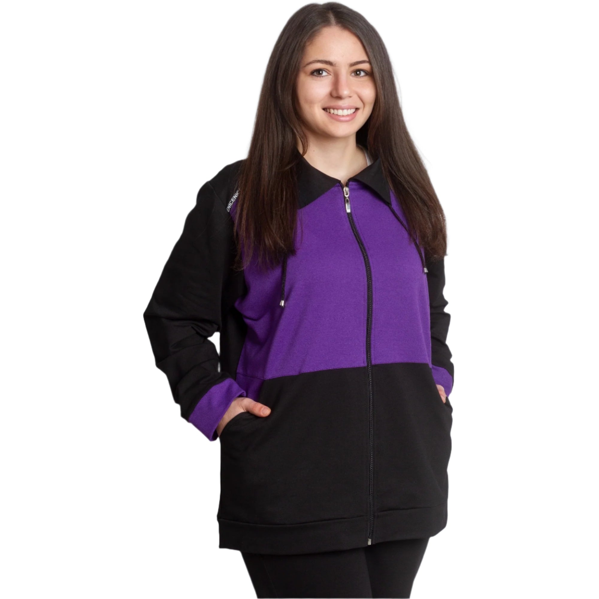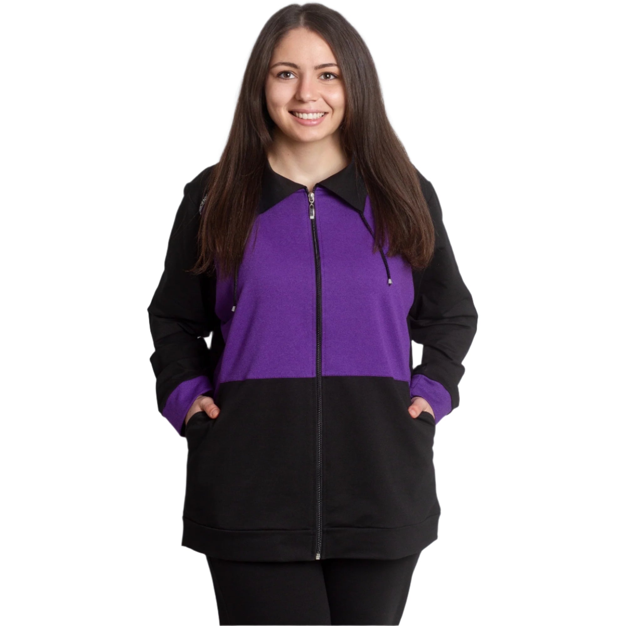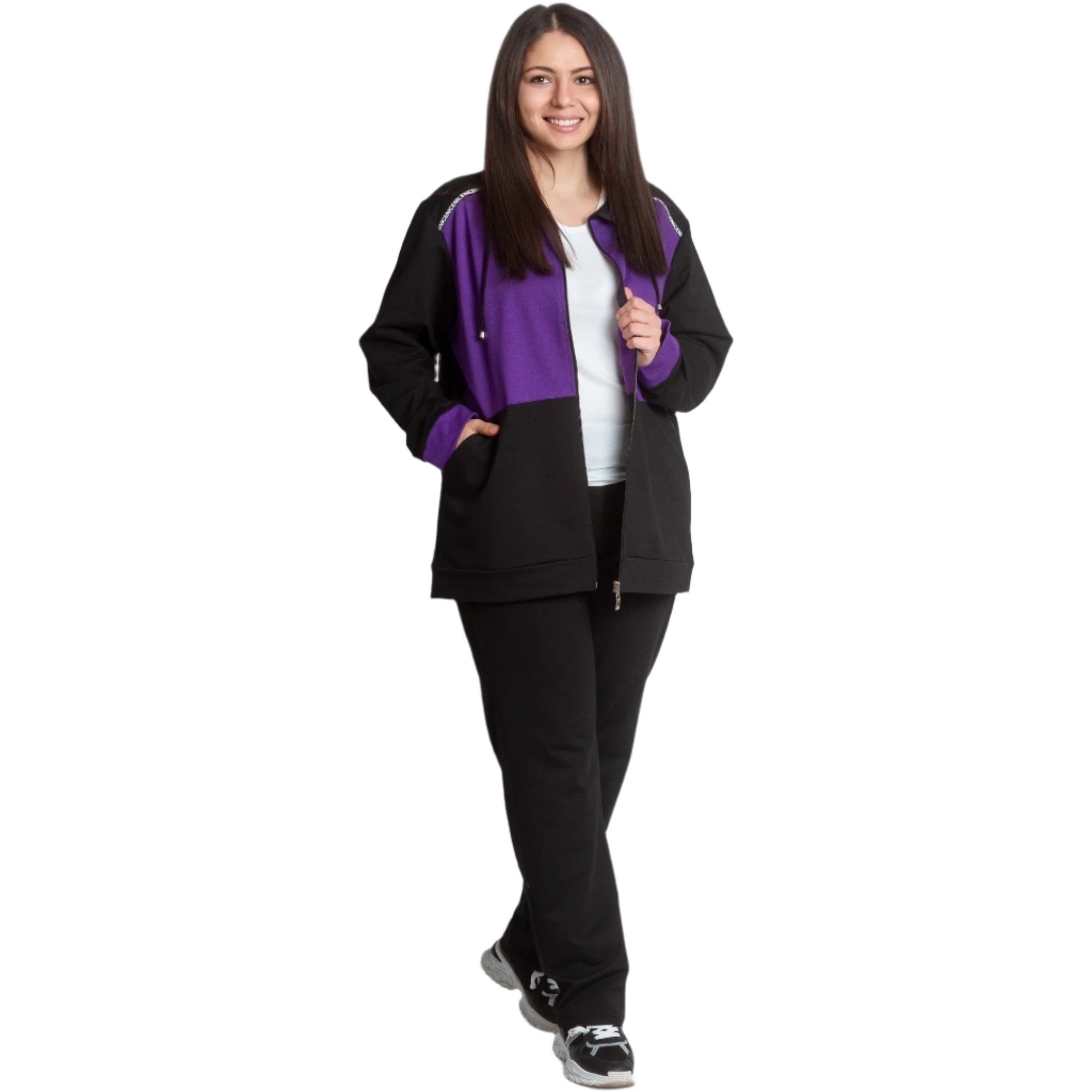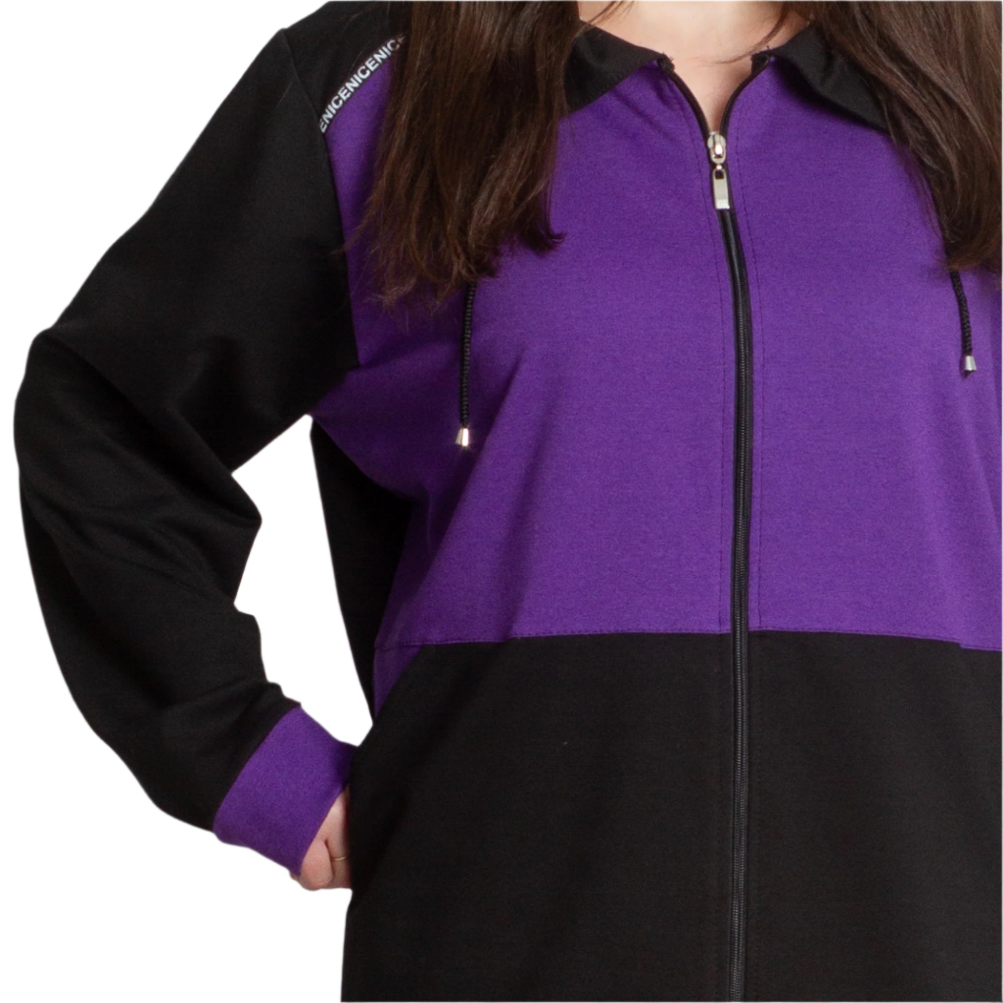 Ținută sport maxi elegantă, confecționată din materiale de înaltă calitate pentru confort și comoditate. Topul este bicolor și are o croială lejeră și fermoar, completat de buzunare practice. Pantalonii au talie elastică și șnururi, garantând o potrivire perfectă. O alegere ideală pentru viața de zi cu zi și pentru timpul liber.