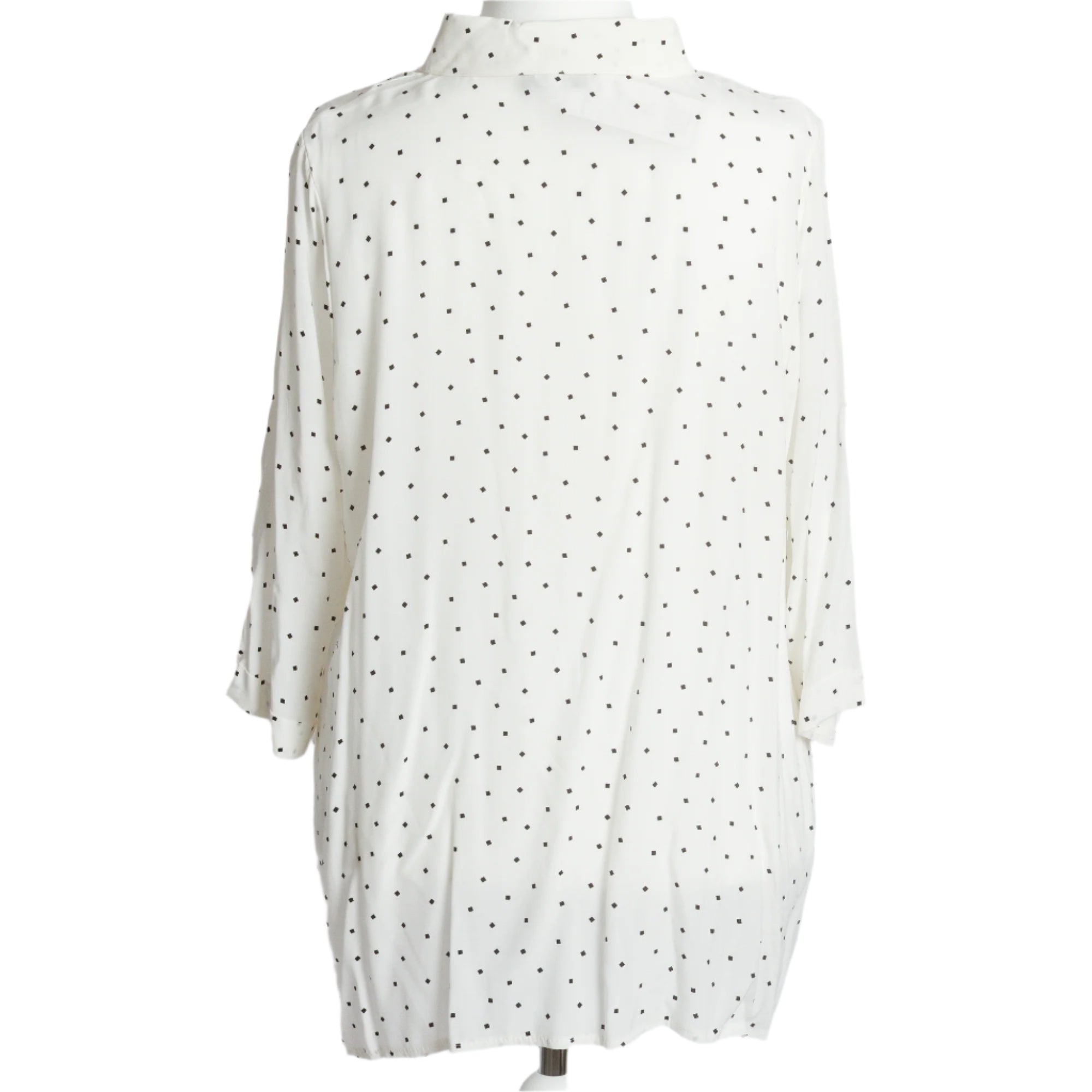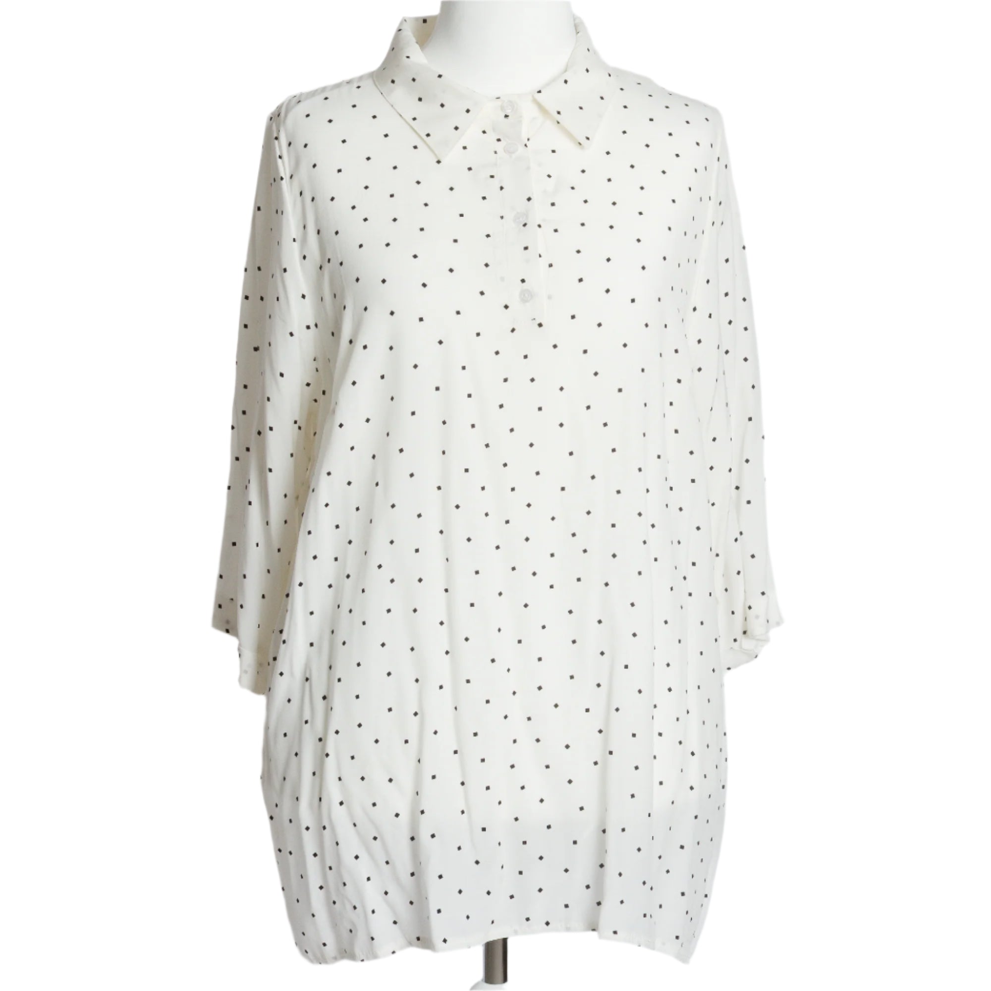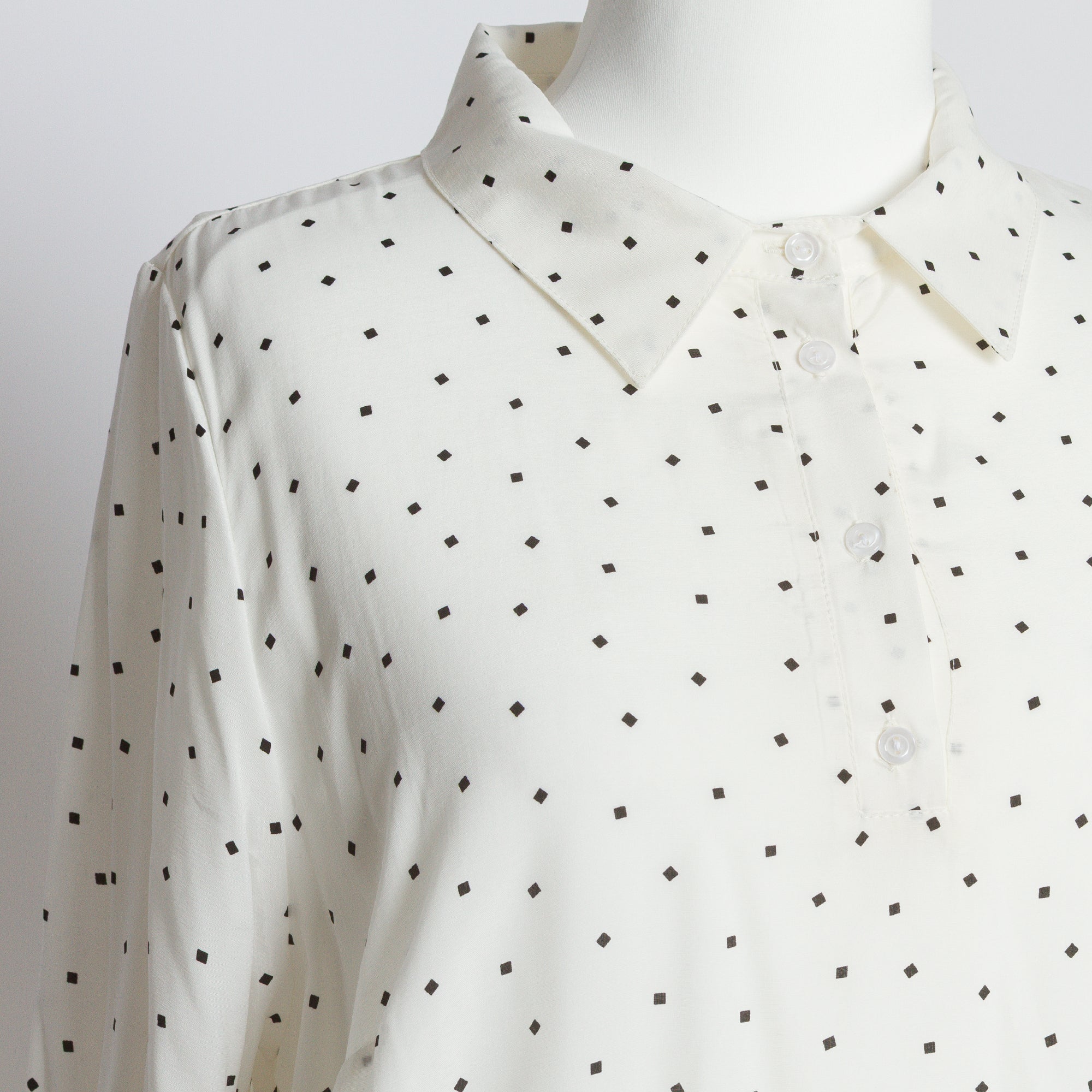 Această elegantă cămașă albă este decorată cu buline negre delicate, creând un model clasic și stilat, potrivit pentru orice ocazie. Modelul este versatil și ușor de combinat, făcând din această cămașă o alegere perfectă atât pentru ținutele business, cât și pentru viața de zi cu zi. Fie că o combinați cu pantaloni eleganți, blugi sau o fustă, vă va accentua stilul cu eleganță curată și confort.