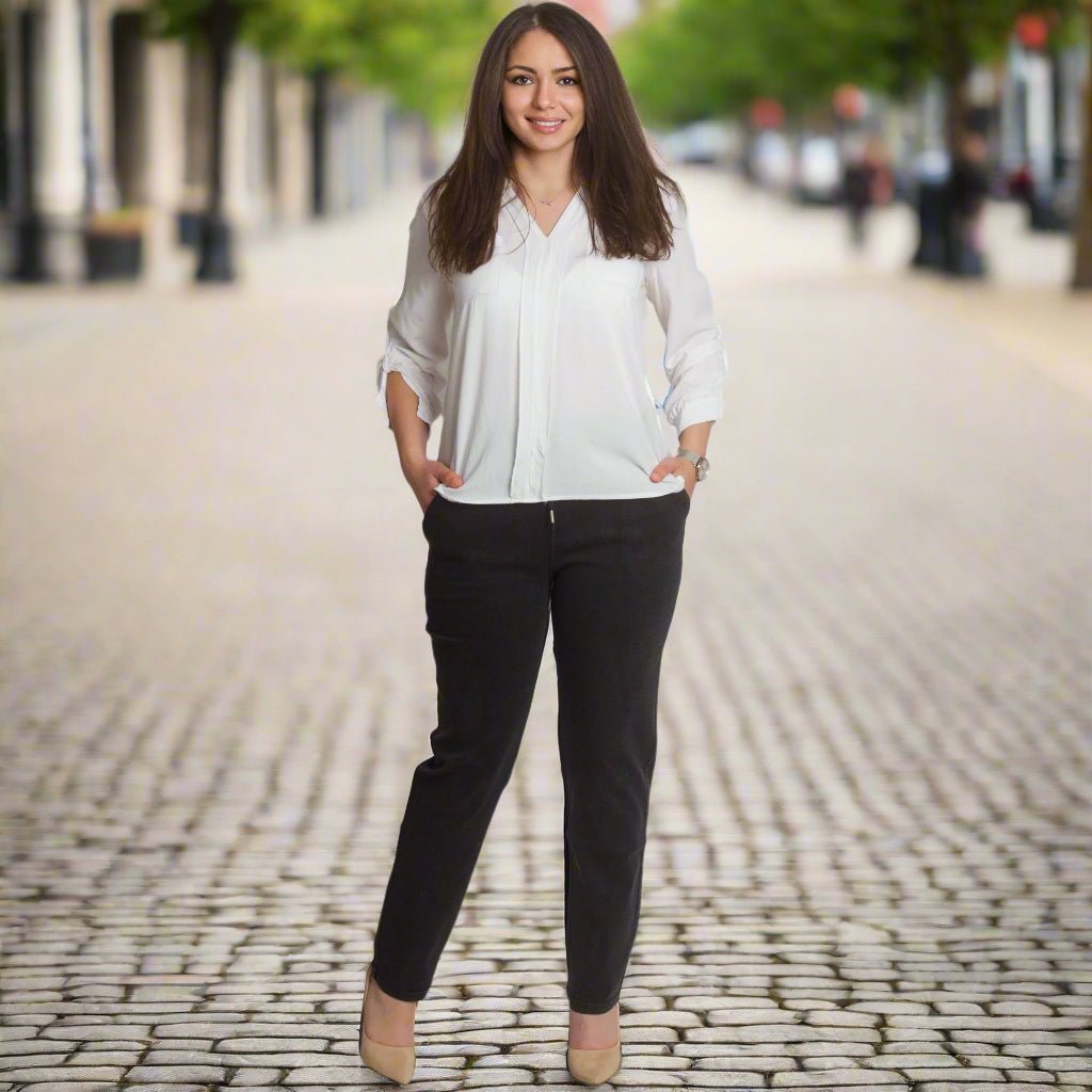 Acești pantaloni de damă eleganți și confortabili, de culoare bleumarin, sunt alegerea perfectă pentru primăvară și vară. Fabricați din 95% viscoză și 5% elastan de înaltă calitate, oferă confort și ușurință la purtare. Croiul lejer permite libertate de mișcare, iar elasticul cu legături în talie contribuie la o potrivire perfectă. Lungimea până la gleznă îi conferă un aspect modern, fiind potriviți atât pentru viața de zi cu zi, cât și pentru ocazii mai informale.
