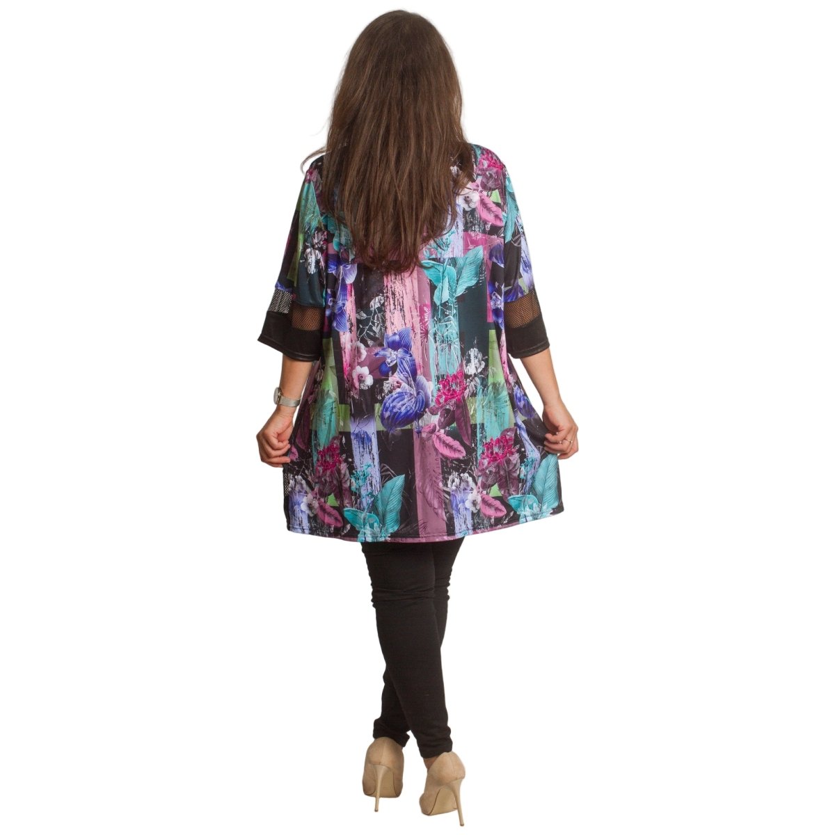 Creează un look impresionant cu această tunică maxi formală, care combină eleganța și confortul. Fabricată din material de înaltă calitate - 70% poliamidă, 25% poliester și 5% elastan, această tunică oferă o croială lejeră și confortabilă, potrivită pentru orice siluetă. Modelul se distinge printr-un imprimeu floral unic în culori moderne, care adaugă feminitate și rafinament. Tunica are accente de piele pe mâneci și tiv, precum și detalii de plasă în jurul decolteului și mânecilor, care adaugă o notă de extravaganță. Decolteul accentuează ușor linia decolteului. Potrivită atât pentru ocazii formale, cât și pentru viața elegantă de zi cu zi.