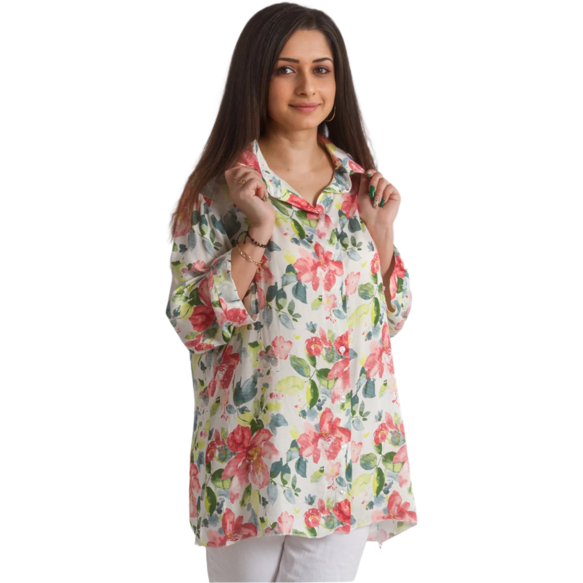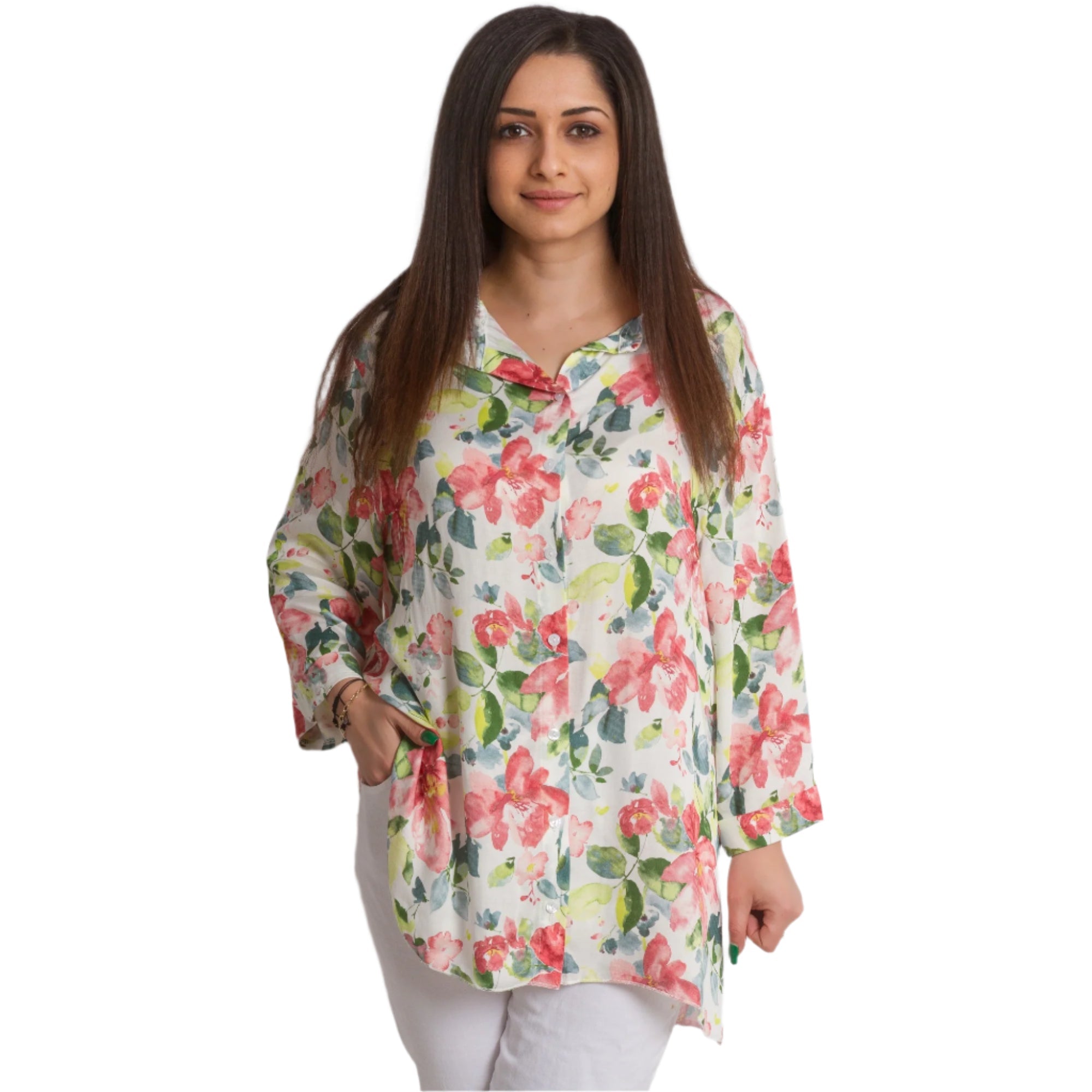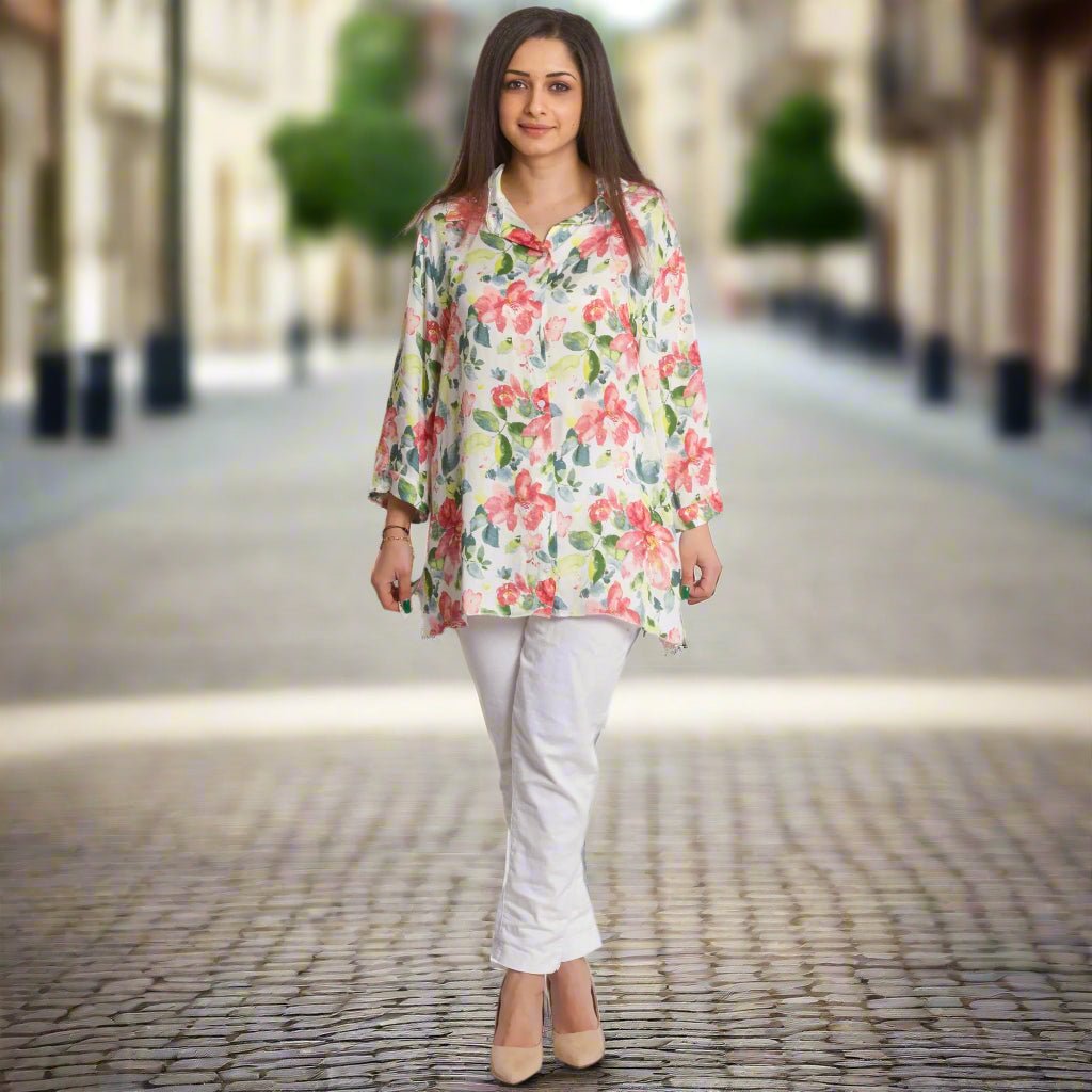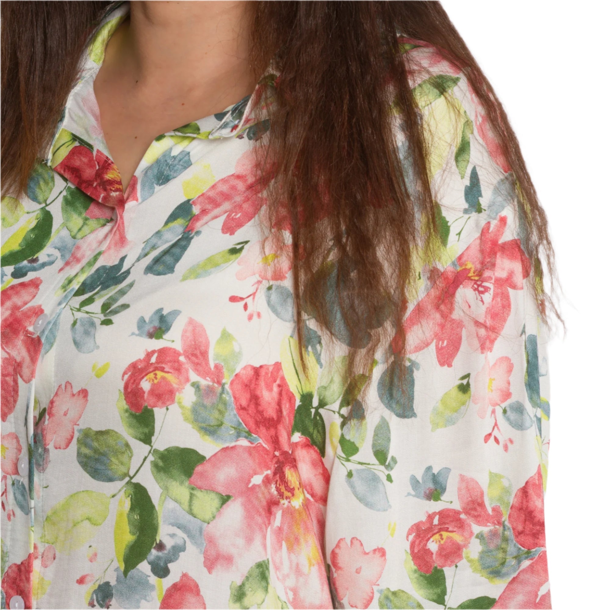 Această cămașă elegantă, cu imprimeu floral, este combinația perfectă între confort și eleganță. Cu culori proaspete și material delicat, adaugă feminitate și rafinament oricărui look. Potrivită atât pentru viața de zi cu zi, cât și pentru evenimentele formale, datorită croielii clasice și închiderii practice cu nasturi.
