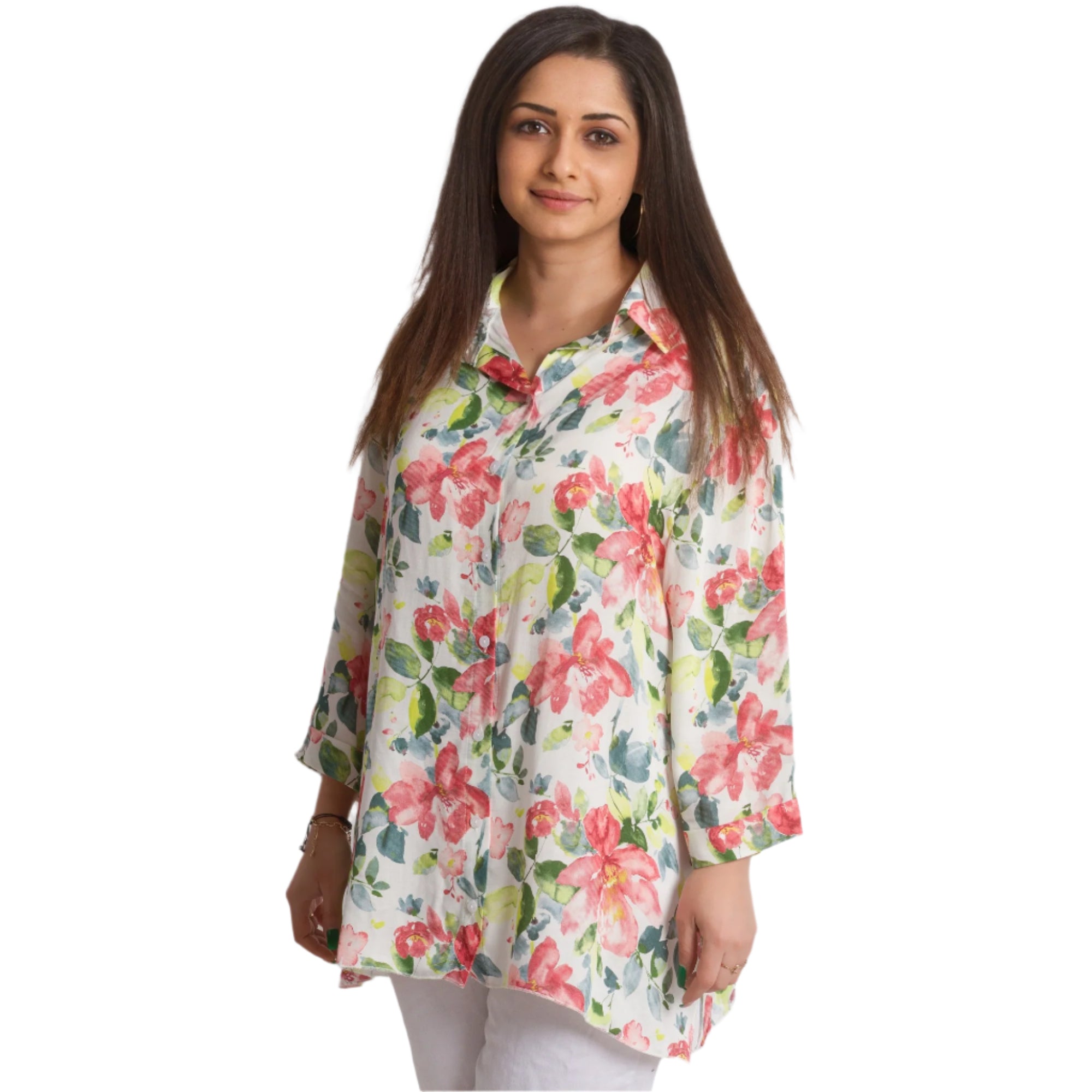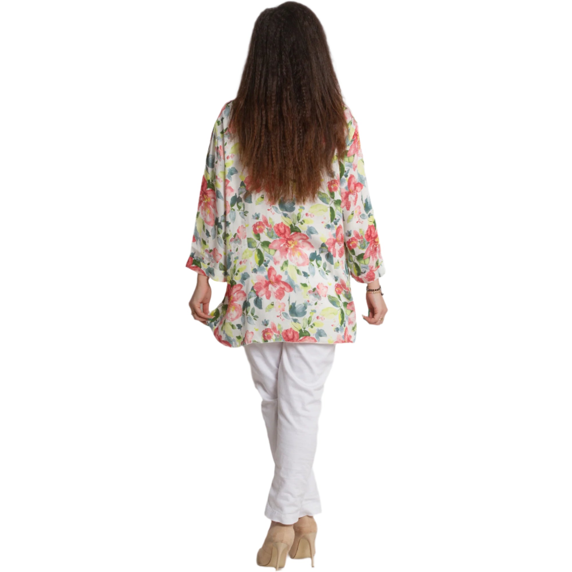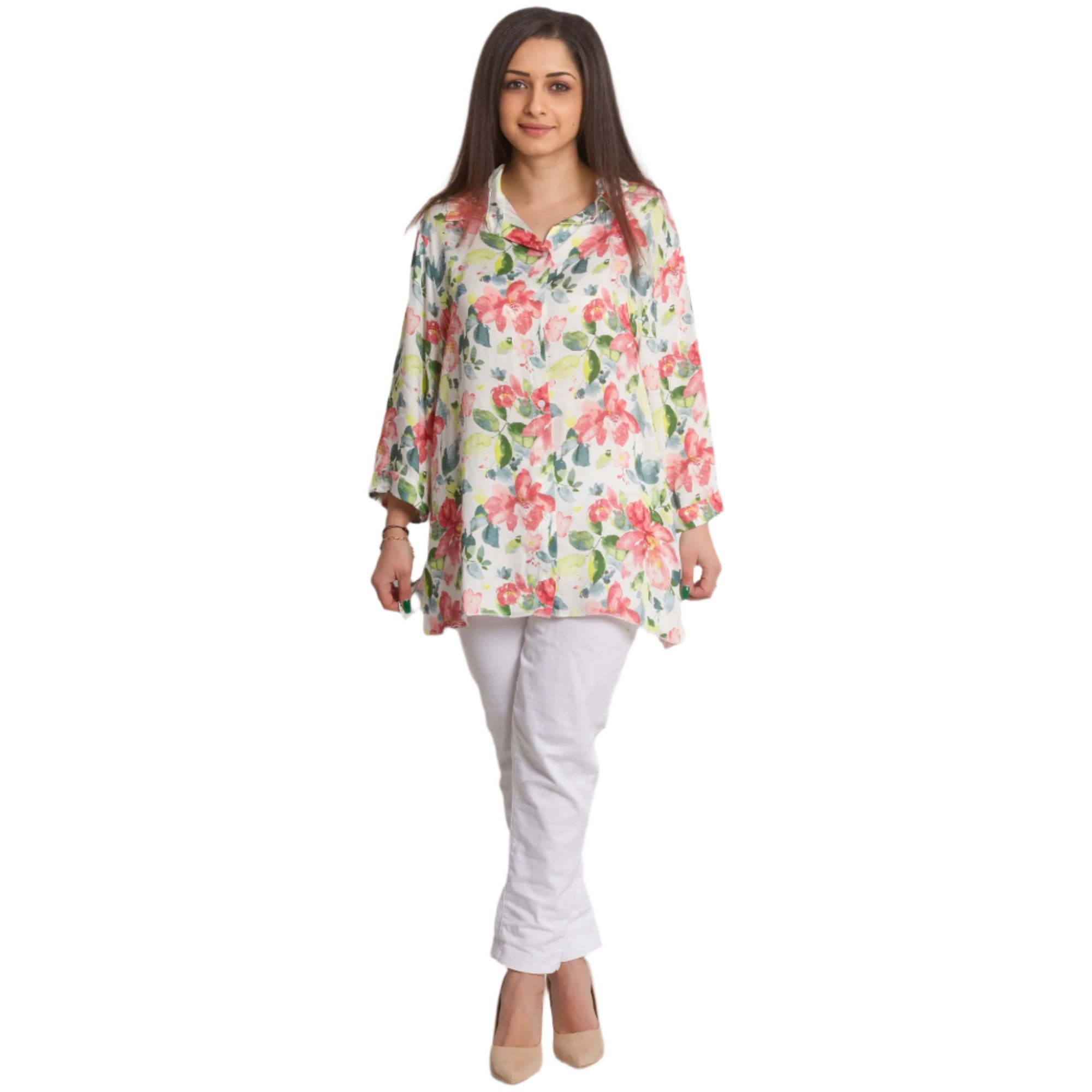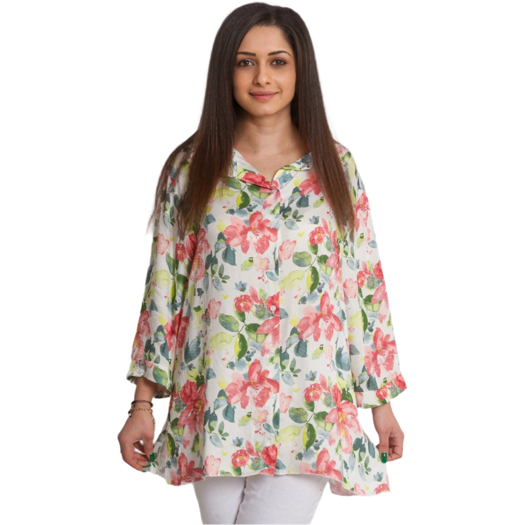 Această cămașă elegantă, cu imprimeu floral, este combinația perfectă între confort și eleganță. Cu culori proaspete și material delicat, adaugă feminitate și rafinament oricărui look. Potrivită atât pentru viața de zi cu zi, cât și pentru evenimentele formale, datorită croielii clasice și închiderii practice cu nasturi.