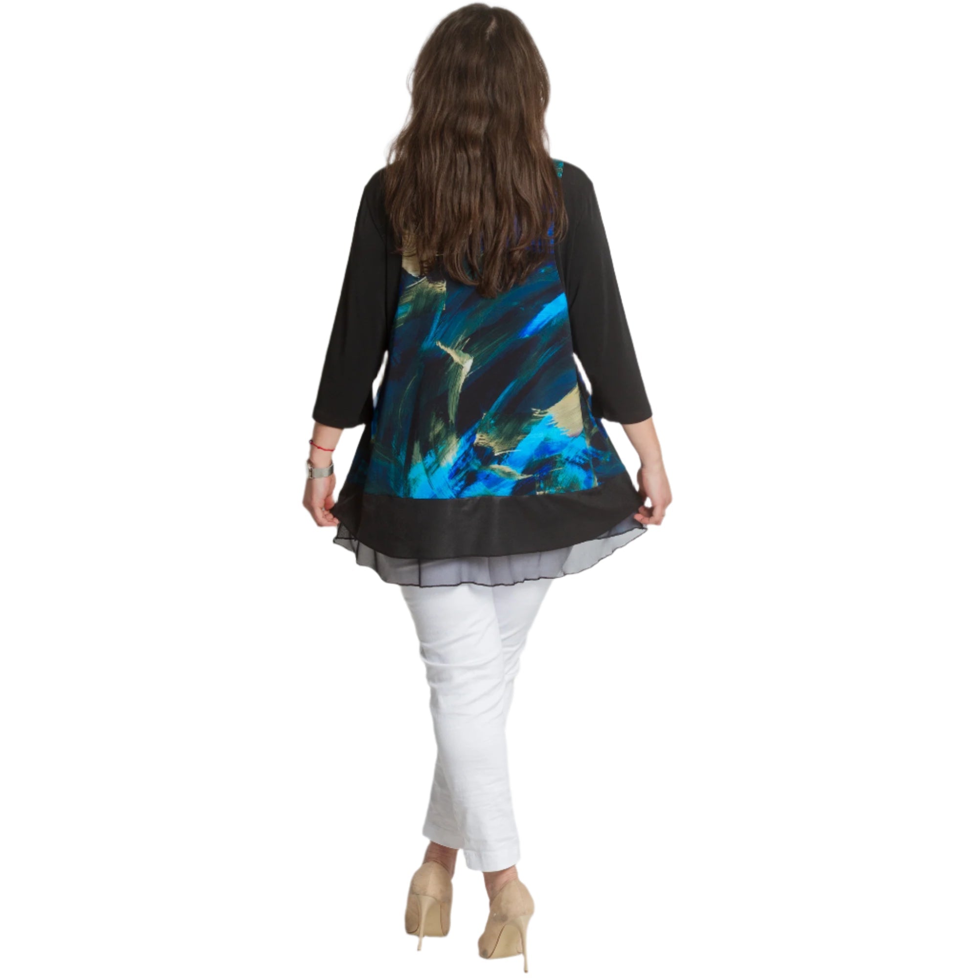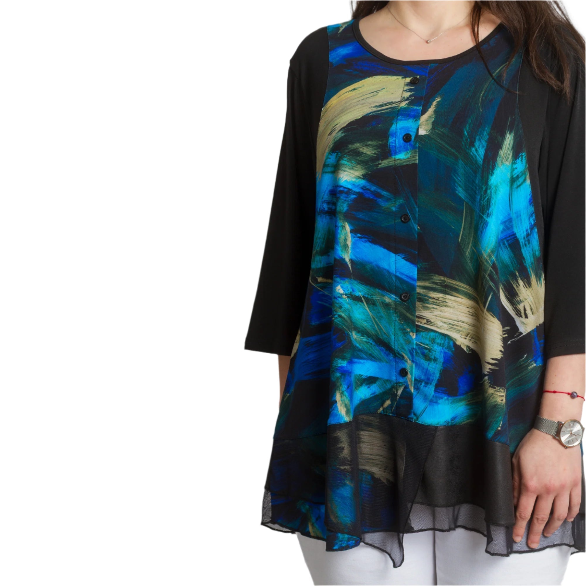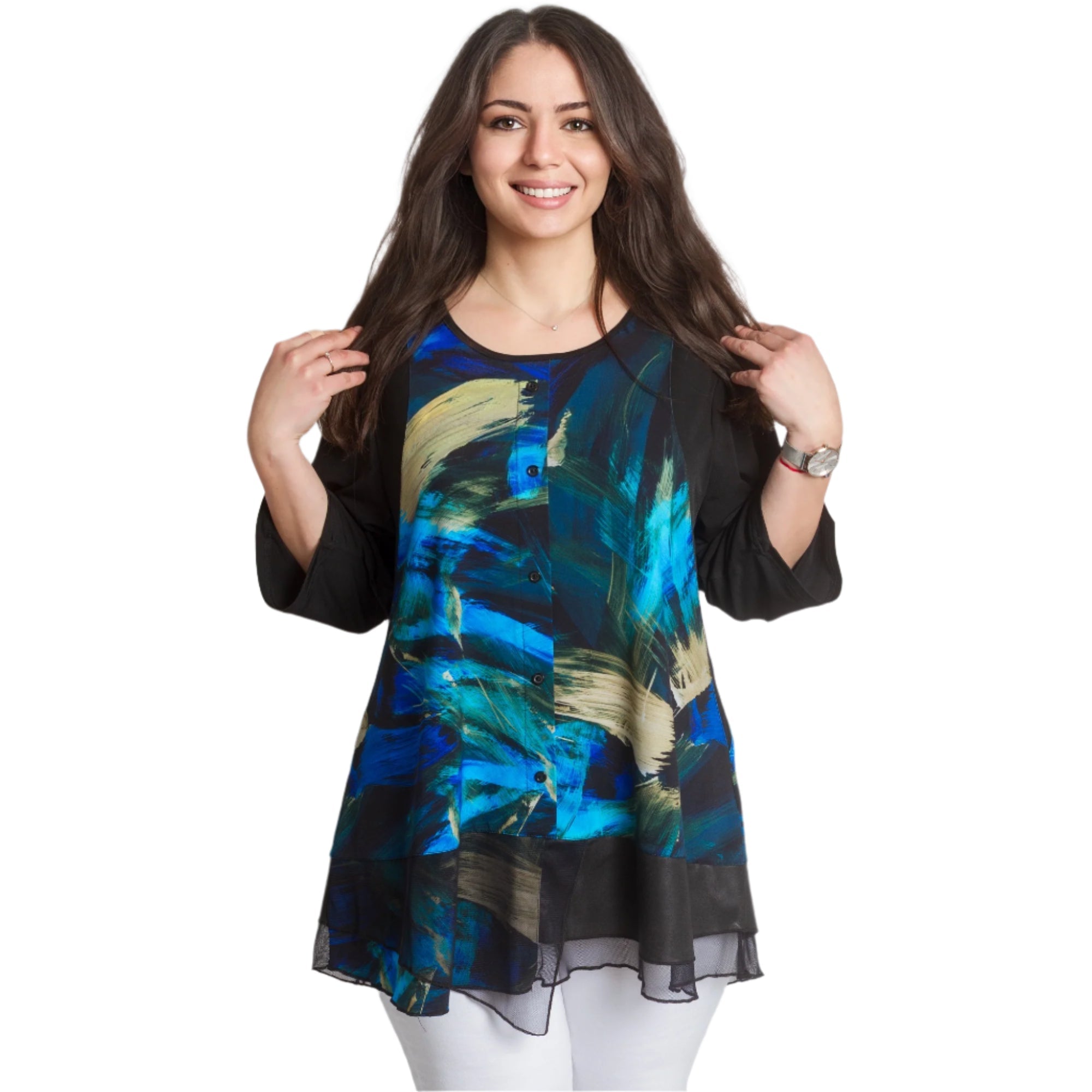 Adaugă stil și confort garderobei tale cu această tunică elegantă cu imprimeu abstract în nuanțe de albastru și auriu. Confecționată dintr-un material ușor și confortabil, oferă libertate de mișcare și este potrivită pentru orice ocazie. Finisată cu o garnitură vaporoasă din tul și piele ecologică în partea de jos, această tunică este alegerea perfectă pentru femeile care iubesc stilul elegant cu un accent modern.
